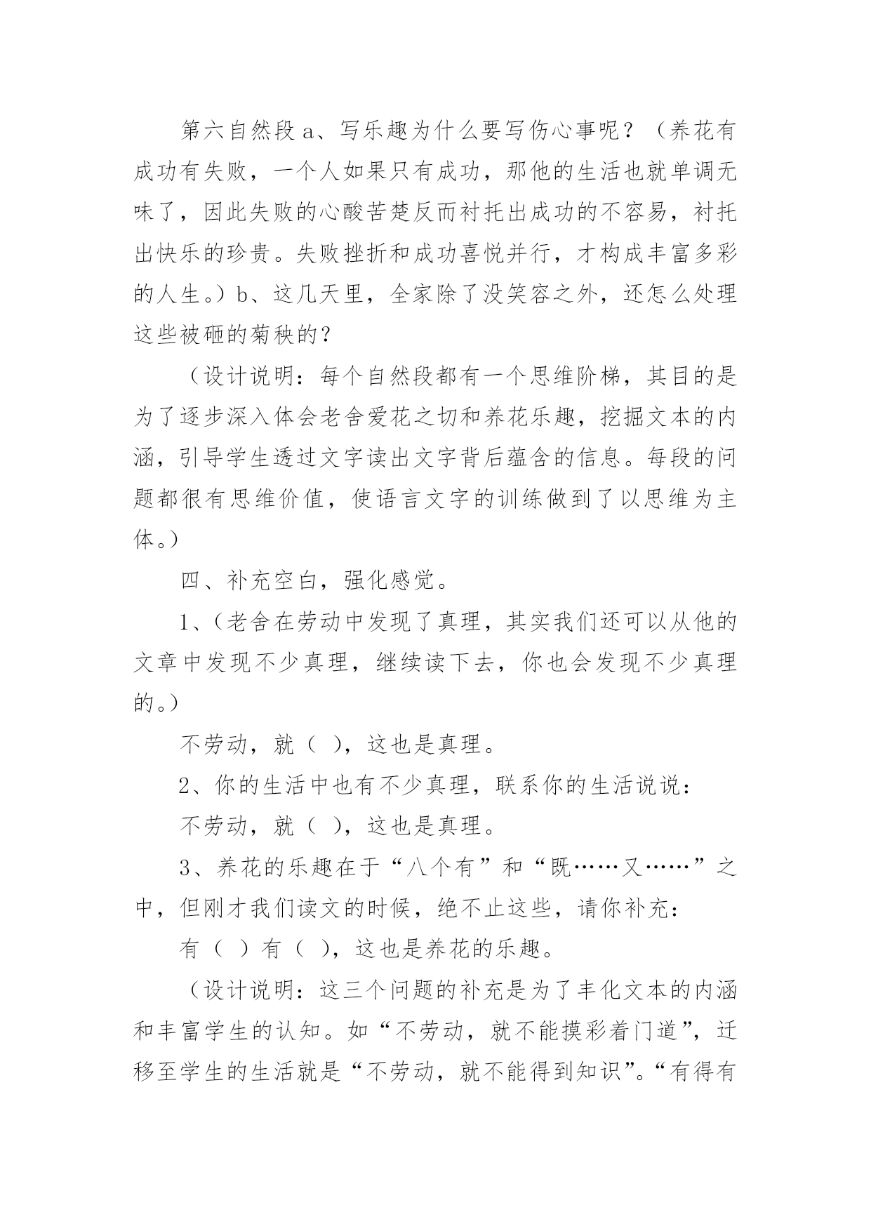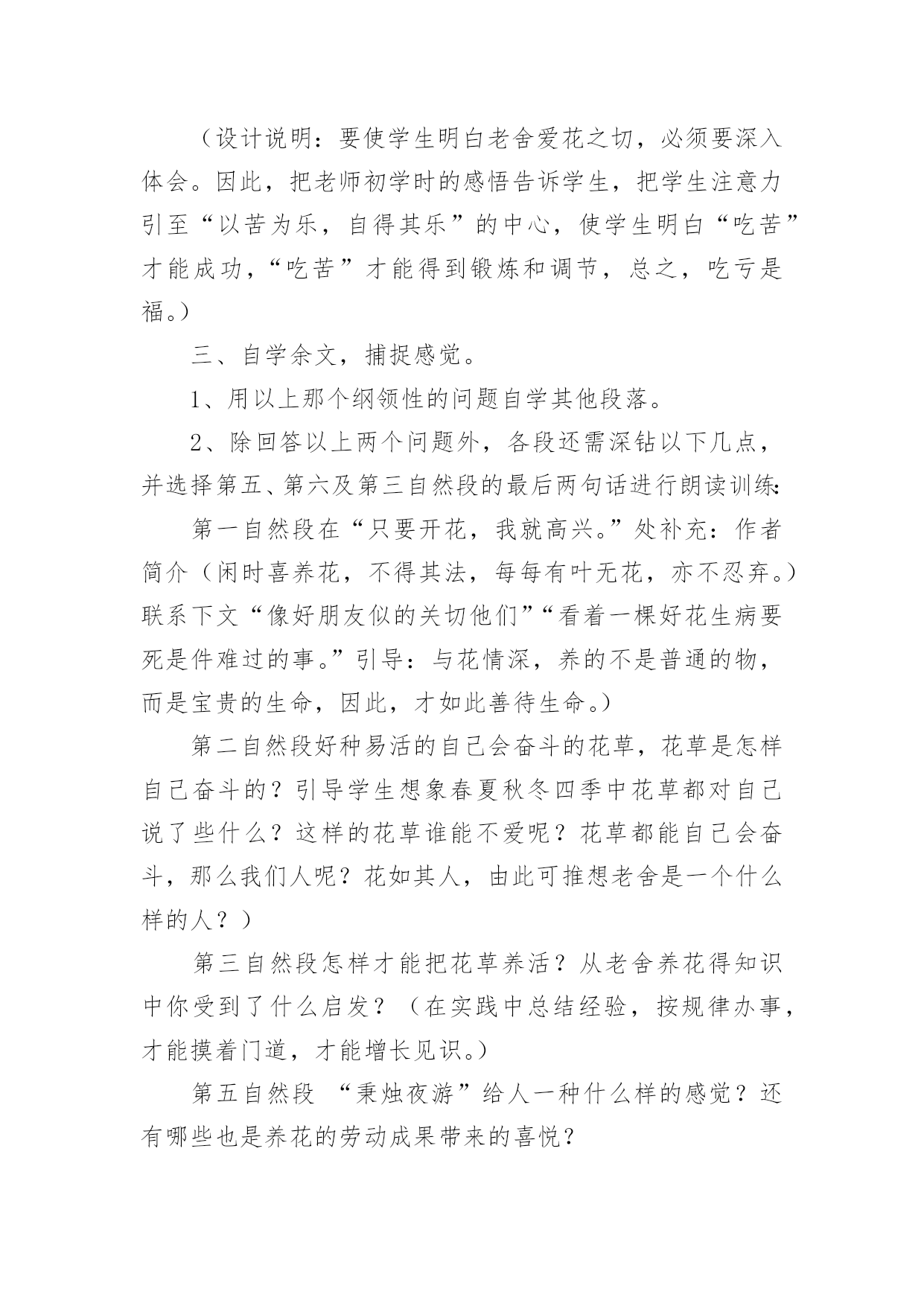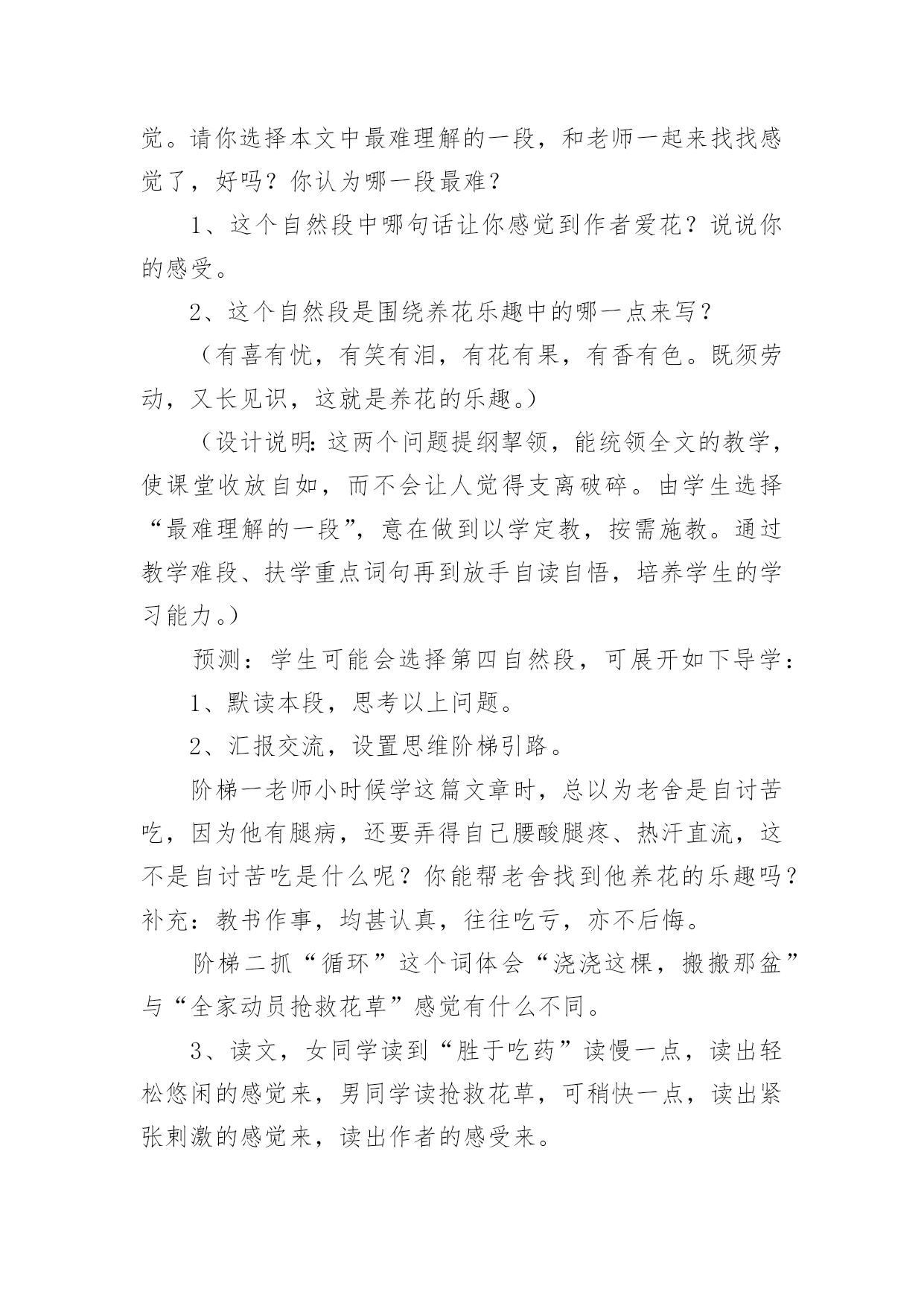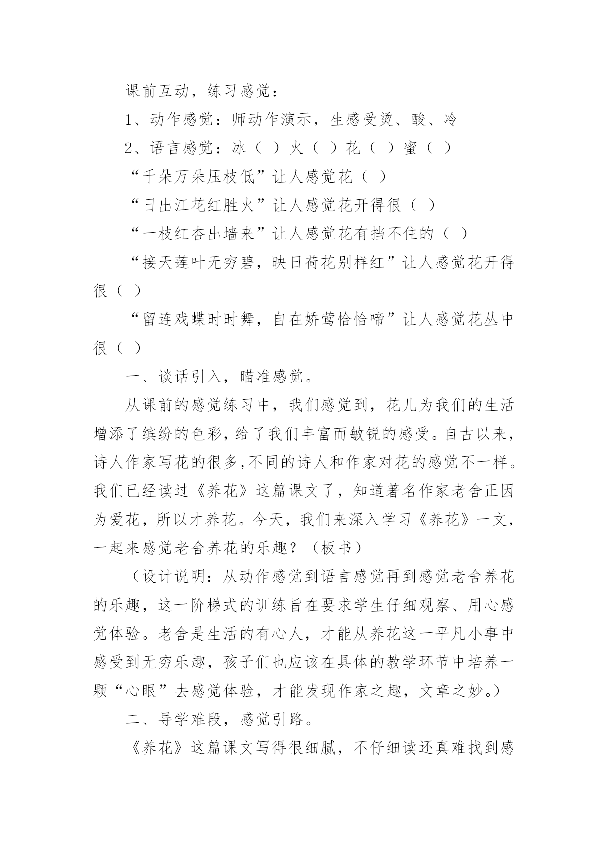 《养花》教学设计优秀作为一名教职工,通常需要准备好一份教学设计,教学设计是实现教学目标的计划性和决策性活动。那么优秀的教学设计是什么样的呢?以下是小编为大家整理的《养花》教学设计优秀,欢迎阅读,希望大家能够喜欢。《养花》教学设计优秀1教学目的:1、使学生体会养花既须劳动,又长见识,能给人们带来乐趣。2、在实践活动中加深对课文的理解。3、选择一种你喜欢的花草写一个片段,要写出它的特点和你为什么喜爱它。教学重点:引导学生理解课文的思想内容,体会作者的思想感情;了解作者是怎样把养花的乐趣写具体的。教学难点:1、了解作者是怎样把养花的乐趣写具体的。2、学习课文写法,选择一种你喜欢的花草写一个片段。一、谈话引入:1、上节课我们自学了课文,并且分别以老舍先生和记者先生及观众朋友的身份准备了一期《面对面》的现场节目,大家准备好了吗?2、您现在收看的是中央电视台《面对面》栏目,今天我们的话题是老舍及老舍养花。关于老舍大家了解多少呢?二、自由交流:咱们请出今天的特邀嘉宾是著名作家老舍先生。下面请记者朋友、观众朋友们与老舍先生就养花这个话题进行面对面交流。三、理解感悟1、在刚才的'节目中,大家都能按要求抓住课文主要内容进行交流,而且把握重点也很准,主要是什么呢?2、刚才我们谈的关于养花的乐趣比较零散。请大家再读一读课文,综合地说一说,老舍先生所谈的养花的乐趣有哪些?3、朗读第五自然段,“自生自灭”、“秉烛夜游”是什么意思?4、闻香味,看花开,送花给别人,这是养花的什么?(养花的成果)5、想一想,养花是不是只有这三件成果?还可能有哪些?6、既然有这么多成果,为什么作者只写这三件?请大家都默读这一自然段,体会体会作者写这一段究竟是想说什么?7、这种喜欢、骄傲、自豪是一种什么乐趣呢?享受劳动果实的快乐。8、最后一段与前边具体的讲述有什么联系?总分9、从作者讲的养花的乐趣中我们可以体会到作者对花的什么感情?你是从哪些地方体会到作者爱花之情的?找一找、划一划、读一读,再小组交流。10、谁能把你体会最深的一段有感情地读一读?11、通过了解老舍先生养花的乐趣,你有什么收获?在写法上还有没有收获呢?四、实践运用老舍先生不愧为大作家,一篇短短的《养花》竟给我们这么多启发。同学们,你们在养花中有些什么感受呢?你能写出来让大家同你分享吗?如果觉得有困难,也可以写写你最喜爱的花草。《养花》教学设计优秀2文本解读:《养花》这篇课文以朴实的语言记叙了老舍为什么养花,从养花中得到了什么乐趣。课文层次清楚,句和句,段和段之间连接紧密,过渡自然,逻辑性很强。作者老舍虽然是著名的作家,但是他行文语言娓娓道来,简洁生动,明白晓畅,如话家常,让读者感到亲切自然,感情丰富。例如:“摸着门道,花草养活了,而且三年五载老活着,开花,多么有意思呀!不是乱吹,这就是知识呀!”这平常的语言表达出掌握了一些养花方法之后的喜悦,感情充沛,溢于言表。此类语言,课文中比比皆是。文中有几处议论明理的句子学生理解稍困难些,而这又恰恰是老舍在养花过程中的感悟,既可以说是养花的乐趣,也可以说是生活中的情趣、获得知识的智趣和获得真理的理趣。由此处我们可以把作品中心定位于热爱生活、热爱劳动、追求真知真理、积极奋斗的的情感价值观。可见,作者之情、文中的精妙皆在于此,应此,当“重锤猛敲”,细细咀嚼,咬得字根香,嚼出文化味来。设计理念:培养语感,穿透语言的模糊性,读出文字背后蕴含的信息,感受语言的精妙;引导价值,走进作家的雅趣,感悟其中的情、智、理趣;引发思考,把结论(文章中心)转化为有价值的问题或活动,落实“课堂真正的主体是思维的主体”这一教学理念;设置阶梯,降低难度,让学生跳一跳,摘得到。教学目标:1、理解课文内容,体会作者的爱花之情和从养花中得到的乐趣(情趣、智趣、理趣)培养热爱生活、健康向上的情操。2、培养语感,理解作者是怎样把养花的乐趣写具体的,学习作者组材有序、叙事具体、过渡自然的写作方法。3、练习有感情的朗读课文。教学重难点:培养语感,理解课文中几处议论说理的.句子。教学准备:1、完成第一课时学习生字新词整体感知课文的教学任务。2、自制课件教学过程:课前互动,练习感觉:1、动作感觉:师动作演示,生感受烫、酸、冷2、语言感觉:冰()火()花()蜜()“千朵万朵压枝低”让人感觉花()“日出江花红胜火”让人感觉花开得很()“一枝红杏出墙来”让人感觉花有挡不住的()“接天莲叶无穷碧,映日荷花别样红”让人感觉花开得很()“留连戏蝶时时舞,自在娇莺恰恰啼”让人感觉花丛中很()一、谈话引入,瞄准感觉。从课前的感觉练习中,我们感觉到,花儿为我们的生活增添了缤纷的色彩,给了我们丰富而敏锐的感受。自古以来,诗人作家写花的很多,不同的诗人和作家对花的感觉不一样。我们已经读过《养花》这篇课文了,知道著名作家老舍正因为爱花,所以才