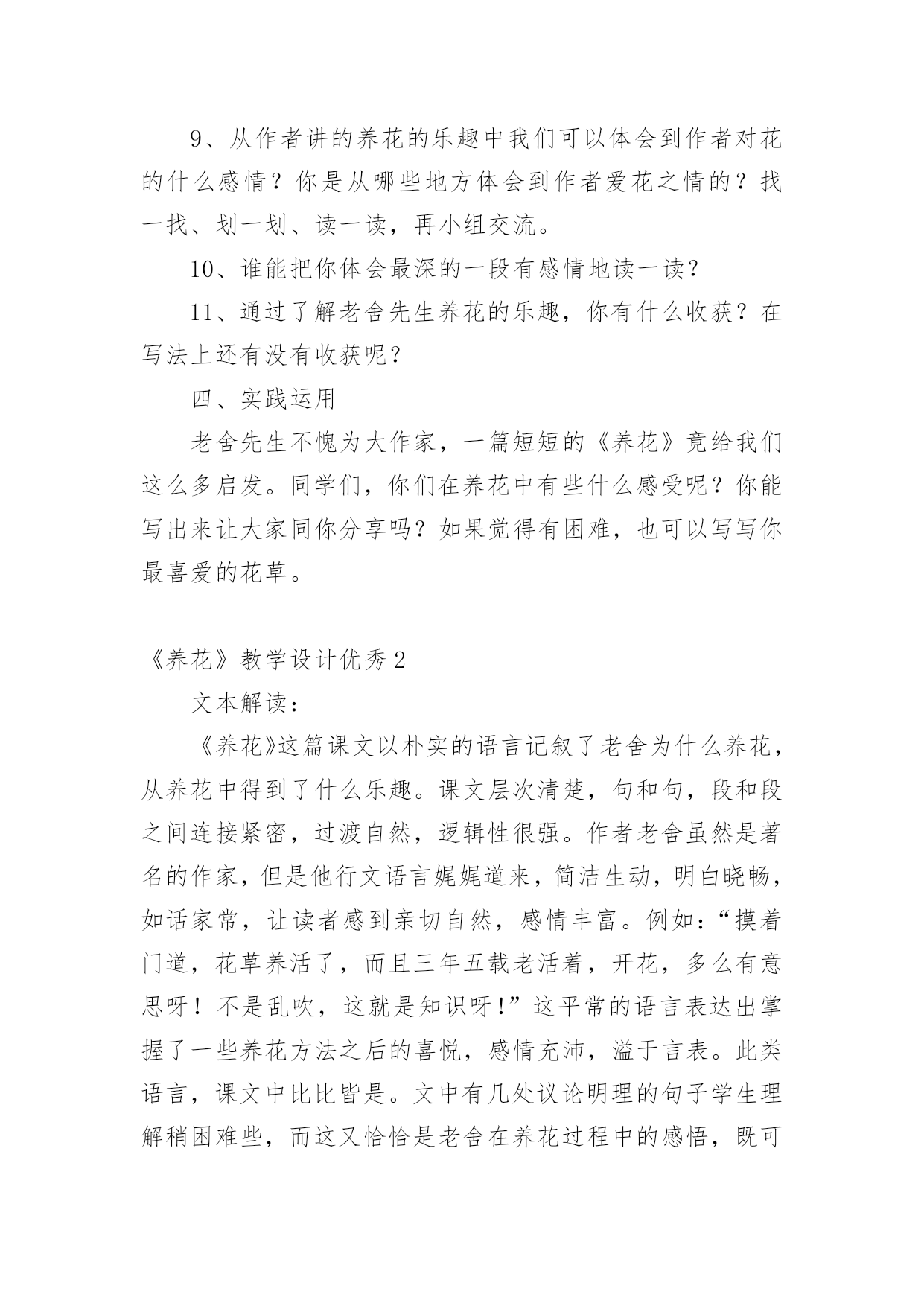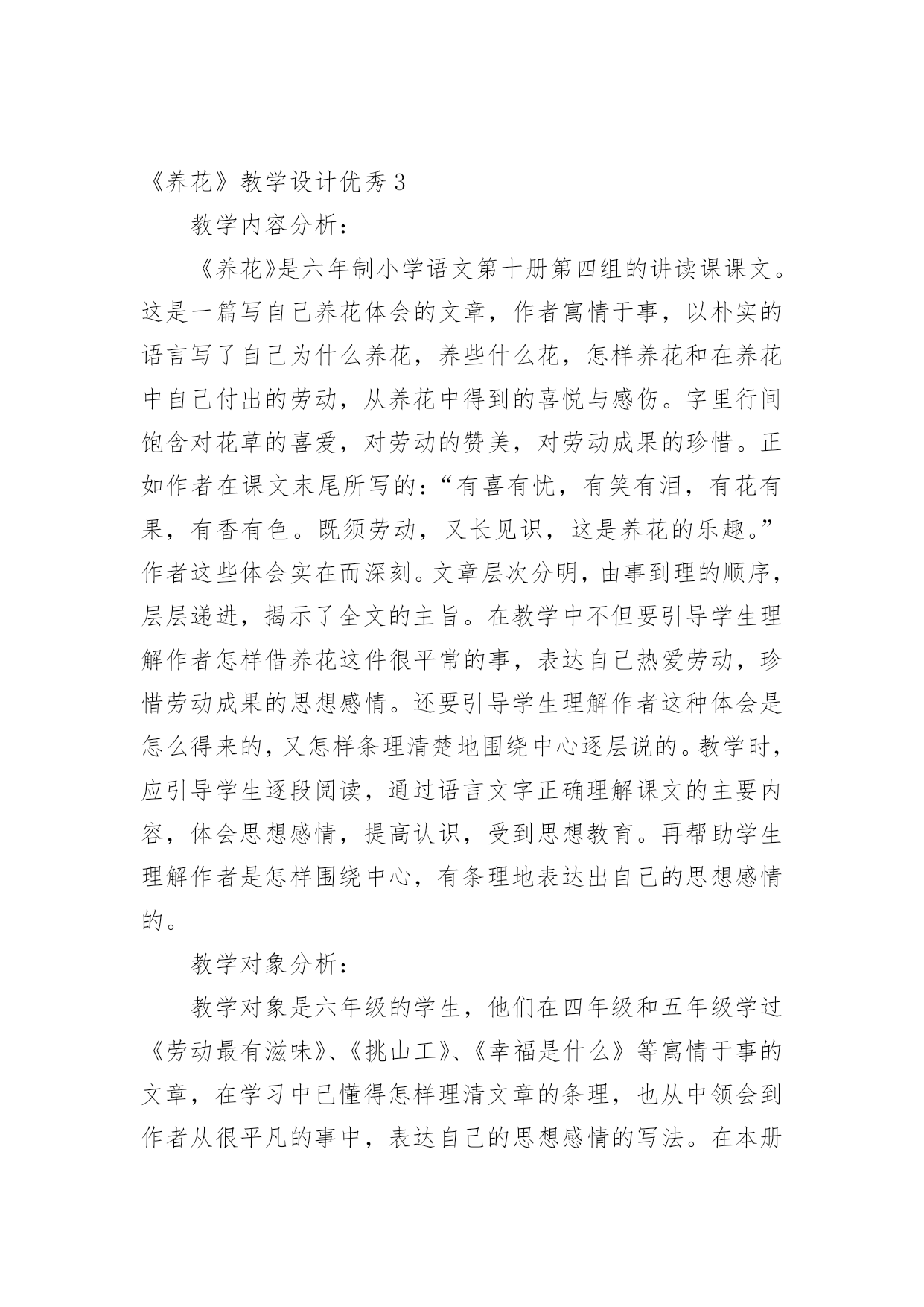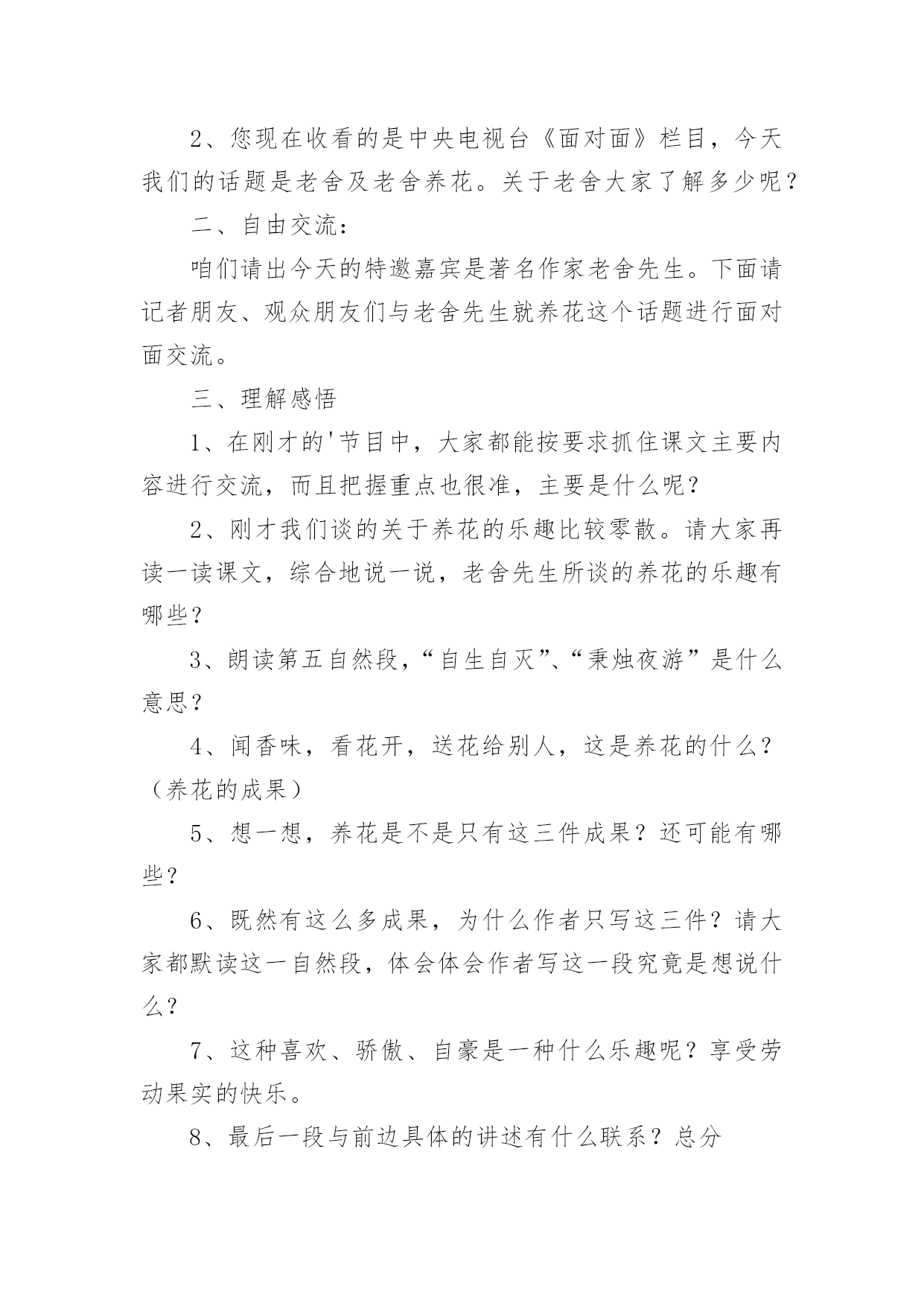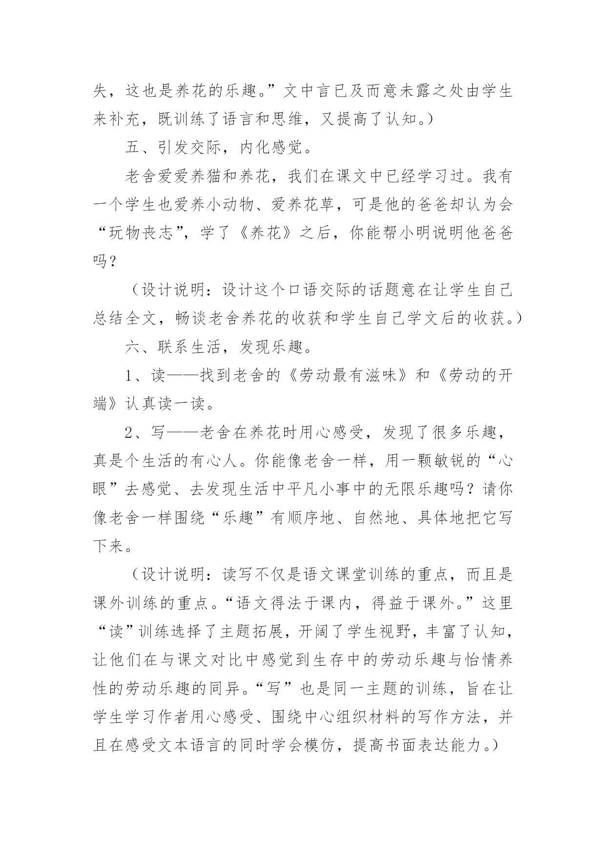 《养花》教学设计优秀作为一名教职工,通常需要准备好一份教学设计,教学设计是实现教学目标的计划性和决策性活动。那么优秀的教学设计是什么样的呢?以下是小编为大家整理的《养花》教学设计优秀,欢迎阅读,希望大家能够喜欢。《养花》教学设计优秀1教学目的:1、使学生体会养花既须劳动,又长见识,能给人们带来乐趣。2、在实践活动中加深对课文的理解。3、选择一种你喜欢的花草写一个片段,要写出它的特点和你为什么喜爱它。教学重点:引导学生理解课文的思想内容,体会作者的思想感情;了解作者是怎样把养花的乐趣写具体的。教学难点:1、了解作者是怎样把养花的乐趣写具体的。2、学习课文写法,选择一种你喜欢的花草写一个片段。一、谈话引入:1、上节课我们自学了课文,并且分别以老舍先生和记者先生及观众朋友的身份准备了一期《面对面》的现场节目,大家准备好了吗?2、您现在收看的是中央电视台《面对面》栏目,今天我们的话题是老舍及老舍养花。关于老舍大家了解多少呢?二、自由交流:咱们请出今天的特邀嘉宾是著名作家老舍先生。下面请记者朋友、观众朋友们与老舍先生就养花这个话题进行面对面交流。三、理解感悟1、在刚才的'节目中,大家都能按要求抓住课文主要内容进行交流,而且把握重点也很准,主要是什么呢?2、刚才我们谈的关于养花的乐趣比较零散。请大家再读一读课文,综合地说一说,老舍先生所谈的养花的乐趣有哪些?3、朗读第五自然段,“自生自灭”、“秉烛夜游”是什么意思?4、闻香味,看花开,送花给别人,这是养花的什么?(养花的成果)5、想一想,养花是不是只有这三件成果?还可能有哪些?6、既然有这么多成果,为什么作者只写这三件?请大家都默读这一自然段,体会体会作者写这一段究竟是想说什么?7、这种喜欢、骄傲、自豪是一种什么乐趣呢?享受劳动果实的快乐。8、最后一段与前边具体的讲述有什么联系?总分9、从作者讲的养花的乐趣中我们可以体会到作者对花的什么感情?你是从哪些地方体会到作者爱花之情的?找一找、划一划、读一读,再小组交流。10、谁能把你体会最深的一段有感情地读一读?11、通过了解老舍先生养花的乐趣,你有什么收获?在写法上还有没有收获呢?四、实践运用老舍先生不愧为大作家,一篇短短的《养花》竟给我们这么多启发。同学们,你们在养花中有些什么感受呢?你能写出来让大家同你分享吗?如果觉得有困难,也可以写写你最喜爱的花草。《养花》教学设计优秀2文本解读:《养花》这篇课文以朴实的语言记叙了老舍为什么养花,从养花中得到了什么乐趣。课文层次清楚,句和句,段和段之间连接紧密,过渡自然,逻辑性很强。作者老舍虽然是著名的作家,但是他行文语言娓娓道来,简洁生动,明白晓畅,如话家常,让读者感到亲切自然,感情丰富。例如:“摸着门道,花草养活了,而且三年五载老活着,开花,多么有意思呀!不是乱吹,这就是知识呀!”这平常的语言表达出掌握了一些养花方法之后的喜悦,感情充沛,溢于言表。此类语言,课文中比比皆是。文中有几处议论明理的句子学生理解稍困难些,而这又恰恰是老舍在养花过程中的感悟,既可以说是养花的乐趣,也可以说是生活中的情趣、获得知识的智趣和获得真理的理趣。由此处我们可以把作品中心定位于热爱生活、热爱劳动、追求真知真理、积极奋斗的的情感价值观。可见,作者之情、文中的精妙皆在于此,应此,当“重锤猛敲”,细细咀嚼,咬得字根香,嚼出文化味来。设计理念:培养语感,穿透语言的模糊性,读出文字背后蕴含的信息,感受语言的精妙;引导价值,走进作家的雅趣,感悟其中的情、智、理趣;引发思考,把结论(文章中心)转化为有价值的问题或活动,落实“课堂真正的主体是思维的主体”这一教学理念;设置阶梯,降低难度,让学生跳一跳,摘得到。教学目标:1、理解课文内容,体会作者的爱花之情和从养花中得到的乐趣(情趣、智趣、理趣)培养热爱生活、健康向上的情操。2、培养语感,理解作者是怎样把养花的乐趣写具体的,学习作者组材有序、叙事具体、过渡自然的写作方法。3、练习有感情的朗读课文。教学重难点:培养语感,理解课文中几处议论说理的.句子。教学准备:1、完成第一课时学习生字新词整体感知课文的教学任务。2、自制课件教学过程:课前互动,练习感觉:1、动作感觉:师动作演示,生感受烫、酸、冷2、语言感觉:冰()火()花()蜜()“千朵万朵压枝低”让人感觉花()“日出江花红胜火”让人感觉花开得很()“一枝红杏出墙来”让人感觉花有挡不住的()“接天莲叶无穷碧,映日荷花别样红”让人感觉花开得很()“留连戏蝶时时舞,自在娇莺恰恰啼”让人感觉花丛中很()一、谈话引入,瞄准感觉。从课前的感觉练习中,我们感觉到,花儿为我们的生活增添了缤纷的色彩,给了我们丰富而敏锐的感受。自古以来,诗人作家写花的很多,不同的诗人和作家对花的感觉不一样。我们已经读过《养花》这篇课文了,知道著名作家老舍正因为爱花,所以才