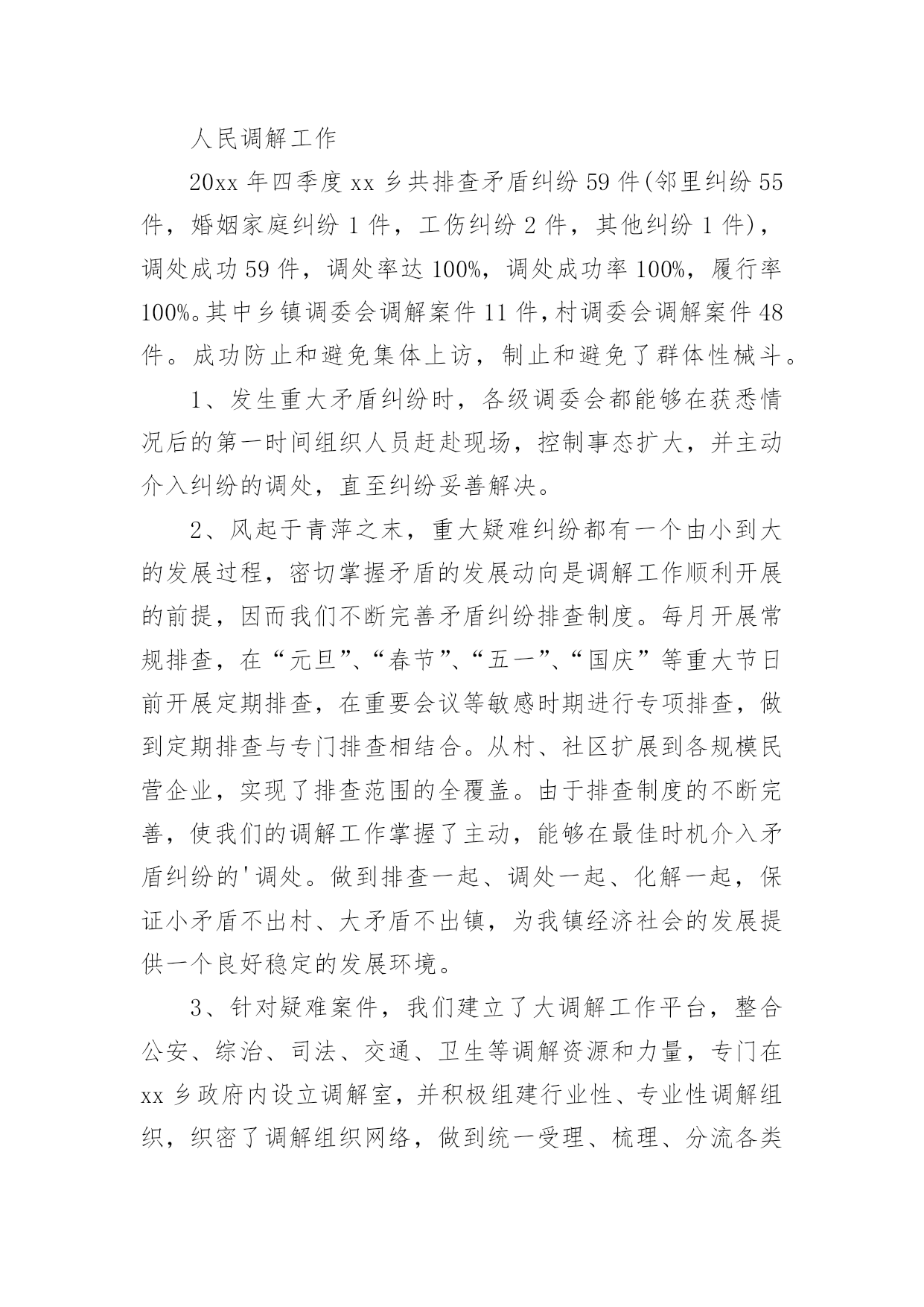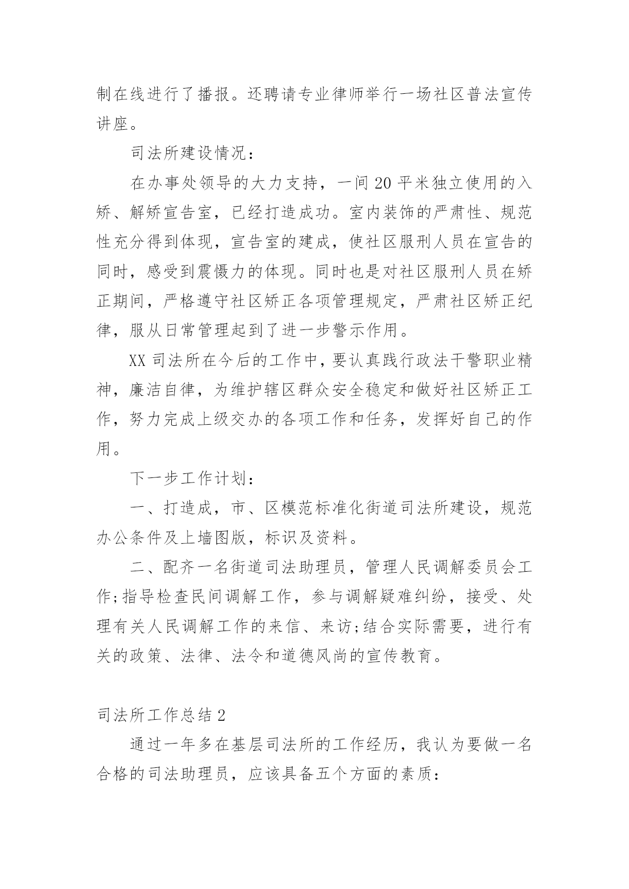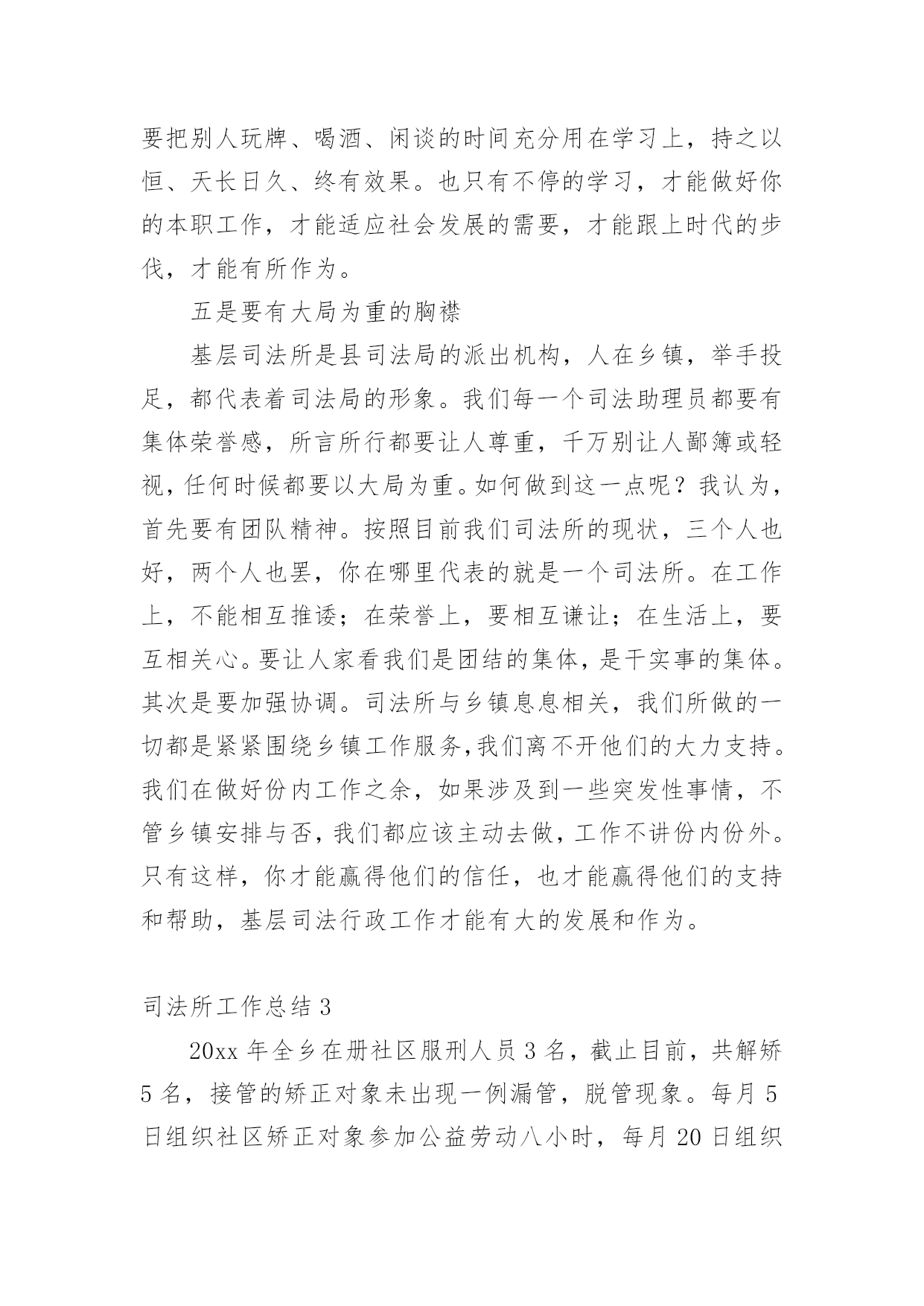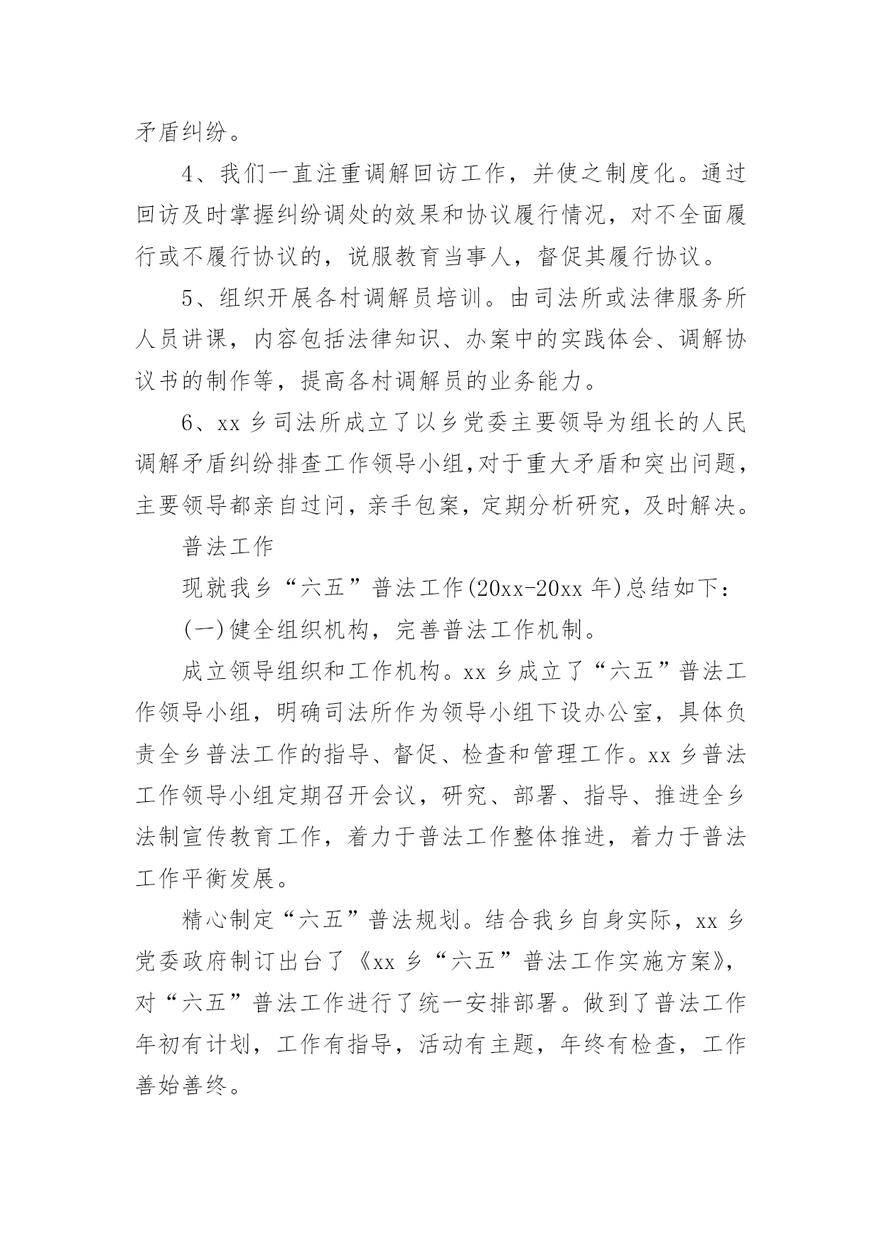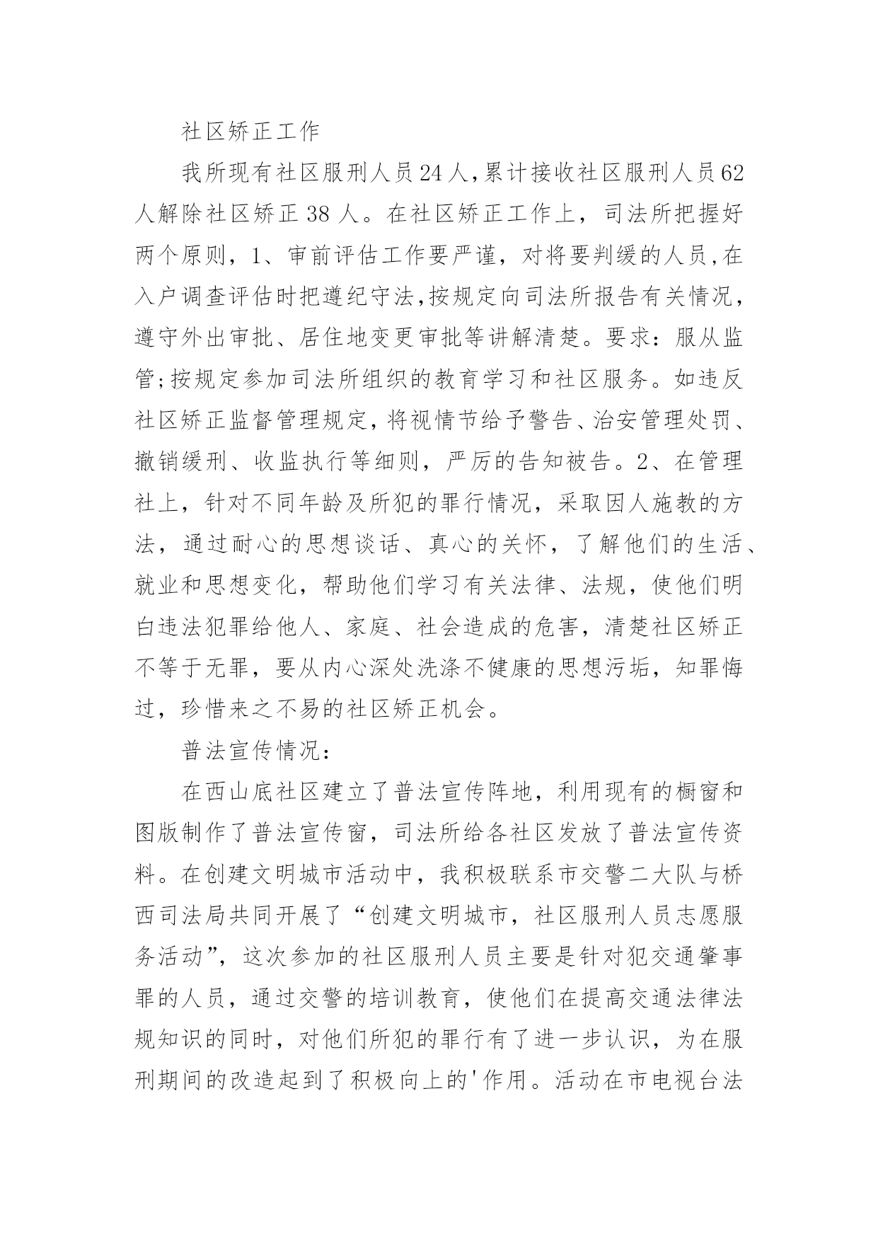 司法所工作总结总结是事后对某一时期、某一项目或某些工作进行回顾和分析,从而做出带有规律性的结论,它可以给我们下一阶段的学习和工作生活做指导,不如静下心来好好写写总结吧。那么我们该怎么去写总结呢?以下是小编为大家收集的司法所工作总结,希望能够帮助到大家。司法所工作总结1街道司法所,在区司法局、办事处党工委的正确领导下,认真践行政法干部职业精神,用坚定的政治责任感及强烈的责任心,不忘初心,牢记使命,爱岗敬业,立足本职工作,以一心为民的公仆精神,清正廉洁的高尚情操,在维护辖区稳定,促进社会公平正义,维护司法公正等方面做了一些具体工作。总结如下:人民调解工作人民调解工作上,我街共有6个社区,我所认真贯彻落实上级对调解工作的指示精神,在6个社区全部建立了调解队伍,并在西山底社区建立了以个人命名的,“刘爱祥调节室”、在西沟社区建立了“五姐妹调节室”还根据社区不同,建立了社区调委会。分别制定了各社区调解工作计划,进行了调解知识的培训。6个社区对辖区居民的矛盾纠纷进行了调解。8月.10月分别迎接了北京市西城区司法局、和省厅领导对“刘爱祥调节室”的参观和调研。社区矫正工作我所现有社区服刑人员24人,累计接收社区服刑人员62人解除社区矫正38人。在社区矫正工作上,司法所把握好两个原则,1、审前评估工作要严谨,对将要判缓的人员,在入户调查评估时把遵纪守法,按规定向司法所报告有关情况,遵守外出审批、居住地变更审批等讲解清楚。要求:服从监管;按规定参加司法所组织的教育学习和社区服务。如违反社区矫正监督管理规定,将视情节给予警告、治安管理处罚、撤销缓刑、收监执行等细则,严厉的告知被告。2、在管理社上,针对不同年龄及所犯的罪行情况,采取因人施教的方法,通过耐心的思想谈话、真心的关怀,了解他们的生活、就业和思想变化,帮助他们学习有关法律、法规,使他们明白违法犯罪给他人、家庭、社会造成的危害,清楚社区矫正不等于无罪,要从内心深处洗涤不健康的思想污垢,知罪悔过,珍惜来之不易的社区矫正机会。普法宣传情况:在西山底社区建立了普法宣传阵地,利用现有的橱窗和图版制作了普法宣传窗,司法所给各社区发放了普法宣传资料。在创建文明城市活动中,我积极联系市交警二大队与桥西司法局共同开展了“创建文明城市,社区服刑人员志愿服务活动”,这次参加的社区服刑人员主要是针对犯交通肇事罪的人员,通过交警的培训教育,使他们在提高交通法律法规知识的同时,对他们所犯的罪行有了进一步认识,为在服刑期间的改造起到了积极向上的'作用。活动在市电视台法制在线进行了播报。还聘请专业律师举行一场社区普法宣传讲座。司法所建设情况:在办事处领导的大力支持,一间20平米独立使用的入矫、解矫宣告室,已经打造成功。室内装饰的严肃性、规范性充分得到体现,宣告室的建成,使社区服刑人员在宣告的同时,感受到震慑力的体现。同时也是对社区服刑人员在矫正期间,严格遵守社区矫正各项管理规定,严肃社区矫正纪律,服从日常管理起到了进一步警示作用。XX司法所在今后的工作中,要认真践行政法干警职业精神,廉洁自律,为维护辖区群众安全稳定和做好社区矫正工作,努力完成上级交办的各项工作和任务,发挥好自己的作用。下一步工作计划:一、打造成,市、区模范标准化街道司法所建设,规范办公条件及上墙图版,标识及资料。二、配齐一名街道司法助理员,管理人民调解委员会工作;指导检查民间调解工作,参与调解疑难纠纷,接受、处理有关人民调解工作的来信、来访;结合实际需要,进行有关的政策、法律、法令和道德风尚的宣传教育。司法所工作总结2通过一年多在基层司法所的工作经历,我认为要做一名合格的司法助理员,应该具备五个方面的素质:一是要正确地进行自我定位司法助理员岗位在各乡(镇)的司法所,也就是说,人在乡镇,工作在乡镇,所办的事也是乡(镇)的事。司法助理员要承担司法所的各项工作职能,其主要职责就是围绕乡镇的法制建设和维护社会稳定开展工作,而这些工作的开展、落实和完成,承载的主体就是我们司法助理员。所以要将司法行政工作当作事业去做,把司法所当作自己的家去经营。每个人的工作定位各不相同,有的人认为官儿做得大、待遇高便是一个成功的人,社会上很多人也这么认为。但我认为:人的命运、工作的选择不一定完全掌握在自己的手中,人的生命是有限的,有一个数学家他一生中只做了一件事,就是研究数学,我们如果把司法行政工作做好了也就不错了。我对待司法行政工作的态度就是:“在工作中取乐,乐在工作中;在工作中提高,提高为的是工作有成效”。二是要有吃苦耐劳的心理准备乡镇比起县城,各方面条件要差一些,尤其是一些比较偏远,交通不便,经济不发达的乡镇,所遇到的困难会更多些,地理位置和经济上的差异会给人们的工作和生活带来一定的影响。但乡镇也是一个综合训练场,你在那里什么样的事都会遇到,与什么样的人都会打交道,你成不成材
