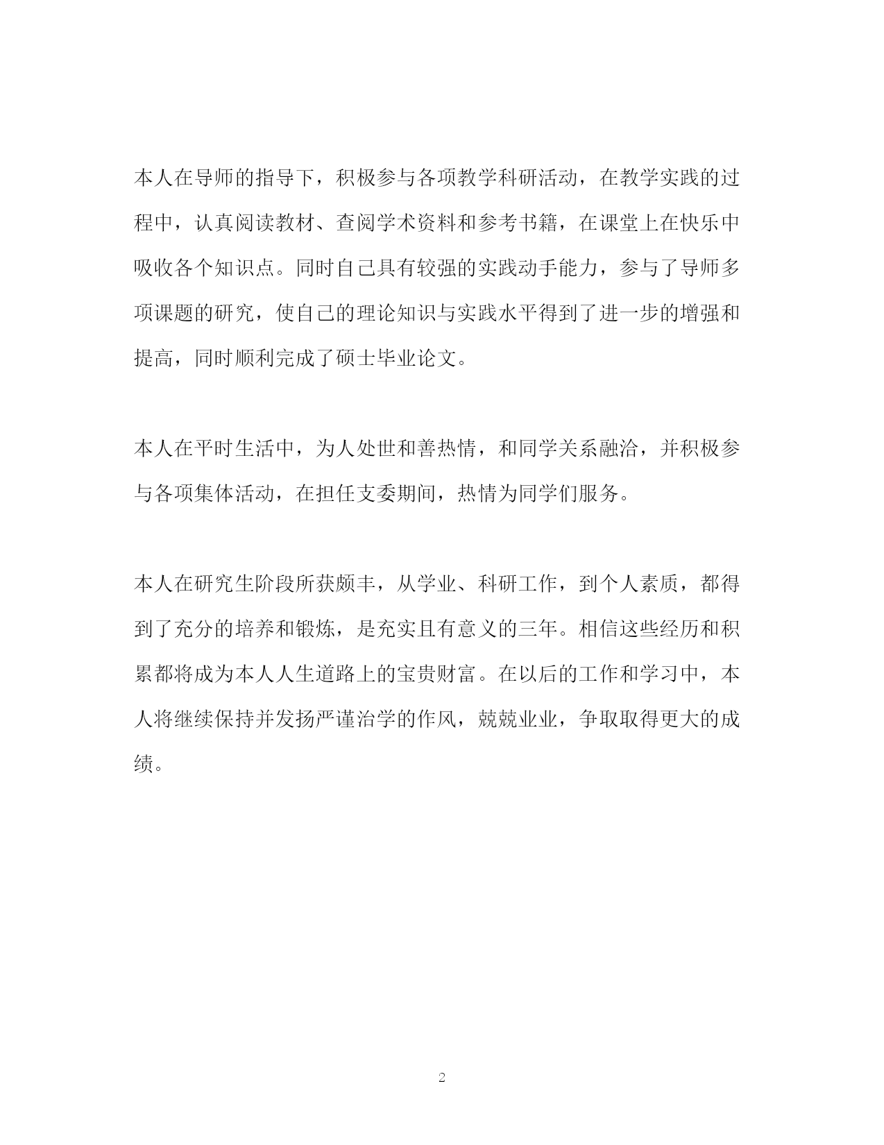 此资料由网络收集而来,如有侵权请告知上传者立即删除。资料共分享,我们负责传递知识。PAGEPAGE2自我鉴定研究生自我鉴定研究生本人在硕士研究生学习阶段,思想上要求上进,认真学习,努力钻研专业知识,毕业之际,回顾三年来的学习、工作以及生活,做自我鉴定如下:本人在思想觉悟上始终对自己有较高的要求,主动和党组织靠拢,尽管自己还没有计入党组织,但是自己始终以共产党员的高标准要求自己,能用科学发展观来认识世界认识社会,能清醒的意识到自己所担负的社会责任,对个人的人生理想和发展目标,有了相对成熟的认识和定位。本人在专业课程的学习上,根据自身研究方向的要求,有针对性的认真研读了有关核心课程,为自己的科研工作打下扎实基础;并涉猎了一部分其他课程,开阔视野,对本人研究方向的应用背景以及整个学科的.结构有了宏观的认识。在英语学习方面,通过了大学英语六级考试,具备了较强的英语听说能力,在撰写论文期间,查阅了大量的英文资料。本人在导师的指导下,积极参与各项教学科研活动,在教学实践的过程中,认真阅读教材、查阅学术资料和参考书籍,在课堂上在快乐中吸收各个知识点。同时自己具有较强的实践动手能力,参与了导师多项课题的研究,使自己的理论知识与实践水平得到了进一步的增强和提高,同时顺利完成了硕士毕业论文。本人在平时生活中,为人处世和善热情,和同学关系融洽,并积极参与各项集体活动,在担任支委期间,热情为同学们服务。本人在研究生阶段所获颇丰,从学业、科研工作,到个人素质,都得到了充分的培养和锻炼,是充实且有意义的三年。相信这些经历和积累都将成为本人人生道路上的宝贵财富。在以后的工作和学习中,本人将继续保持并发扬严谨治学的作风,兢兢业业,争取取得更大的成绩。