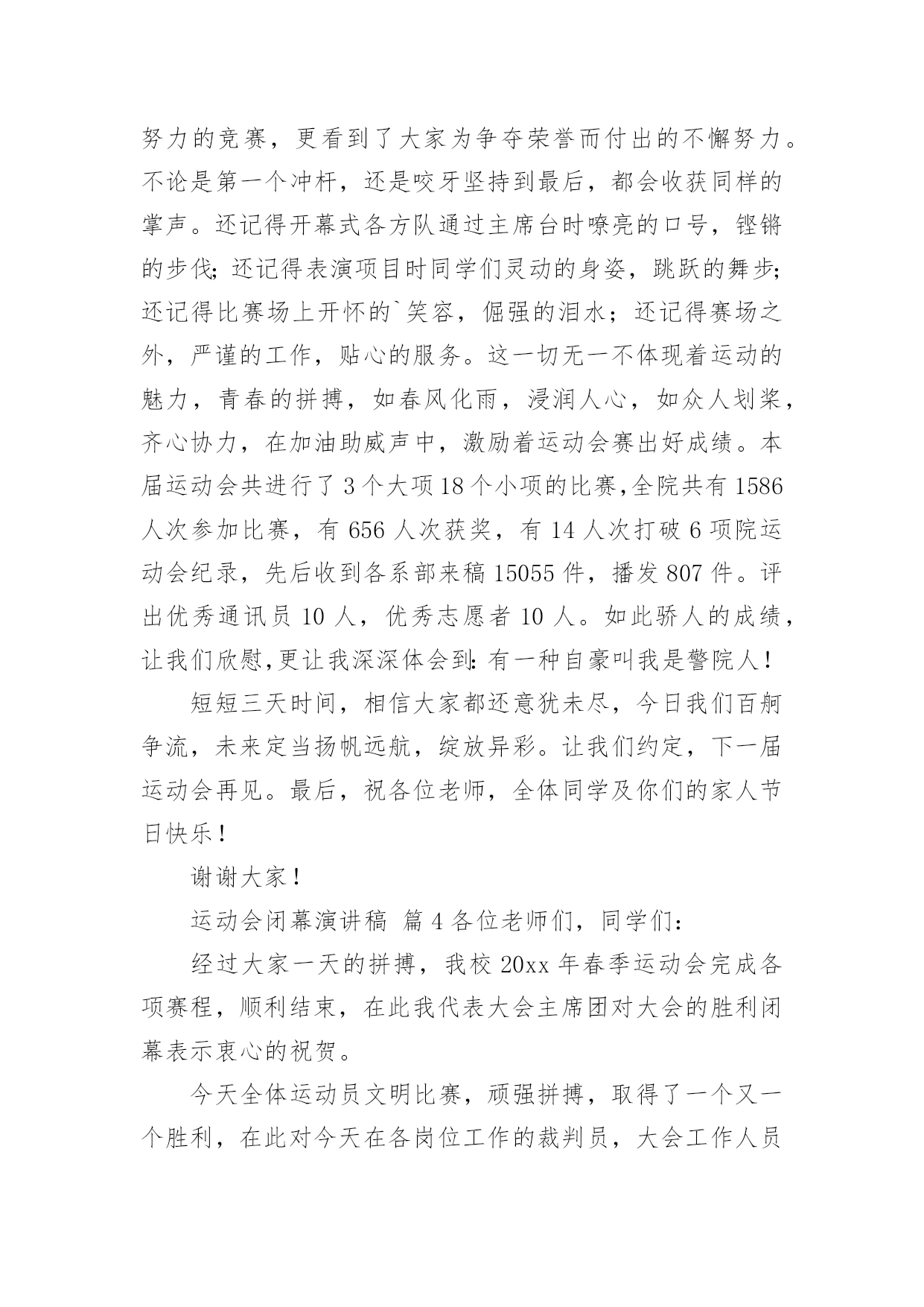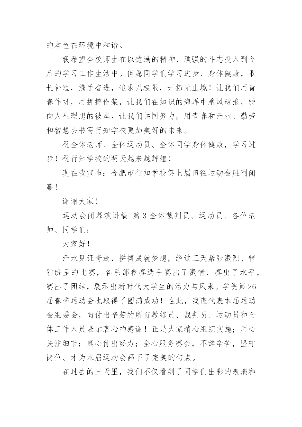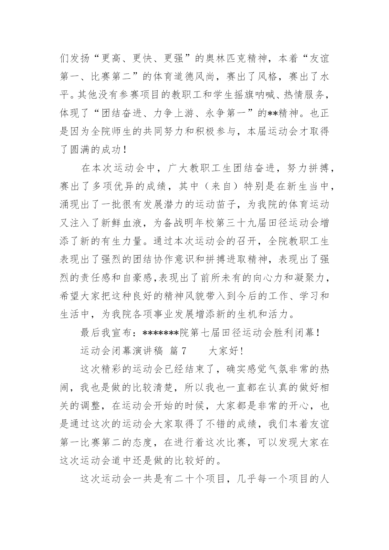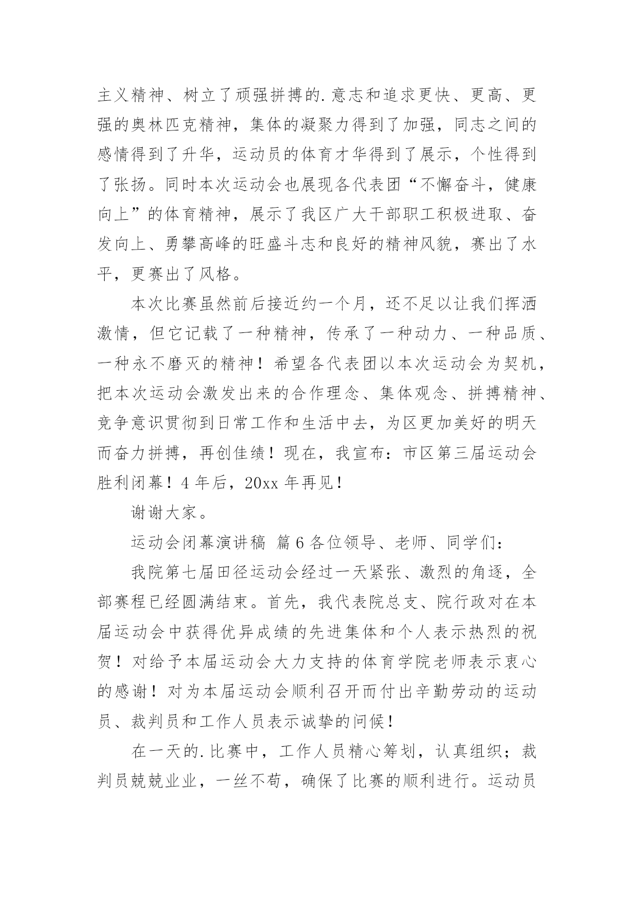 运动会闭幕演讲稿运动会闭幕演讲稿使用正确的写作思路书写演讲稿会更加事半功倍。在现在的社会生活中,需要使用演讲稿的事情愈发增多,那么一般演讲稿是怎么写的呢?下面是小编整理的运动会闭幕演讲稿,供大家参考借鉴,希望可以帮助到有需要的朋友。运动会闭幕演讲稿篇1各位领导、各位来宾,同志们:大家好!短暂、紧张、刺激、催人奋进的x天赛事即将结束。两天时间,将在我们的心中永远珍藏,感谢各级领导,感谢所有出色的参赛运动员,感谢组委会全体工作人员。通过此次运动会,既增进了同事间的`交流与了解,也增进了社会各界对公司的了解。来自公司x个职能部门的职工们在x体育馆同场竞技,用他们的精湛技艺和顽强的作风博得了我们的感叹。我们既钦佩他们的才能与风采,更钦佩他们的坚持和不懈。在庆祝首届职工运动会圆满成功之际,让我们一起祝福在此次运动会上取得名次的职工运动员,希望你们在今后的公司发展道路上继续发扬顽强拼搏精神,再接再厉,创先争优,为实现企业又好又快发展作用应有的贡献。没有取得名次的同志们,你们也是我们广大员工学习的楷模,你们的出色表现充分展示了集体团结的力量和各自的战斗力,希望你们回到各自工作岗位后让这种精神相互激励,相互促进,发扬光大,生生不息。这是一届非常成功的运动会!现在,遵照闭幕式议程安排,我宣布:公司首届职工运动会闭幕!运动会闭幕演讲稿篇2各位裁判员、运动员、老师们、同学们:经过两天半的拼搏,在全校师生的共同努力下,共有32个代表队参加、801名运动员参赛的合肥市行知学校第七届田径运动会即将闭幕了,这次大会展现了全体参赛运动员不畏困难,挑战自我,顽强拼搏,追求更强的良好精神风貌;展现了全体裁判员和工作人员坚守工作岗位,认真负责、公正裁判,任劳任怨、热情服务的良好工作态度和较高的工作热情。在此,我代表学校对这次运动会取得了圆满成功表示热烈祝贺!对顽强拼搏、勇攀高峰,取得了骄人成绩的运动员致以诚挚的问候!对辛勤劳动、无私奉献的全体裁判员和和积极参与本次运动会的.老师、同学表示衷心的感谢!这次运动会是对我校师生的一次检验,我校师生在本次运动会上表现出了较高的体育道德风范。运动场上到处都洋溢着师生的欢声笑语。但在这背后,蕴涵着全体体育教师多天来的辛勤汗水,你们为筹备这次运动会精心训练运动员,默默无闻的做了大量的工作;蕴涵着班主任、任课教师的不懈努力,你们认真组织、精心布置,为开好运动会,为使同学们度过一个难忘的运动会而费尽了心机;本次运动会更蕴涵着全体运动员们顽强的意志,坚韧的品格,你们积极参与,出色发挥,努力为班级增光添彩。通过本次运动会,我们将选拔出了一批优秀的体育运动员,学校将予以重点培养。通过本次运动会,锻炼了我们的学生,团结了我们的教师队伍,达到了预期的目的。马上就到国庆长假了,值此运动会闭幕之际,我向各位同学提几点建议:1、不要泡电视或玩游戏。不要让冗长的电视剧和无聊的游戏庸俗了你纯真的目光。2、要学会尊重父母。父母是家庭的脊梁,尊重父母,人生就有了道德第一道防线。3、要相信老师所说的话。学习上可以质疑,教育上要相信老师,苦口婆心地劝说,三番五次地教育,除了父母只有老师相信你经过努力可以并且不断进步。4、要热爱学习。学习是你们追求进步,改变处境的出路,学习是一种品质,验证着你们前进的能力。5、要学会劳动。从今天开始就坚持劳动,让劳动成为习惯,让劳动成为品质,人生就增添了最亮的底色。6、要学会读书。把读书当做享受,读书意味着放松。因为读一本好书,就是打开一扇窗,窗外阳光灿烂,丰富多彩。学会读书,一生受用。7、要学会踏实做事。相信自己的努力,不懈的努力一定可以换取明天的亮丽。8、要学会与他人相处。善待他人,尊重别人,让纯真的本色在环境中和谐。我希望全校师生在以饱满的精神、顽强的斗志投入到今后的学习工作生活中。但愿同学们学习进步、身体健康,取长补短,携手奋进,追求无极限,开拓无止境!让我们用青春作帆,用拼搏作桨,让我们在知识的海洋中乘风破浪,驶向人生理想的彼岸。让我们共同努力,用青春和汗水、勤劳和智慧去书写行知学校更加美好的未来。祝全体老师、全体运动员、全体同学身体健康,学习进步!祝行知学校的明天越来越辉煌!现在我宣布:合肥市行知学校第七届田径运动会胜利闭幕!谢谢大家!运动会闭幕演讲稿篇3全体裁判员、运动员、各位老师、同学们:大家好!汗水见证奇迹,拼搏成就梦想,经过三天紧张激烈、精彩纷呈的比赛,各系部参赛选手赛出了激情、赛出了水平,赛出了团结,展示出新时代大学生的活力与风采。学院第26届春季运动会也取得了圆满成功!在此,我谨代表本届运动会组委会,向付出辛劳的所有教练员、裁判员、运动员和全体工作人员表示衷心的感谢!正是大家精心组织实施;用心关注细节;真心付出努力;全心服务赛会,不辞辛苦,坚守岗位、才为本届运动会画下了完美的句点。在过去的三天里,我们