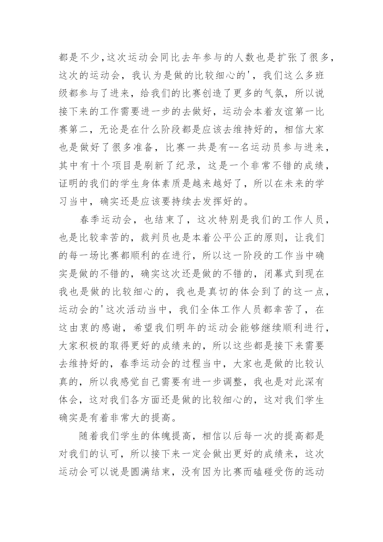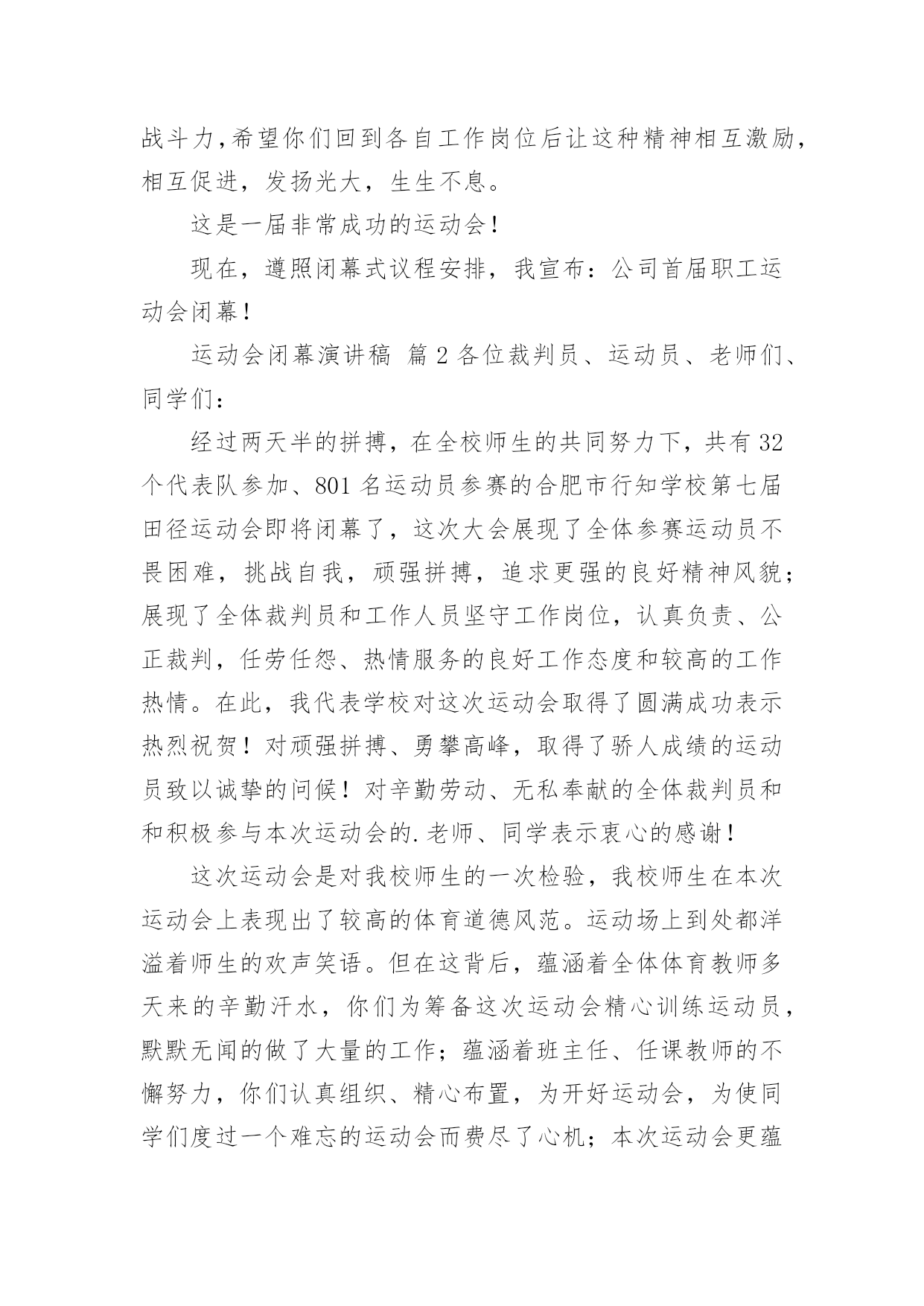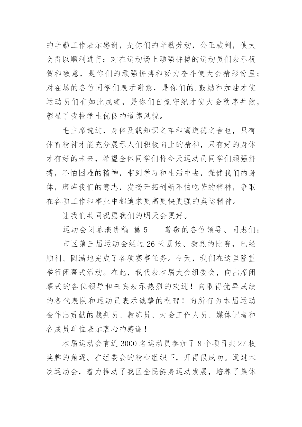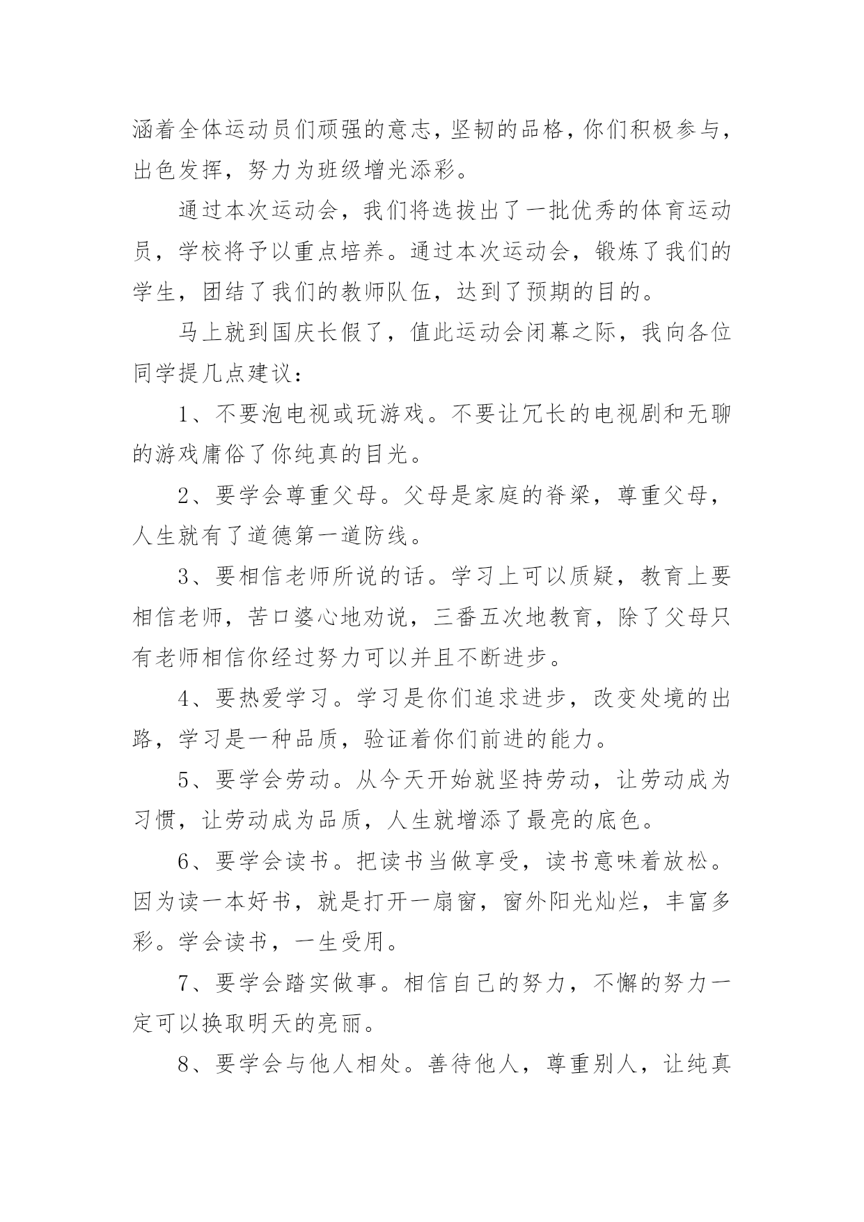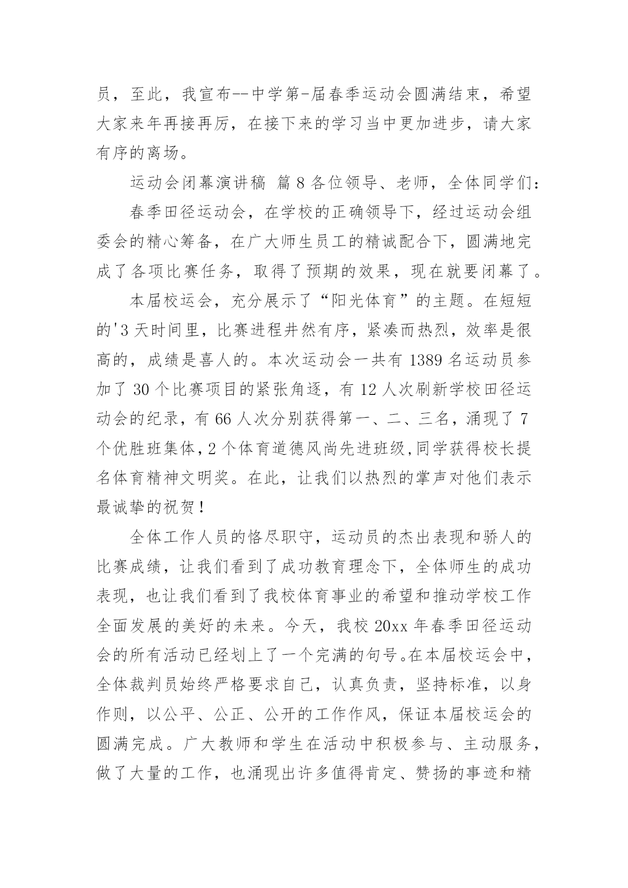 运动会闭幕演讲稿运动会闭幕演讲稿使用正确的写作思路书写演讲稿会更加事半功倍。在现在的社会生活中,需要使用演讲稿的事情愈发增多,那么一般演讲稿是怎么写的呢?下面是小编整理的运动会闭幕演讲稿,供大家参考借鉴,希望可以帮助到有需要的朋友。运动会闭幕演讲稿篇1各位领导、各位来宾,同志们:大家好!短暂、紧张、刺激、催人奋进的x天赛事即将结束。两天时间,将在我们的心中永远珍藏,感谢各级领导,感谢所有出色的参赛运动员,感谢组委会全体工作人员。通过此次运动会,既增进了同事间的`交流与了解,也增进了社会各界对公司的了解。来自公司x个职能部门的职工们在x体育馆同场竞技,用他们的精湛技艺和顽强的作风博得了我们的感叹。我们既钦佩他们的才能与风采,更钦佩他们的坚持和不懈。在庆祝首届职工运动会圆满成功之际,让我们一起祝福在此次运动会上取得名次的职工运动员,希望你们在今后的公司发展道路上继续发扬顽强拼搏精神,再接再厉,创先争优,为实现企业又好又快发展作用应有的贡献。没有取得名次的同志们,你们也是我们广大员工学习的楷模,你们的出色表现充分展示了集体团结的力量和各自的战斗力,希望你们回到各自工作岗位后让这种精神相互激励,相互促进,发扬光大,生生不息。这是一届非常成功的运动会!现在,遵照闭幕式议程安排,我宣布:公司首届职工运动会闭幕!运动会闭幕演讲稿篇2各位裁判员、运动员、老师们、同学们:经过两天半的拼搏,在全校师生的共同努力下,共有32个代表队参加、801名运动员参赛的合肥市行知学校第七届田径运动会即将闭幕了,这次大会展现了全体参赛运动员不畏困难,挑战自我,顽强拼搏,追求更强的良好精神风貌;展现了全体裁判员和工作人员坚守工作岗位,认真负责、公正裁判,任劳任怨、热情服务的良好工作态度和较高的工作热情。在此,我代表学校对这次运动会取得了圆满成功表示热烈祝贺!对顽强拼搏、勇攀高峰,取得了骄人成绩的运动员致以诚挚的问候!对辛勤劳动、无私奉献的全体裁判员和和积极参与本次运动会的.老师、同学表示衷心的感谢!这次运动会是对我校师生的一次检验,我校师生在本次运动会上表现出了较高的体育道德风范。运动场上到处都洋溢着师生的欢声笑语。但在这背后,蕴涵着全体体育教师多天来的辛勤汗水,你们为筹备这次运动会精心训练运动员,默默无闻的做了大量的工作;蕴涵着班主任、任课教师的不懈努力,你们认真组织、精心布置,为开好运动会,为使同学们度过一个难忘的运动会而费尽了心机;本次运动会更蕴涵着全体运动员们顽强的意志,坚韧的品格,你们积极参与,出色发挥,努力为班级增光添彩。通过本次运动会,我们将选拔出了一批优秀的体育运动员,学校将予以重点培养。通过本次运动会,锻炼了我们的学生,团结了我们的教师队伍,达到了预期的目的。马上就到国庆长假了,值此运动会闭幕之际,我向各位同学提几点建议:1、不要泡电视或玩游戏。不要让冗长的电视剧和无聊的游戏庸俗了你纯真的目光。2、要学会尊重父母。父母是家庭的脊梁,尊重父母,人生就有了道德第一道防线。3、要相信老师所说的话。学习上可以质疑,教育上要相信老师,苦口婆心地劝说,三番五次地教育,除了父母只有老师相信你经过努力可以并且不断进步。4、要热爱学习。学习是你们追求进步,改变处境的出路,学习是一种品质,验证着你们前进的能力。5、要学会劳动。从今天开始就坚持劳动,让劳动成为习惯,让劳动成为品质,人生就增添了最亮的底色。6、要学会读书。把读书当做享受,读书意味着放松。因为读一本好书,就是打开一扇窗,窗外阳光灿烂,丰富多彩。学会读书,一生受用。7、要学会踏实做事。相信自己的努力,不懈的努力一定可以换取明天的亮丽。8、要学会与他人相处。善待他人,尊重别人,让纯真的本色在环境中和谐。我希望全校师生在以饱满的精神、顽强的斗志投入到今后的学习工作生活中。但愿同学们学习进步、身体健康,取长补短,携手奋进,追求无极限,开拓无止境!让我们用青春作帆,用拼搏作桨,让我们在知识的海洋中乘风破浪,驶向人生理想的彼岸。让我们共同努力,用青春和汗水、勤劳和智慧去书写行知学校更加美好的未来。祝全体老师、全体运动员、全体同学身体健康,学习进步!祝行知学校的明天越来越辉煌!现在我宣布:合肥市行知学校第七届田径运动会胜利闭幕!谢谢大家!运动会闭幕演讲稿篇3全体裁判员、运动员、各位老师、同学们:大家好!汗水见证奇迹,拼搏成就梦想,经过三天紧张激烈、精彩纷呈的比赛,各系部参赛选手赛出了激情、赛出了水平,赛出了团结,展示出新时代大学生的活力与风采。学院第26届春季运动会也取得了圆满成功!在此,我谨代表本届运动会组委会,向付出辛劳的所有教练员、裁判员、运动员和全体工作人员表示衷心的感谢!正是大家精心组织实施;用心关注细节;真心付出努力;全心服务赛会,不辞辛苦,坚守岗位、才为本届运动会画下了完美的句点。在过去的三天里,我们