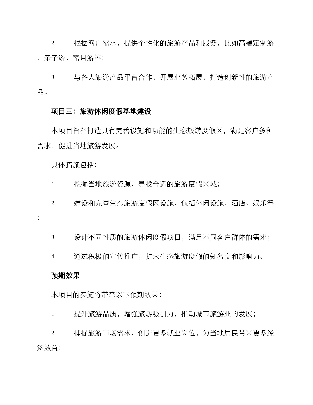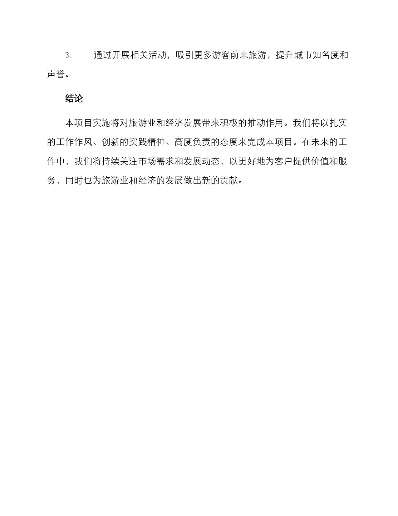 旅游项目汇报方案介绍本文档旨在向有关方面汇报旅游项目方案,为未来的旅游发展提供支持和参考。本项目致力于挖掘旅游资源,打造旅游新亮点,提升城市旅游形象,推动地方经济发展。项目目标打造旅游新亮点:将城市旅游资源进行挖掘和整合,打造具有特色的旅游项目,提供丰富多彩的旅游体验。提升城市旅游形象:通过积极推广,加大宣传力度,提升城市旅游形象,吸引更多的游客前来旅游。推动地方经济发展:开展相关旅游项目将为当地经济注入新的活力,带动相关产业发展,推动地方经济稳健增长。项目实施项目背景随着经济的快速发展,旅游业作为支柱产业得到了快速发展。然而,我市的旅游业发展依然面临着一些挑战。旅游资源闲置、景区开发不足、产品同质化等问题仍然存在。为了解决这些问题,本项目应运而生。本项目通过深入分析市场需求,结合旅游资源的情况,在充分调研和论证的基础上,提出了一系列的旅游项目方案,以打造旅游新亮点、提升城市旅游形象、推动地方经济发展为目标。项目内容项目一:景区开发与升级本项目主要针对我市已有的一些旅游景区进行开发和升级,进一步提升景区的品质和特色,吸引更多的游客前来旅游。具体措施包括:对现有景区进行再造,提升景区品质,改善游客体验;挖掘景区资源,推出更多丰富多彩的旅游项目;开发新的景区资源,丰富城市旅游基础设施;根据市场需求,制定合理的价格和旅游路线,丰富游客的品质旅游体验。项目二:旅游产品定制服务本项目提供个性化的旅游产品定制服务,满足客户各类需求,打造更加舒适、便利和贴心的旅游体验。具体措施包括:设立旅游定制服务机构,为有需要的游客提供各类定制服务;根据客户需求,提供个性化的旅游产品和服务,比如高端定制游、亲子游、蜜月游等;与各大旅游产品平台合作,开展业务拓展,打造创新性的旅游产品。项目三:旅游休闲度假基地建设本项目旨在打造具有完善设施和功能的生态旅游度假区,满足客户多种需求,促进当地旅游发展。具体措施包括:挖掘当地旅游资源,寻找合适的旅游度假区域;建设和完善生态旅游度假区设施,包括休闲设施、酒店、娱乐等;设计不同性质的旅游休闲度假项目,满足不同客户群体的需求;通过积极的宣传推广,扩大生态旅游度假的知名度和影响力。预期效果本项目的实施将带来以下预期效果:提升旅游品质,增强旅游吸引力,推动城市旅游业的发展;捕捉旅游市场需求,创造更多就业岗位,为当地居民带来更多经济效益;通过开展相关活动,吸引更多游客前来旅游,提升城市知名度和声誉。结论本项目实施将对旅游业和经济发展带来积极的推动作用。我们将以扎实的工作作风、创新的实践精神、高度负责的态度来完成本项目。在未来的工作中,我们将持续关注市场需求和发展动态,以更好地为客户提供价值和服务,同时也为旅游业和经济的发展做出新的贡献。
