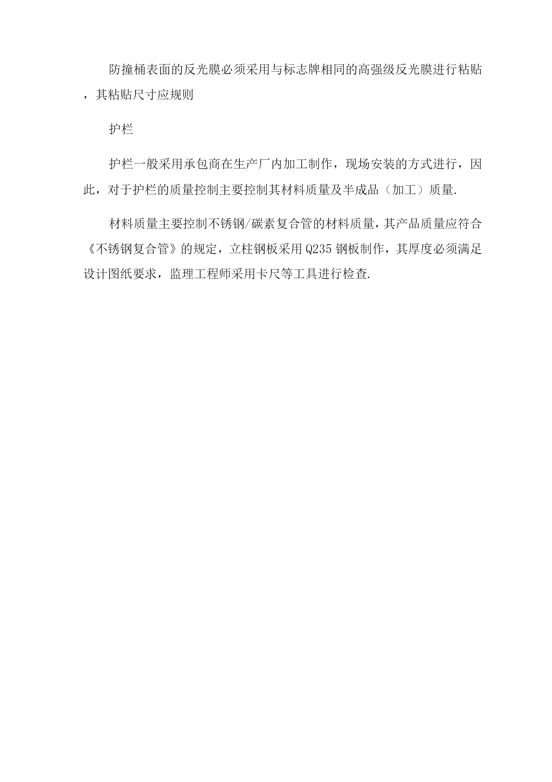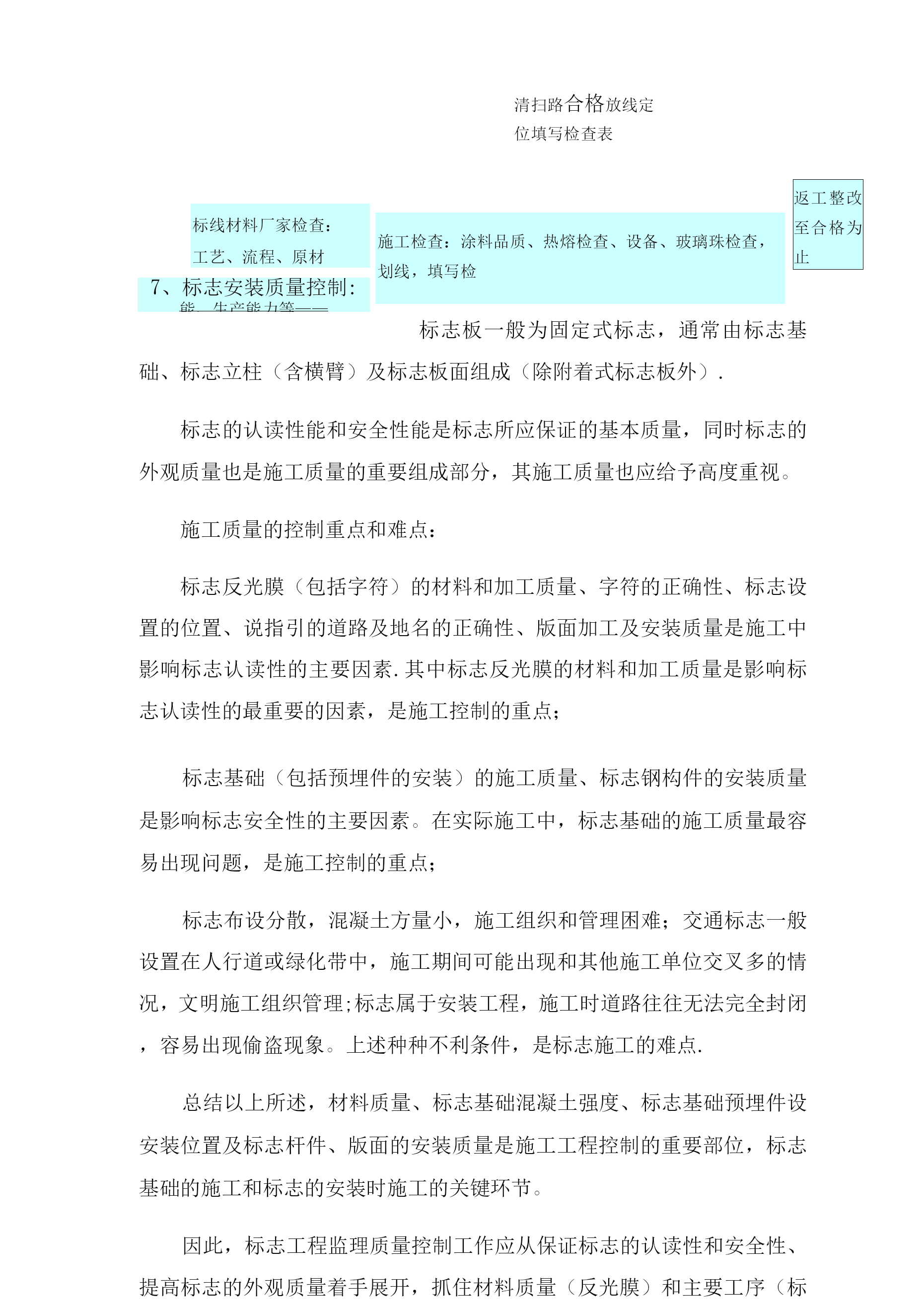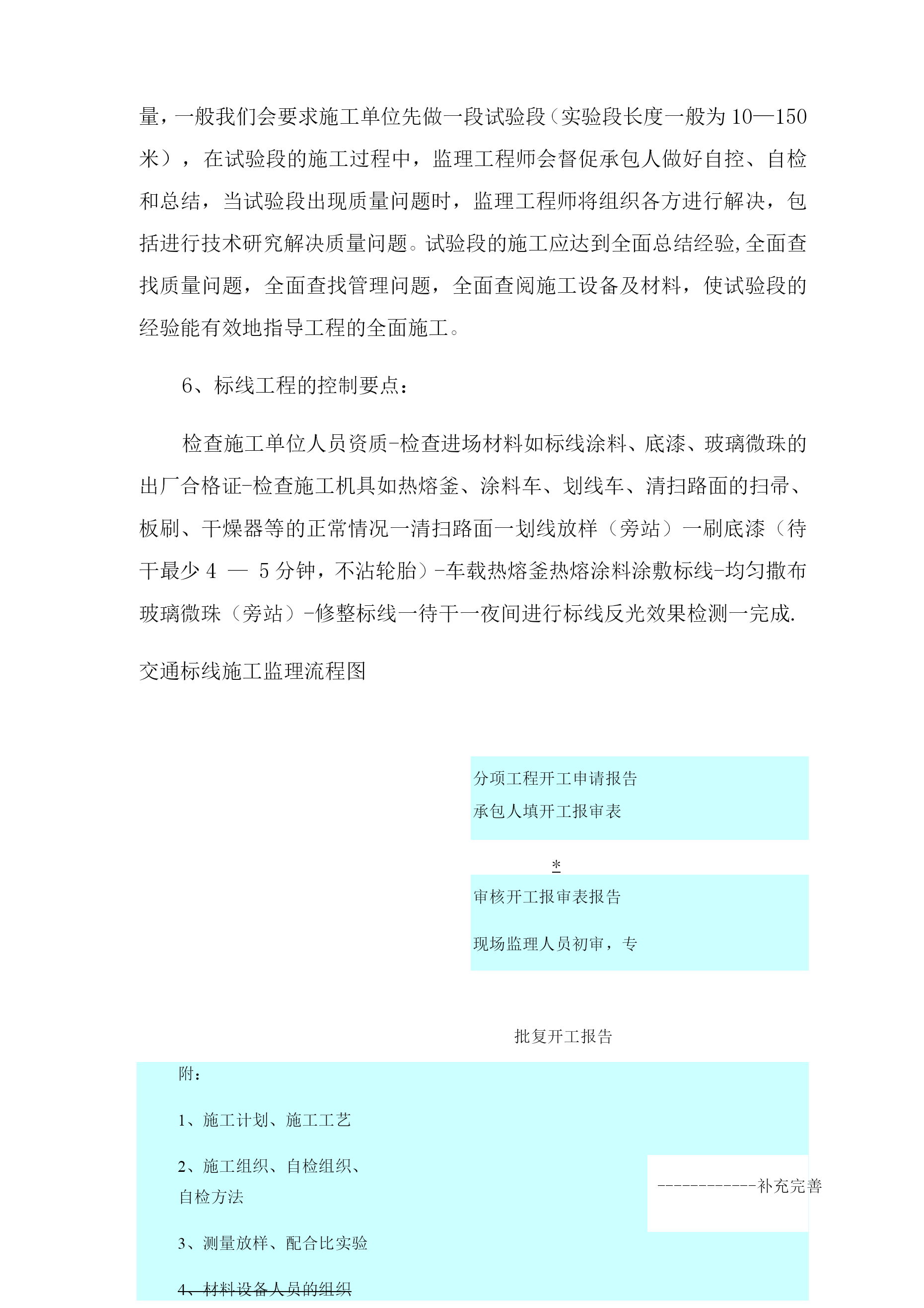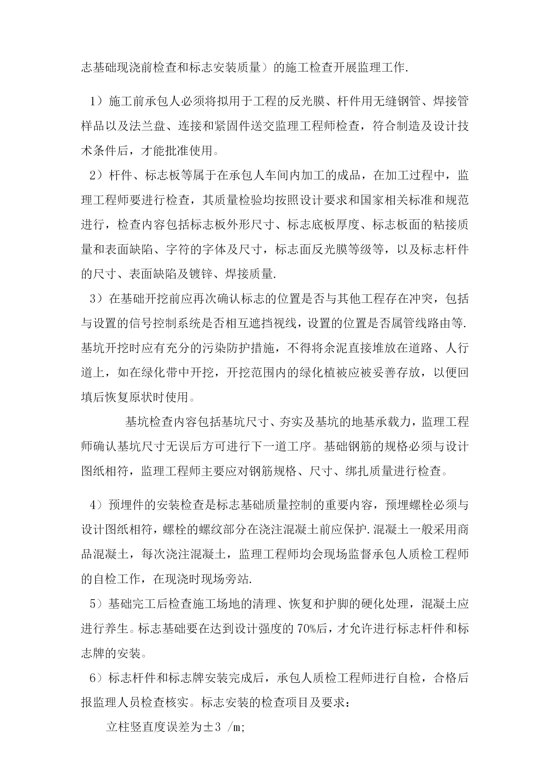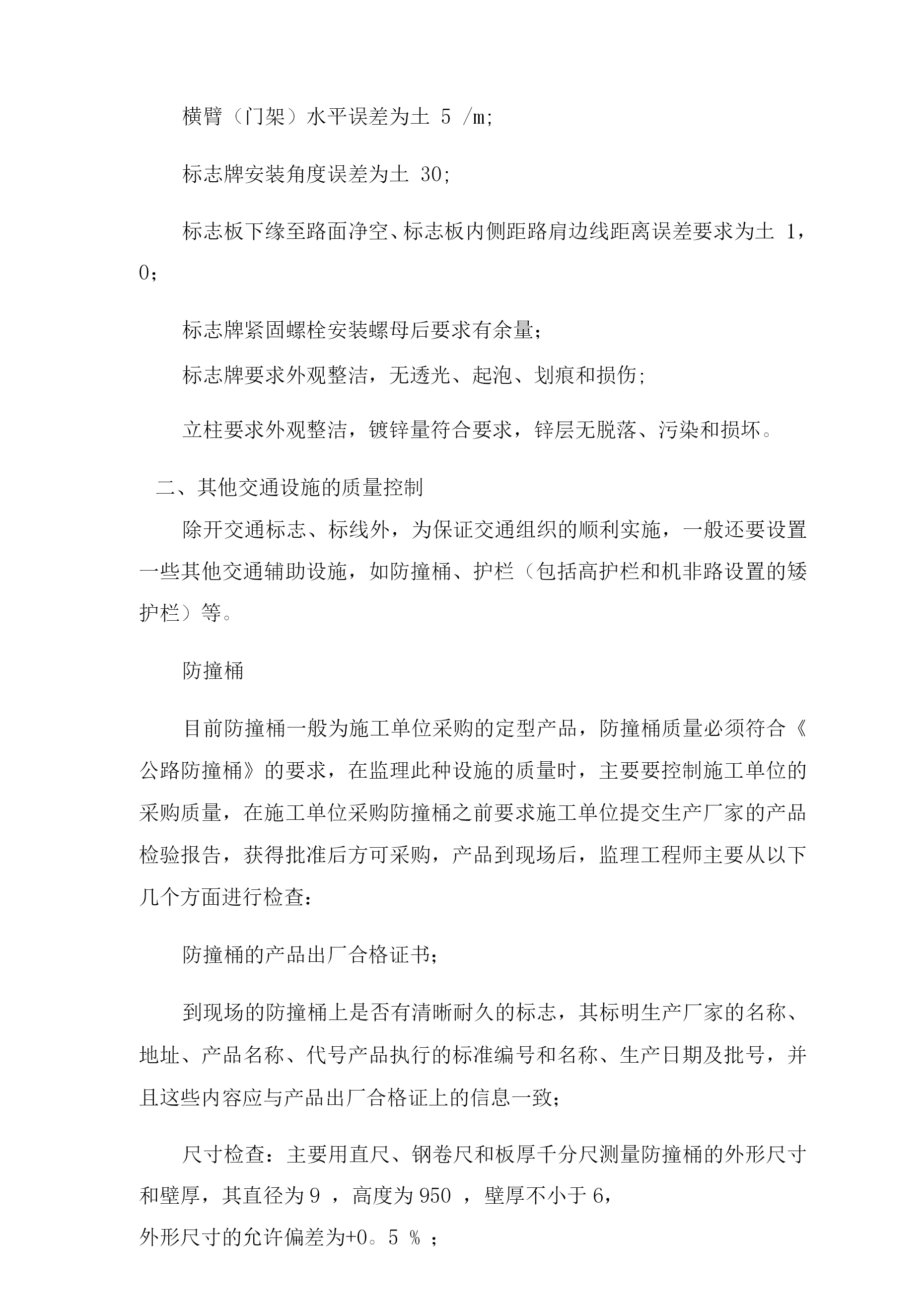 交通工程质量控制一、主要交通设施质量控制1、复核交通标线的现场定位资料,对承包人在标线施工前的放线进行现场检查、复核并认可,由于成金路是新建道路,在标线施工前,为便于施工,可封闭交通,要求施工定位采用水线放样,监理工程师按照设计图纸的量距定位。标线的放线检查内容包括:间距、横向定位、线形等,标线的线形应流畅,与道路线形相协调,曲线圆滑,一般不允许出现折线。2、检查进场材料质量,要求承包人在施工前提交标线涂料、反光玻璃珠的检验报告等资料,确认其质量符合《路面标线材料》的要求;施工时对进场材料的包装、材料等进行检查,确保承包人使用的材料与批准使用的材料相符,主要的检查项目包括如下内容:生产合格证明书:涂料外观不得发黄发暗,无含杂质等缺陷;玻璃珠要求颗粒均匀,光泽较好。3、标线的施工机械对标线的施工质量有较大影响,监理工程师在施工前将照合同文件进行检查,确保其使用的机械(如划线机)的设备型号及性能不得低于合同文件的要求.4、在标线施工前,要求施工单位对路面的清洁干燥情况进行检查,如发现路面有不清洁的情况,应及时进行清洁,道路不干燥不允许施工;划线按放线的线形和放样确定的间距施工,标线涂划前,检查热熔型涂料的温度是否合适,玻璃珠撒放是否正常,然后才进行施工,施工前还必须检查底漆的涂抹是否均匀到位;标线施划时注意不得污染路面,在是否箭头、文字时注意遮挡不需施划的路面;5、由于本次施工采用热熔型涂料,涂料与路面是高温结合,且在野外施工,因此施工中可能会出现一些缺陷,如气孔、龟裂等,为确保施工质量,一般我们会要求施工单位先做一段试验段(实验段长度一般为10—150米),在试验段的施工过程中,监理工程师会督促承包人做好自控、自检和总结,当试验段出现质量问题时,监理工程师将组织各方进行解决,包括进行技术研究解决质量问题。试验段的施工应达到全面总结经验,全面查找质量问题,全面查找管理问题,全面查阅施工设备及材料,使试验段的经验能有效地指导工程的全面施工。6、标线工程的控制要点:检查施工单位人员资质-检查进场材料如标线涂料、底漆、玻璃微珠的出厂合格证-检查施工机具如热熔釜、涂料车、划线车、清扫路面的扫帚、板刷、干燥器等的正常情况一清扫路面一划线放样(旁站)一刷底漆(待干最少4—5分钟,不沾轮胎)-车载热熔釜热熔涂料涂敷标线-均匀撒布玻璃微珠(旁站)-修整标线一待干一夜间进行标线反光效果检测一完成.交通标线施工监理流程图分项工程开工申请报告承包人填开工报审表*审核开工报审表报告现场监理人员初审,专批复开工报告附:1、施工计划、施工工艺补充完善2、施工组织、自检组织、自检方法3、测量放样、配合比实验4、材料设备人员的组织清扫路合格放线定标线材料厂家检查:工艺、流程、原材7、标志安装质量控制:能、生产能力等——返工整改至合格为止位填写检查表施工检查:涂料品质、热熔检查、设备、玻璃珠检查,划线,填写检标志板一般为固定式标志,通常由标志基础、标志立柱(含横臂)及标志板面组成(除附着式标志板外).标志的认读性能和安全性能是标志所应保证的基本质量,同时标志的外观质量也是施工质量的重要组成部分,其施工质量也应给予高度重视。施工质量的控制重点和难点:标志反光膜(包括字符)的材料和加工质量、字符的正确性、标志设置的位置、说指引的道路及地名的正确性、版面加工及安装质量是施工中影响标志认读性的主要因素.其中标志反光膜的材料和加工质量是影响标志认读性的最重要的因素,是施工控制的重点;标志基础(包括预埋件的安装)的施工质量、标志钢构件的安装质量是影响标志安全性的主要因素。在实际施工中,标志基础的施工质量最容易出现问题,是施工控制的重点;标志布设分散,混凝土方量小,施工组织和管理困难;交通标志一般设置在人行道或绿化带中,施工期间可能出现和其他施工单位交叉多的情况,文明施工组织管理;标志属于安装工程,施工时道路往往无法完全封闭,容易出现偷盗现象。上述种种不利条件,是标志施工的难点.总结以上所述,材料质量、标志基础混凝土强度、标志基础预埋件设安装位置及标志杆件、版面的安装质量是施工工程控制的重要部位,标志基础的施工和标志的安装时施工的关键环节。因此,标志工程监理质量控制工作应从保证标志的认读性和安全性、提高标志的外观质量着手展开,抓住材料质量(反光膜)和主要工序(标志基础现浇前检查和标志安装质量)的施工检查开展监理工作.1)施工前承包人必须将拟用于工程的反光膜、杆件用无缝钢管、焊接管样品以及法兰盘、连接和紧固件送交监理工程师检查,符合制造及设计技术条件后,才能批准使用。2)杆件、标志板等属于在承包人车间内加工的成品,在加工过程中,监理工程师要进行检查,其质量检验均按照设计要求和国家相关标准和规范