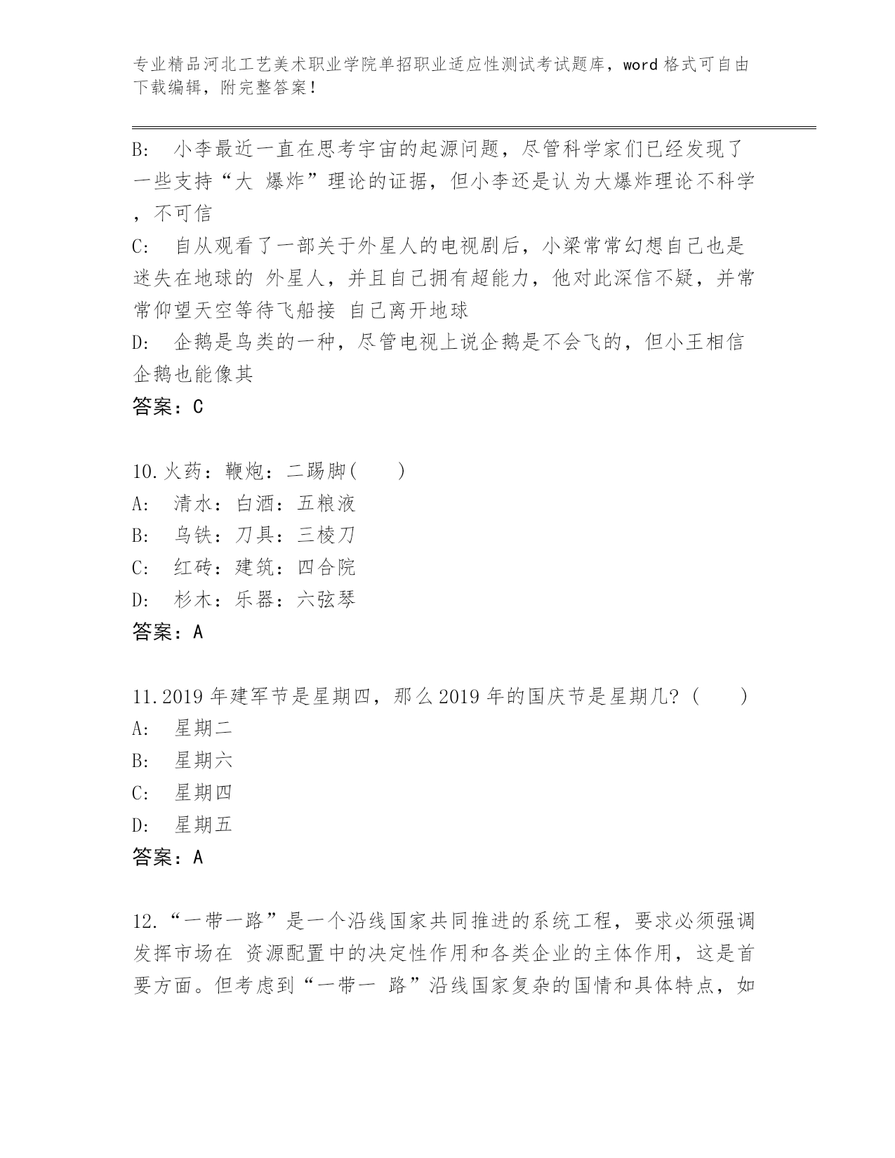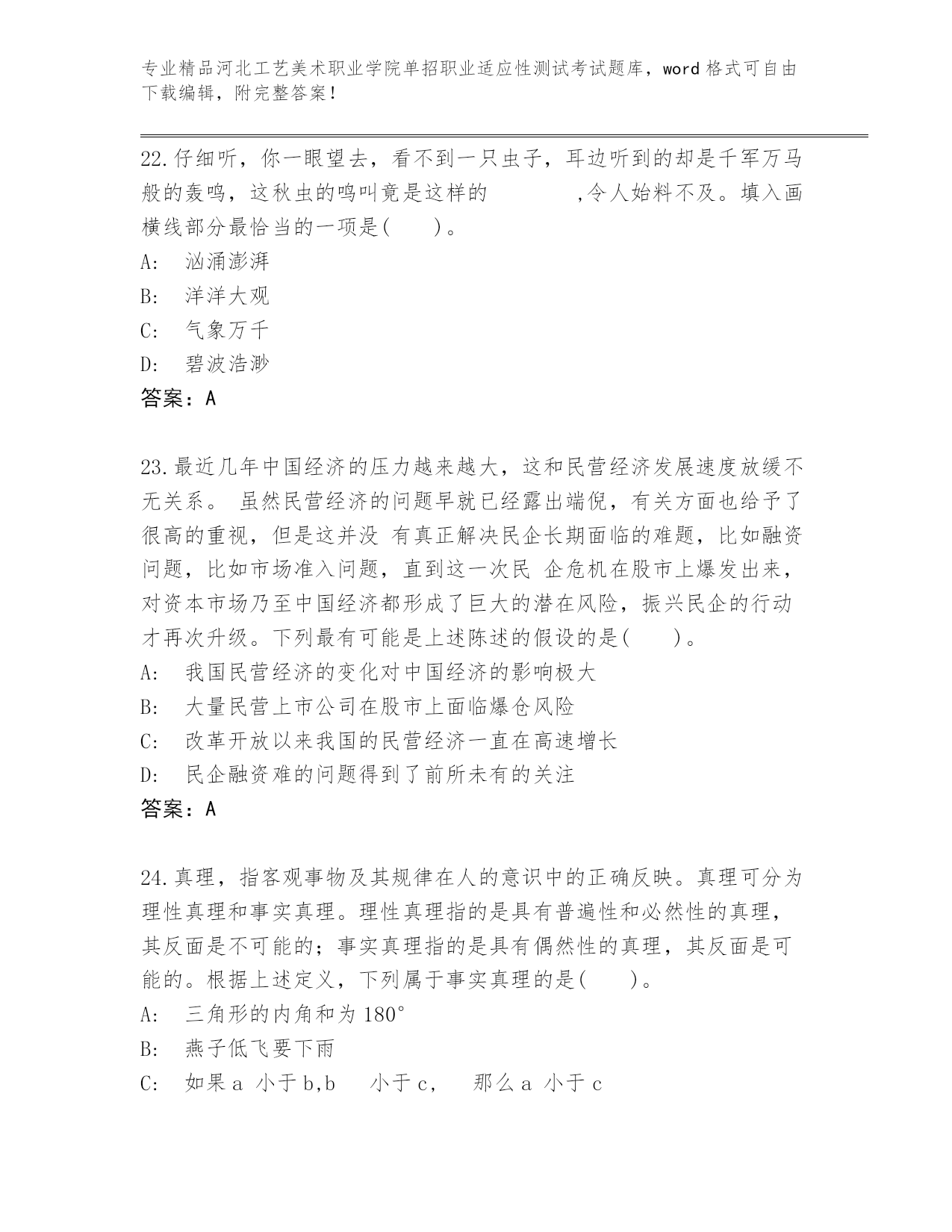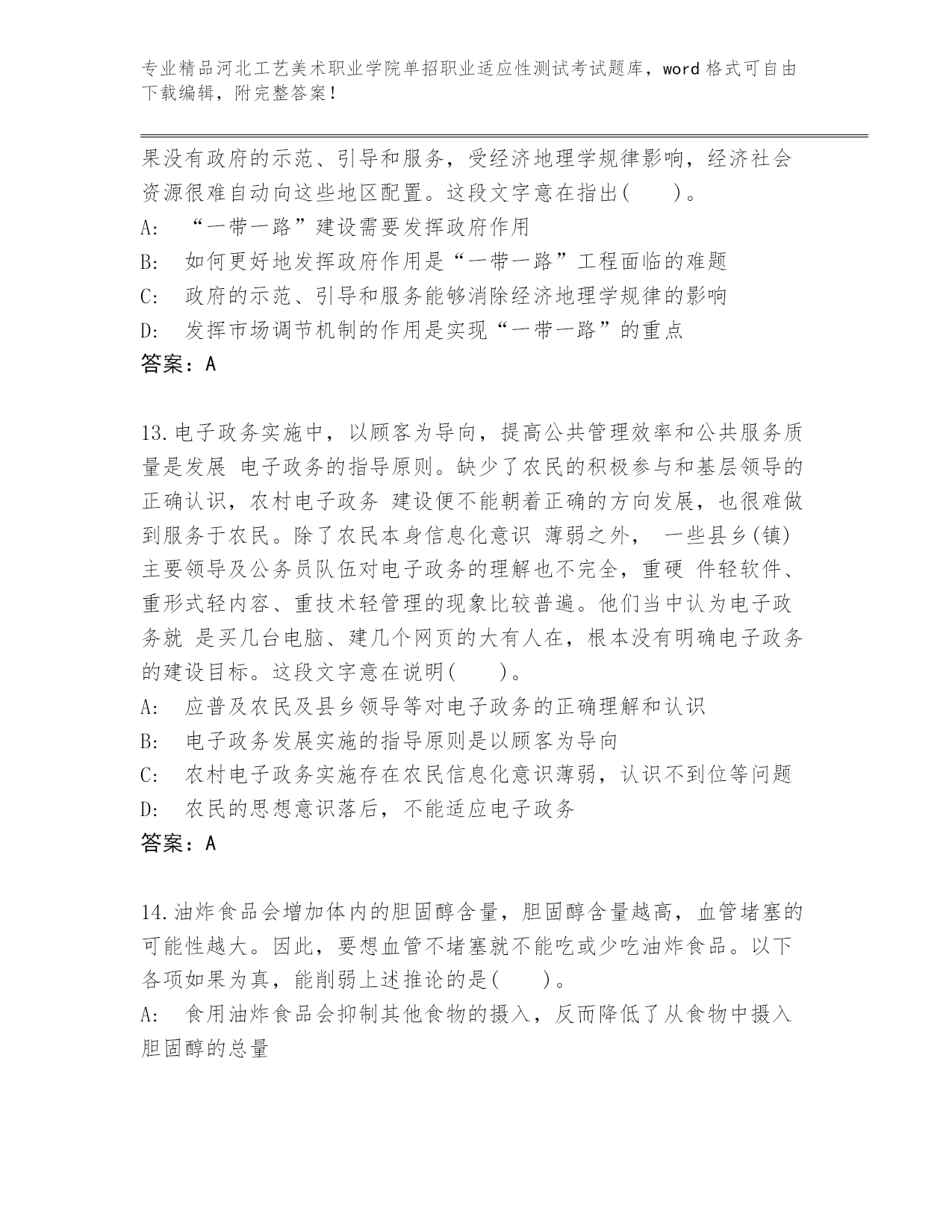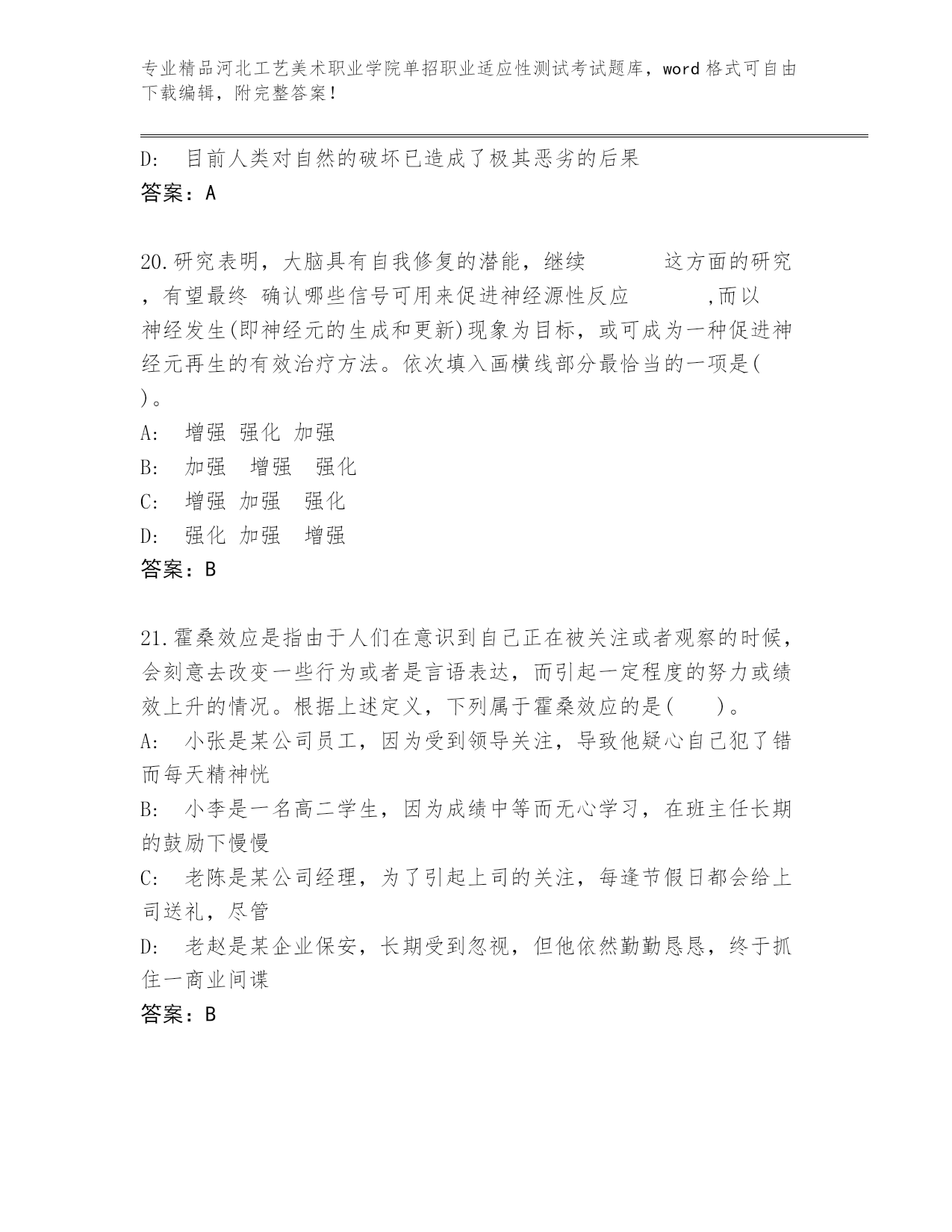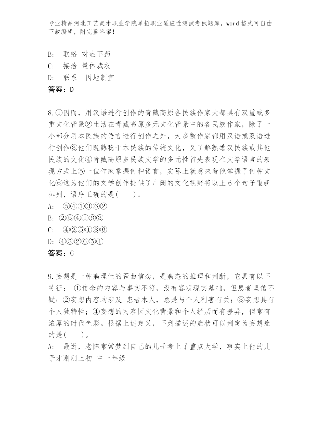 河北工艺美术职业学院单招职业适应性测试考试真题精品(网校专用).docx