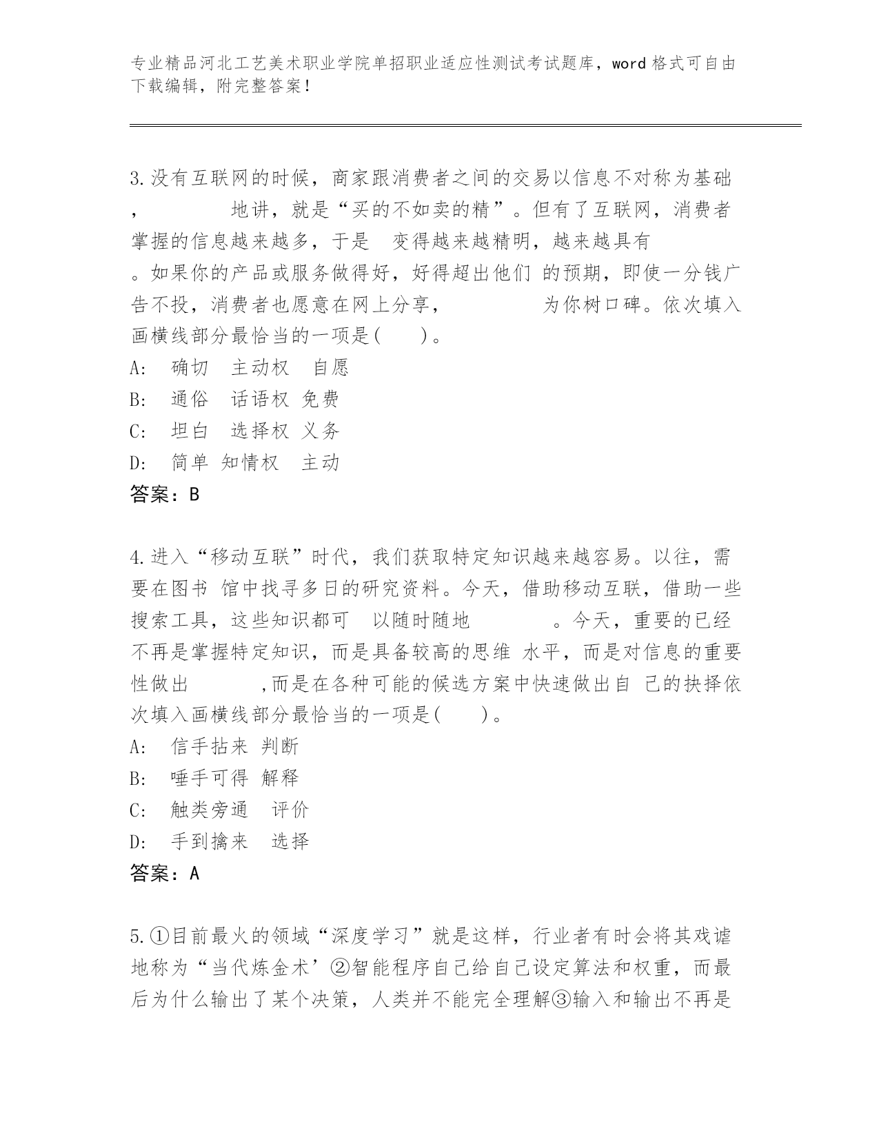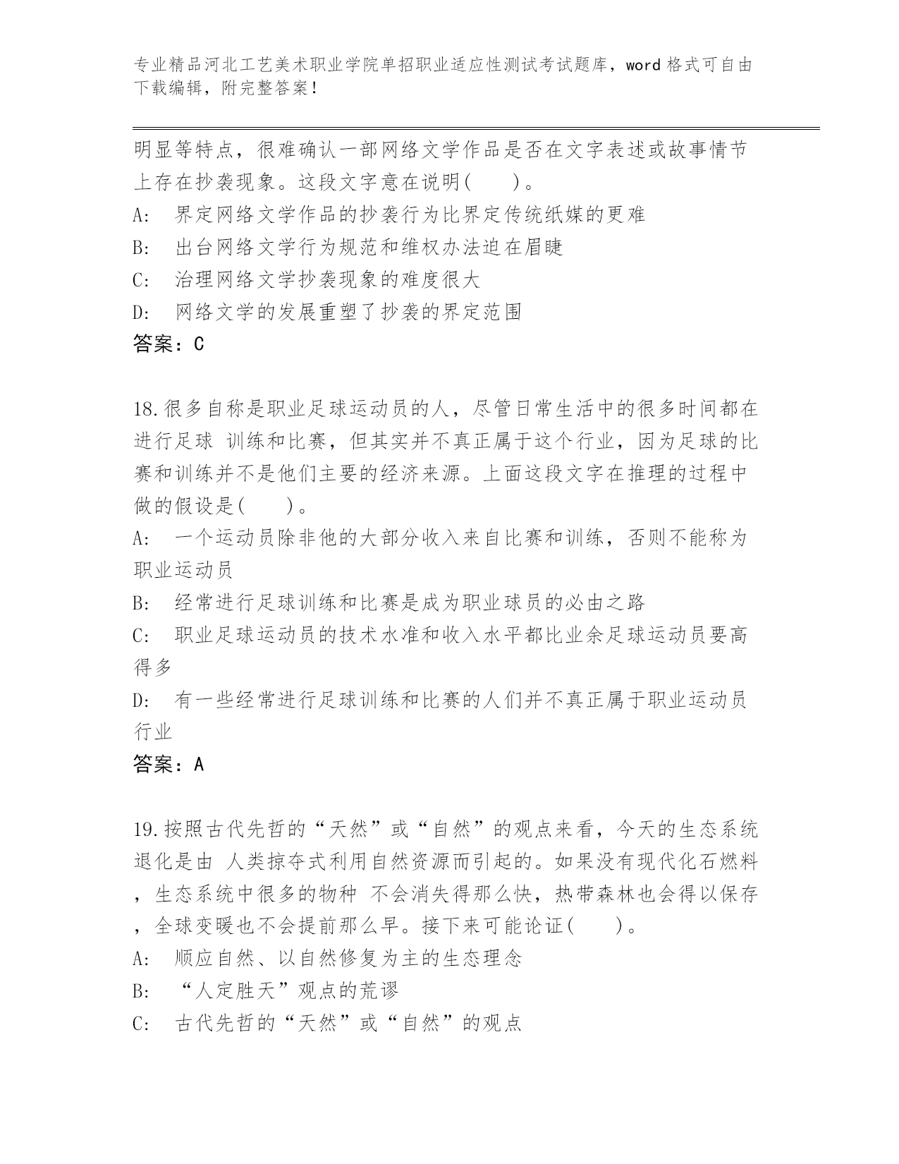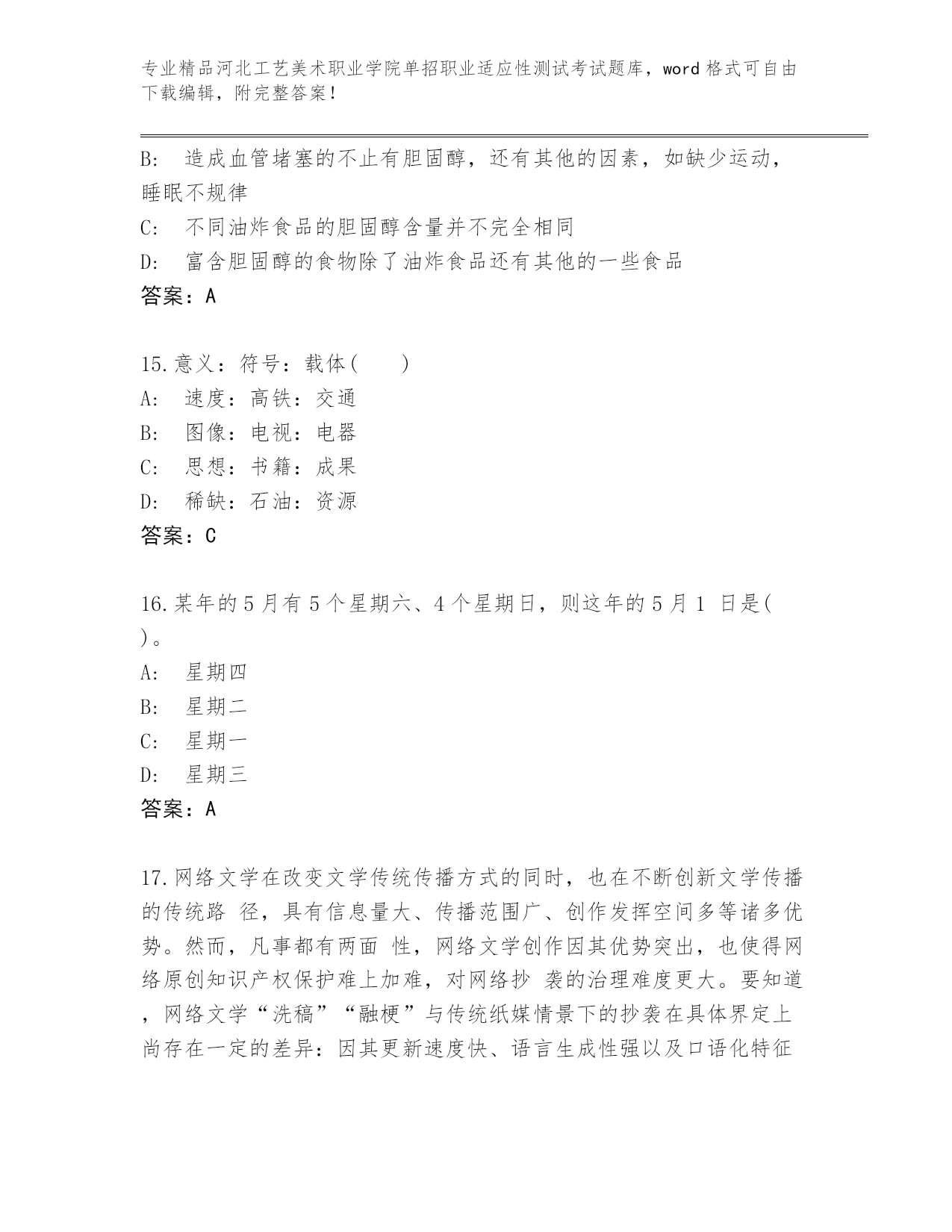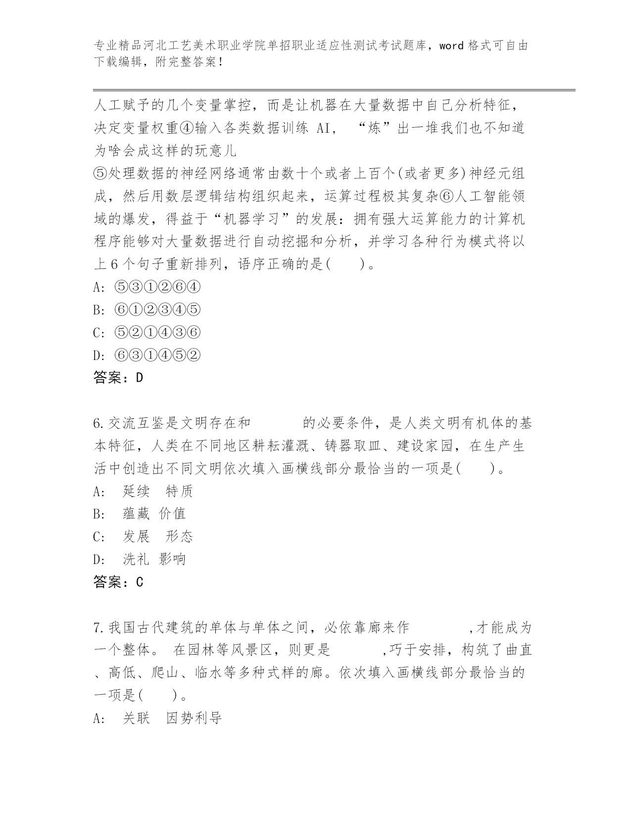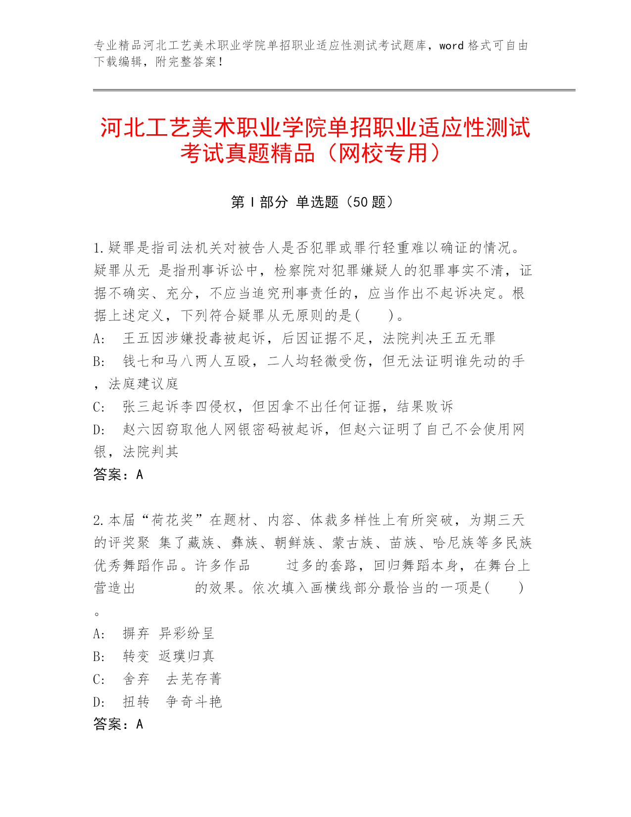 河北工艺美术职业学院单招职业适应性测试考试真题精品(网校专用).docx