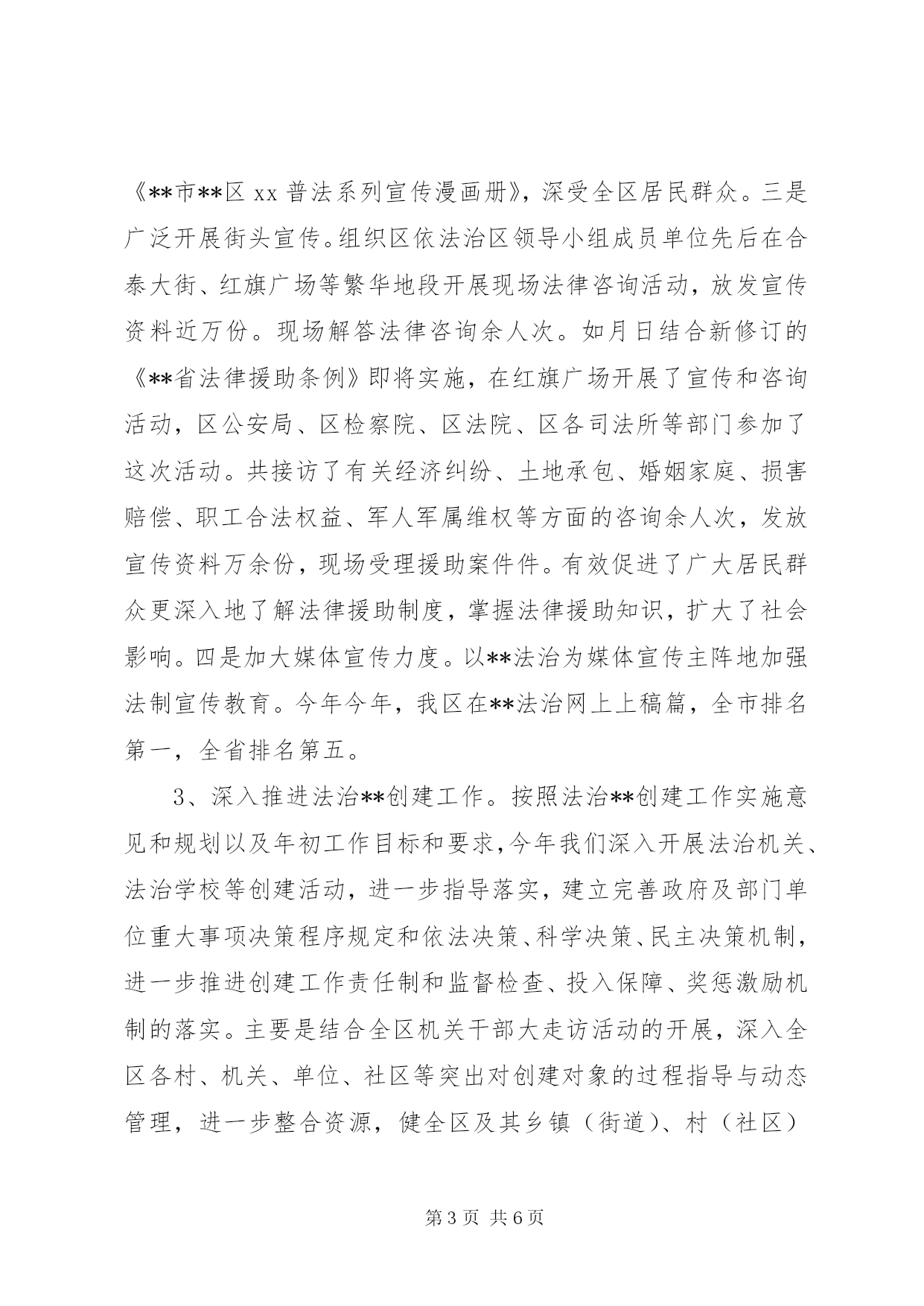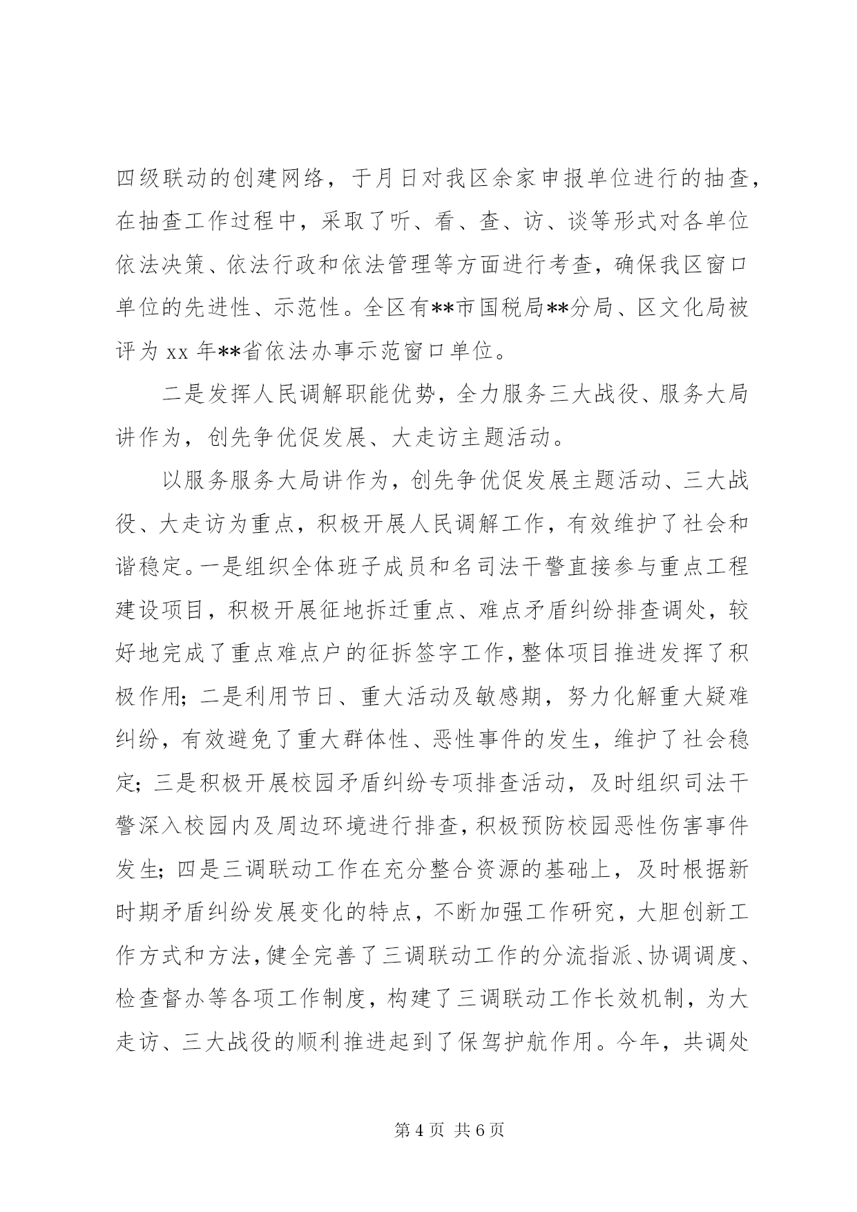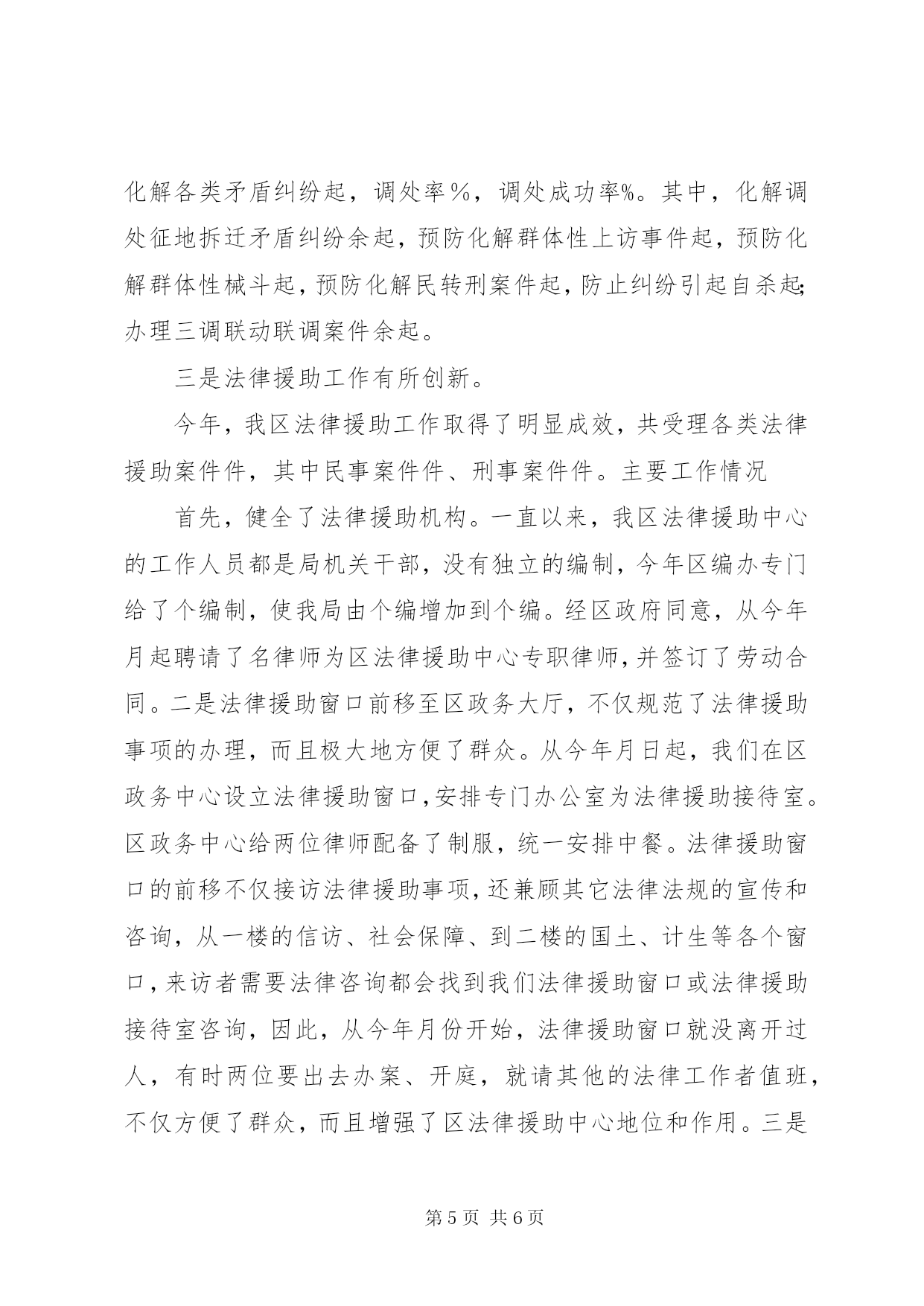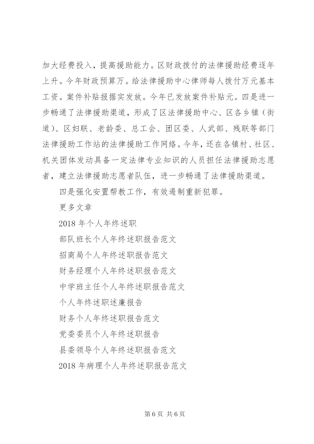 第PAGE\*Arabic\*MERGEFORMAT6页共NUMPAGES\*MERGEFORMAT6页司法局长个人年终述职报告司法局长年终述职报告范文今年来,在区委、区政府的正确领导下,在区人大和区政协的指导监督下,我始终坚持贯彻落实科学发展观,突出抓好法治**和平安**建设,为一年初见成效,三年大见成效,五年再造一个新**的宏伟目标提供优良的司法保障体系。坚持忠心履职,率先垂范,锐意进取,推动了司法行政事业全面发展,为服务全市三大战役和全区大走访做出应有贡献。一、履职情况(一)立足本职、努力学习,不断提高政治思想水平和领导决策能力。本人始终在实践中掌握新知识、积累新经验、增强新本领,不断提高科学判断形势的能力、驾驭市场经济的能力、应付复杂局面的能力、依法执政的能力和总揽全局的能力。平时非常注重政治理论学习,重视用正确的理论武装头脑,积极学习上级政策文件,自觉用上级文件精神指导自己的行动。除参加业务培训班外,还认真学习了《党章》、《社会主义法治理念教育读本》、******七一讲话等内容,撰写了读书笔记、心得体会。通过一系列的政治、业务学习,思想觉悟不断提高,政治方向日益明确。在自己亲力亲为的带领下,局班子号召力和战斗不断提高。全局司法行政干警爱岗敬业、开拓进取、建功立业的思想已蔚然成风。(二)围绕中心工作,真抓实干、力求实效。一是深化普法依法治理工作,努力提高全民法律素质。今年是xx开局之年,也是xx普法启动年,为全面落实省、市相关工作精神。我们紧紧围绕xx普法规划暨法治**建设任务,深入贯彻落实科学发展观,以xx普法启动为重点,落实措施,突出特色,彰显亮点,全面深化法治创建活动,为建设和谐**做出新贡献。1、深入调查研究、为启动xx普治工作做好充分准备。为使xx普治工作有序、顺利的开展,我们深入基层开展大走访活动,召开座谈会,倾听群众声音、了解区情民意,就如何有效、深入推进xx普法,在普法形式、重点对象、重点内容,普法经费保障和考核奖惩机制等方面进行了探讨,研究制定了具有科学性、广泛性、针对性且符合我区实际的xx普法规划。2、狠抓法制宣传教育工作。一年来,我们从实际出发,带领全局先后开展了一系列以农村法制宣传教育活动。一是为配合市委宣传部主办的xx年**市五下乡活动,区依法治区办为农民朋友送去了城镇居民读本、农民普法读本司法为民的漫画手册等法制宣传教育读本近册,并针对农民群众关注的土地纠纷、征地拆迁补偿和劳动权益保障等问题印发了宣传单份,免费发放到农民群众手中,现场接受法律咨询百余人次。二是结合区情,先后制作了以征地拆迁、司法为民、人民调解、换届选举等为主题的《**市**区xx普法系列宣传漫画册》,深受全区居民群众。三是广泛开展街头宣传。组织区依法治区领导小组成员单位先后在合泰大街、红旗广场等繁华地段开展现场法律咨询活动,放发宣传资料近万份。现场解答法律咨询余人次。如月日结合新修订的《**省法律援助条例》即将实施,在红旗广场开展了宣传和咨询活动,区公安局、区检察院、区法院、区各司法所等部门参加了这次活动。共接访了有关经济纠纷、土地承包、婚姻家庭、损害赔偿、职工合法权益、军人军属维权等方面的咨询余人次,发放宣传资料万余份,现场受理援助案件件。有效促进了广大居民群众更深入地了解法律援助制度,掌握法律援助知识,扩大了社会影响。四是加大媒体宣传力度。以**法治为媒体宣传主阵地加强法制宣传教育。今年今年,我区在**法治网上上稿篇,全市排名第一,全省排名第五。3、深入推进法治**创建工作。按照法治**创建工作实施意见和规划以及年初工作目标和要求,今年我们深入开展法治机关、法治学校等创建活动,进一步指导落实,建立完善政府及部门单位重大事项决策程序规定和依法决策、科学决策、民主决策机制,进一步推进创建工作责任制和监督检查、投入保障、奖惩激励机制的落实。主要是结合全区机关干部大走访活动的开展,深入全区各村、机关、单位、社区等突出对创建对象的过程指导与动态管理,进一步整合资源,健全区及其乡镇(街道)、村(社区)四级联动的创建网络,于月日对我区余家申报单位进行的抽查,在抽查工作过程中,采取了听、看、查、访、谈等形式对各单位依法决策、依法行政和依法管理等方面进行考查,确保我区窗口单位的先进性、示范性。全区有**市国税局**分局、区文化局被评为xx年**省依法办事示范窗口单位。二是发挥人民调解职能优势,全力服务三大战役、服务大局讲作为,创先争优促发展、大走访主题活动。以服务服务大局讲作为,创先争优促发展主题活动、三大战役、大走访为重点,积极开展人民调解工作,有效维护了社会和谐稳定。一是组织全体班子成员和名司法干警直接参与重点工程建设项目,积极开展征地拆迁重点、难点矛盾纠纷排查调处,较好地完成了重点难点户的征拆签字工作,整体