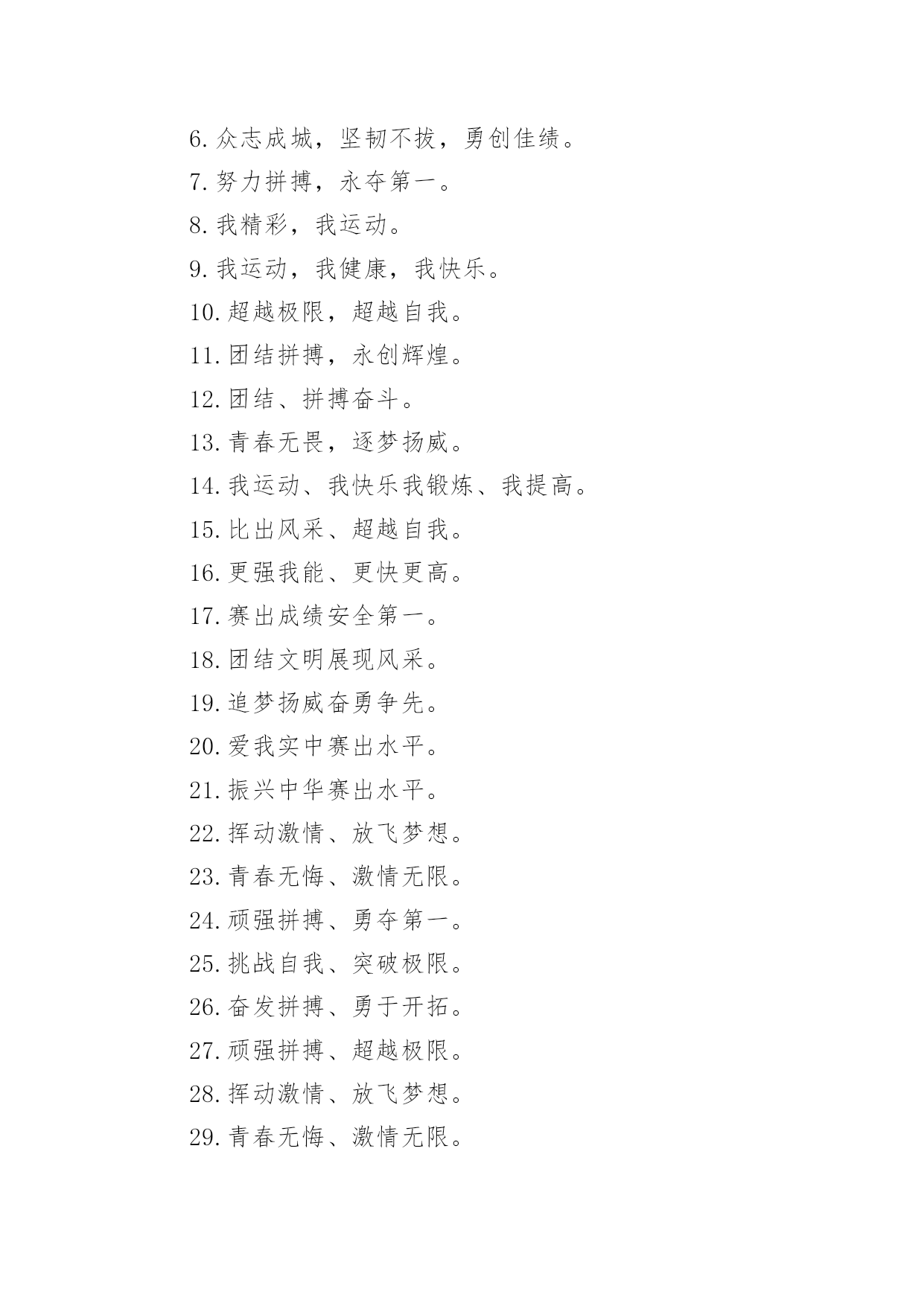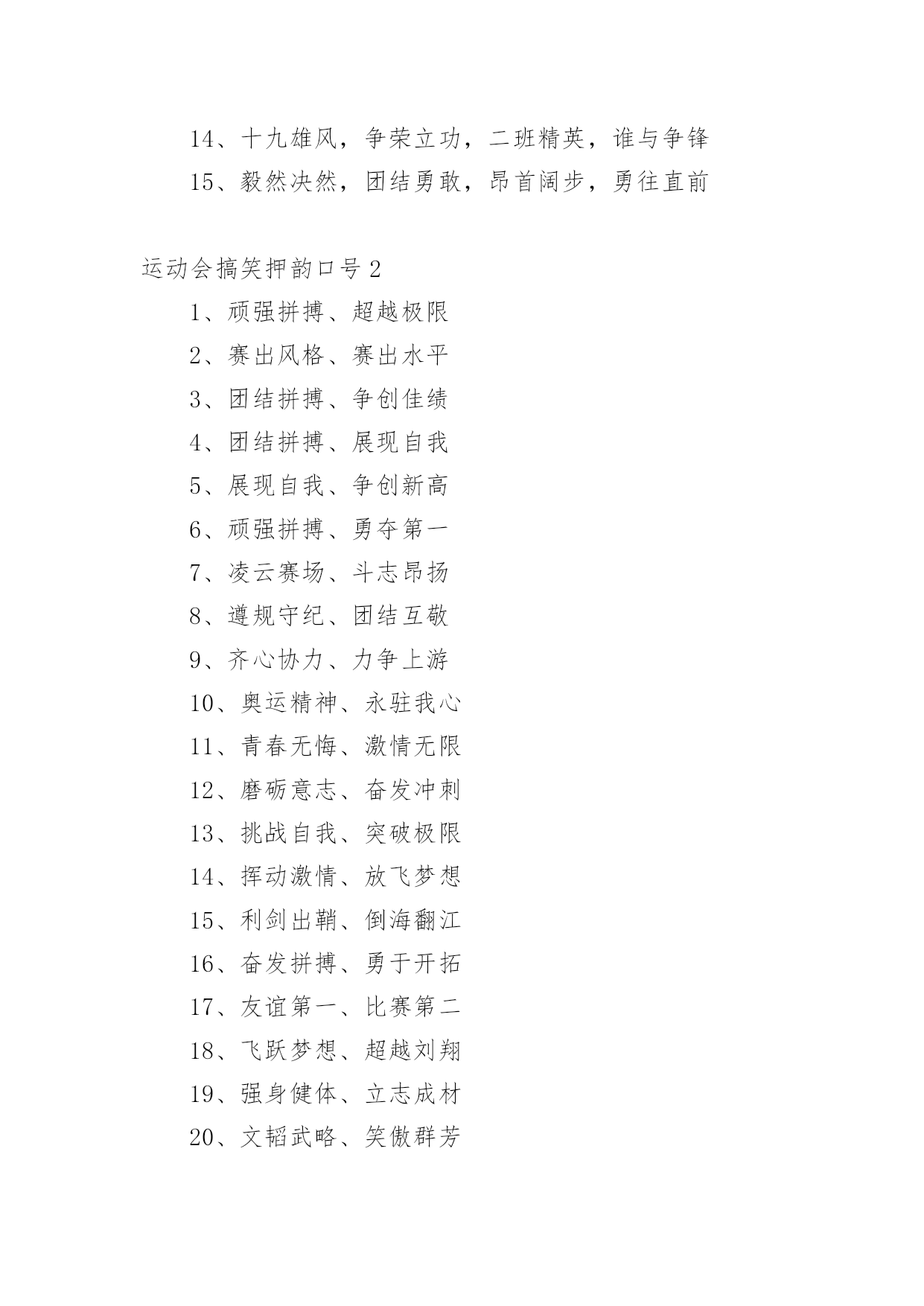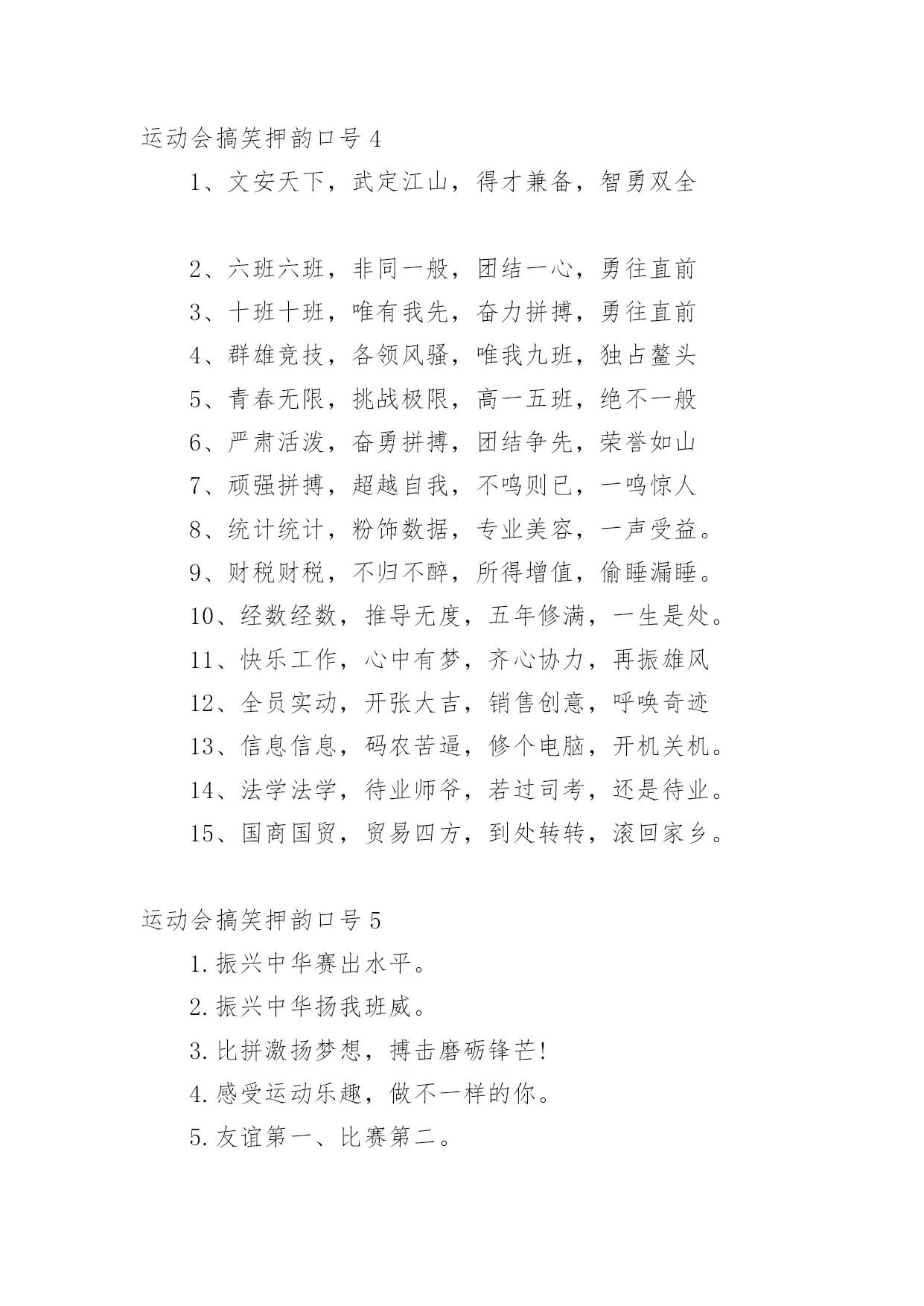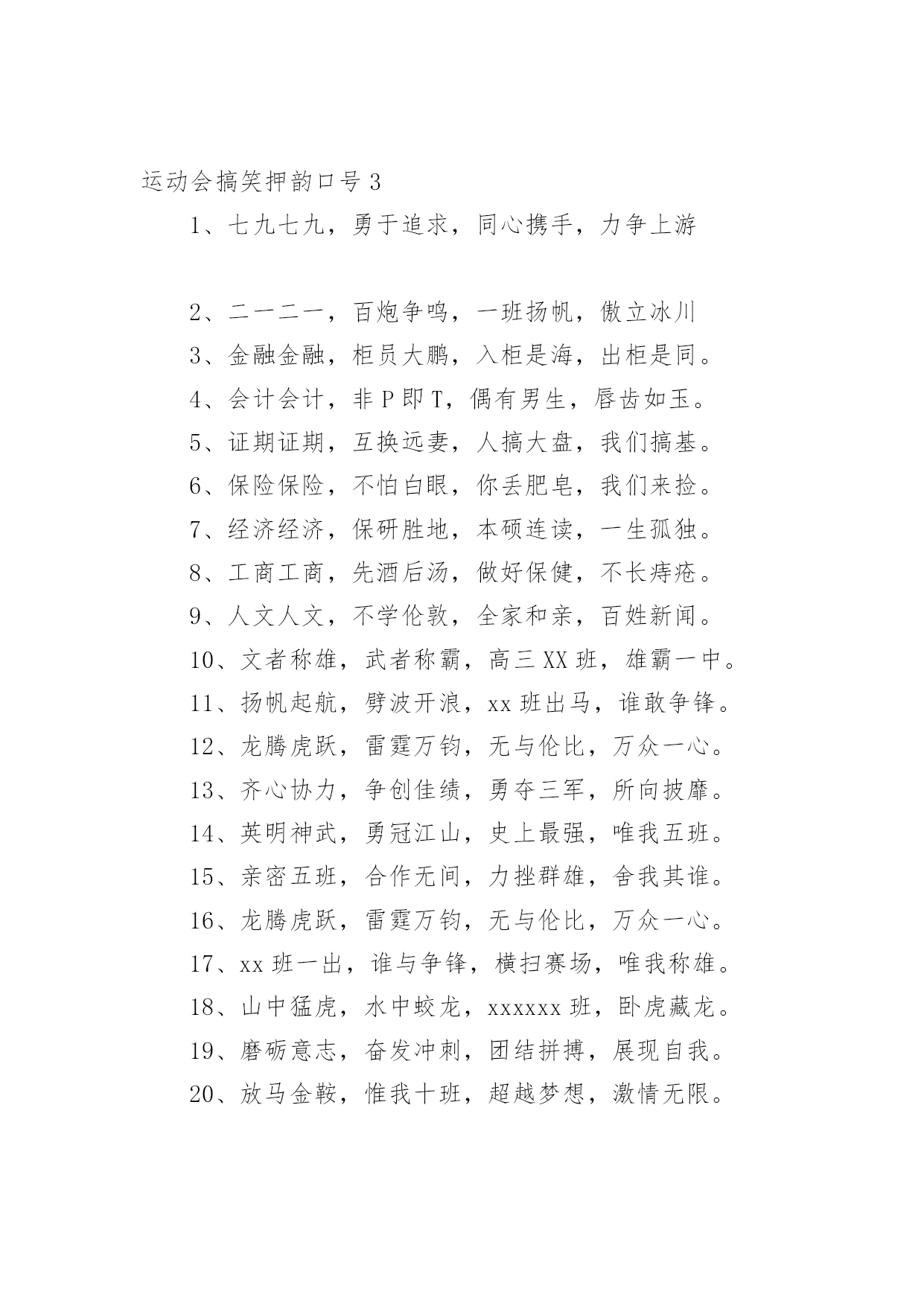运动会搞笑押韵口号在日复一日的学习、工作或生活中,大家总免不了要接触或使用口号吧,口号一般都用一两句完整的句子来表现一个信息或一个观念,信息单一,容易理解,没有过多的'信息需要受众用心记忆和用心理解。那么什么样的口号才更具感染力呢?以下是小编为大家整理的运动会搞笑押韵口号,希望能够帮助到大家。运动会搞笑押韵口号11、绿色学校,全面发展,精英五班,勇往直前2、一班一班,坚强勇敢,努力拼搏,奋勇争先3、团结拼搏,勇创佳绩,超越梦想,永不言弃4、飞跃梦想,敢拼敢闯,乘风破浪,奋勇激昂5、激情飞扬,气宇轩昂,同心协力,共创辉煌6、时不我待,努力举绩,一鼓作气,挑战佳绩7、山中猛虎,出水蛟龙,XXX班,卧虎藏龙8、同心同德,努力拼搏,为梦飞翔,再创辉煌9、希望希望,团结坚强,英姿飒爽,梦想飞扬10、七八七八,精神焕发,强身健体,状态最佳11、文明四班,鳌头独占,和谐你我,勇争桂冠12、努力学习,奋发图强,志存高远,行者无疆13、风起云涌,日出东方,唯有八班,再创辉煌14、十九雄风,争荣立功,二班精英,谁与争锋15、毅然决然,团结勇敢,昂首阔步,勇往直前运动会搞笑押韵口号21、顽强拼搏、超越极限2、赛出风格、赛出水平3、团结拼搏、争创佳绩4、团结拼搏、展现自我5、展现自我、争创新高6、顽强拼搏、勇夺第一7、凌云赛场、斗志昂扬8、遵规守纪、团结互敬9、齐心协力、力争上游10、奥运精神、永驻我心11、青春无悔、激情无限12、磨砺意志、奋发冲刺13、挑战自我、突破极限14、挥动激情、放飞梦想15、利剑出鞘、倒海翻江16、奋发拼搏、勇于开拓17、友谊第一、比赛第二18、飞跃梦想、超越刘翔19、强身健体、立志成材20、文韬武略、笑傲群芳运动会搞笑押韵口号31、七九七九,勇于追求,同心携手,力争上游2、二一二一,百炮争鸣,一班扬帆,傲立冰川3、金融金融,柜员大鹏,入柜是海,出柜是同。4、会计会计,非P即T,偶有男生,唇齿如玉。5、证期证期,互换远妻,人搞大盘,我们搞基。6、保险保险,不怕白眼,你丢肥皂,我们来捡。7、经济经济,保研胜地,本硕连读,一生孤独。8、工商工商,先酒后汤,做好保健,不长痔疮。9、人文人文,不学伦敦,全家和亲,百姓新闻。10、文者称雄,武者称霸,高三XX班,雄霸一中。11、扬帆起航,劈波开浪,xx班出马,谁敢争锋。12、龙腾虎跃,雷霆万钧,无与伦比,万众一心。13、齐心协力,争创佳绩,勇夺三军,所向披靡。14、英明神武,勇冠江山,史上最强,唯我五班。15、亲密五班,合作无间,力挫群雄,舍我其谁。16、龙腾虎跃,雷霆万钧,无与伦比,万众一心。17、xx班一出,谁与争锋,横扫赛场,唯我称雄。18、山中猛虎,水中蛟龙,xxxxxx班,卧虎藏龙。19、磨砺意志,奋发冲刺,团结拼搏,展现自我。20、放马金鞍,惟我十班,超越梦想,激情无限。运动会搞笑押韵口号41、文安天下,武定江山,得才兼备,智勇双全2、六班六班,非同一般,团结一心,勇往直前3、十班十班,唯有我先,奋力拼搏,勇往直前4、群雄竞技,各领风骚,唯我九班,独占鳌头5、青春无限,挑战极限,高一五班,绝不一般6、严肃活泼,奋勇拼搏,团结争先,荣誉如山7、顽强拼搏,超越自我,不鸣则已,一鸣惊人8、统计统计,粉饰数据,专业美容,一声受益。9、财税财税,不归不醉,所得增值,偷睡漏睡。10、经数经数,推导无度,五年修满,一生是处。11、快乐工作,心中有梦,齐心协力,再振雄风12、全员实动,开张大吉,销售创意,呼唤奇迹13、信息信息,码农苦逼,修个电脑,开机关机。14、法学法学,待业师爷,若过司考,还是待业。15、国商国贸,贸易四方,到处转转,滚回家乡。运动会搞笑押韵口号51.振兴中华赛出水平。2.振兴中华扬我班威。3.比拼激扬梦想,搏击磨砺锋芒!4.感受运动乐趣,做不一样的你。5.友谊第一、比赛第二。6.众志成城,坚韧不拔,勇创佳绩。7.努力拼搏,永夺第一。8.我精彩,我运动。9.我运动,我健康,我快乐。10.超越极限,超越自我。11.团结拼搏,永创辉煌。12.团结、拼搏奋斗。13.青春无畏,逐梦扬威。14.我运动、我快乐我锻炼、我提高。15.比出风采、超越自我。16.更强我能、更快更高。17.赛出成绩安全第一。18.团结文明展现风采。19.追梦扬威奋勇争先。20.爱我实中赛出水平。21.振兴中华赛出水平。22.挥动激情、放飞梦想。23.青春无悔、激情无限。24.顽强拼搏、勇夺第一。25.挑战自我、突破极限。26.奋发拼搏、勇于开拓。27.顽强拼搏、超越极限。28.挥动激情、放飞梦想。29.青春无悔、激情无限。30.顽强拼搏、勇夺第一。