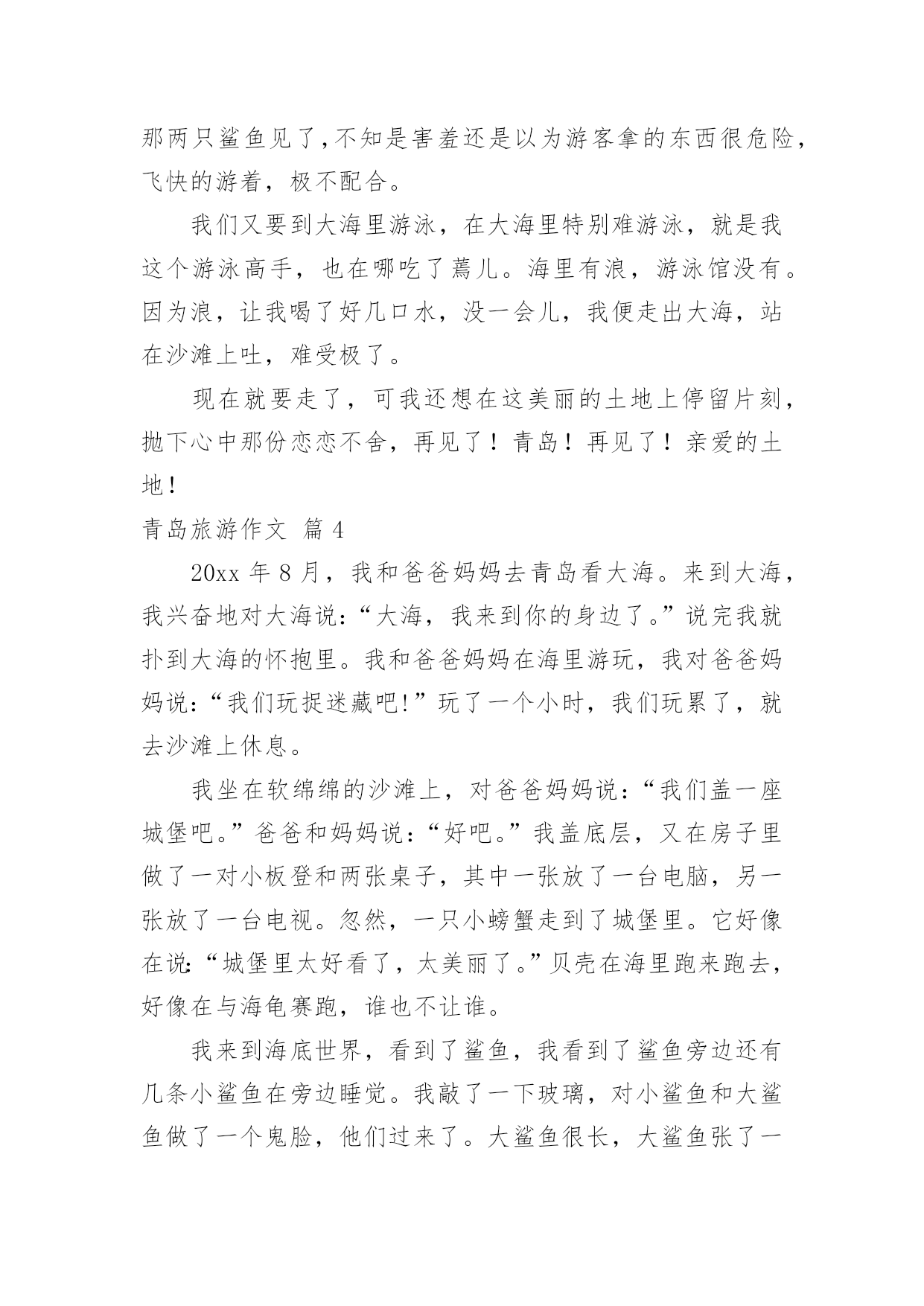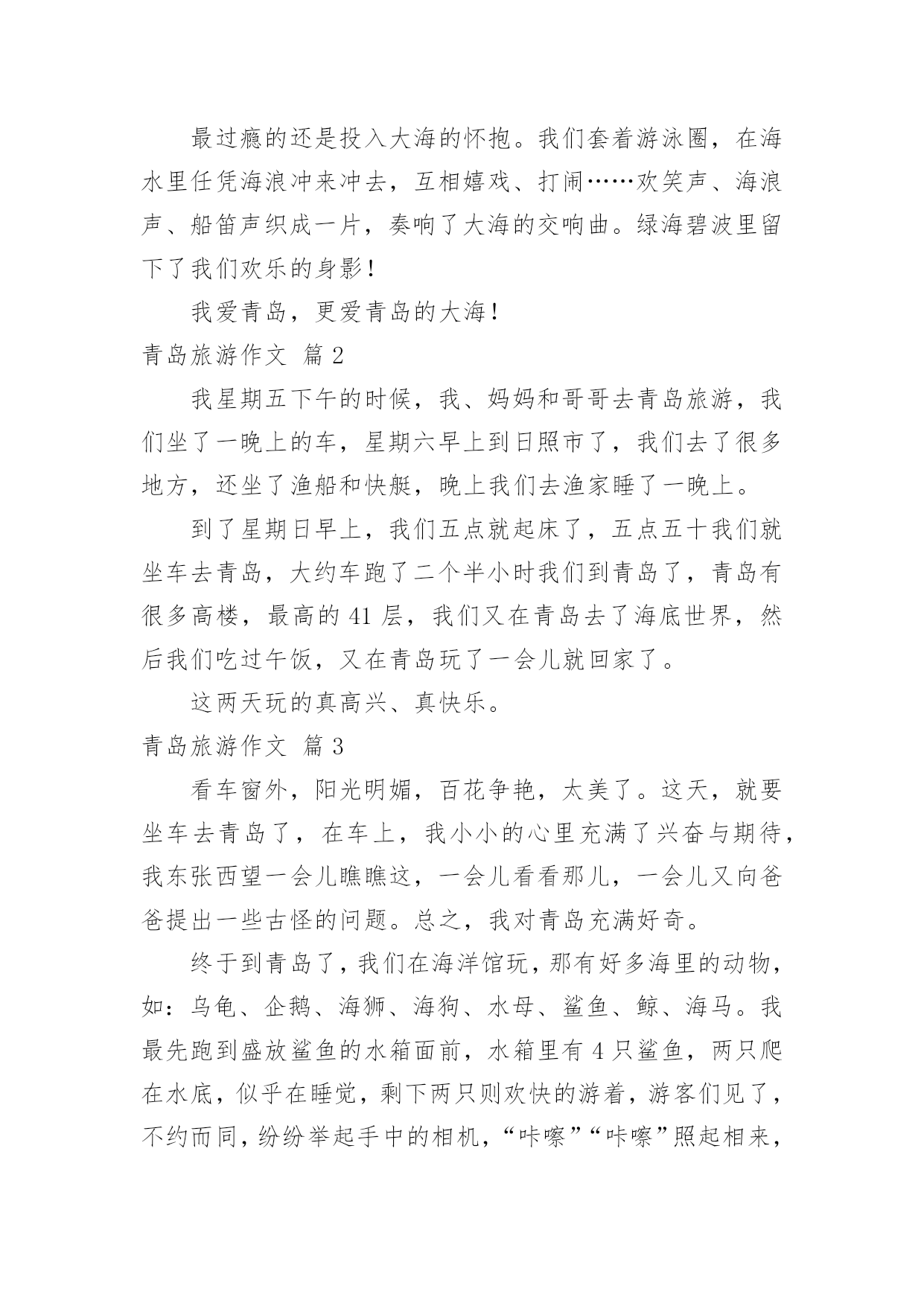 青岛旅游作文【精华】青岛旅游作文7篇在日常学习、工作和生活中,大家总免不了要接触或使用作文吧,作文一定要做到主题集中,围绕同一主题作深入阐述,切忌东拉西扯,主题涣散甚至无主题。一篇什么样的作文才能称之为优秀作文呢?下面是小编为大家整理的青岛旅游作文7篇,仅供参考,大家一起来看看吧。青岛旅游作文篇1暑假,我和妈妈来到青岛旅游。青岛是一个美丽的海滨城市,这里红瓦绿树、空气清新,有崂山、栈桥、奥帆中心等著名的旅游景点,不过最让我着迷的还是大海。从小鱼山上眺望大海,只见海天一色,一望无际。这时候的海是安静的。来往的船只从海面上驶过,水花四溅,留下一道道白色的痕迹。船只仿佛画笔,大海如同画纸,它们为游人画出一幅幅优美的海景图。我们来到海边的礁石上,此时的海又像是一个顽皮的孩子。汹涌的海浪不停地向礁石涌来,击起一朵朵白色的浪花。礁石上时不时地出现着海水退潮时留下的小海蟹、小贝壳,让在这里游玩的孩子们惊喜不已。海边的沙滩更是孩子们创作的乐园。我和小伙伴在这里展开了天马行空的想象力,不一会儿,沙滩上便出现了一座座形状奇特的建筑——“南水北调”、“哥特风”、“金字塔”、“海滨别墅”……让人浮想联翩。最过瘾的还是投入大海的怀抱。我们套着游泳圈,在海水里任凭海浪冲来冲去,互相嬉戏、打闹……欢笑声、海浪声、船笛声织成一片,奏响了大海的交响曲。绿海碧波里留下了我们欢乐的身影!我爱青岛,更爱青岛的大海!青岛旅游作文篇2我星期五下午的时候,我、妈妈和哥哥去青岛旅游,我们坐了一晚上的车,星期六早上到日照市了,我们去了很多地方,还坐了渔船和快艇,晚上我们去渔家睡了一晚上。到了星期日早上,我们五点就起床了,五点五十我们就坐车去青岛,大约车跑了二个半小时我们到青岛了,青岛有很多高楼,最高的41层,我们又在青岛去了海底世界,然后我们吃过午饭,又在青岛玩了一会儿就回家了。这两天玩的真高兴、真快乐。青岛旅游作文篇3看车窗外,阳光明媚,百花争艳,太美了。这天,就要坐车去青岛了,在车上,我小小的心里充满了兴奋与期待,我东张西望一会儿瞧瞧这,一会儿看看那儿,一会儿又向爸爸提出一些古怪的问题。总之,我对青岛充满好奇。终于到青岛了,我们在海洋馆玩,那有好多海里的动物,如:乌龟、企鹅、海狮、海狗、水母、鲨鱼、鲸、海马。我最先跑到盛放鲨鱼的水箱面前,水箱里有4只鲨鱼,两只爬在水底,似乎在睡觉,剩下两只则欢快的游着,游客们见了,不约而同,纷纷举起手中的相机,“咔嚓”“咔嚓”照起相来,那两只鲨鱼见了,不知是害羞还是以为游客拿的东西很危险,飞快的游着,极不配合。我们又要到大海里游泳,在大海里特别难游泳,就是我这个游泳高手,也在哪吃了蔫儿。海里有浪,游泳馆没有。因为浪,让我喝了好几口水,没一会儿,我便走出大海,站在沙滩上吐,难受极了。现在就要走了,可我还想在这美丽的土地上停留片刻,抛下心中那份恋恋不舍,再见了!青岛!再见了!亲爱的土地!青岛旅游作文篇420xx年8月,我和爸爸妈妈去青岛看大海。来到大海,我兴奋地对大海说:“大海,我来到你的身边了。”说完我就扑到大海的怀抱里。我和爸爸妈妈在海里游玩,我对爸爸妈妈说:“我们玩捉迷藏吧!”玩了一个小时,我们玩累了,就去沙滩上休息。我坐在软绵绵的沙滩上,对爸爸妈妈说:“我们盖一座城堡吧。”爸爸和妈妈说:“好吧。”我盖底层,又在房子里做了一对小板登和两张桌子,其中一张放了一台电脑,另一张放了一台电视。忽然,一只小螃蟹走到了城堡里。它好像在说:“城堡里太好看了,太美丽了。”贝壳在海里跑来跑去,好像在与海龟赛跑,谁也不让谁。我来到海底世界,看到了鲨鱼,我看到了鲨鱼旁边还有几条小鲨鱼在旁边睡觉。我敲了一下玻璃,对小鲨鱼和大鲨鱼做了一个鬼脸,他们过来了。大鲨鱼很长,大鲨鱼张了一下嘴巴,吓了我一跳,马上躲到爸爸的身后。就怕它们把玻璃给撞坏了。在鲨鱼下面我看到了海星,海星的五个角不怎么尖。但它在海里游的倒挺快,我们看到了一只红水母,它猛一扑,扑到玻璃旁边,吓得我又躲到妈妈的身后了。这次去青岛旅游真好玩!青岛旅游作文篇5今天准备去青岛,可是天下雨了,我很不高兴,可是天很快就晴了,爷爷奶奶还有姐姐和我我们准备好行李就出发了。爷爷说带我们去坐动车,我们先做车去了张店,在车站买了动车票,到点后爷爷领着我们上了动车,动车里面很干净,我和姐姐坐在一起。很快车就开动了,很快我们就到了青岛火车站,我们兴高采烈的下了车,爷爷先带我们去找了旅馆行李放好就去吃饭了,火车站离海边很近吃饱饭就先去栈桥好高兴。青岛旅游作文篇6今天是8月1日,我要去日照、青岛了,我好开心。在日照我要下海游泳了,我把游泳圈给吹的鼓起来,然后把游泳圈套在身上,我急冲冲的跑到了大海里,哈!顽皮的海浪又把我推到了沙滩上,我到深一点的地方去玩儿,海浪冲得我一摇一晃,真有趣儿!在青岛我还去极地海洋世界了,这里还真是“