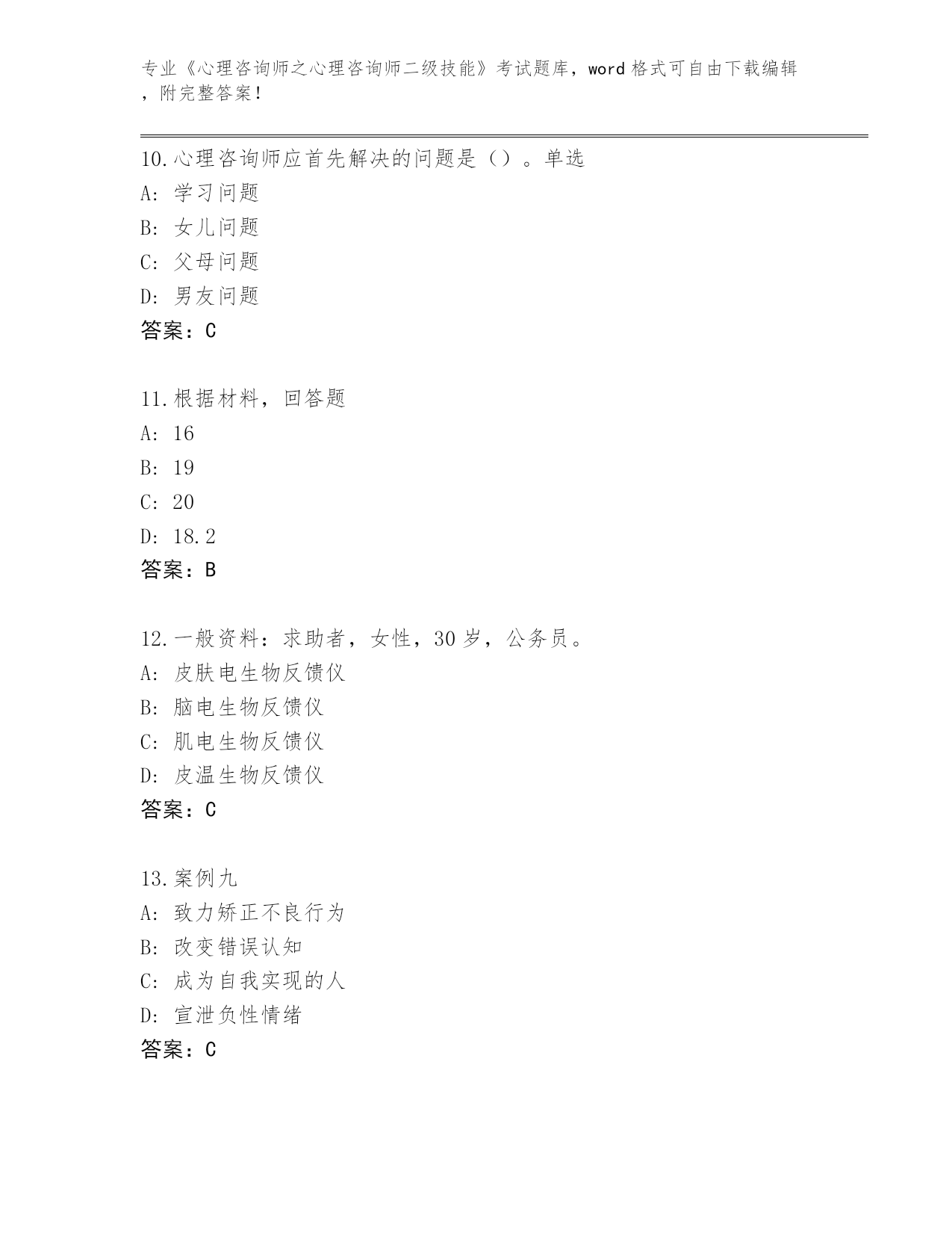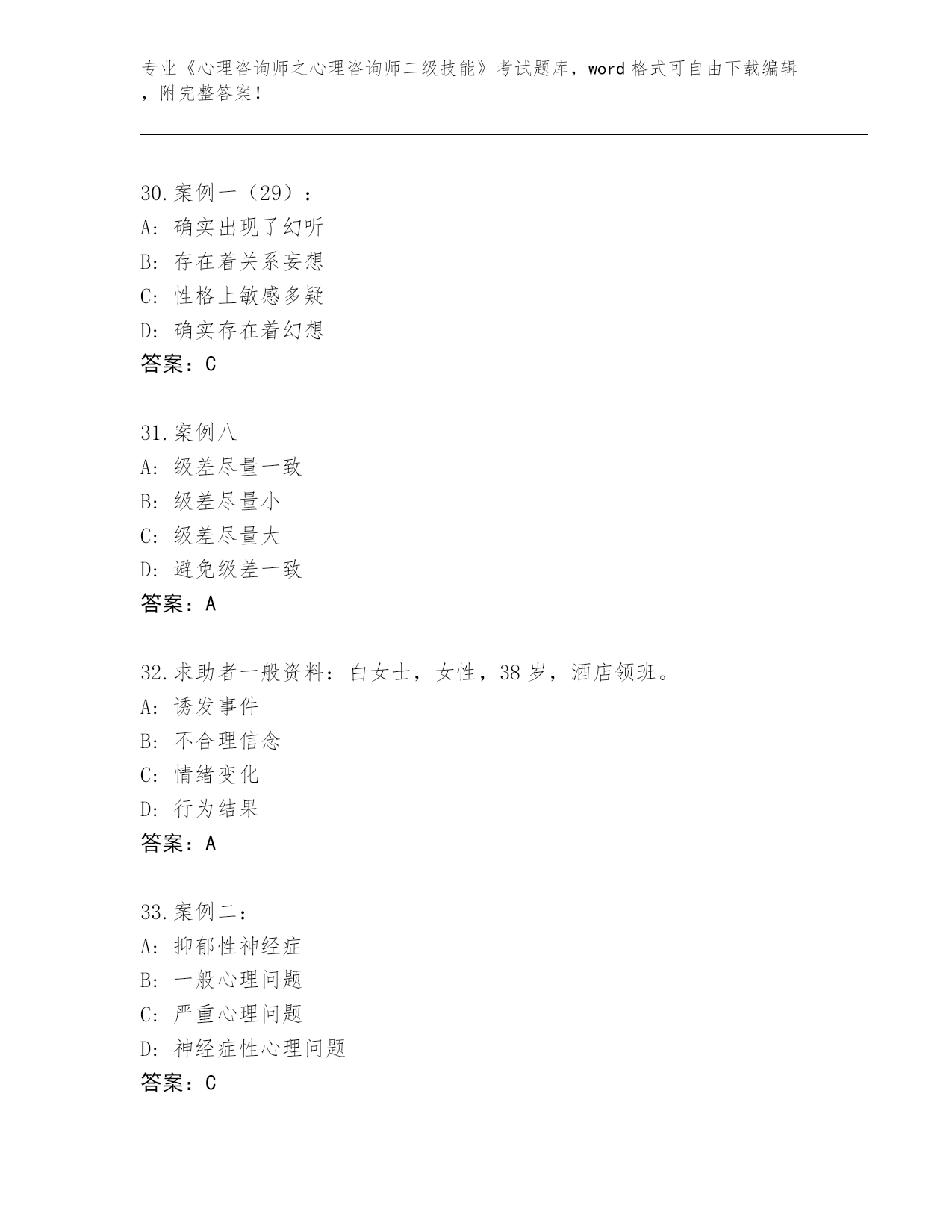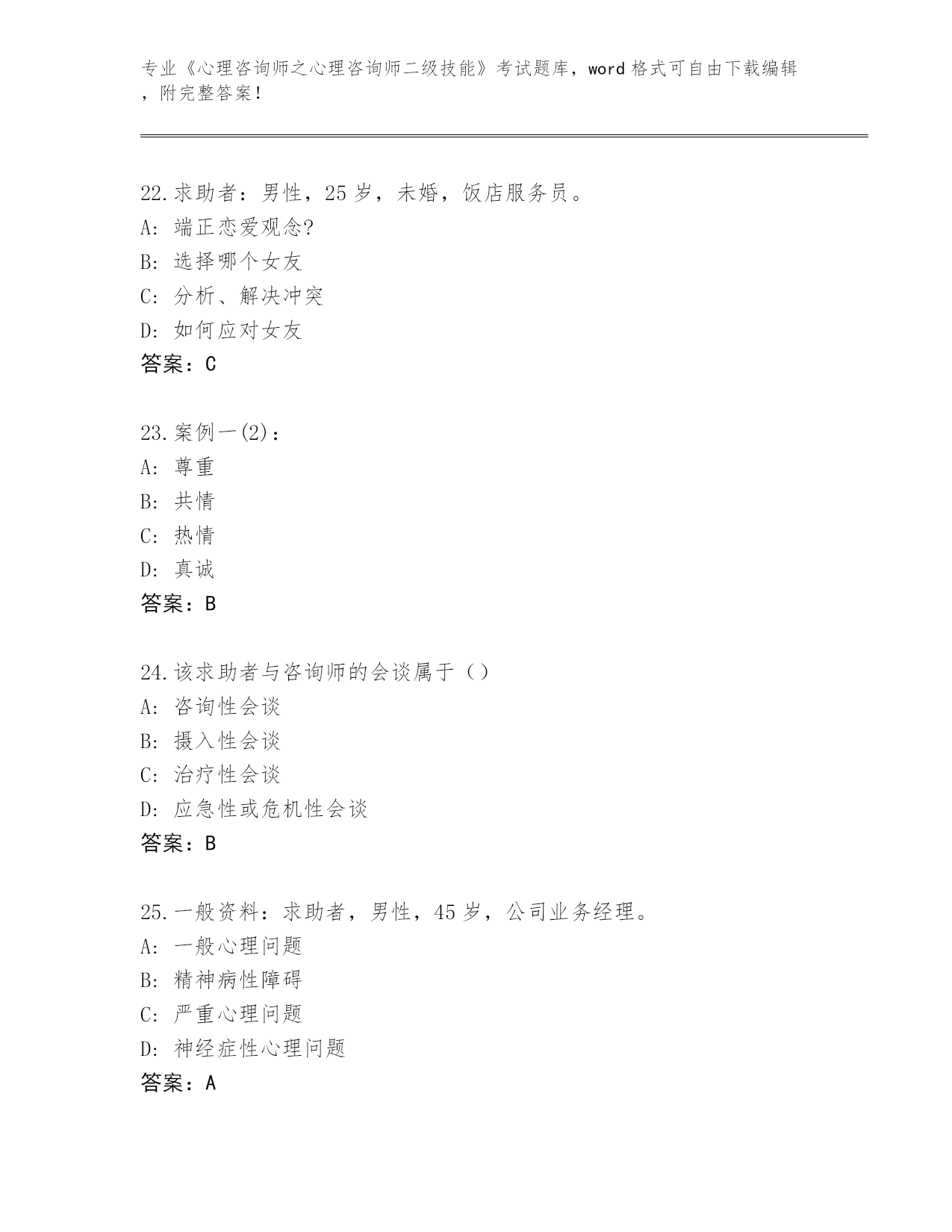 江苏省天宁区2024年《心理咨询师之心理咨询师二级技能》考试真题题库答案