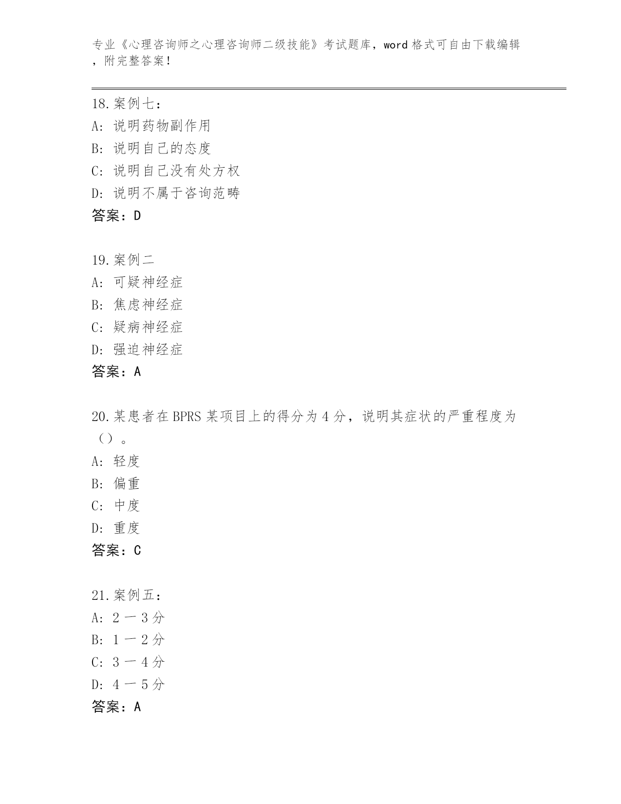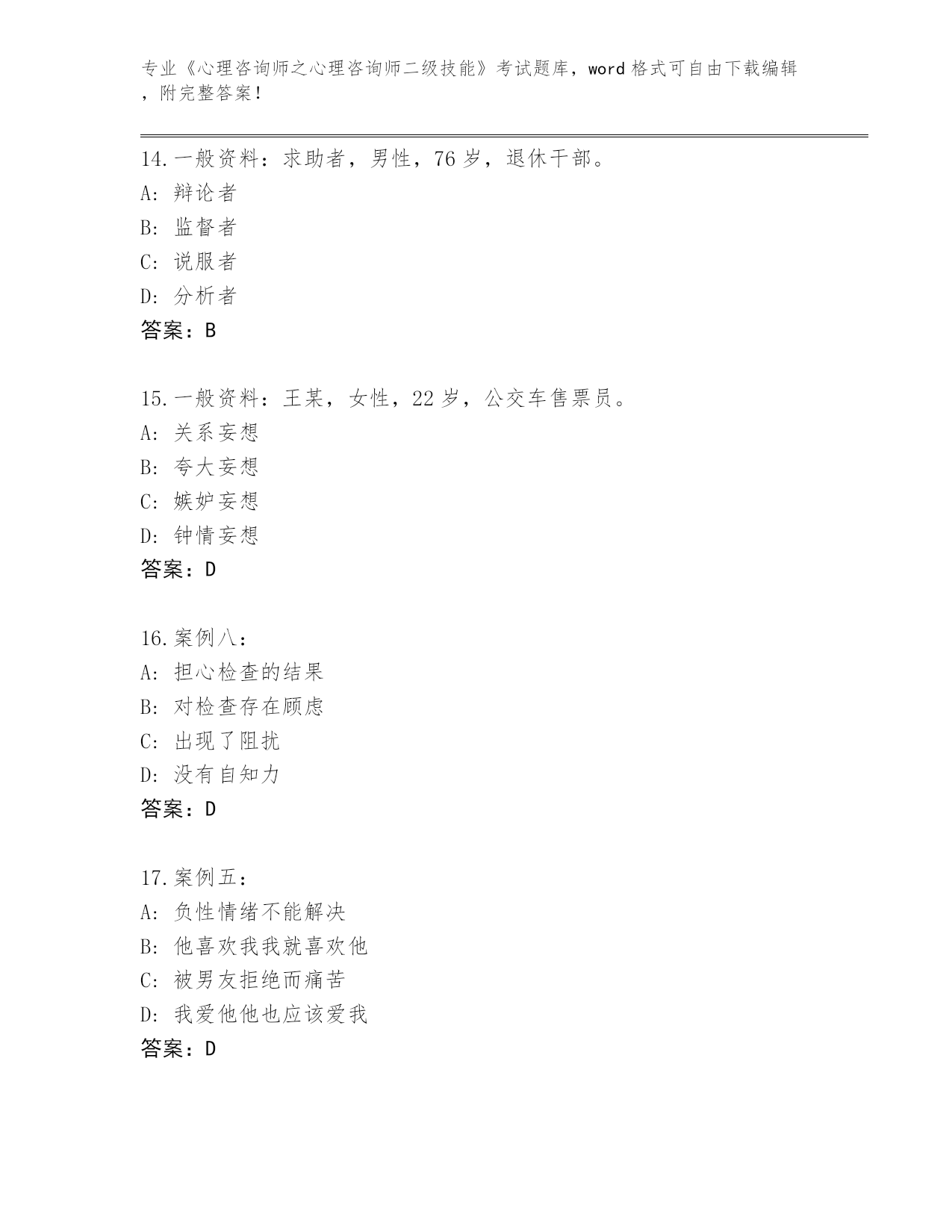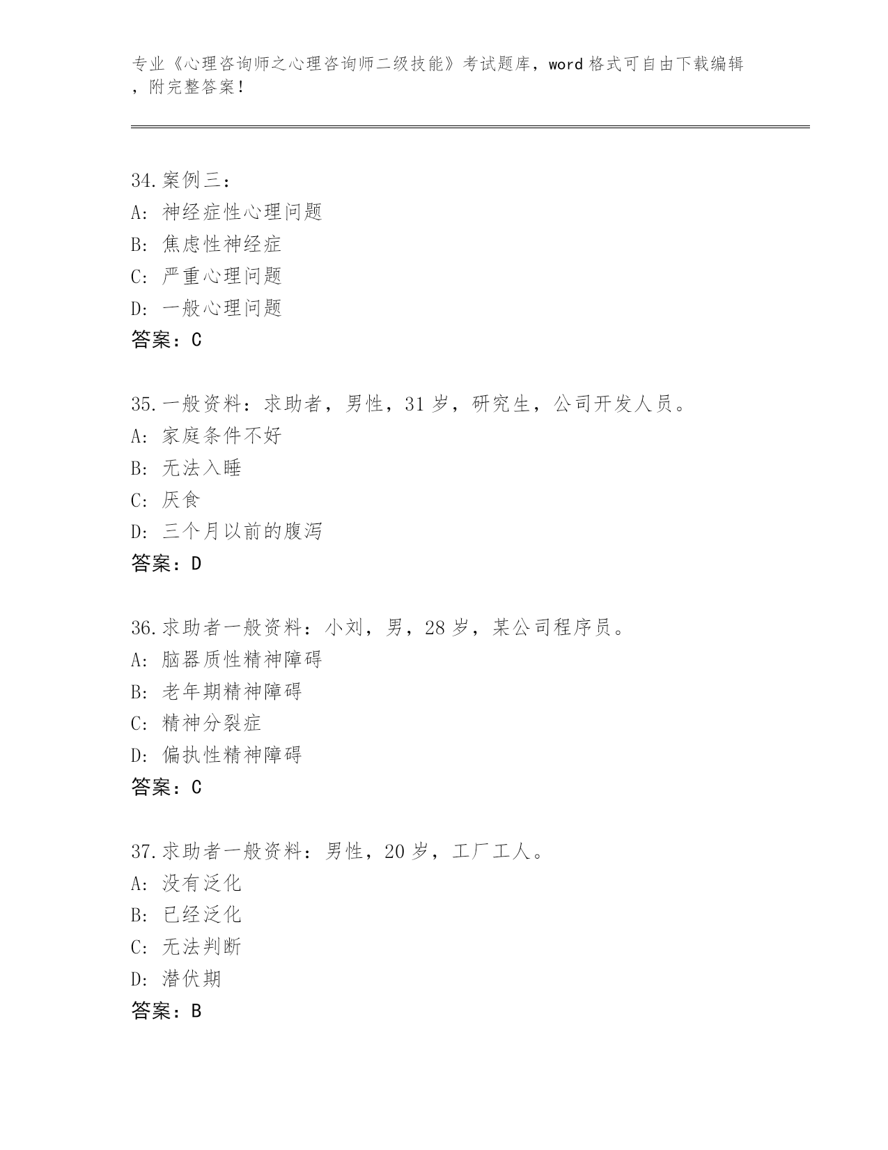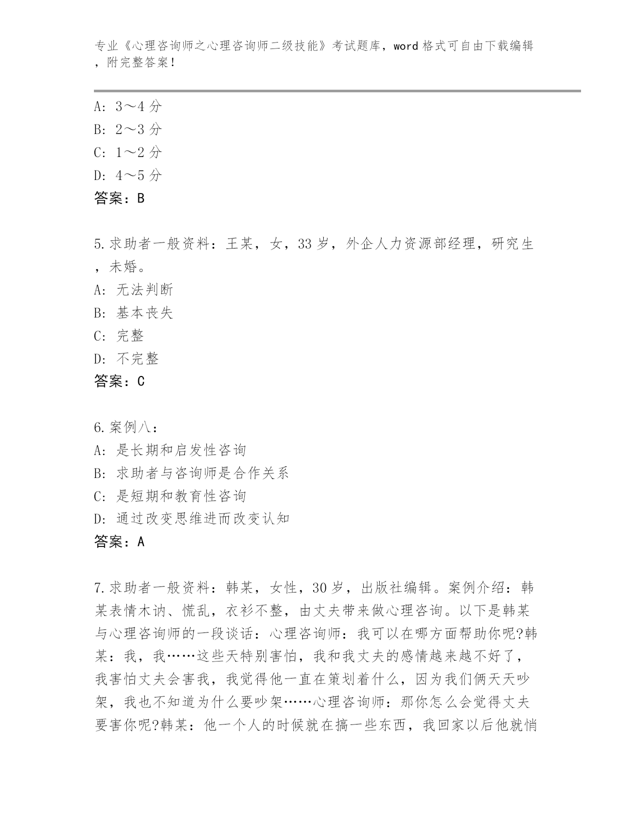 江苏省天宁区2024年《心理咨询师之心理咨询师二级技能》考试真题题库答案