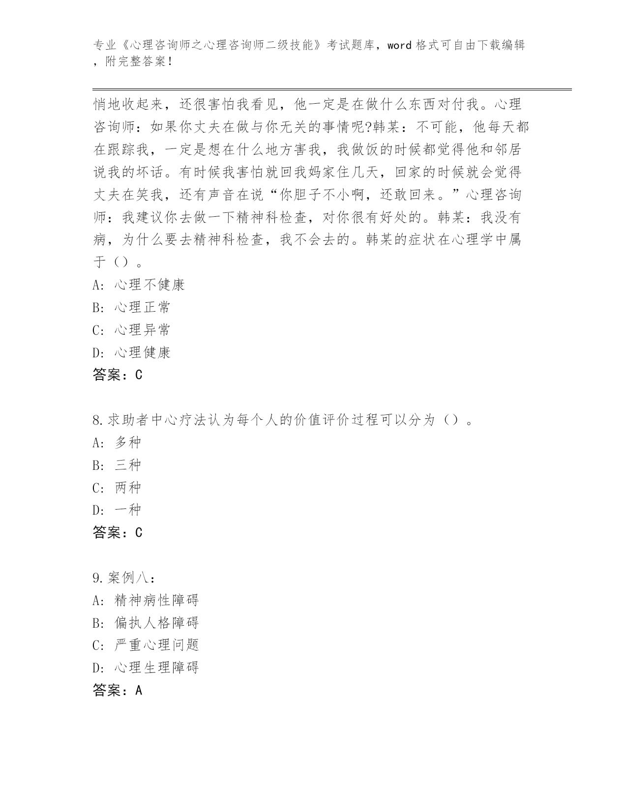 历年江苏省《心理咨询师之心理咨询师二级技能》考试必考200题真题带答案下载