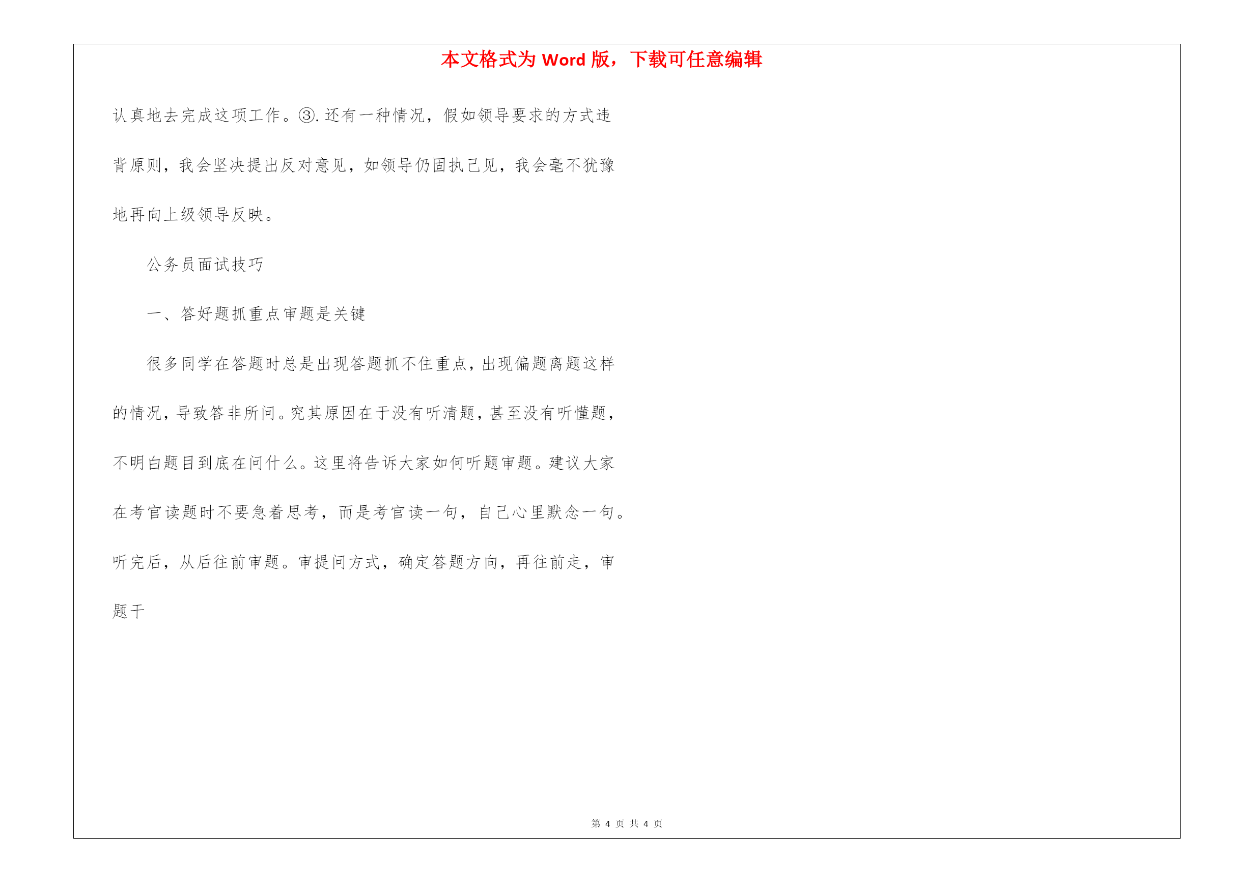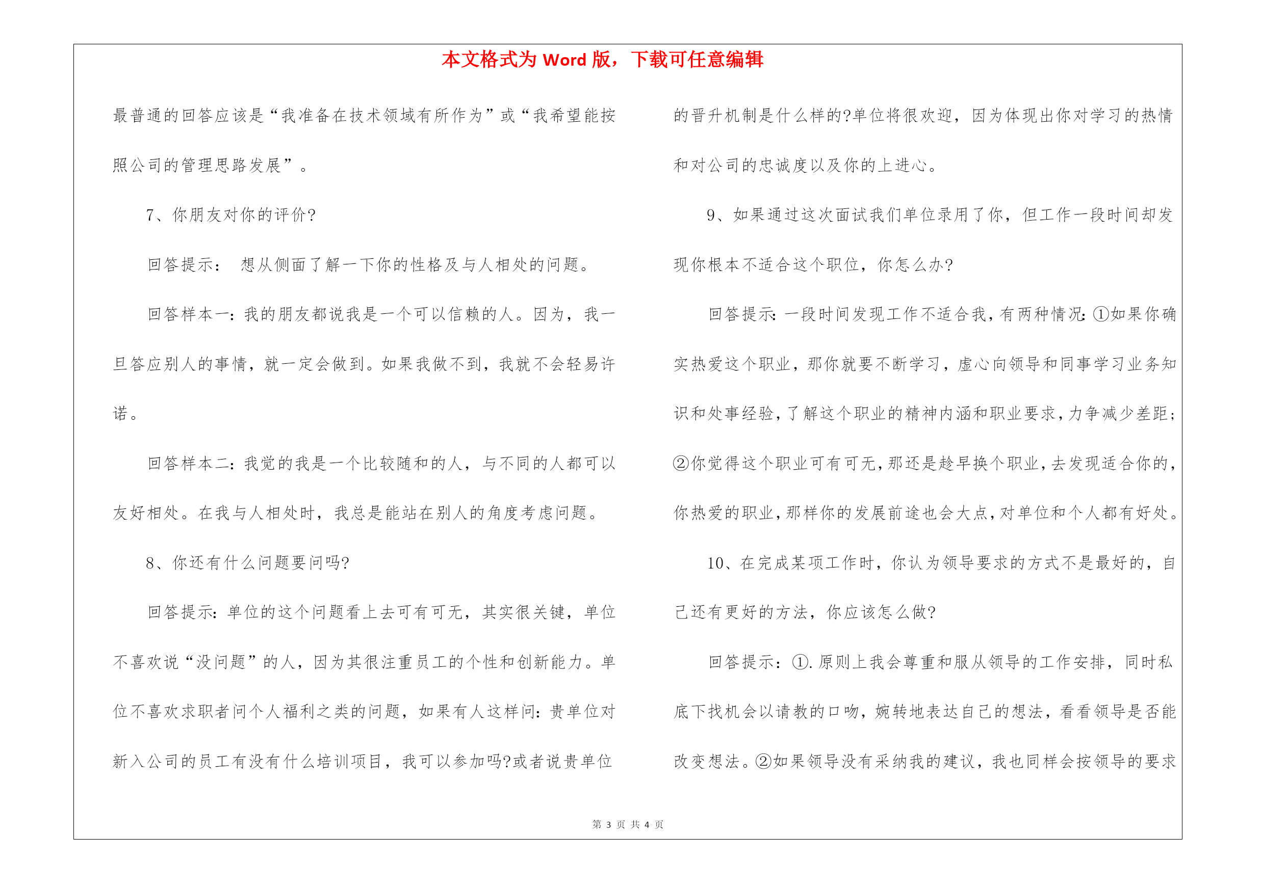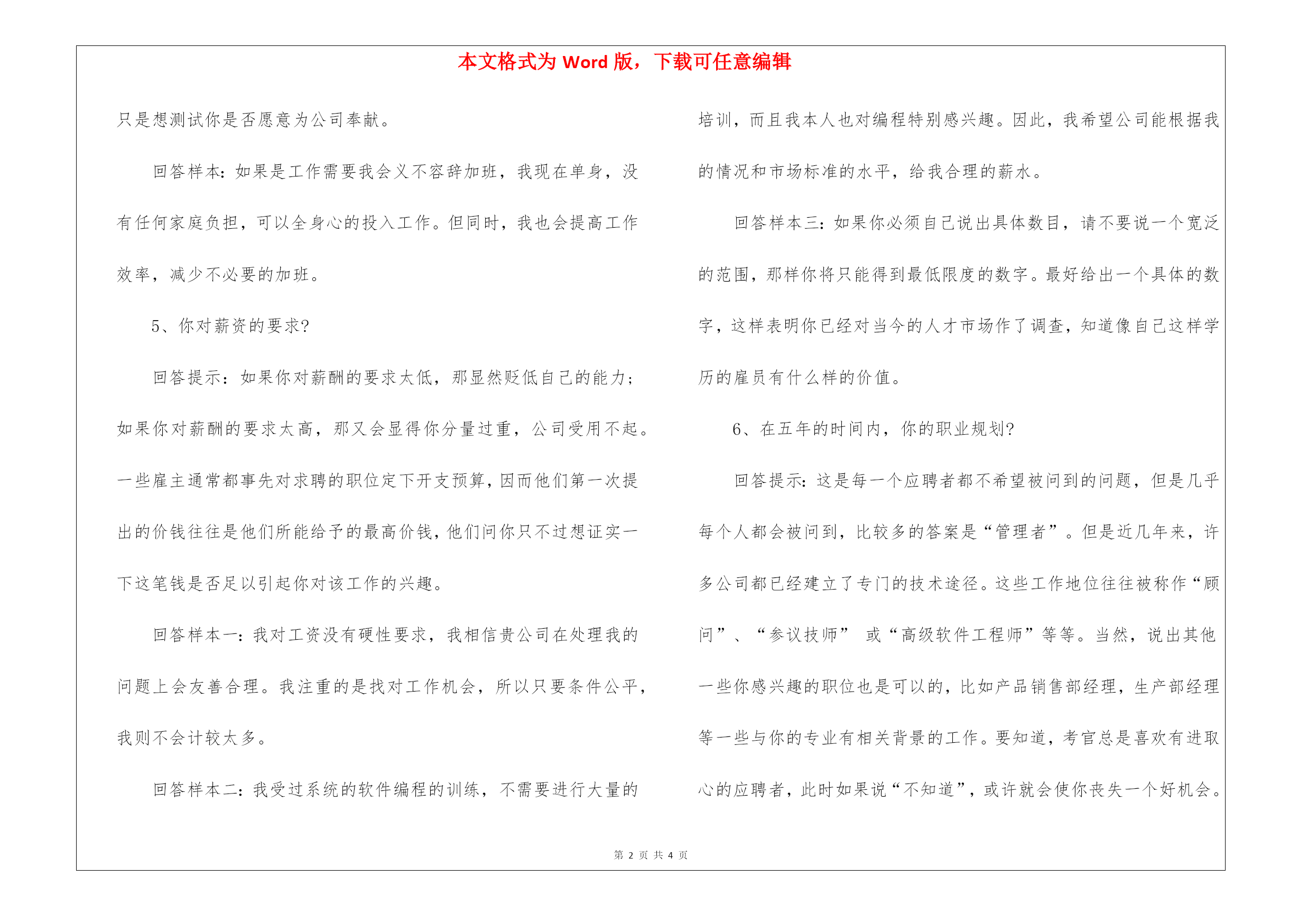 本文格式为Word版,下载可任意编辑第PAGE\*MERGEFORMAT4页共NUMPAGES\*MERGEFORMAT4页2021年份公务员面试回答经验公务员包括笔试和面试,那面试会考些什么问题?想了解的小伙伴看过来,下面我给大家带来关于公务员面试回答经验,方便大家学习,希望会对大家的工作与学习有所帮助。公务员面试回答经验1、请你自我介绍一下你自己?回答提示:一般人回答这个问题过于平常,只说姓名、年龄、爱好、工作经验,这些在简历上都有。其实,单位最希望知道的是求职者能否胜任工作,包括:最强的技能、最深入研究的知识领域、个性中最积极的部分、做过的最成功的事,主要的成就等,这些都可以和学习无关,也可以和学习有关,但要突出积极的个性和做事的能力,说得合情合理单位才会相信。单位很重视一个人的礼貌,求职者要尊重面试考官,在回答每个问题之后都说一句“谢谢”,单位喜欢有礼貌的求职者。2、你觉得你个性上最大的优点是什么?回答提示:沉着冷静、条理清楚、立场坚定、顽强向上、乐于助人和关心他人、适应能力和幽默感、乐观和友爱。我在经过一到两年的培训及项目实战,加上实习工作,使我适合这份工作。3、说说你最大的缺点?回答提示:这个问题单位问的概率很大,通常不希望听到直接回答的缺点是什么等,如果求职者说自己小心眼、爱忌妒人、非常懒、脾气大、工作效率低,单位肯定不会录用你。绝对不要自作聪明地回答“我最大的缺点是过于追求完美”,有的人以为这样回答会显得自己比较出色,但事实上,他已经岌岌可危了。单位喜欢求职者从自己的优点说起,中间加一些小缺点,最后再把问题转回到优点上,突出优点的部分,单位喜欢聪明的求职者。4、你对加班的看法?回答提示:实际上好多单位会问这个问题,并不证明一定要加班,只是想测试你是否愿意为公司奉献。回答样本:如果是工作需要我会义不容辞加班,我现在单身,没有任何家庭负担,可以全身心的投入工作。但同时,我也会提高工作效率,减少不必要的加班。5、你对薪资的要求?回答提示:如果你对薪酬的要求太低,那显然贬低自己的能力;如果你对薪酬的要求太高,那又会显得你分量过重,公司受用不起。一些雇主通常都事先对求聘的职位定下开支预算,因而他们第一次提出的价钱往往是他们所能给予的最高价钱,他们问你只不过想证实一下这笔钱是否足以引起你对该工作的兴趣。回答样本一:我对工资没有硬性要求,我相信贵公司在处理我的问题上会友善合理。我注重的是找对工作机会,所以只要条件公平,我则不会计较太多。回答样本二:我受过系统的软件编程的训练,不需要进行大量的培训,而且我本人也对编程特别感兴趣。因此,我希望公司能根据我的情况和市场标准的水平,给我合理的薪水。回答样本三:如果你必须自己说出具体数目,请不要说一个宽泛的范围,那样你将只能得到最低限度的数字。最好给出一个具体的数字,这样表明你已经对当今的人才市场作了调查,知道像自己这样学历的雇员有什么样的价值。6、在五年的时间内,你的职业规划?回答提示:这是每一个应聘者都不希望被问到的问题,但是几乎每个人都会被问到,比较多的答案是“管理者”。但是近几年来,许多公司都已经建立了专门的技术途径。这些工作地位往往被称作“顾问”、“参议技师”或“高级软件工程师”等等。当然,说出其他一些你感兴趣的职位也是可以的,比如产品销售部经理,生产部经理等一些与你的专业有相关背景的工作。要知道,考官总是喜欢有进取心的应聘者,此时如果说“不知道”,或许就会使你丧失一个好机会。最普通的回答应该是“我准备在技术领域有所作为”或“我希望能按照公司的管理思路发展”。7、你朋友对你的评价?回答提示:想从侧面了解一下你的性格及与人相处的问题。回答样本一:我的朋友都说我是一个可以信赖的人。因为,我一旦答应别人的事情,就一定会做到。如果我做不到,我就不会轻易许诺。回答样本二:我觉的我是一个比较随和的人,与不同的人都可以友好相处。在我与人相处时,我总是能站在别人的角度考虑问题。8、你还有什么问题要问吗?回答提示:单位的这个问题看上去可有可无,其实很关键,单位不喜欢说“没问题”的人,因为其很注重员工的个性和创新能力。单位不喜欢求职者问个人福利之类的问题,如果有人这样问:贵单位对新入公司的员工有没有什么培训项目,我可以参加吗?或者说贵单位的晋升机制是什么样的?单位将很欢迎,因为体现出你对学习的热情和对公司的忠诚度以及你的上进心。9、如果通过这次面试我们单位录用了你,但工作一段时间却发现你根本不适合这个职位,你怎么办?回答提示:一段时间发现工作不适合我,有两种情况:①如果你确实热爱这个职业,那你就要不断学习,虚心向领导和同事学习业务知识和处事经验,了解这个职业的精神内涵和职业要求,力争减少差距;②你觉得这个职业可有可无,那还是趁早换个职业,去发现适合你的,你热爱的职业,那样你的