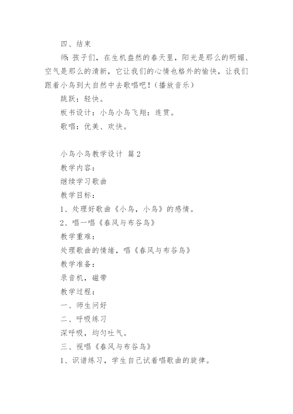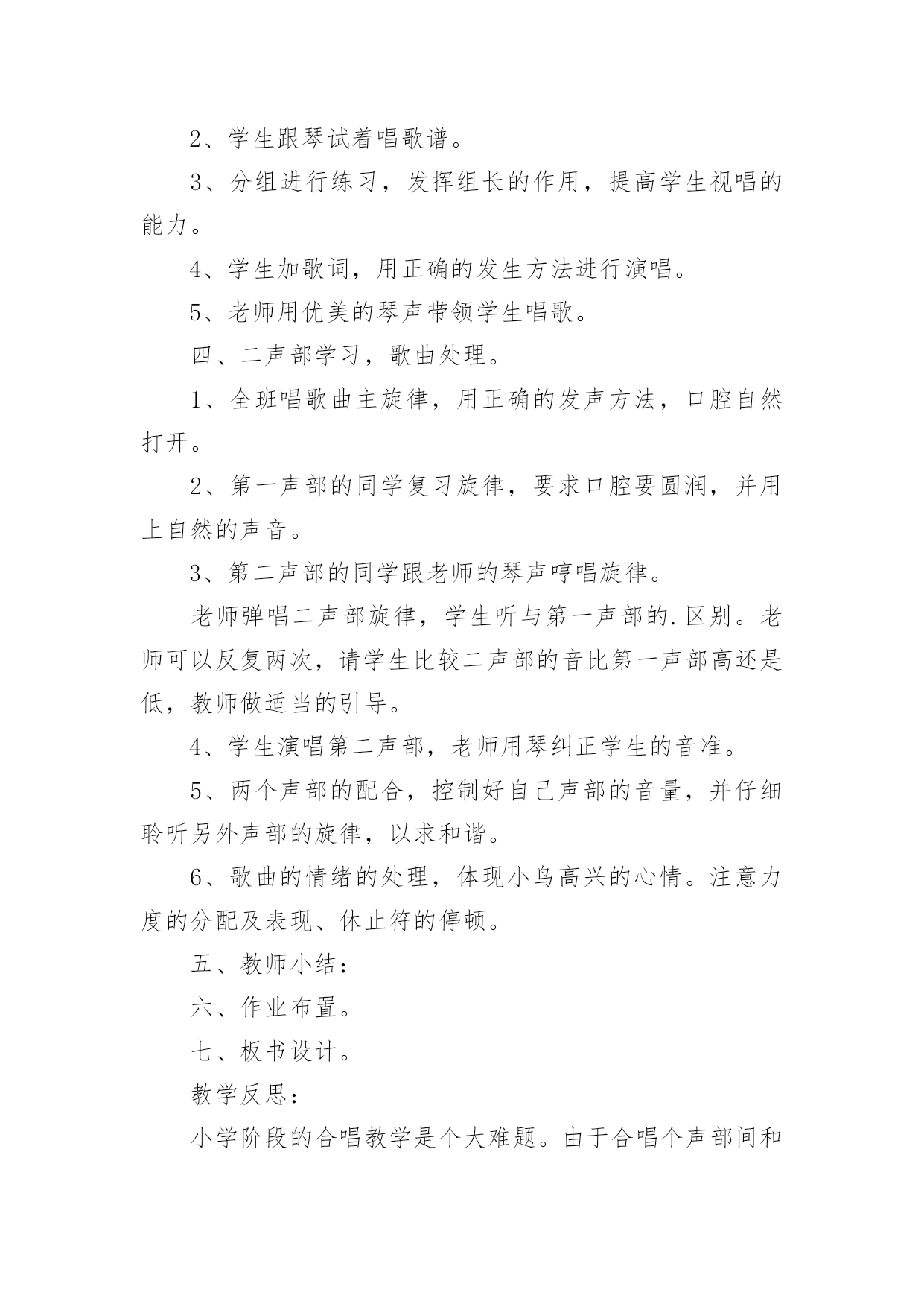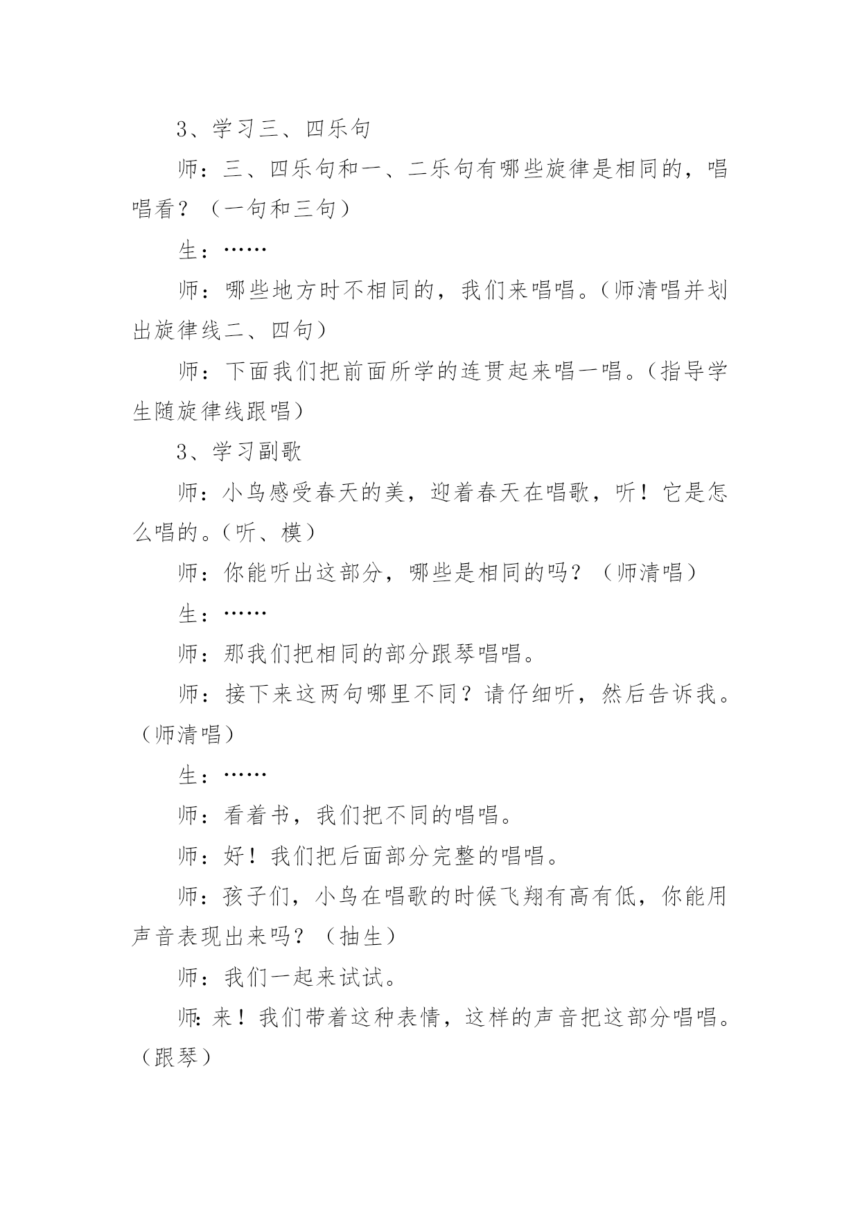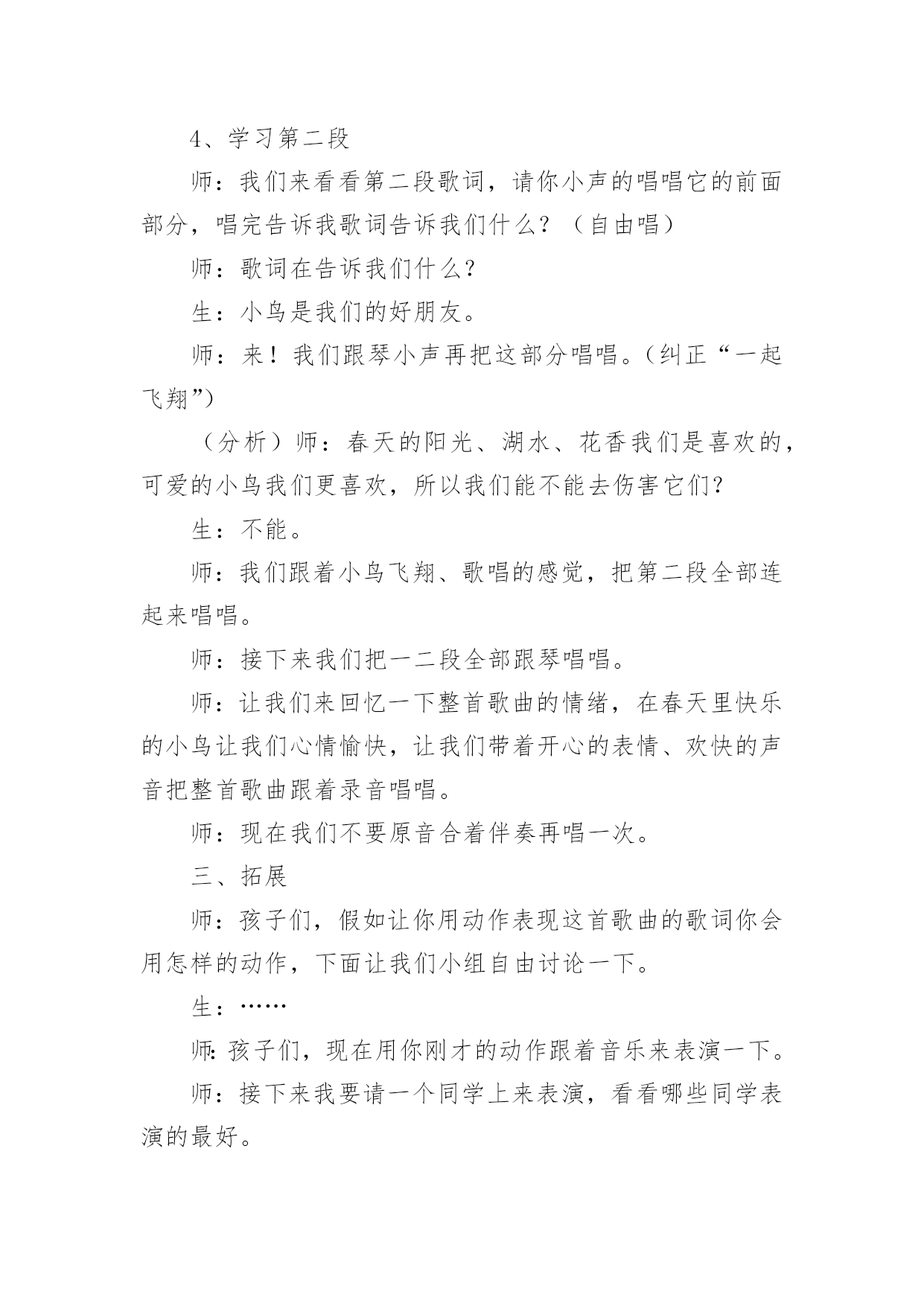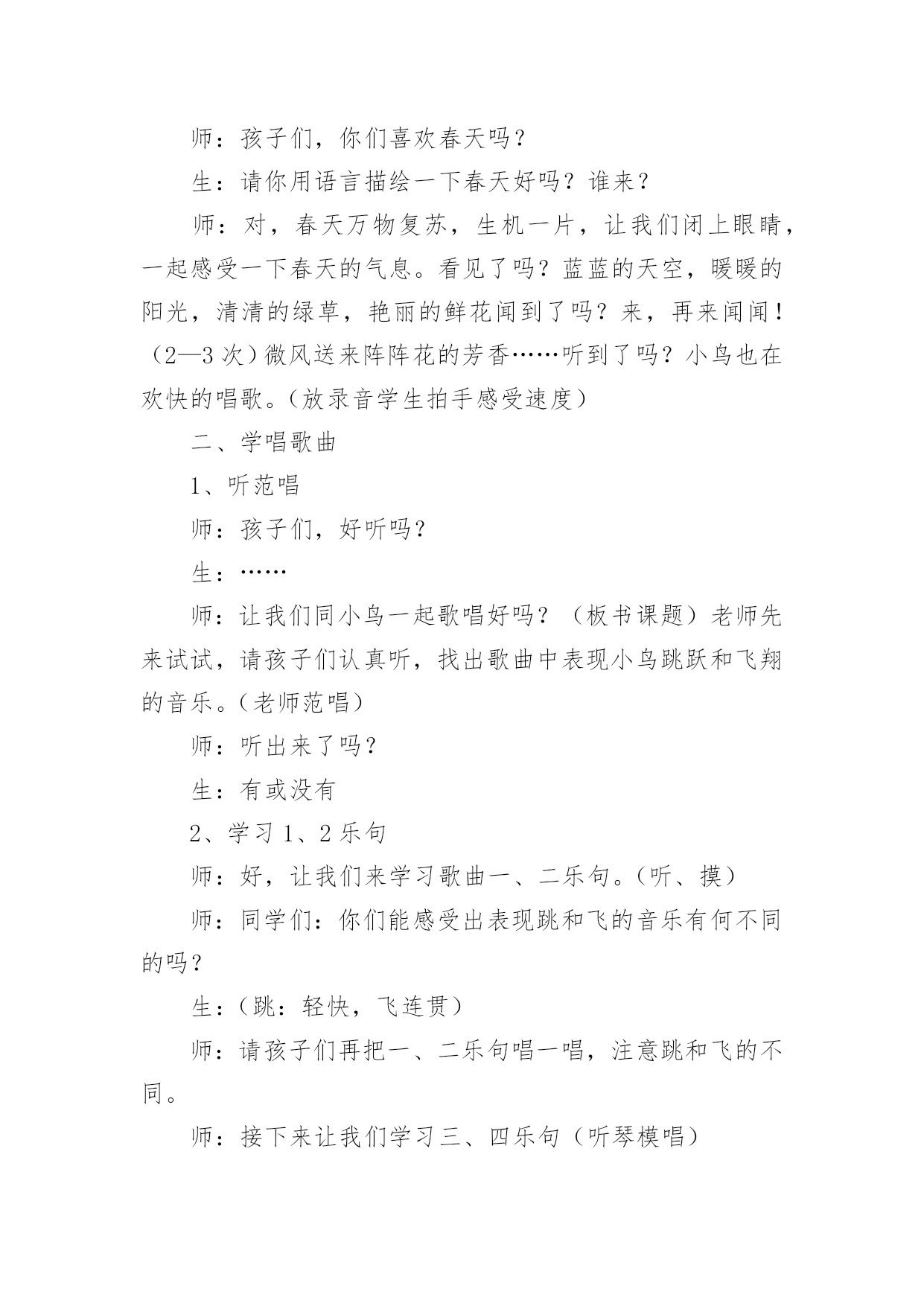 小鸟小鸟教学设计作为一无名无私奉献的教育工作者,总不可避免地需要编写教学设计,借助教学设计可以更大幅度地提高学生各方面的能力,从而使学生获得良好的发展。一份好的教学设计是什么样子的呢?下面是小编为大家收集的小鸟小鸟教学设计,希望对大家有所帮助。小鸟小鸟教学设计篇1教学目标:1、引导学生用优美舒展的歌喉歌曲一声部,表达对大自然的赞美之情。2、通过学习歌曲,进一步激发学生保护小动物,热爱大自然的情怀。教学重点:体验、表现歌曲教学难点:1、弱起节奏和6/8拍强弱的把握特点。2、相同节奏不同旋律的掌握。教学过程:一、引入师:孩子们!我们现看一个短片,看完后请你告诉我是哪个季节?生:……师:孩子们,你们喜欢春天吗?生:请你用语言描绘一下春天好吗?谁来?师:对,春天万物复苏,生机一片,让我们闭上眼睛,一起感受一下春天的气息。看见了吗?蓝蓝的天空,暖暖的阳光,清清的绿草,艳丽的鲜花闻到了吗?来,再来闻闻!(2—3次)微风送来阵阵花的芳香……听到了吗?小鸟也在欢快的唱歌。(放录音学生拍手感受速度)二、学唱歌曲1、听范唱师:孩子们,好听吗?生:……师:让我们同小鸟一起歌唱好吗?(板书课题)老师先来试试,请孩子们认真听,找出歌曲中表现小鸟跳跃和飞翔的音乐。(老师范唱)师:听出来了吗?生:有或没有2、学习1、2乐句师:好,让我们来学习歌曲一、二乐句。(听、摸)师:同学们:你们能感受出表现跳和飞的音乐有何不同的吗?生:(跳:轻快,飞连贯)师:请孩子们再把一、二乐句唱一唱,注意跳和飞的不同。师:接下来让我们学习三、四乐句(听琴模唱)3、学习三、四乐句师:三、四乐句和一、二乐句有哪些旋律是相同的,唱唱看?(一句和三句)生:……师:哪些地方时不相同的,我们来唱唱。(师清唱并划出旋律线二、四句)师:下面我们把前面所学的连贯起来唱一唱。(指导学生随旋律线跟唱)3、学习副歌师:小鸟感受春天的美,迎着春天在唱歌,听!它是怎么唱的。(听、模)师:你能听出这部分,哪些是相同的吗?(师清唱)生:……师:那我们把相同的部分跟琴唱唱。师:接下来这两句哪里不同?请仔细听,然后告诉我。(师清唱)生:……师:看着书,我们把不同的唱唱。师:好!我们把后面部分完整的唱唱。师:孩子们,小鸟在唱歌的时候飞翔有高有低,你能用声音表现出来吗?(抽生)师:我们一起来试试。师:来!我们带着这种表情,这样的声音把这部分唱唱。(跟琴)4、学习第二段师:我们来看看第二段歌词,请你小声的唱唱它的前面部分,唱完告诉我歌词告诉我们什么?(自由唱)师:歌词在告诉我们什么?生:小鸟是我们的好朋友。师:来!我们跟琴小声再把这部分唱唱。(纠正“一起飞翔”)(分析)师:春天的阳光、湖水、花香我们是喜欢的,可爱的小鸟我们更喜欢,所以我们能不能去伤害它们?生:不能。师:我们跟着小鸟飞翔、歌唱的感觉,把第二段全部连起来唱唱。师:接下来我们把一二段全部跟琴唱唱。师:让我们来回忆一下整首歌曲的情绪,在春天里快乐的小鸟让我们心情愉快,让我们带着开心的表情、欢快的声音把整首歌曲跟着录音唱唱。师:现在我们不要原音合着伴奏再唱一次。三、拓展师:孩子们,假如让你用动作表现这首歌曲的歌词你会用怎样的动作,下面让我们小组自由讨论一下。生:……师:孩子们,现在用你刚才的动作跟着音乐来表演一下。师:接下来我要请一个同学上来表演,看看哪些同学表演的最好。四、结束师:孩子们,在生机盎然的春天里,阳光是那么的明媚、空气是那么的清新,它让我们的心情也格外的愉快,让我们跟着小鸟到大自然中去歌唱吧!(播放音乐)跳跃:轻快。板书设计:小鸟小鸟飞翔:连贯。歌唱:优美、欢快。小鸟小鸟教学设计篇2教学内容:继续学习歌曲教学目标:1、处理好歌曲《小鸟,小鸟》的感情。2、唱一唱《春风与布谷鸟》教学重难:处理歌曲的情绪,唱《春风与布谷鸟》教学准备:录音机,磁带教学过程:一、师生问好二、呼吸练习深呼吸,均匀吐气。三、视唱《春风与布谷鸟》1、识谱练习,学生自己试着唱歌曲的旋律。2、学生跟琴试着唱歌谱。3、分组进行练习,发挥组长的作用,提高学生视唱的能力。4、学生加歌词,用正确的发生方法进行演唱。5、老师用优美的琴声带领学生唱歌。四、二声部学习,歌曲处理。1、全班唱歌曲主旋律,用正确的发声方法,口腔自然打开。2、第一声部的同学复习旋律,要求口腔要圆润,并用上自然的声音。3、第二声部的同学跟老师的琴声哼唱旋律。老师弹唱二声部旋律,学生听与第一声部的.区别。老师可以反复两次,请学生比较二声部的音比第一声部高还是低,教师做适当的引导。4、学生演唱第二声部,老师用琴纠正学生的音准。5、两个声部的配合,控制好自己声部的音量,并仔细聆听另外声部的旋律,以求和谐。6、歌曲的情绪的处理,体现小鸟高兴的心情。注意力度的分配及表现、休止符的停顿。五、教师小结:六、作业布置。七、板书设计。教学