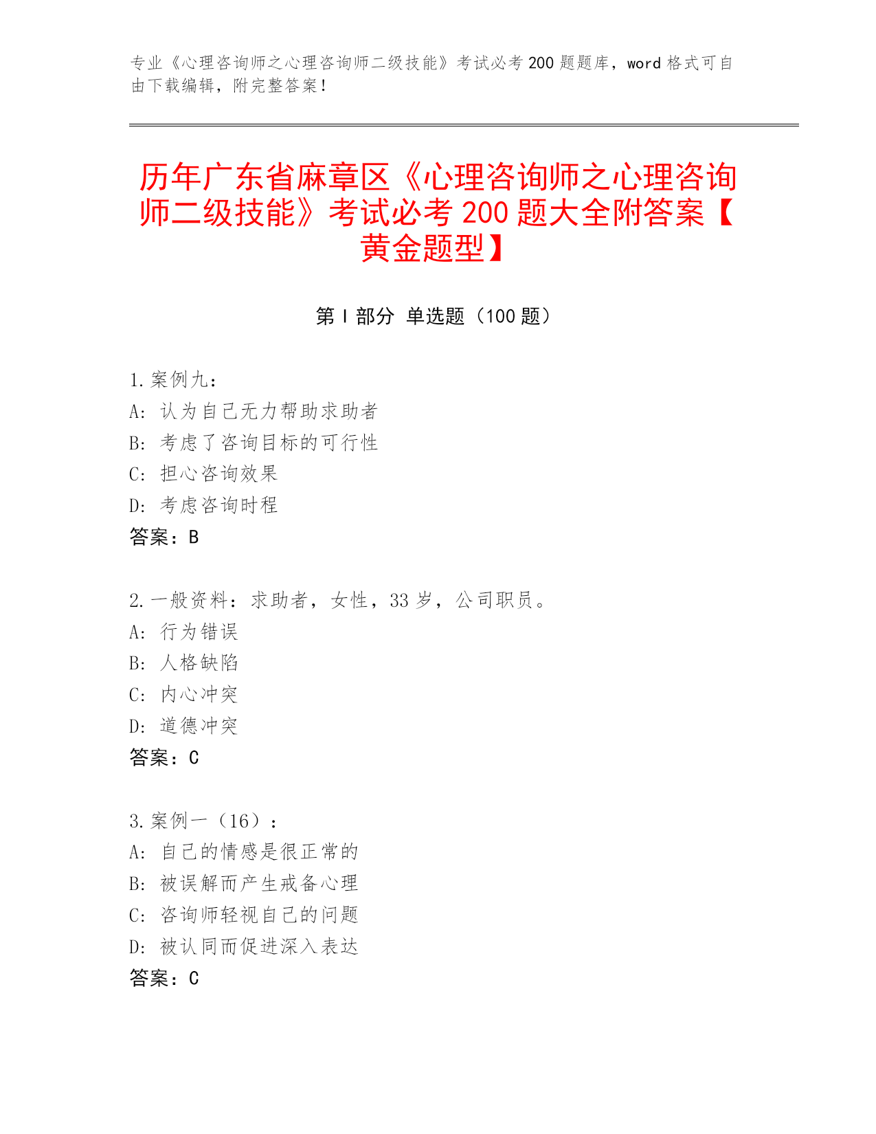 历年广东省麻章区《心理咨询师之心理咨询师二级技能》考试必考200题大全附答案【黄金题型】