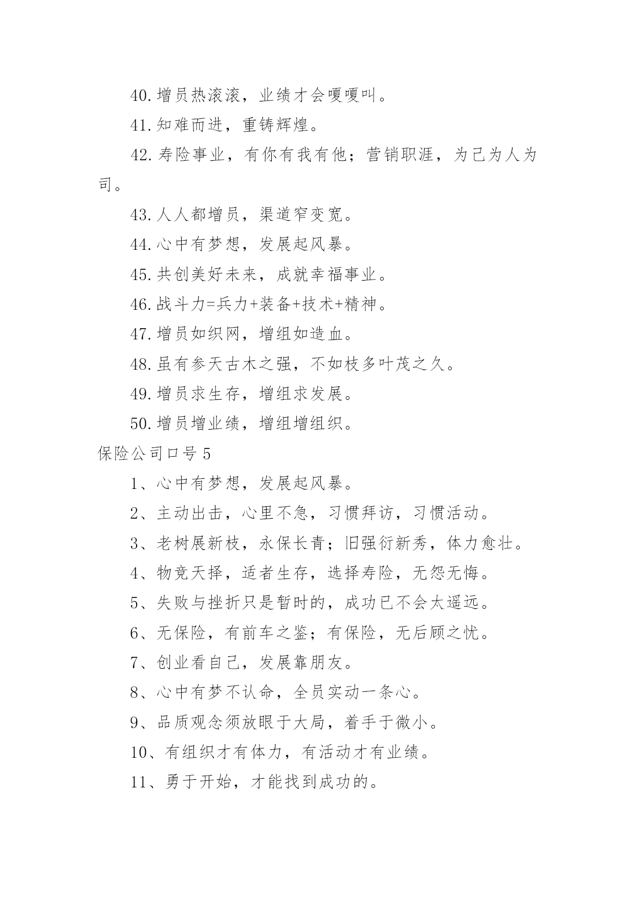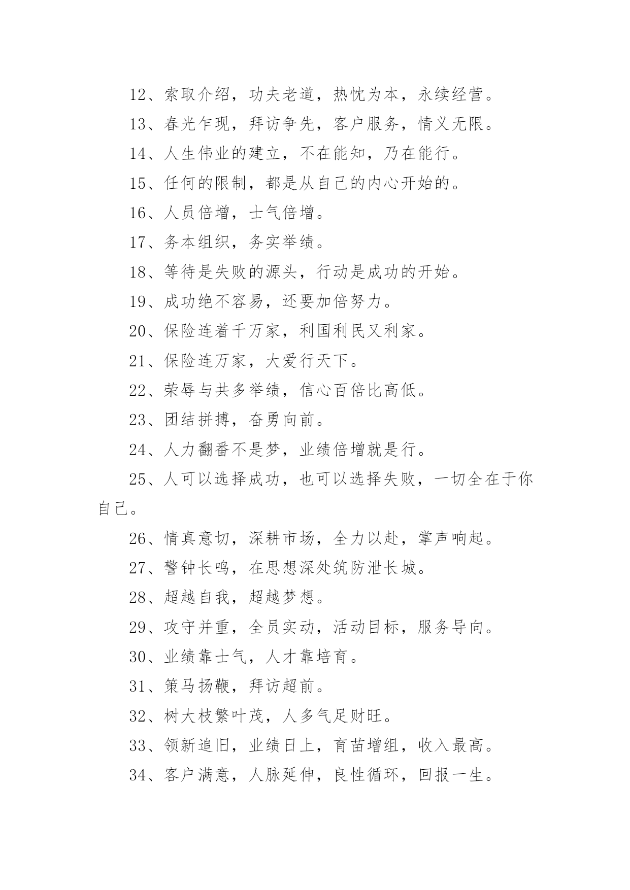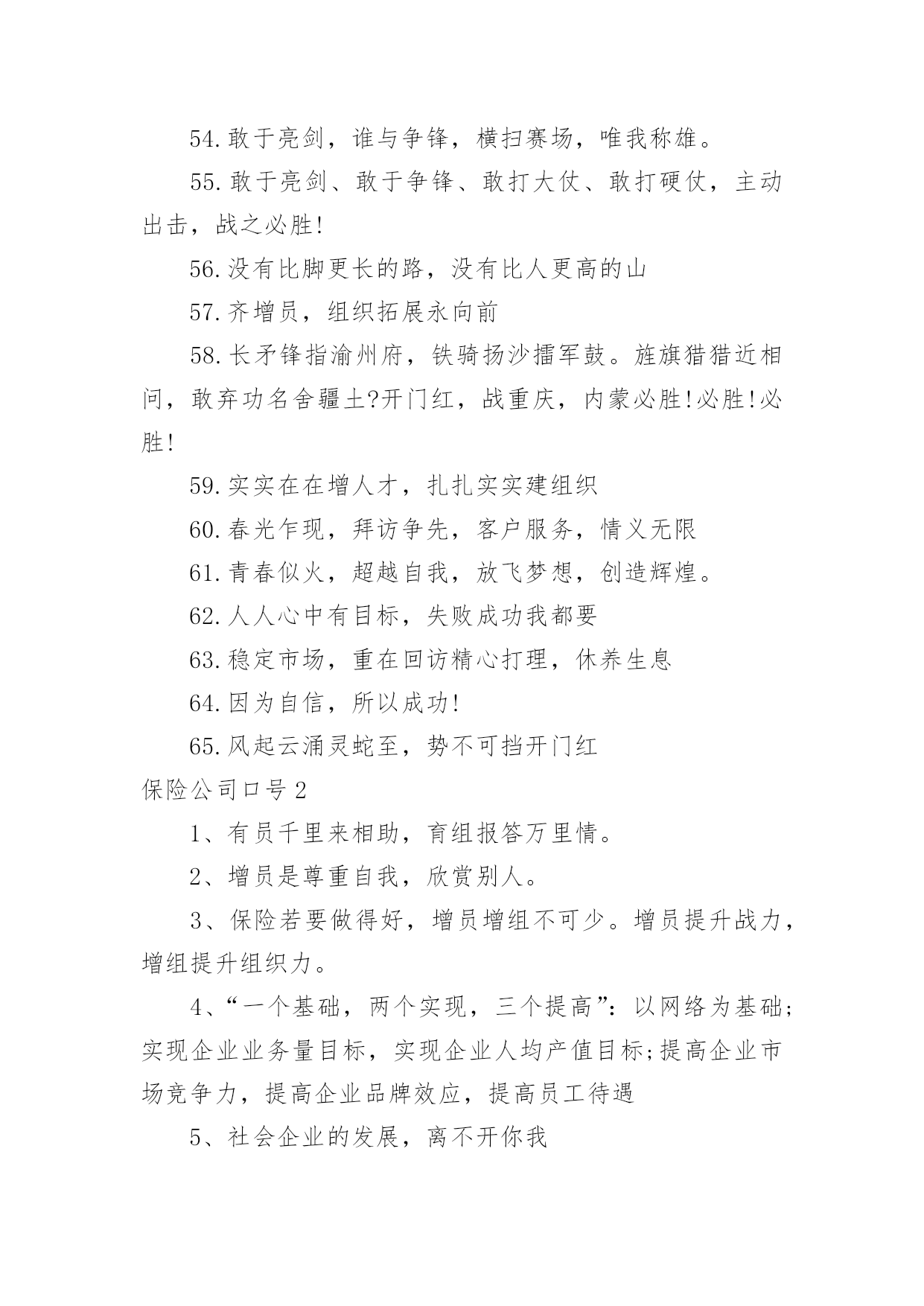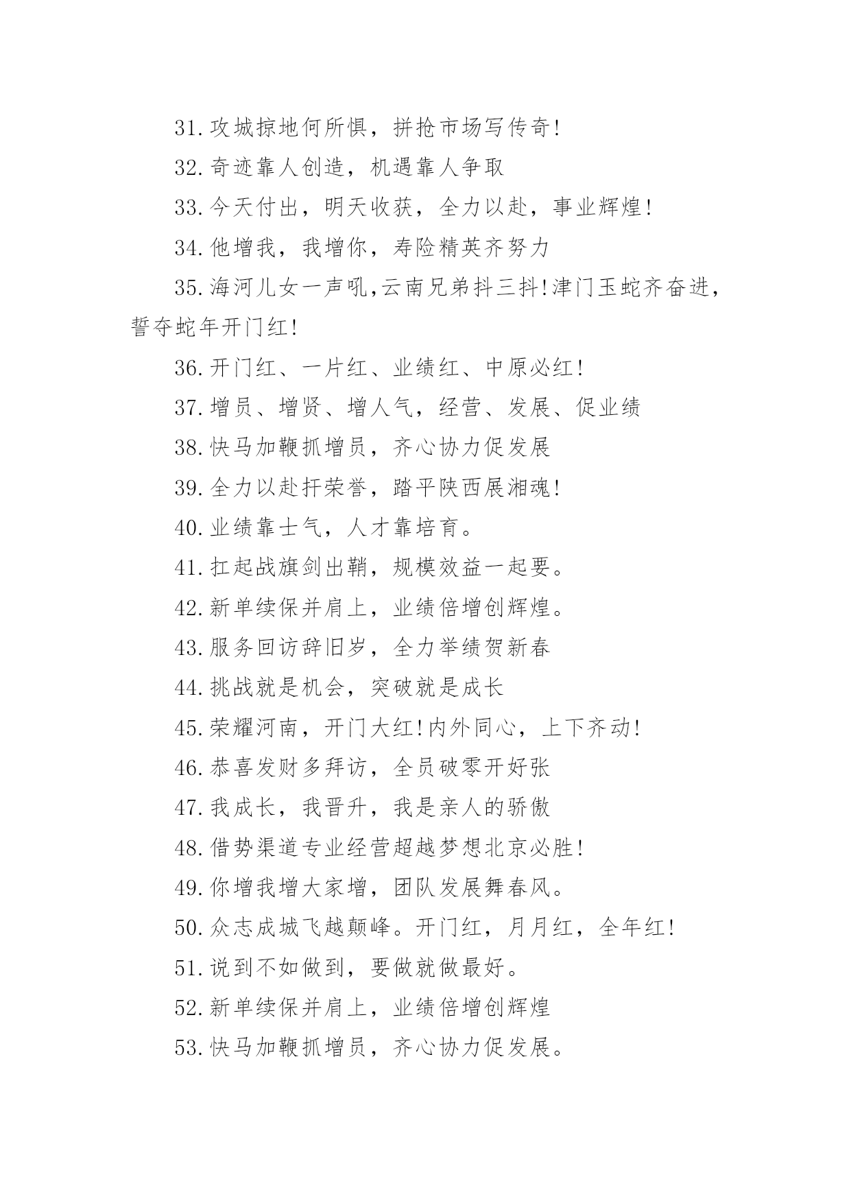 保险公司口号保险公司口号(15篇)在平日的学习、工作和生活里,大家都听说过或者使用过一些比较经典的口号吧,口号对人们的思维是有一定的感性作用的。你还在找寻优秀经典的口号吗?以下是小编精心整理的保险公司口号,仅供参考,希望能够帮助到大家。保险公司口号11.15.单枪匹马人孤势单,招兵买马人多势众。2.你增员我增员,人人增员天地宽3.饮水思源,薪火相传。4.全力以赴向前冲,奋力决战开门红。5.河南儿女一声吼,北京兄弟抖三抖!6.拼抢市场百战多,白刃格斗不退缩。两军对垒勇者胜,中华保险奏凯歌。7.今日不为增员作努力,明日必为业绩掉眼泪8.双脚踏出亿万金,推销要拼才会赢。9.不怕增员难,就怕不增员10.树大枝繁叶茂,人多气足财旺11.我们的队伍像太阳,脚踏着中原的大地,背负着社会的希望,我们是一支不可战胜的力量。12.憋足一口气,拧成一股绳,共圆一个梦13.目标明确,坚定不移,天道酬勤,永续经营!14.将士不怕攻城难,万水千山只等闲。15.双脚踏出亿万金,市场要拼才会赢。16.龙腾虎跃,雷霆万钧,无与伦比,万众一心。17.开门红战役是意志的竞赛,是智慧的比拼,是青春的展示,是巅峰的对决!18.二月龙头第一战川滇对抗风云密达成千万不动摇踩扁云南写传奇19.永不言退,我们是最好的团队!20.旅游是奖励,大家来争取,你能我也能,万元抢先机21.一步先,步步先;开门红,月月红。22.东风吹,战鼓擂,中华儿女怕过谁!23.人人心中有目标,失败成功我都要。24.有员才有援,有为才有位25.从业有缘,借福感恩,坚定信念;行销一生26.专职专业技能添一日三访不畏难中产五千你我他人人十万我争先开门大战狂飙起不达目标誓不还干干干!27.听!风在呼啸军号响;听!冲锋的战歌多嘹亮!28.春色满园关不住,龙腾虎跃开门红。新单续保并肩上,业绩倍增创辉煌!29.神采飞扬,全力拼冲!羊年伊始,赢战新疆!30.鸿运当头照蛇年好运到首战X百万完胜开门红红!红!红!31.攻城掠地何所惧,拼抢市场写传奇!32.奇迹靠人创造,机遇靠人争取33.今天付出,明天收获,全力以赴,事业辉煌!34.他增我,我增你,寿险精英齐努力35.海河儿女一声吼,云南兄弟抖三抖!津门玉蛇齐奋进,誓夺蛇年开门红!36.开门红、一片红、业绩红、中原必红!37.增员、增贤、增人气,经营、发展、促业绩38.快马加鞭抓增员,齐心协力促发展39.全力以赴扞荣誉,踏平陕西展湘魂!40.业绩靠士气,人才靠培育。41.扛起战旗剑出鞘,规模效益一起要。42.新单续保并肩上,业绩倍增创辉煌。43.服务回访辞旧岁,全力举绩贺新春44.挑战就是机会,突破就是成长45.荣耀河南,开门大红!内外同心,上下齐动!46.恭喜发财多拜访,全员破零开好张47.我成长,我晋升,我是亲人的骄傲48.借势渠道专业经营超越梦想北京必胜!49.你增我增大家增,团队发展舞春风。50.众志成城飞越颠峰。开门红,月月红,全年红!51.说到不如做到,要做就做最好。52.新单续保并肩上,业绩倍增创辉煌53.快马加鞭抓增员,齐心协力促发展。54.敢于亮剑,谁与争锋,横扫赛场,唯我称雄。55.敢于亮剑、敢于争锋、敢打大仗、敢打硬仗,主动出击,战之必胜!56.没有比脚更长的路,没有比人更高的山57.齐增员,组织拓展永向前58.长矛锋指渝州府,铁骑扬沙擂军鼓。旌旗猎猎近相问,敢弃功名舍疆土?开门红,战重庆,内蒙必胜!必胜!必胜!59.实实在在增人才,扎扎实实建组织60.春光乍现,拜访争先,客户服务,情义无限61.青春似火,超越自我,放飞梦想,创造辉煌。62.人人心中有目标,失败成功我都要63.稳定市场,重在回访精心打理,休养生息64.因为自信,所以成功!65.风起云涌灵蛇至,势不可挡开门红保险公司口号21、有员千里来相助,育组报答万里情。2、增员是尊重自我,欣赏别人。3、保险若要做得好,增员增组不可少。增员提升战力,增组提升组织力。4、“一个基础,两个实现,三个提高”:以网络为基础;实现企业业务量目标,实现企业人均产值目标;提高企业市场竞争力,提高企业品牌效应,提高员工待遇5、社会企业的发展,离不开你我6、建立南电网络,追求完美生活7、企业发展,服务为本;优质服务,诚信为本8、增员不是考验对方,而是考验咱们是否有潜质使对方成功。9、团结拼搏务实高效10、有木才有材,有人才有财;育才如增财,育才如置产。11、销售拼士气,增员靠风气。12、经营之源靠新秀,成功之本靠报升。13、以人才为根本,以市场为导向,以质量为保证,以服务为宗旨14、得客户者得天下15、增员要五心——信心耐心爱心感恩心企图心。16、办实事求实效,创一流服务品牌,树完美企业形象17、旧强衍新秀,体力愈壮。18、放我的真心在您的手心19、勇于承认错误,敢于承担职责20、持续领悟,自我完善,做事情充分