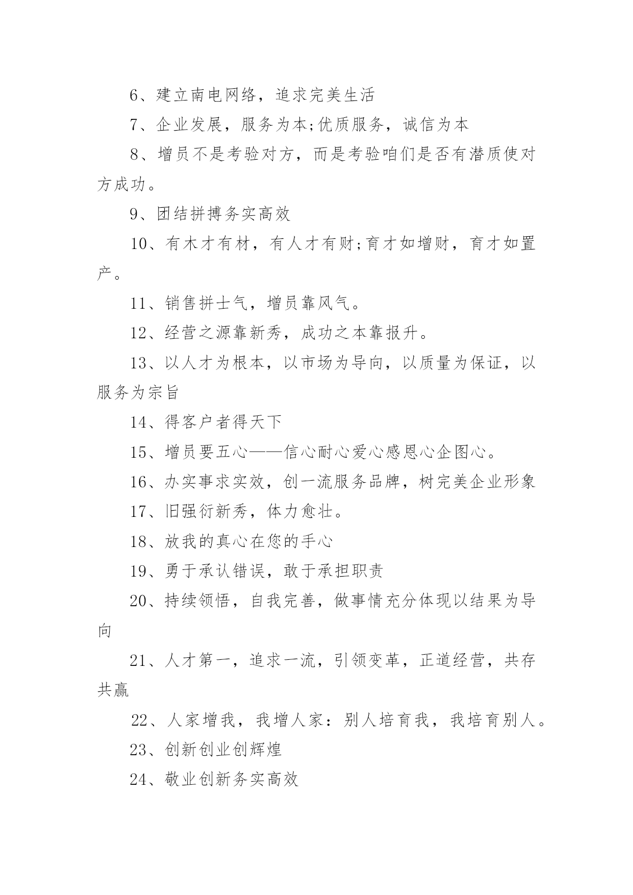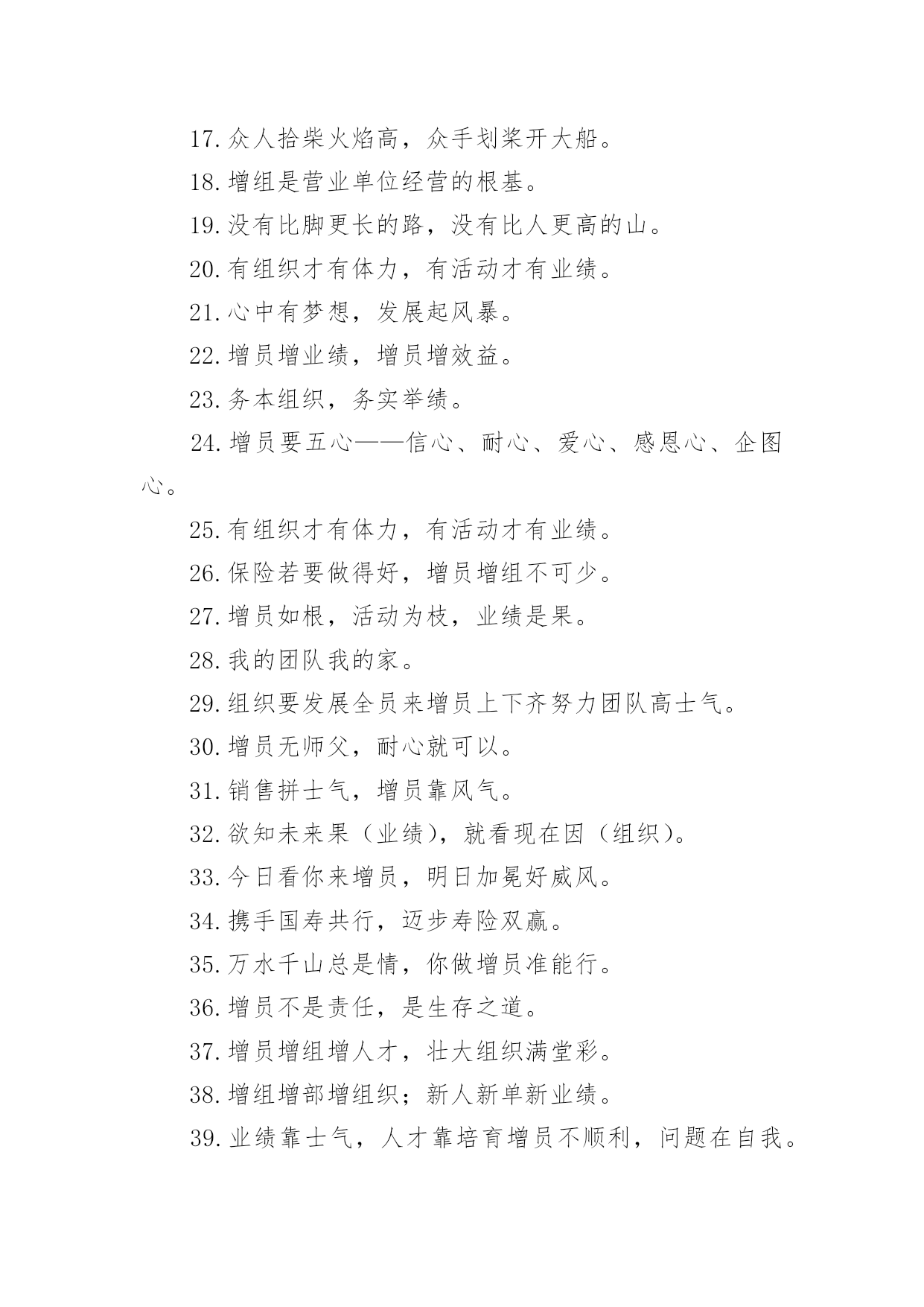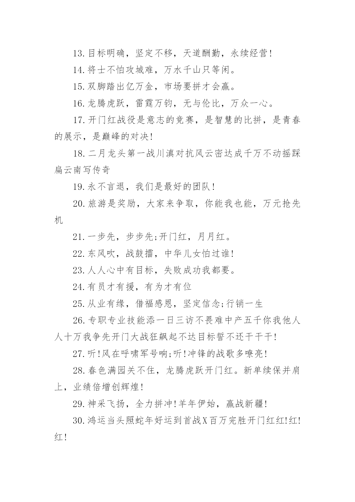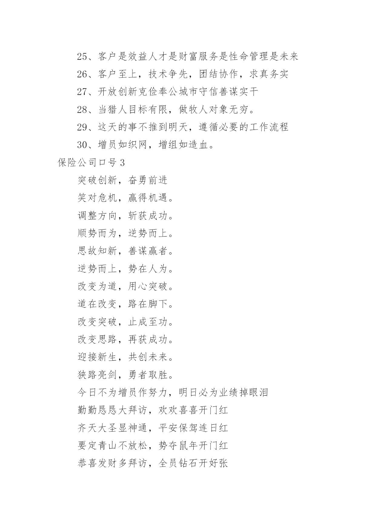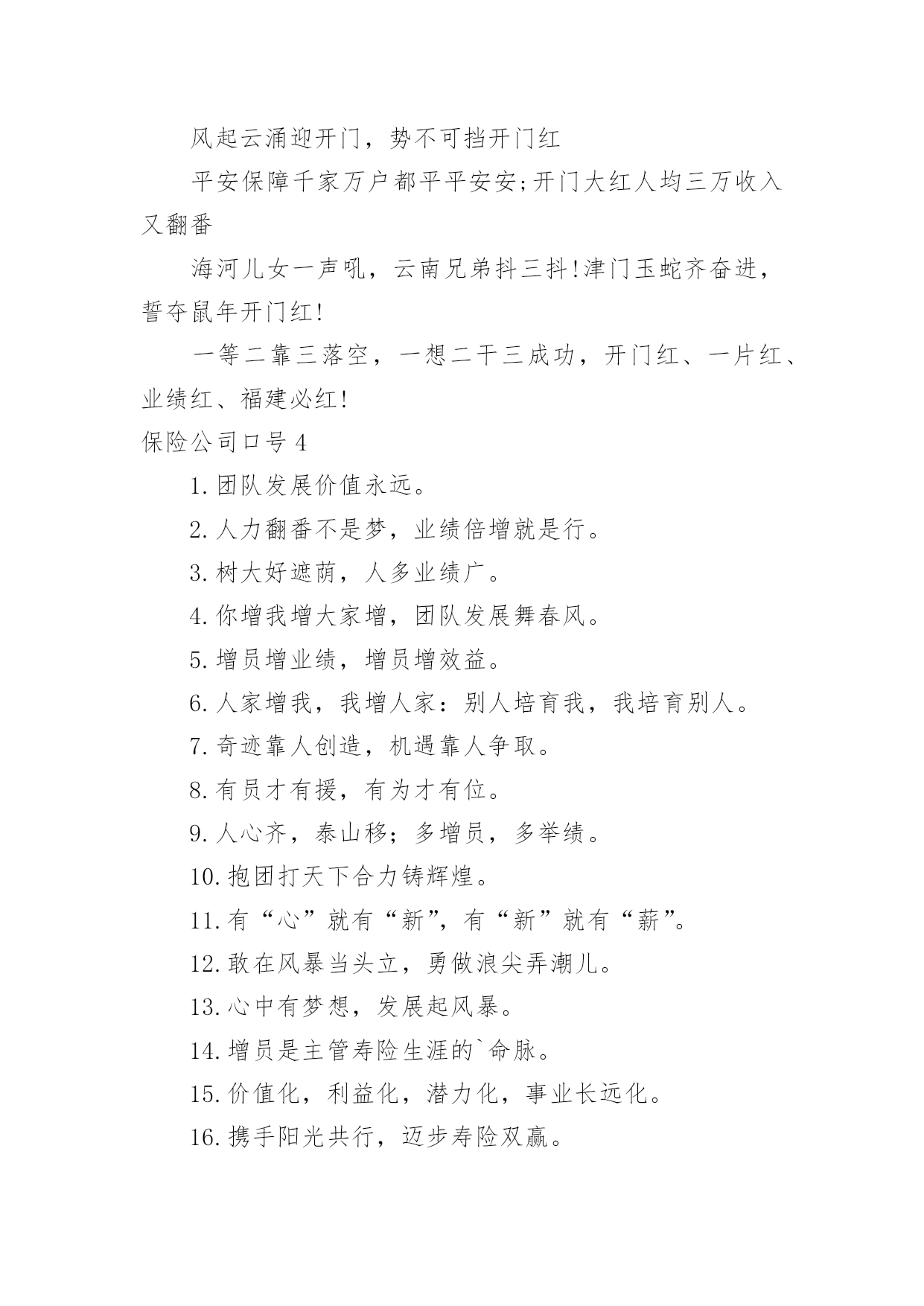 保险公司口号保险公司口号(15篇)在平日的学习、工作和生活里,大家都听说过或者使用过一些比较经典的口号吧,口号对人们的思维是有一定的感性作用的。你还在找寻优秀经典的口号吗?以下是小编精心整理的保险公司口号,仅供参考,希望能够帮助到大家。保险公司口号11.15.单枪匹马人孤势单,招兵买马人多势众。2.你增员我增员,人人增员天地宽3.饮水思源,薪火相传。4.全力以赴向前冲,奋力决战开门红。5.河南儿女一声吼,北京兄弟抖三抖!6.拼抢市场百战多,白刃格斗不退缩。两军对垒勇者胜,中华保险奏凯歌。7.今日不为增员作努力,明日必为业绩掉眼泪8.双脚踏出亿万金,推销要拼才会赢。9.不怕增员难,就怕不增员10.树大枝繁叶茂,人多气足财旺11.我们的队伍像太阳,脚踏着中原的大地,背负着社会的希望,我们是一支不可战胜的力量。12.憋足一口气,拧成一股绳,共圆一个梦13.目标明确,坚定不移,天道酬勤,永续经营!14.将士不怕攻城难,万水千山只等闲。15.双脚踏出亿万金,市场要拼才会赢。16.龙腾虎跃,雷霆万钧,无与伦比,万众一心。17.开门红战役是意志的竞赛,是智慧的比拼,是青春的展示,是巅峰的对决!18.二月龙头第一战川滇对抗风云密达成千万不动摇踩扁云南写传奇19.永不言退,我们是最好的团队!20.旅游是奖励,大家来争取,你能我也能,万元抢先机21.一步先,步步先;开门红,月月红。22.东风吹,战鼓擂,中华儿女怕过谁!23.人人心中有目标,失败成功我都要。24.有员才有援,有为才有位25.从业有缘,借福感恩,坚定信念;行销一生26.专职专业技能添一日三访不畏难中产五千你我他人人十万我争先开门大战狂飙起不达目标誓不还干干干!27.听!风在呼啸军号响;听!冲锋的战歌多嘹亮!28.春色满园关不住,龙腾虎跃开门红。新单续保并肩上,业绩倍增创辉煌!29.神采飞扬,全力拼冲!羊年伊始,赢战新疆!30.鸿运当头照蛇年好运到首战X百万完胜开门红红!红!红!31.攻城掠地何所惧,拼抢市场写传奇!32.奇迹靠人创造,机遇靠人争取33.今天付出,明天收获,全力以赴,事业辉煌!34.他增我,我增你,寿险精英齐努力35.海河儿女一声吼,云南兄弟抖三抖!津门玉蛇齐奋进,誓夺蛇年开门红!36.开门红、一片红、业绩红、中原必红!37.增员、增贤、增人气,经营、发展、促业绩38.快马加鞭抓增员,齐心协力促发展39.全力以赴扞荣誉,踏平陕西展湘魂!40.业绩靠士气,人才靠培育。41.扛起战旗剑出鞘,规模效益一起要。42.新单续保并肩上,业绩倍增创辉煌。43.服务回访辞旧岁,全力举绩贺新春44.挑战就是机会,突破就是成长45.荣耀河南,开门大红!内外同心,上下齐动!46.恭喜发财多拜访,全员破零开好张47.我成长,我晋升,我是亲人的骄傲48.借势渠道专业经营超越梦想北京必胜!49.你增我增大家增,团队发展舞春风。50.众志成城飞越颠峰。开门红,月月红,全年红!51.说到不如做到,要做就做最好。52.新单续保并肩上,业绩倍增创辉煌53.快马加鞭抓增员,齐心协力促发展。54.敢于亮剑,谁与争锋,横扫赛场,唯我称雄。55.敢于亮剑、敢于争锋、敢打大仗、敢打硬仗,主动出击,战之必胜!56.没有比脚更长的路,没有比人更高的山57.齐增员,组织拓展永向前58.长矛锋指渝州府,铁骑扬沙擂军鼓。旌旗猎猎近相问,敢弃功名舍疆土?开门红,战重庆,内蒙必胜!必胜!必胜!59.实实在在增人才,扎扎实实建组织60.春光乍现,拜访争先,客户服务,情义无限61.青春似火,超越自我,放飞梦想,创造辉煌。62.人人心中有目标,失败成功我都要63.稳定市场,重在回访精心打理,休养生息64.因为自信,所以成功!65.风起云涌灵蛇至,势不可挡开门红保险公司口号21、有员千里来相助,育组报答万里情。2、增员是尊重自我,欣赏别人。3、保险若要做得好,增员增组不可少。增员提升战力,增组提升组织力。4、“一个基础,两个实现,三个提高”:以网络为基础;实现企业业务量目标,实现企业人均产值目标;提高企业市场竞争力,提高企业品牌效应,提高员工待遇5、社会企业的发展,离不开你我6、建立南电网络,追求完美生活7、企业发展,服务为本;优质服务,诚信为本8、增员不是考验对方,而是考验咱们是否有潜质使对方成功。9、团结拼搏务实高效10、有木才有材,有人才有财;育才如增财,育才如置产。11、销售拼士气,增员靠风气。12、经营之源靠新秀,成功之本靠报升。13、以人才为根本,以市场为导向,以质量为保证,以服务为宗旨14、得客户者得天下15、增员要五心——信心耐心爱心感恩心企图心。16、办实事求实效,创一流服务品牌,树完美企业形象17、旧强衍新秀,体力愈壮。18、放我的真心在您的手心19、勇于承认错误,敢于承担职责20、持续领悟,自我完善,做事情充分