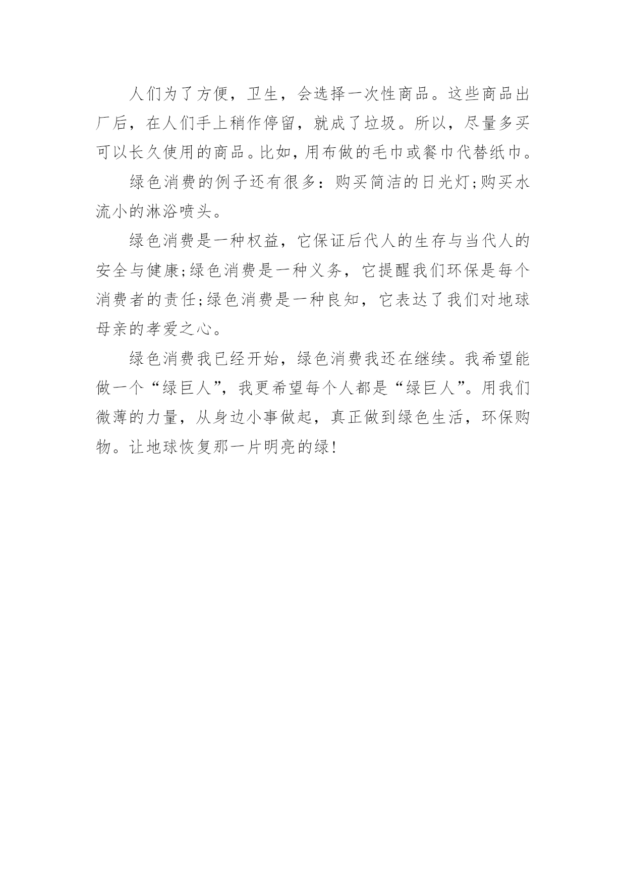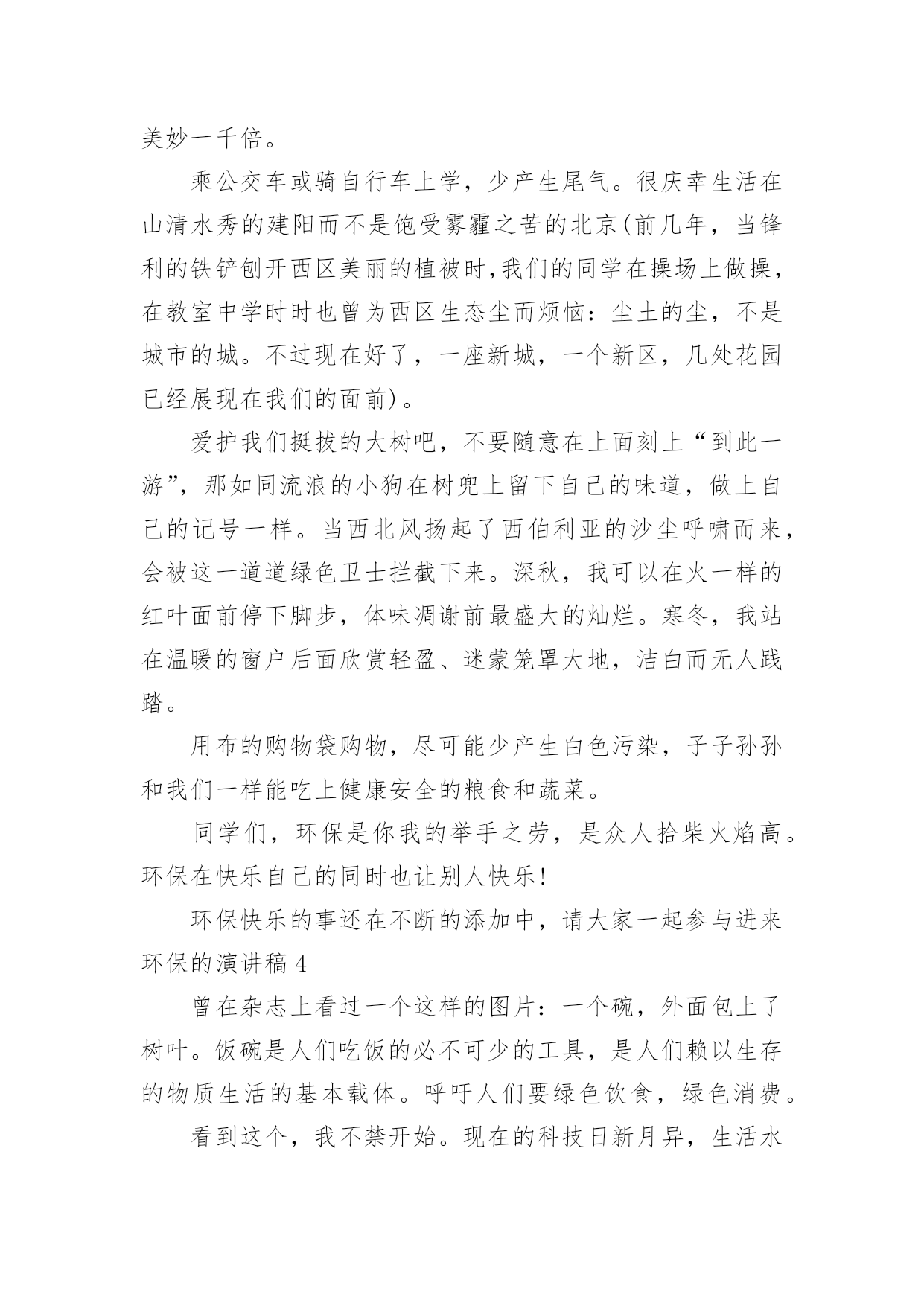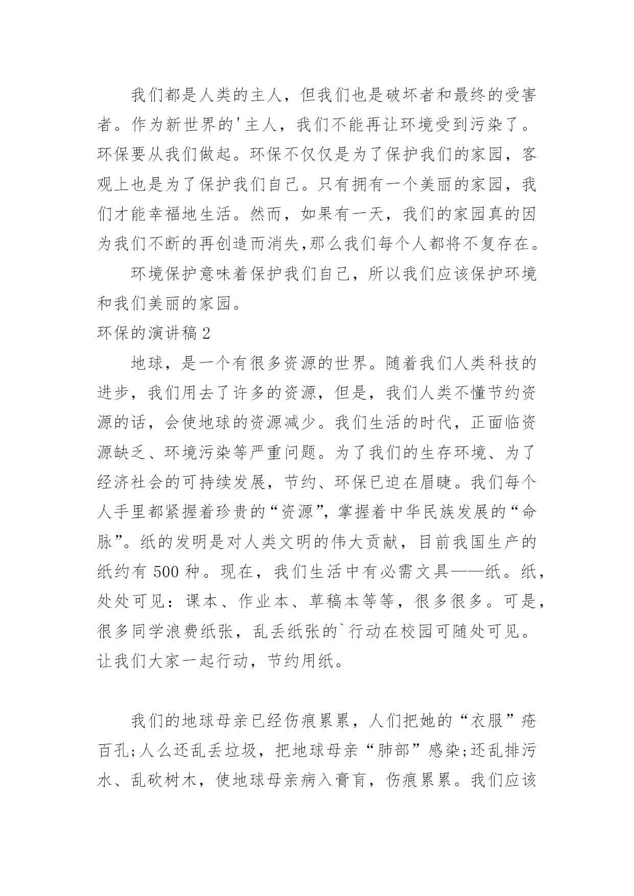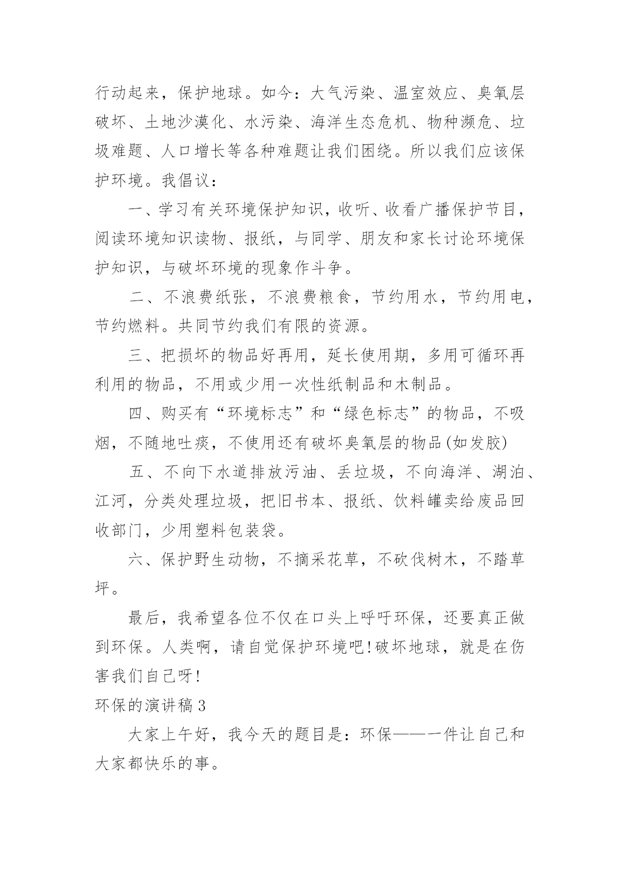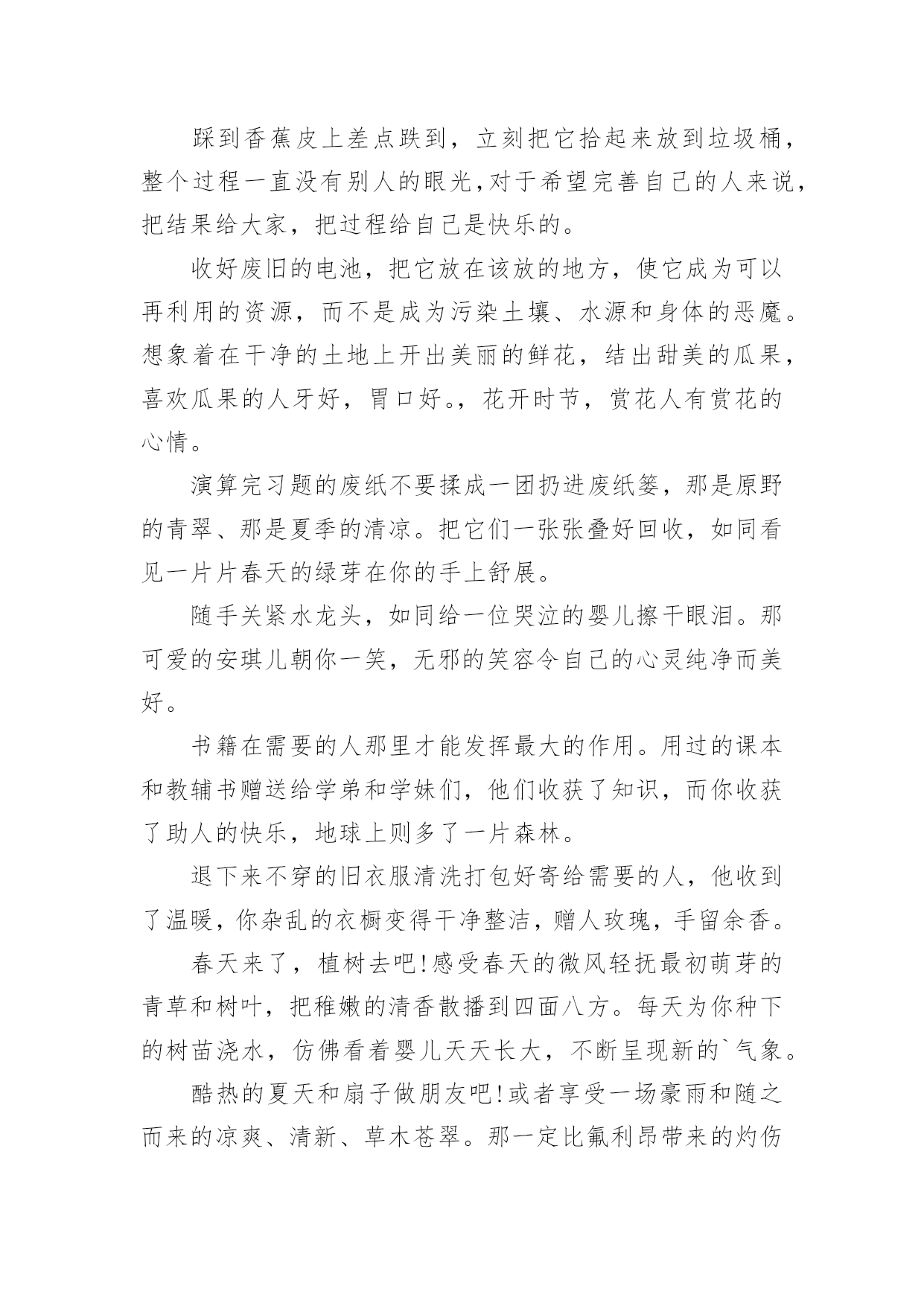 环保的演讲稿环保的演讲稿演讲稿是在一定的场合,面对一定的听众,演讲人围绕着主题讲话的文稿。在现在的社会生活中,我们都可能会用到演讲稿,演讲稿的注意事项有许多,你确定会写吗?以下是小编为大家收集的环保的演讲稿,欢迎阅读,希望大家能够喜欢。环保的演讲稿1保护环境是每个人的责任。从我做起,空气清新!地球上的人越来越多,几千万个家庭。人类必须保护好自己,这样才能在这个世界上活得长久,活得幸福。但是现在人们的生活水平和条件很好,垃圾越来越多,比如塑料袋、果皮、饭盒、废纸等等。但是没有人可以捡手边的垃圾。为什么街道旁边有垃圾桶?这是提醒人们不要随便乱扔垃圾,而是把垃圾扔进垃圾桶。然而,许多人喜欢到处扔垃圾,这不仅损害了我们家庭的形象,而且使地球再次受到污染。还有我妈工作的黄酮厂,锅炉房的烟囱里冒出滚滚浓烟,遮天蔽日。我们的空气可以免受污染吗?各个工厂的污水又脏又臭,都流到我们这条长沟里。原来清澈见底的水,现在又黑又脏的水,连伸手进去都不敢。有人喝水怎么办?现在河里的鱼虾早就消失得无影无踪了。我们都是人类的主人,但我们也是破坏者和最终的受害者。作为新世界的'主人,我们不能再让环境受到污染了。环保要从我们做起。环保不仅仅是为了保护我们的家园,客观上也是为了保护我们自己。只有拥有一个美丽的家园,我们才能幸福地生活。然而,如果有一天,我们的家园真的因为我们不断的再创造而消失,那么我们每个人都将不复存在。环境保护意味着保护我们自己,所以我们应该保护环境和我们美丽的家园。环保的演讲稿2地球,是一个有很多资源的世界。随着我们人类科技的进步,我们用去了许多的资源,但是,我们人类不懂节约资源的话,会使地球的资源减少。我们生活的时代,正面临资源缺乏、环境污染等严重问题。为了我们的生存环境、为了经济社会的可持续发展,节约、环保已迫在眉睫。我们每个人手里都紧握着珍贵的“资源”,掌握着中华民族发展的“命脉”。纸的发明是对人类文明的伟大贡献,目前我国生产的纸约有500种。现在,我们生活中有必需文具——纸。纸,处处可见:课本、作业本、草稿本等等,很多很多。可是,很多同学浪费纸张,乱丢纸张的`行动在校园可随处可见。让我们大家一起行动,节约用纸。我们的地球母亲已经伤痕累累,人们把她的“衣服”疮百孔;人么还乱丢垃圾,把地球母亲“肺部”感染;还乱排污水、乱砍树木,使地球母亲病入膏肓,伤痕累累。我们应该行动起来,保护地球。如今:大气污染、温室效应、臭氧层破坏、土地沙漠化、水污染、海洋生态危机、物种濒危、垃圾难题、人口增长等各种难题让我们困绕。所以我们应该保护环境。我倡议:一、学习有关环境保护知识,收听、收看广播保护节目,阅读环境知识读物、报纸,与同学、朋友和家长讨论环境保护知识,与破坏环境的现象作斗争。二、不浪费纸张,不浪费粮食,节约用水,节约用电,节约燃料。共同节约我们有限的资源。三、把损坏的物品好再用,延长使用期,多用可循环再利用的物品,不用或少用一次性纸制品和木制品。四、购买有“环境标志”和“绿色标志”的物品,不吸烟,不随地吐痰,不使用还有破坏臭氧层的物品(如发胶)五、不向下水道排放污油、丢垃圾,不向海洋、湖泊、江河,分类处理垃圾,把旧书本、报纸、饮料罐卖给废品回收部门,少用塑料包装袋。六、保护野生动物,不摘采花草,不砍伐树木,不踏草坪。最后,我希望各位不仅在口头上呼吁环保,还要真正做到环保。人类啊,请自觉保护环境吧!破坏地球,就是在伤害我们自己呀!环保的演讲稿3大家上午好,我今天的题目是:环保——一件让自己和大家都快乐的事。踩到香蕉皮上差点跌到,立刻把它拾起来放到垃圾桶,整个过程一直没有别人的眼光,对于希望完善自己的人来说,把结果给大家,把过程给自己是快乐的。收好废旧的电池,把它放在该放的地方,使它成为可以再利用的资源,而不是成为污染土壤、水源和身体的恶魔。想象着在干净的土地上开出美丽的鲜花,结出甜美的瓜果,喜欢瓜果的人牙好,胃口好。,花开时节,赏花人有赏花的心情。演算完习题的废纸不要揉成一团扔进废纸篓,那是原野的青翠、那是夏季的清凉。把它们一张张叠好回收,如同看见一片片春天的绿芽在你的手上舒展。随手关紧水龙头,如同给一位哭泣的婴儿擦干眼泪。那可爱的安琪儿朝你一笑,无邪的笑容令自己的心灵纯净而美好。书籍在需要的人那里才能发挥最大的作用。用过的课本和教辅书赠送给学弟和学妹们,他们收获了知识,而你收获了助人的快乐,地球上则多了一片森林。退下来不穿的旧衣服清洗打包好寄给需要的人,他收到了温暖,你杂乱的衣橱变得干净整洁,赠人玫瑰,手留余香。春天来了,植树去吧!感受春天的微风轻抚最初萌芽的青草和树叶,把稚嫩的清香散播到四面八方。每天为你种下的树苗浇水,仿佛看着婴儿天天长大,不断呈现新的`气象。酷热的夏天和扇子做朋友吧!或者享受一场豪雨和随之而来的凉爽、清新、草木苍翠。那一定比