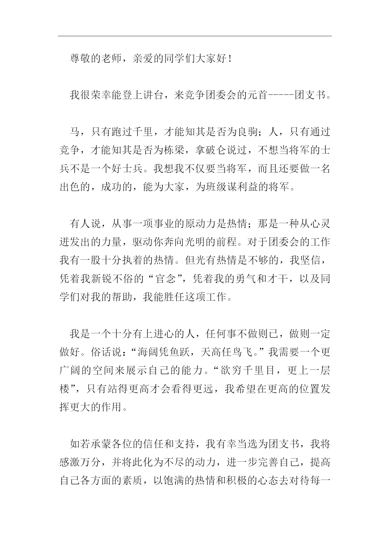 2018研究生团支书竞选演讲稿篇一尊敬的老师、亲爱的同学们:大家下午好!很高兴能登上讲台,对大家说出我由来已久的愿望:我想竞选团支部书记。我有足够的信心,所以才会站在那里,这种自信或许是源于我喜欢坐在钢琴凳上,聆听那从我手中流泻的音符;也或许是源于我喜欢静静地坐在椅子上,用我手中的画笔去描绘我所憧憬的完美……但不管是因为什么,我都因为我能站着里而倍感自豪!我以前荣获过“奥林匹克英语竞赛”二等奖、钢琴八级证书、美术三级证书等荣誉。在小学,我也曾担任过大队干部、班长、学习委员等职务,有足够的经验。加上成绩优异,还有一份我自我独有的真诚,我相信我能够胜任团支部书记一职,并且经过几次团支书会议,对学校团支部的工作也有了必须的了解。如果我当选,我将做到以下几点:一、努力学习,进一步加强自身的修养,努力提高和完善自身的素质;二、待人正直,公正办事;三、严于律己,宽以待人;四、认真加强各项课外活动,使同学们不单单只有成绩的提高,还要在学校的文体活动上有突出表现。如果我有幸胜任,我要做的第一件事就是与各位代表共同召开一次会议,全面听取他们的意见与推荐,放下权利,实行承包职责制。自始自终都遵循“一切为大家”的原则。与他们共同把本班打造成一个优秀的班群众,不论是在学习生活或是文体活动上,都展示出七班独有的风采。可能大家会对我这么一个小姑娘儿的豪言壮语感到质疑。可我却有足够的信心,因为我看到了我们七班同学的优点:可能学习不好,但却明白自我班的同学不能让别人欺负;可能在文体活动上欠缺,但明白努力给班级争成绩;可能自身修养不够,但一向在努力改变……这些,我们七班的同学有,也只有我们七班的同学有。可能此刻“七班”在老师同学眼中并不是很出色的,但我却以我的班级引以为傲,因为我明白这种不出色只是此刻,也只可能是此刻,我们还有两年半的时间能够去改变,我们必须能把“七班”打造成一个优秀的班群众,而我,必须会至始至终地带领大家向这个目标坚定地走下去!必须会!!多谢大家!篇二尊敬的老师,亲爱的同学们大家好!我很荣幸能登上讲台,来竞争团委会的元首-----团支书。马,只有跑过千里,才能知其是否为良驹;人,只有通过竞争,才能知其是否为栋梁,拿破仑说过,不想当将军的士兵不是一个好士兵。我想我不仅要当将军,而且还要做一名出色的,成功的,能为大家,为班级谋利益的将军。有人说,从事一项事业的原动力是热情;那是一种从心灵迸发出的力量,驱动你奔向光明的前程。对于团委会的工作我有一股十分执着的热情。但光有热情是不够的,我坚信,凭着我新锐不俗的“官念”,凭着我的勇气和才干,以及同学们对我的帮助,我能胜任这项工作。我是一个十分有上进心的人,任何事不做则已,做则一定做好。俗话说:“海阔凭鱼跃,天高任鸟飞。”我需要一个更广阔的空间来展示自己的能力。“欲穷千里目,更上一层楼”,只有站得更高才会看得更远,我希望在更高的位置发挥更大的作用。如若承蒙各位的信任和支持,我有幸当选为团支书,我将感激万分,并将此化为不尽的动力,进一步完善自己,提高自己各方面的素质,以饱满的热情和积极的心态去对待每一件事:在工作中尽职尽责,大胆务实,勇于创新,锐意进取,决不盲目从事,要有计划的工作。假如我当选,我将正确处理好学习,工作,生活三者之间的关系。吃苦耐劳,集思广益,模范带头,处处以身作则,不断提高学习和工作能力,保证学习不掉队,服务工作不落空,抓住机遇无愧于自己,无愧于各位,莫让年华付水流……假如我当选,我会虚心到向别人学习;要进一步的广纳贤言,做到有错就改,有好的意见就接受,同时坚持自己的原则。我相信,世事洞明皆学问,人情练达即文章。我有信心承担工作任务,有决心搞好学习和工作。我虽然不能像某些名产品那样管用几十年,但管用个三,五年我想是绝对没问题的。我知道,再多灿烂的话语也只不过是一瞬间的智慧与*,朴实的行动才是开在成功之路上的鲜花。如果我当选的话一定言必信,行必果。希望以上所说,能让大家对我有更多了解,也希望各位同学能够支持我,请为我投上你最诚挚的一票。最后,再次感谢各位给我这个难得的机会,感谢同学们对我的支持和鼓励。