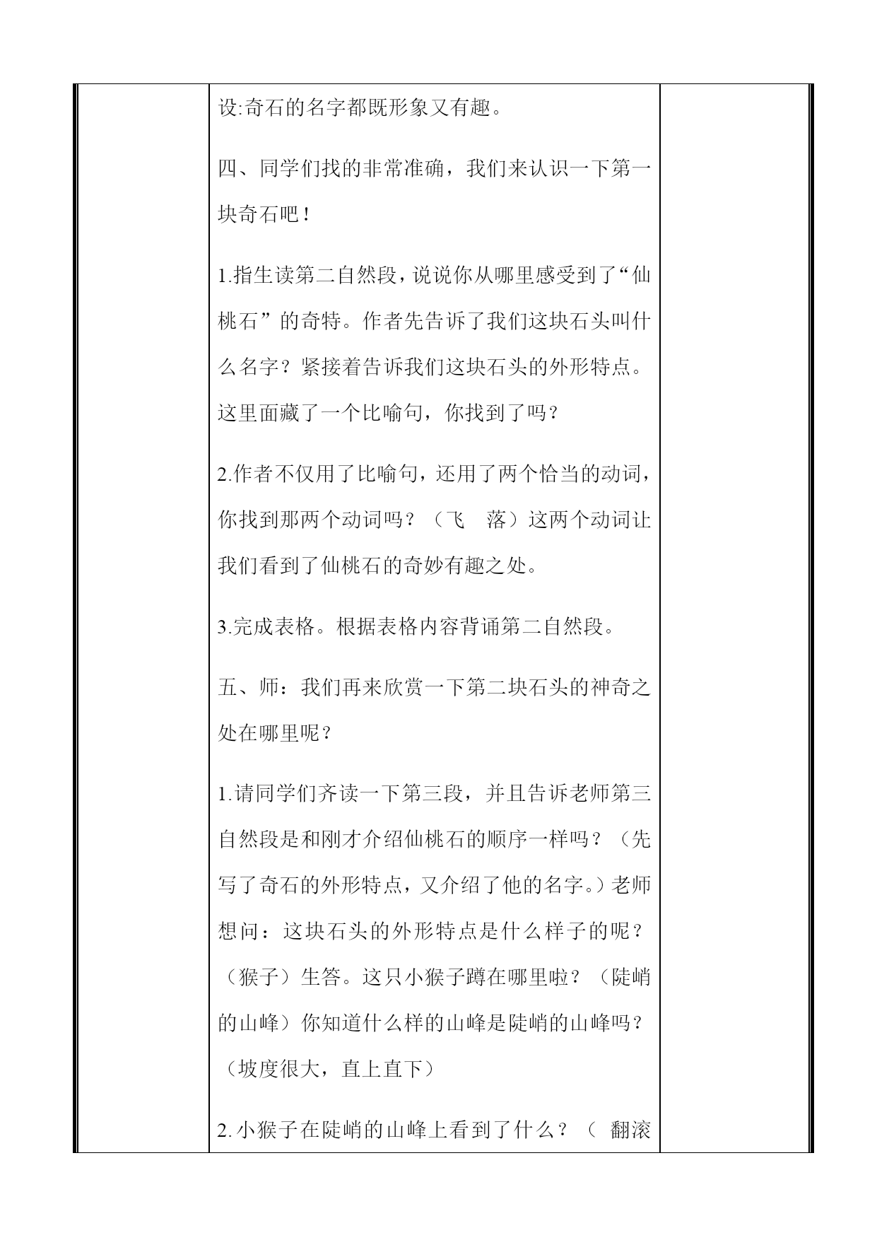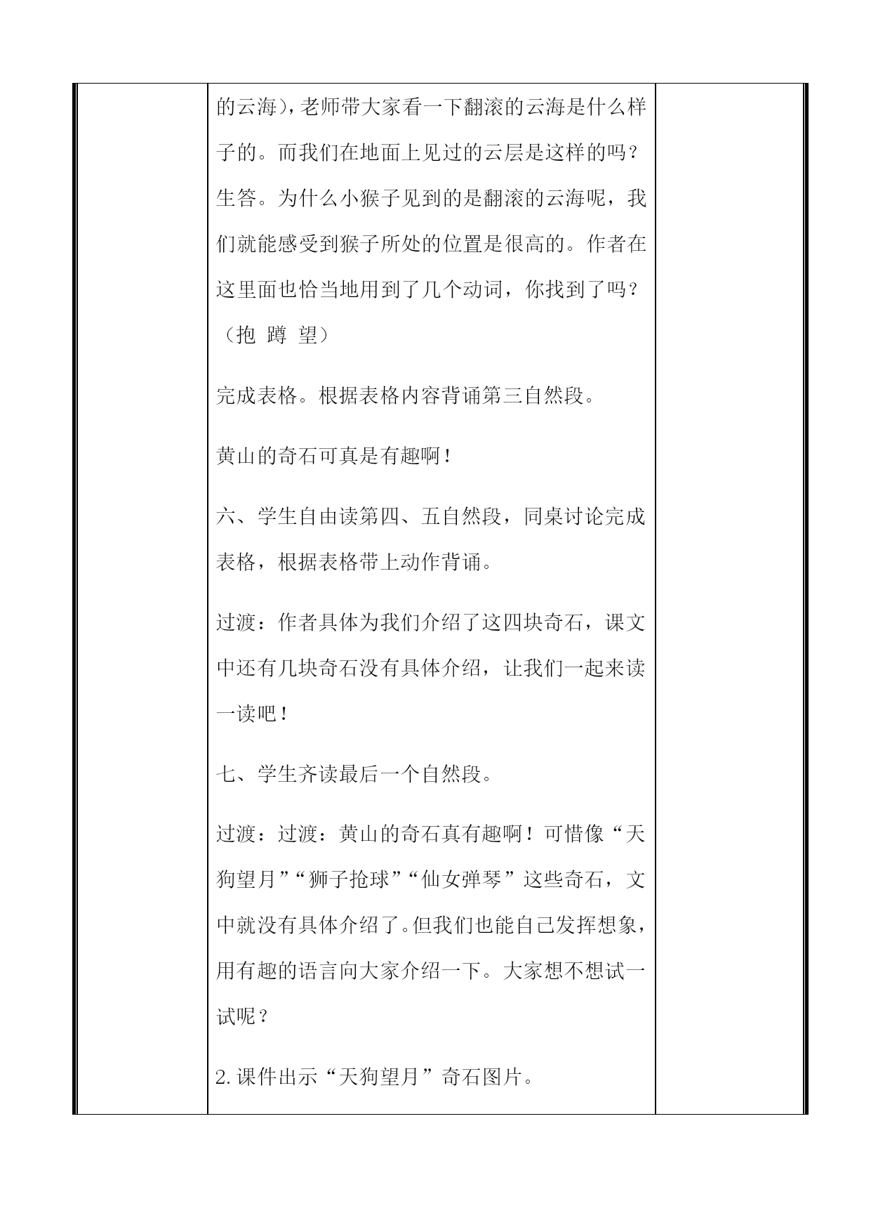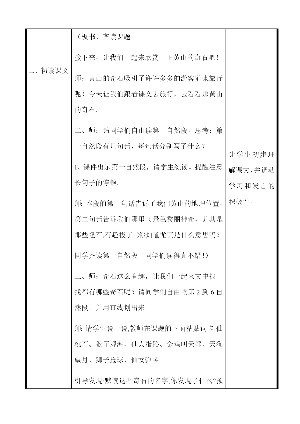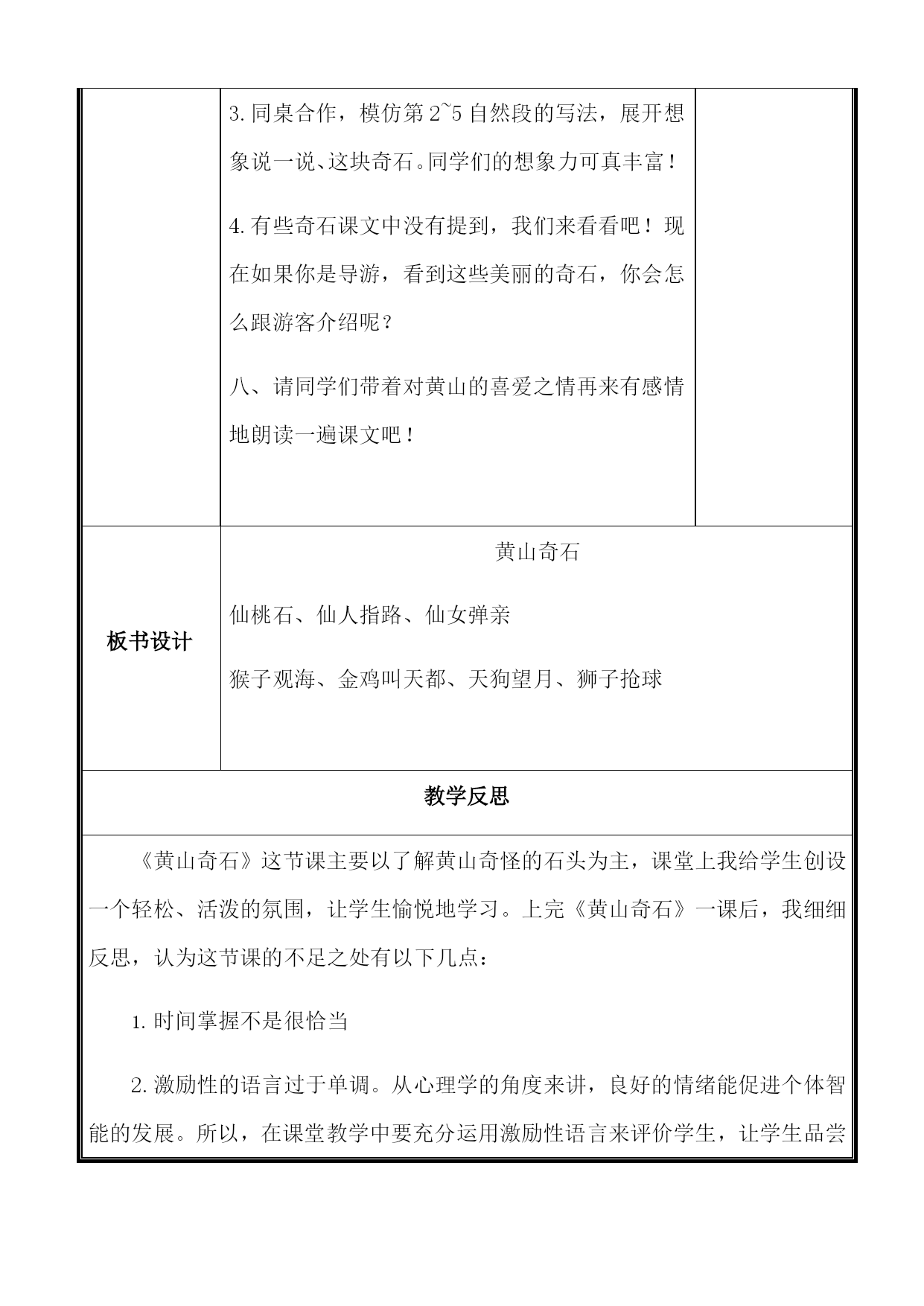 小学部“打造智慧团队创建品质课堂”主题教学展示微型课教学设计教师姓名**学科语文课题黄山奇石年班二年四班教学目标1、正确、流利、有感情地朗读课文。2、背诵第2到5自然段。3、能用积累的词语说一处景物,仿照课文的句子,用“像”说说图片中的石头。教学重点理解课文,背诵第2到5自然段。教学难点理解课文,感受祖国大好景色。教学准备多媒体课件。教学流程设计教学环节教学活动设计意图一、创设情境,导入新课初读课文一、师:“奇石”你认为什么样的石头才是奇石呢?(奇怪的石头、神奇的、奇特的、奇妙的.....)师:老师知道这样一个地方,那里有很多不常见的、奇特的石头,人们还为这些奇石起了生动形象的名字,到底是哪里呢?我们一起走进这一课。(板书)齐读课题。接下来,让我们一起来欣赏一下黄山的奇石吧!师:黄山的奇石吸引了许许多多的游客前来旅行呢!今天让我们跟着课文去旅行,去看看那黄山的奇石。二、师:请同学们自由读第一自然段,思考:第一自然段有几句话,每句话分别写了什么?课件出示第一自然段,请学生练读。提醒注意长句子的停顿。师:本段的第一句话告诉了我们黄山的地理位置,第二句话告诉我们那里(景色秀丽神奇,尤其是那些怪石,有趣极了。)你知道尤其是什么意思吗?同学齐读第一自然段(同学们读得真不错!)三、师:奇石这么有趣,让我们一起来文中找一找都有哪些奇石呢?请同学们自由读第2到6自然段,并用直线划出来。师:请学生说一说,教师在课题的下面粘贴词卡:仙桃石、猴子观海、仙人指路、金鸡叫天都、天狗望月、狮子抢球、仙女弹琴。引导发现:默读这些奇石的名字,你发现了什么?预设:奇石的名字都既形象又有趣。四、同学们找的非常准确,我们来认识一下第一块奇石吧!1.指生读第二自然段,说说你从哪里感受到了“仙桃石”的奇特。作者先告诉了我们这块石头叫什么名字?紧接着告诉我们这块石头的外形特点。这里面藏了一个比喻句,你找到了吗?2.作者不仅用了比喻句,还用了两个恰当的动词,你找到那两个动词吗?(飞落)这两个动词让我们看到了仙桃石的奇妙有趣之处。3.完成表格。根据表格内容背诵第二自然段。五、师:我们再来欣赏一下第二块石头的神奇之处在哪里呢?1.请同学们齐读一下第三段,并且告诉老师第三自然段是和刚才介绍仙桃石的顺序一样吗?(先写了奇石的外形特点,又介绍了他的名字。)老师想问:这块石头的外形特点是什么样子的呢?(猴子)生答。这只小猴子蹲在哪里啦?(陡峭的山峰)你知道什么样的山峰是陡峭的山峰吗?(坡度很大,直上直下)2.小猴子在陡峭的山峰上看到了什么?(翻滚的云海),老师带大家看一下翻滚的云海是什么样子的。而我们在地面上见过的云层是这样的吗?生答。为什么小猴子见到的是翻滚的云海呢,我们就能感受到猴子所处的位置是很高的。作者在这里面也恰当地用到了几个动词,你找到了吗?(抱蹲望)完成表格。根据表格内容背诵第三自然段。黄山的奇石可真是有趣啊!六、学生自由读第四、五自然段,同桌讨论完成表格,根据表格带上动作背诵。过渡:作者具体为我们介绍了这四块奇石,课文中还有几块奇石没有具体介绍,让我们一起来读一读吧!七、学生齐读最后一个自然段。过渡:过渡:黄山的奇石真有趣啊!可惜像“天狗望月”“狮子抢球”“仙女弹琴”这些奇石,文中就没有具体介绍了。但我们也能自己发挥想象,用有趣的语言向大家介绍一下。大家想不想试一试呢?2.课件出示“天狗望月”奇石图片。3.同桌合作,模仿第2~5自然段的写法,展开想象说一说、这块奇石。同学们的想象力可真丰富!4.有些奇石课文中没有提到,我们来看看吧!现在如果你是导游,看到这些美丽的奇石,你会怎么跟游客介绍呢?八、请同学们带着对黄山的喜爱之情再来有感情地朗读一遍课文吧!利用生活情景导入新课,激发学生学习兴趣。让学生初步理解课文,并调动学习和发言的积极性。板书设计黄山奇石仙桃石、仙人指路、仙女弹亲猴子观海、金鸡叫天都、天狗望月、狮子抢球教学反思《黄山奇石》这节课主要以了解黄山奇怪的石头为主,课堂上我给学生创设一个轻松、活泼的氛围,让学生愉悦地学习。上完《黄山奇石》一课后,我细细反思,认为这节课的不足之处有以下几点:时间掌握不是很恰当2.激励性的语言过于单调。从心理学的角度来讲,良好的情绪能促进个体智能的发展。所以,在课堂教学中要充分运用激励性语言来评价学生,让学生品尝成功的喜悦。这节课,虽说课堂气氛非常活跃,但我表现的不够机智幽默。3.课堂教学过渡语还有待于提高。在上环节教学内容结束后,应用简明扼要的语言,择其重点作一小结,然后过渡到下一环节施教内容。这类过渡语的特点是,能把教学的重点再现出来,给学生