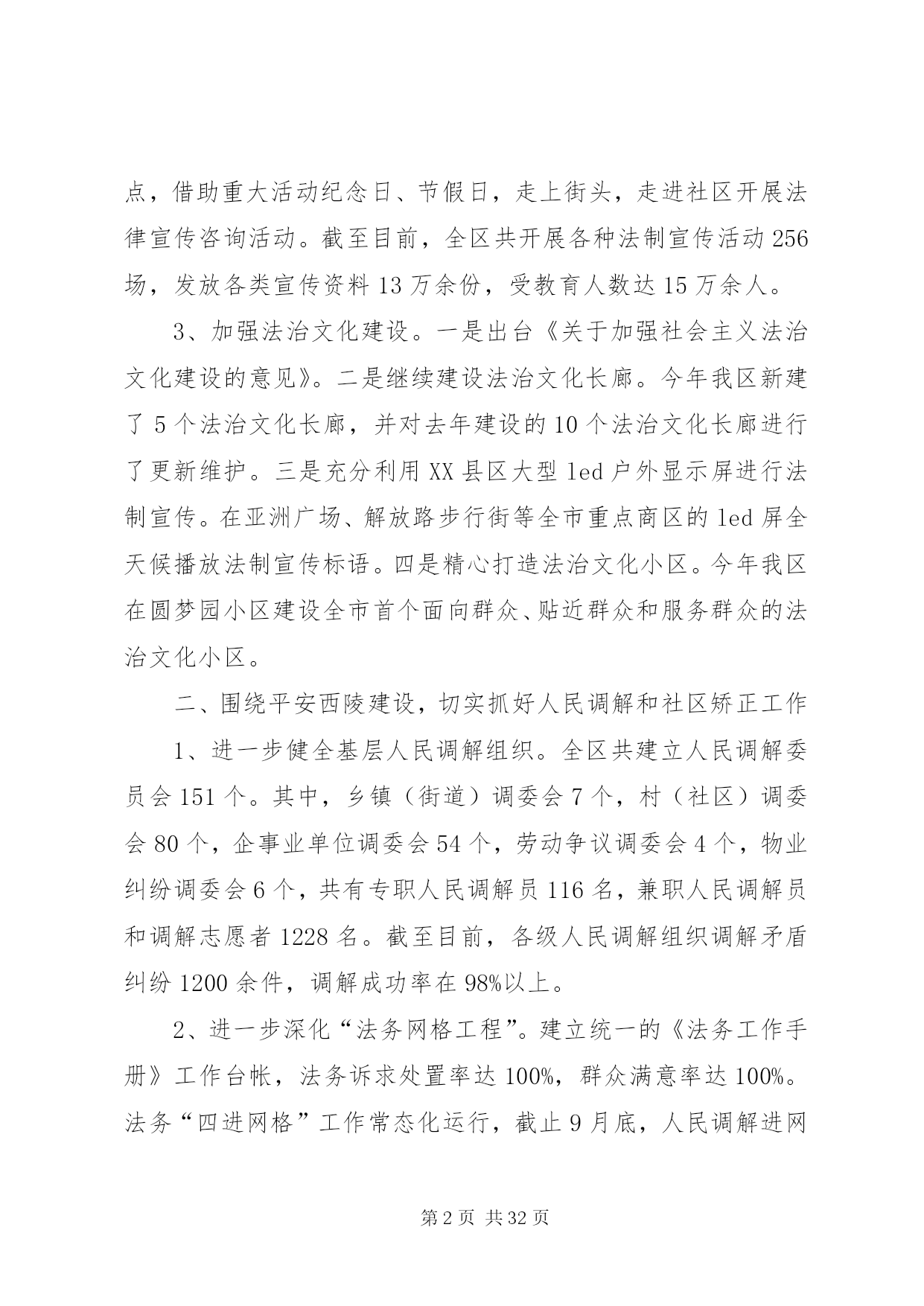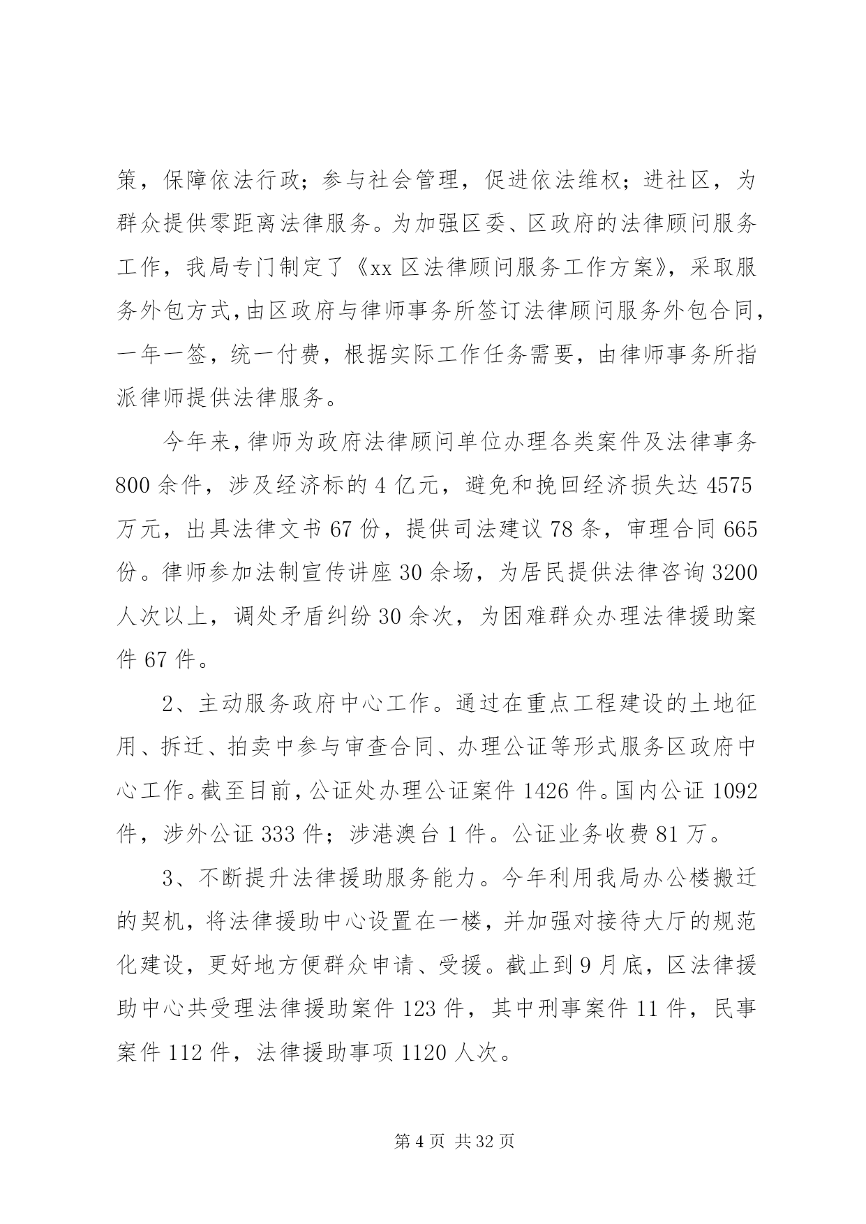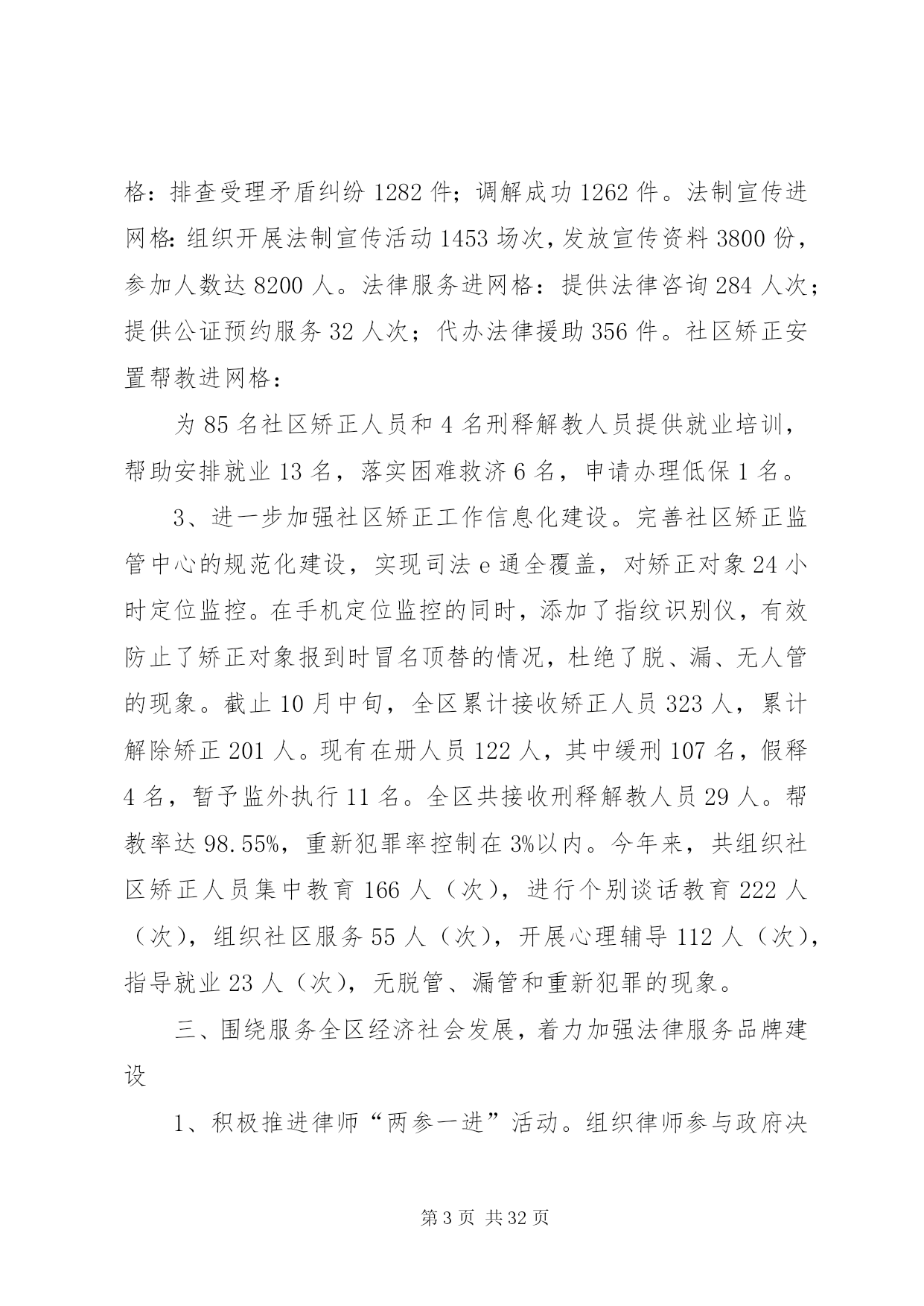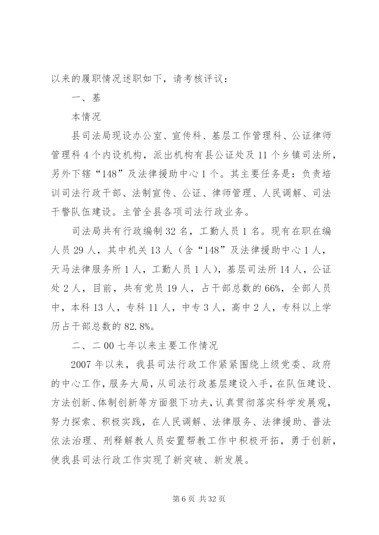 第PAGE\*Arabic\*MERGEFORMAT32页共NUMPAGES\*MERGEFORMAT32页区司法局班子述职报告2014年,区司法局深入贯彻落实十八大精神,按照区委、区政府的工作大局要求,以服务首善之区建设为主线,以提升队伍能力素质为保障,突出重点、创新突破,全面提升司法行政工作现代化水平。今年,区依法治区领导小组办公室被表彰为全省“六五”普法中期先进单位,区司法局被表彰为全市“六五”普法中期先进集体。一、围绕法治西陵建设,深入推进普法依法治理工作1、开展法治创建活动。对全区“六五”普法中期先进集体、先进个人和首批“全区法治单位创建活动先进集体”分别进行了表彰。2、深入开展“法律六进”活动。一是以领导干部学法用法为重点,结合群众路线教育实践活动,采用每周四夜学,周日全天学习,强化法律法规学习。5月23日,省司法厅候江波主任为全区中心组成员及各单位班子成员作了《法治建设的理念研究与实践探索》的专题讲座。二是以企业经营管理人员法制教育为重点,制定下发《关于进一步加强企业经营管理人员学法用法工作的实施意见》,为全区重点企业配备法律顾问,促进依法经营。三是以青少年法制教育为重点,打造“春芽工程”法制宣传教育品牌。4月29日,在三峡中专开展“送法进校园,关爱青少年”活动,向同学们赠送500本普法读本。四是以服务社区居民为重点,借助重大活动纪念日、节假日,走上街头,走进社区开展法律宣传咨询活动。截至目前,全区共开展各种法制宣传活动256场,发放各类宣传资料13万余份,受教育人数达15万余人。3、加强法治文化建设。一是出台《关于加强社会主义法治文化建设的意见》。二是继续建设法治文化长廊。今年我区新建了5个法治文化长廊,并对去年建设的10个法治文化长廊进行了更新维护。三是充分利用XX县区大型led户外显示屏进行法制宣传。在亚洲广场、解放路步行街等全市重点商区的led屏全天候播放法制宣传标语。四是精心打造法治文化小区。今年我区在圆梦园小区建设全市首个面向群众、贴近群众和服务群众的法治文化小区。二、围绕平安西陵建设,切实抓好人民调解和社区矫正工作1、进一步健全基层人民调解组织。全区共建立人民调解委员会151个。其中,乡镇(街道)调委会7个,村(社区)调委会80个,企事业单位调委会54个,劳动争议调委会4个,物业纠纷调委会6个,共有专职人民调解员116名,兼职人民调解员和调解志愿者1228名。截至目前,各级人民调解组织调解矛盾纠纷1200余件,调解成功率在98%以上。2、进一步深化“法务网格工程”。建立统一的《法务工作手册》工作台帐,法务诉求处置率达100%,群众满意率达100%。法务“四进网格”工作常态化运行,截止9月底,人民调解进网格:排查受理矛盾纠纷1282件;调解成功1262件。法制宣传进网格:组织开展法制宣传活动1453场次,发放宣传资料3800份,参加人数达8200人。法律服务进网格:提供法律咨询284人次;提供公证预约服务32人次;代办法律援助356件。社区矫正安置帮教进网格:为85名社区矫正人员和4名刑释解教人员提供就业培训,帮助安排就业13名,落实困难救济6名,申请办理低保1名。3、进一步加强社区矫正工作信息化建设。完善社区矫正监管中心的规范化建设,实现司法e通全覆盖,对矫正对象24小时定位监控。在手机定位监控的同时,添加了指纹识别仪,有效防止了矫正对象报到时冒名顶替的情况,杜绝了脱、漏、无人管的现象。截止10月中旬,全区累计接收矫正人员323人,累计解除矫正201人。现有在册人员122人,其中缓刑107名,假释4名,暂予监外执行11名。全区共接收刑释解教人员29人。帮教率达98.55%,重新犯罪率控制在3%以内。今年来,共组织社区矫正人员集中教育166人(次),进行个别谈话教育222人(次),组织社区服务55人(次),开展心理辅导112人(次),指导就业23人(次),无脱管、漏管和重新犯罪的现象。三、围绕服务全区经济社会发展,着力加强法律服务品牌建设1、积极推进律师“两参一进”活动。组织律师参与政府决策,保障依法行政;参与社会管理,促进依法维权;进社区,为群众提供零距离法律服务。为加强区委、区政府的法律顾问服务工作,我局专门制定了《xx区法律顾问服务工作方案》,采取服务外包方式,由区政府与律师事务所签订法律顾问服务外包合同,一年一签,统一付费,根据实际工作任务需要,由律师事务所指派律师提供法律服务。今年来,律师为政府法律顾问单位办理各类案件及法律事务800余件,涉及经济标的4亿元,避免和挽回经济损失达4575万元,出具法律文书67份,提供司法建议78条,审理合同665份。律师参加法制宣传讲座30余场,为居民提供法律咨询3200人次以上,调处矛盾纠纷30余次,为困难群众办理法律援助案件67