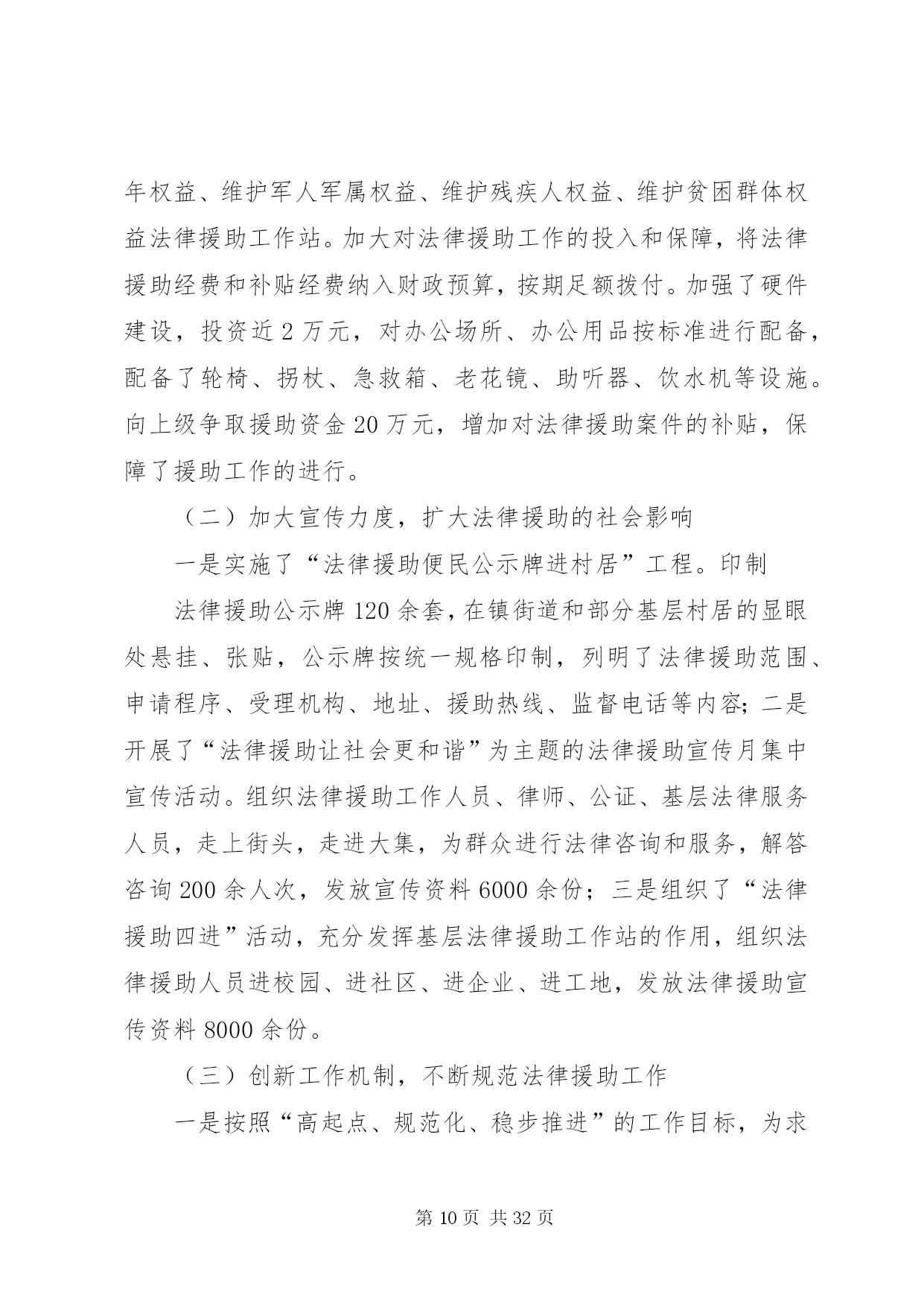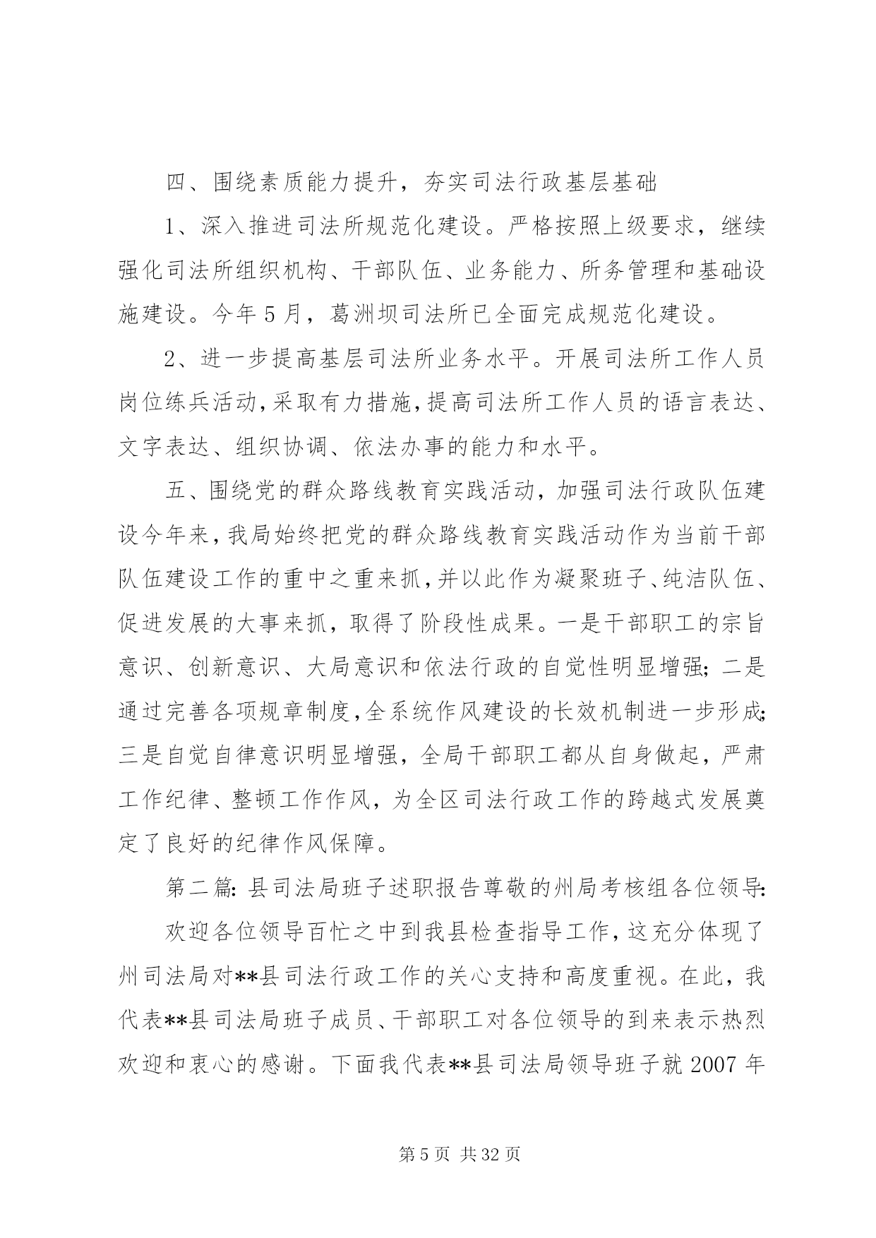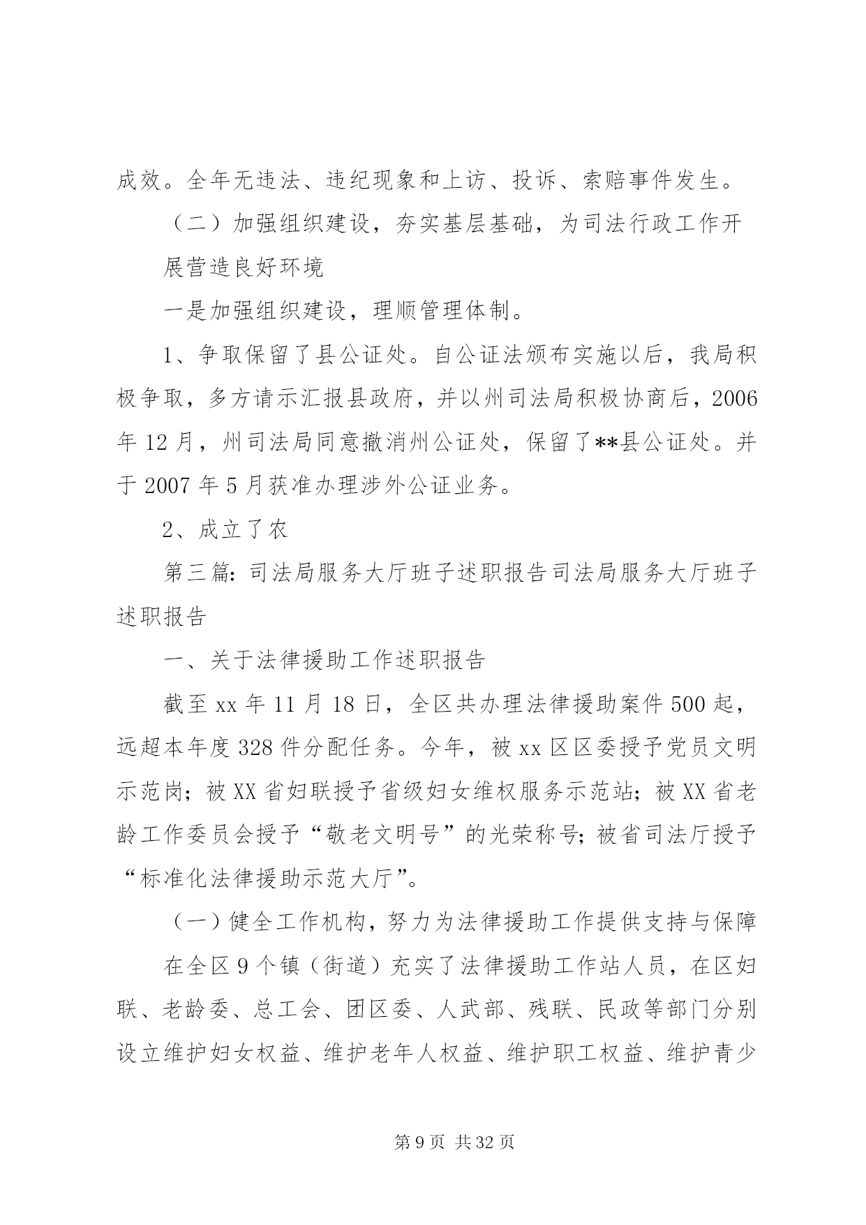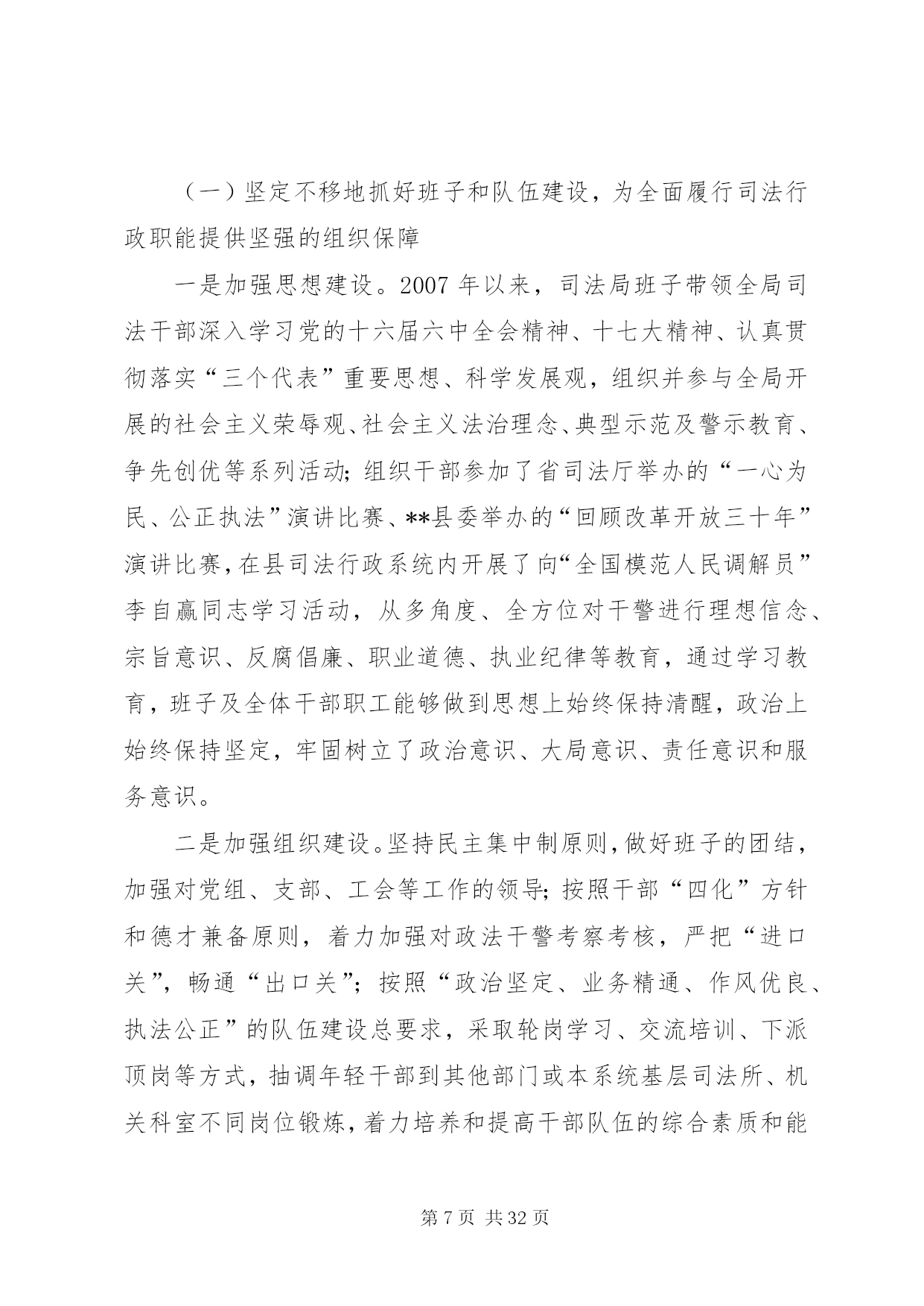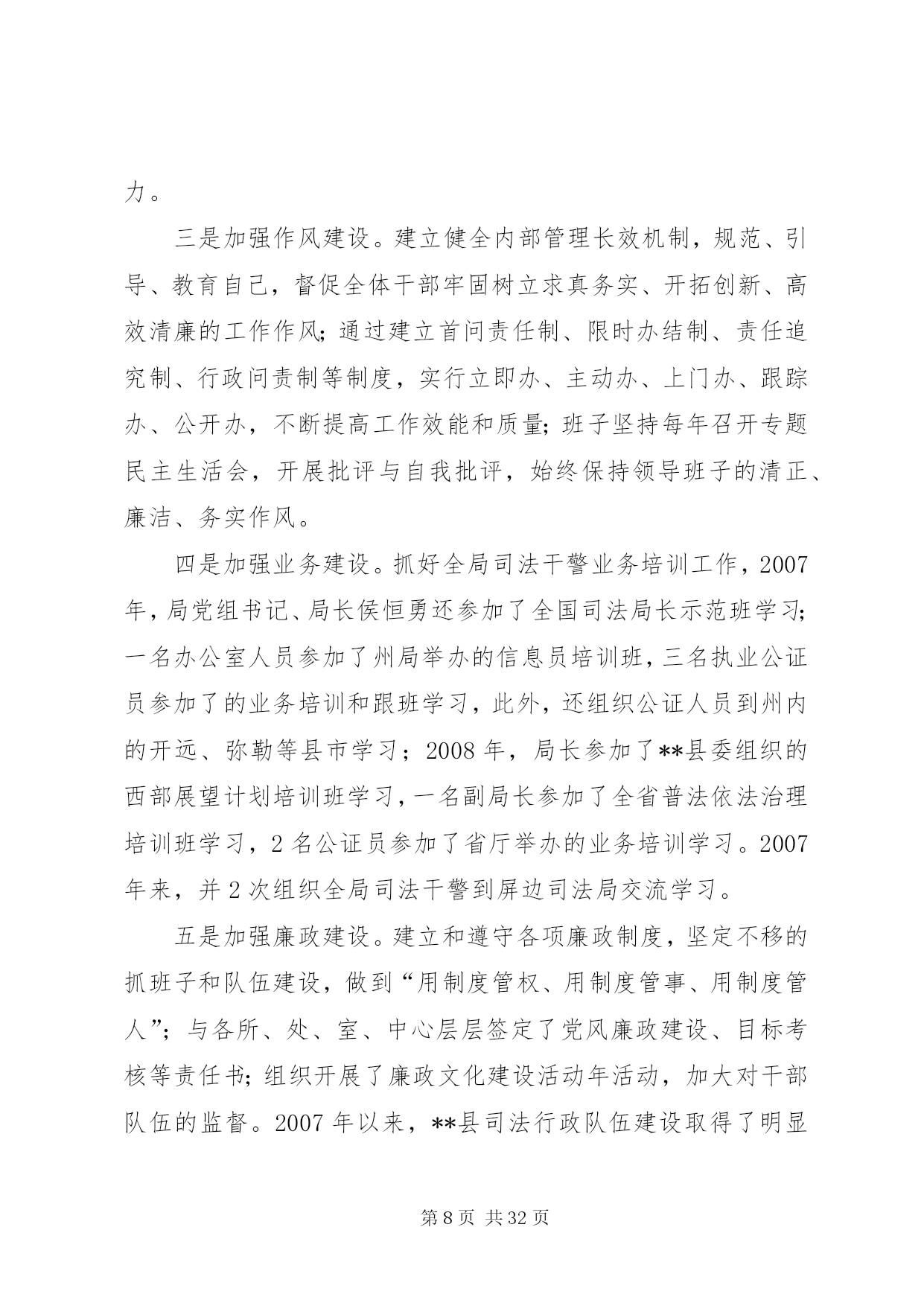 第PAGE\*Arabic\*MERGEFORMAT32页共NUMPAGES\*MERGEFORMAT32页区司法局班子述职报告2014年,区司法局深入贯彻落实十八大精神,按照区委、区政府的工作大局要求,以服务首善之区建设为主线,以提升队伍能力素质为保障,突出重点、创新突破,全面提升司法行政工作现代化水平。今年,区依法治区领导小组办公室被表彰为全省“六五”普法中期先进单位,区司法局被表彰为全市“六五”普法中期先进集体。一、围绕法治西陵建设,深入推进普法依法治理工作1、开展法治创建活动。对全区“六五”普法中期先进集体、先进个人和首批“全区法治单位创建活动先进集体”分别进行了表彰。2、深入开展“法律六进”活动。一是以领导干部学法用法为重点,结合群众路线教育实践活动,采用每周四夜学,周日全天学习,强化法律法规学习。5月23日,省司法厅候江波主任为全区中心组成员及各单位班子成员作了《法治建设的理念研究与实践探索》的专题讲座。二是以企业经营管理人员法制教育为重点,制定下发《关于进一步加强企业经营管理人员学法用法工作的实施意见》,为全区重点企业配备法律顾问,促进依法经营。三是以青少年法制教育为重点,打造“春芽工程”法制宣传教育品牌。4月29日,在三峡中专开展“送法进校园,关爱青少年”活动,向同学们赠送500本普法读本。四是以服务社区居民为重点,借助重大活动纪念日、节假日,走上街头,走进社区开展法律宣传咨询活动。截至目前,全区共开展各种法制宣传活动256场,发放各类宣传资料13万余份,受教育人数达15万余人。3、加强法治文化建设。一是出台《关于加强社会主义法治文化建设的意见》。二是继续建设法治文化长廊。今年我区新建了5个法治文化长廊,并对去年建设的10个法治文化长廊进行了更新维护。三是充分利用XX县区大型led户外显示屏进行法制宣传。在亚洲广场、解放路步行街等全市重点商区的led屏全天候播放法制宣传标语。四是精心打造法治文化小区。今年我区在圆梦园小区建设全市首个面向群众、贴近群众和服务群众的法治文化小区。二、围绕平安西陵建设,切实抓好人民调解和社区矫正工作1、进一步健全基层人民调解组织。全区共建立人民调解委员会151个。其中,乡镇(街道)调委会7个,村(社区)调委会80个,企事业单位调委会54个,劳动争议调委会4个,物业纠纷调委会6个,共有专职人民调解员116名,兼职人民调解员和调解志愿者1228名。截至目前,各级人民调解组织调解矛盾纠纷1200余件,调解成功率在98%以上。2、进一步深化“法务网格工程”。建立统一的《法务工作手册》工作台帐,法务诉求处置率达100%,群众满意率达100%。法务“四进网格”工作常态化运行,截止9月底,人民调解进网格:排查受理矛盾纠纷1282件;调解成功1262件。法制宣传进网格:组织开展法制宣传活动1453场次,发放宣传资料3800份,参加人数达8200人。法律服务进网格:提供法律咨询284人次;提供公证预约服务32人次;代办法律援助356件。社区矫正安置帮教进网格:为85名社区矫正人员和4名刑释解教人员提供就业培训,帮助安排就业13名,落实困难救济6名,申请办理低保1名。3、进一步加强社区矫正工作信息化建设。完善社区矫正监管中心的规范化建设,实现司法e通全覆盖,对矫正对象24小时定位监控。在手机定位监控的同时,添加了指纹识别仪,有效防止了矫正对象报到时冒名顶替的情况,杜绝了脱、漏、无人管的现象。截止10月中旬,全区累计接收矫正人员323人,累计解除矫正201人。现有在册人员122人,其中缓刑107名,假释4名,暂予监外执行11名。全区共接收刑释解教人员29人。帮教率达98.55%,重新犯罪率控制在3%以内。今年来,共组织社区矫正人员集中教育166人(次),进行个别谈话教育222人(次),组织社区服务55人(次),开展心理辅导112人(次),指导就业23人(次),无脱管、漏管和重新犯罪的现象。三、围绕服务全区经济社会发展,着力加强法律服务品牌建设1、积极推进律师“两参一进”活动。组织律师参与政府决策,保障依法行政;参与社会管理,促进依法维权;进社区,为群众提供零距离法律服务。为加强区委、区政府的法律顾问服务工作,我局专门制定了《xx区法律顾问服务工作方案》,采取服务外包方式,由区政府与律师事务所签订法律顾问服务外包合同,一年一签,统一付费,根据实际工作任务需要,由律师事务所指派律师提供法律服务。今年来,律师为政府法律顾问单位办理各类案件及法律事务800余件,涉及经济标的4亿元,避免和挽回经济损失达4575万元,出具法律文书67份,提供司法建议78条,审理合同665份。律师参加法制宣传讲座30余场,为居民提供法律咨询3200人次以上,调处矛盾纠纷30余次,为困难群众办理法律援助案件67