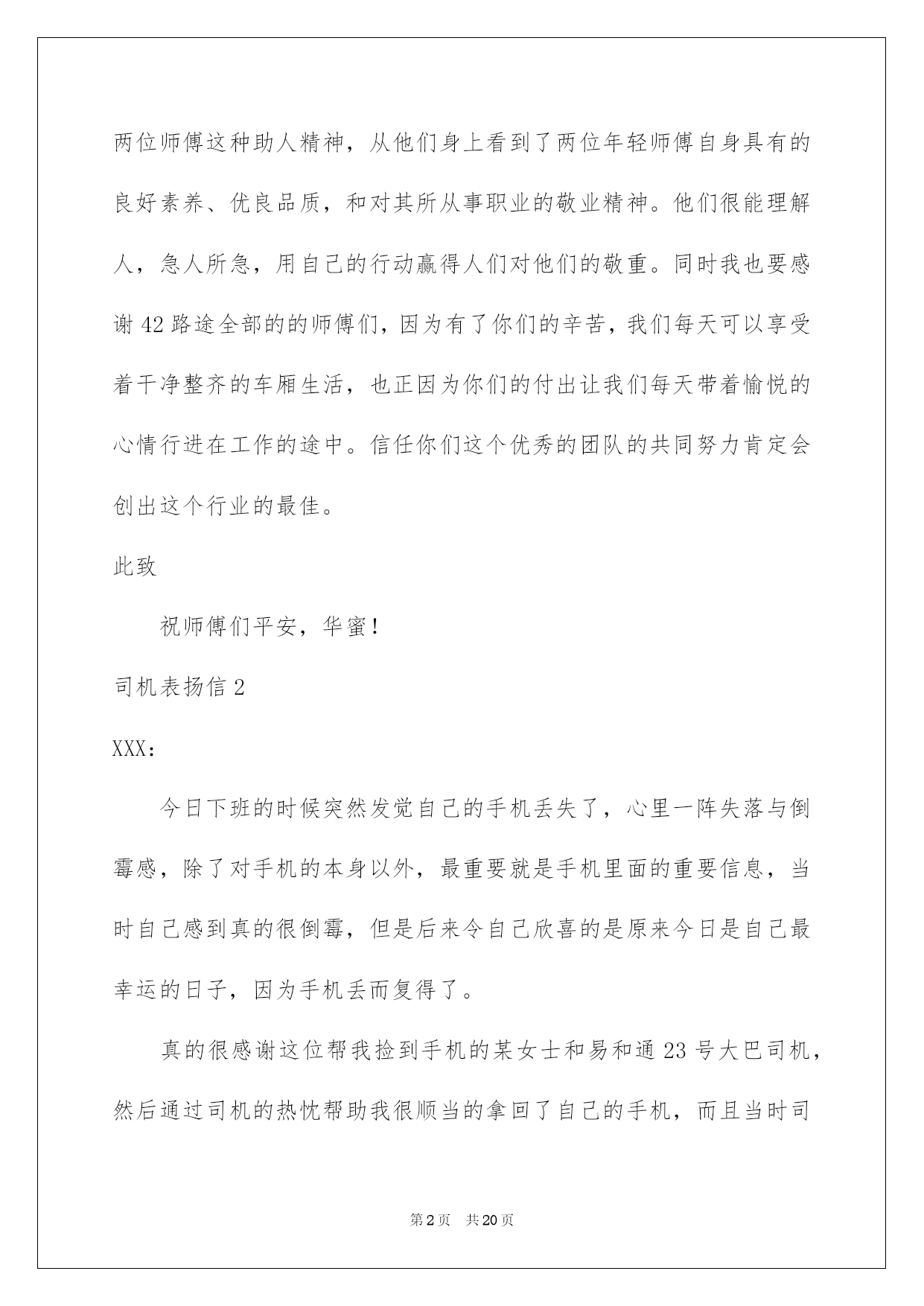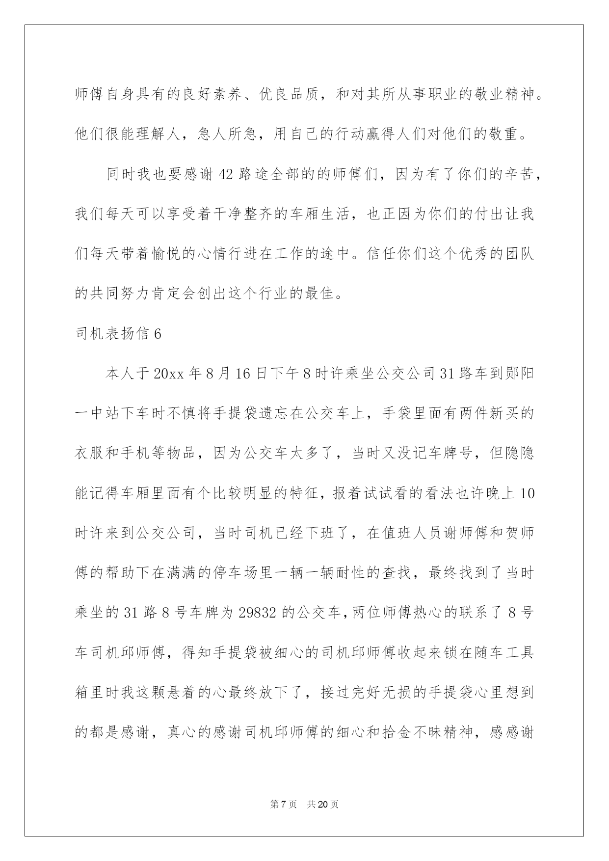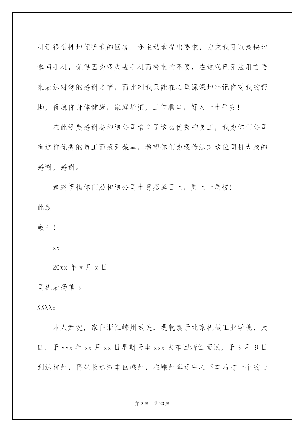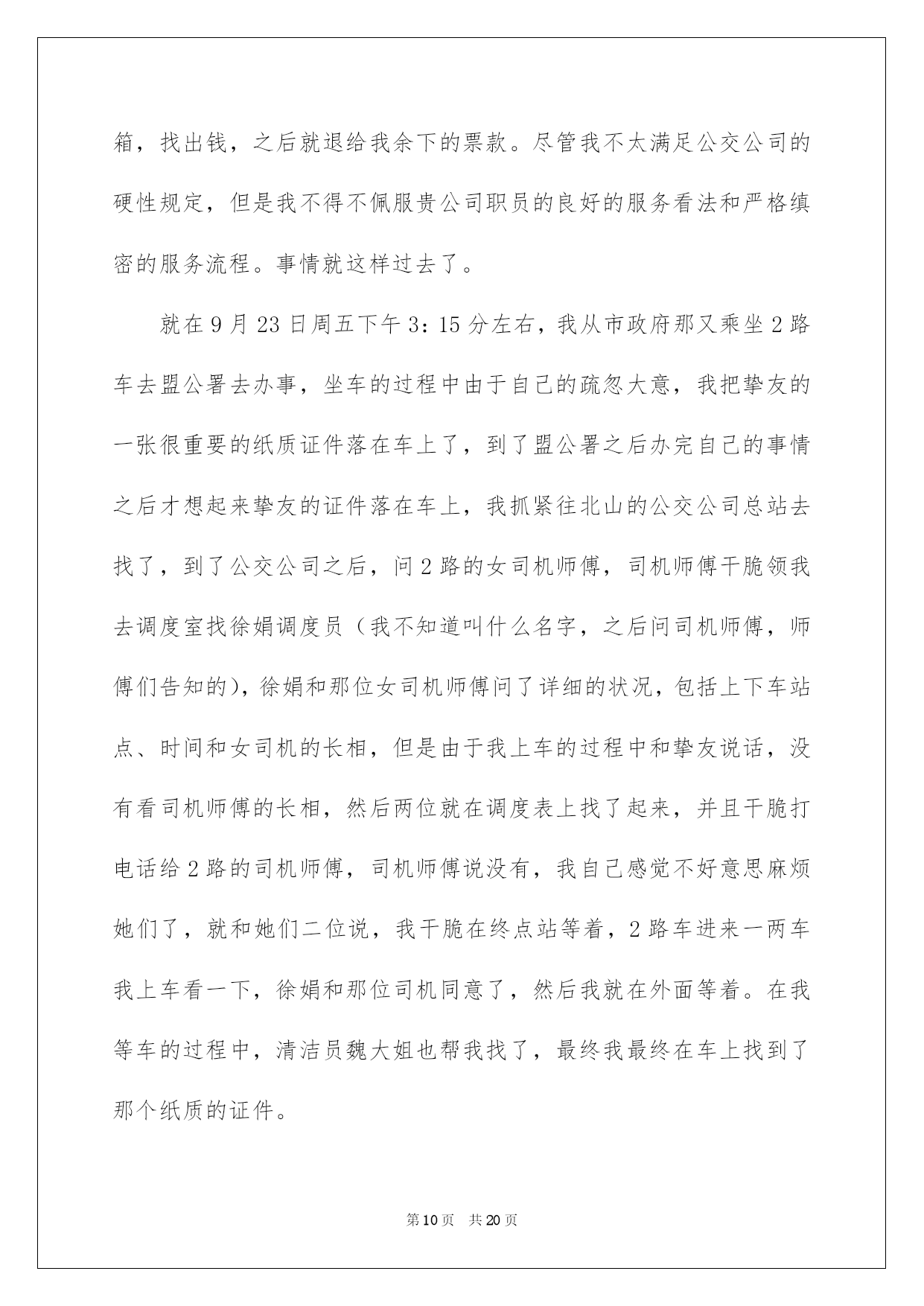 第PAGE\*Arabic\*MERGEFORMAT20页共NUMPAGES\*Arabic\*MERGEFORMAT20页第PAGE\*MERGEFORMAT20页共NUMPAGES\*MERGEFORMAT20页第PAGE\*MERGEFORMAT20页共NUMPAGES\*MERGEFORMAT20页第PAGE\*MERGEFORMAT20页共NUMPAGES\*MERGEFORMAT20页第PAGE\*MERGEFORMAT20页共NUMPAGES\*MERGEFORMAT20页第PAGE\*MERGEFORMAT20页共NUMPAGES\*MERGEFORMAT20页第PAGE\*MERGEFORMAT20页共NUMPAGES\*MERGEFORMAT20页第PAGE\*MERGEFORMAT20页共NUMPAGES\*MERGEFORMAT20页第PAGE\*MERGEFORMAT20页共NUMPAGES\*MERGEFORMAT20页第PAGE\*MERGEFORMAT20页共NUMPAGES\*MERGEFORMAT20页第PAGE\*MERGEFORMAT20页共NUMPAGES\*MERGEFORMAT20页2022司机表扬信司机表扬信在不断进步的社会中,须要运用表扬信的事情愈发增多,表扬信在写作上具有肯定的格式要求。那么一般表扬信是怎么写的呢?下面是我收集整理的司机表扬信,欢迎阅读,希望大家能够喜爱。司机表扬信1公交公司领导,你们好!今特来信感谢贵公司xx号车俩师傅,(请宽恕我不知他俩姓名只登记了车号)。四月十九日晚下班,我从xx搭乘xx车回家,在保险公司站下车,到家后才发觉将一只装衣服的红塑料包落在车上,当时心情很急,不知怎么去找,还担忧包被别人拿走,天慢慢黑下来,心想找到的可能性很小了,无奈之下还是想碰碰运气,我又上了8124车返回政务中心车站,焦急中出门忘了带乘车卡和零钱,在车上我向师傅讲了丢包的事,师傅一边劝慰我,并热心地手机联系xx师傅,很快得知包已在车站帮我保管好,这时我才放心下来。几分钟后,车到政务中心车站,下车后借着路灯我看到xx师傅始终没回家休息在等着我,我欣喜地拿到了完好无损的包。我特别敬佩两位师傅这种助人精神,从他们身上看到了两位年轻师傅自身具有的良好素养、优良品质,和对其所从事职业的敬业精神。他们很能理解人,急人所急,用自己的行动赢得人们对他们的敬重。同时我也要感谢42路途全部的的师傅们,因为有了你们的辛苦,我们每天可以享受着干净整齐的车厢生活,也正因为你们的付出让我们每天带着愉悦的心情行进在工作的途中。信任你们这个优秀的团队的共同努力肯定会创出这个行业的最佳。此致祝师傅们平安,华蜜!司机表扬信2XXX:今日下班的时候突然发觉自己的手机丢失了,心里一阵失落与倒霉感,除了对手机的本身以外,最重要就是手机里面的重要信息,当时自己感到真的很倒霉,但是后来令自己欣喜的是原来今日是自己最幸运的日子,因为手机丢而复得了。真的很感谢这位帮我捡到手机的某女士和易和通23号大巴司机,然后通过司机的热忱帮助我很顺当的拿回了自己的手机,而且当时司机还很耐性地倾听我的回答,还主动地提出要求,力求我可以最快地拿回手机,免得因为我失去手机而带来的不便,在这我已无法用言语来表达对您的感谢之情,而此刻我只能在心里深深地牢记你对我的帮助,祝愿你身体健康,家庭华蜜,工作顺当,好人一生平安!在此还要感谢易和通公司培育了这么优秀的员工,我为你们公司有这样优秀的员工而感到荣幸,希望你们为我传达对这位司机大叔的感谢,感谢。最终祝福你们易和通公司生意蒸蒸日上,更上一层楼!此致敬礼!xx20xx年x月x日司机表扬信3XXXX:本人姓沈,家住浙江嵊州城关,现就读于北京机械工业学院,大四。于xxx年xx月xx日星期天坐xxx火车回浙江面试,于3月9日到达杭州,再坐长途汽车回嵊州,在嵊州客运中心下车后打一个的士回家。当时人特别乏累,在车上一时疏忽,把一张回北京的火车票和我的学生证落在了车上,回家发觉丢失东西特别焦急。出租车司机发觉后并没有把我的火车票和证件束之高阁,而是很负责任的把我丢失的东西送到了嵊州客运出租车公司。嵊州市客运出租车公司的领导得知状况后呢,立刻联系嵊州市的公安局办证中心,公安局办证中心的领导了解状况以后特别热心,通过我在学生证上的名字查询我的联系方式,但是因为本人现就读于北京,户口已经从嵊州迁出,所以无法查找到我的联系方式。可是,嵊州市公安局办证中心的领导本着为人民服务的看法并未放弃查找,而是通过努力找到了我父亲的名字与户口所在地。接着联系了当地派出所,再通过我