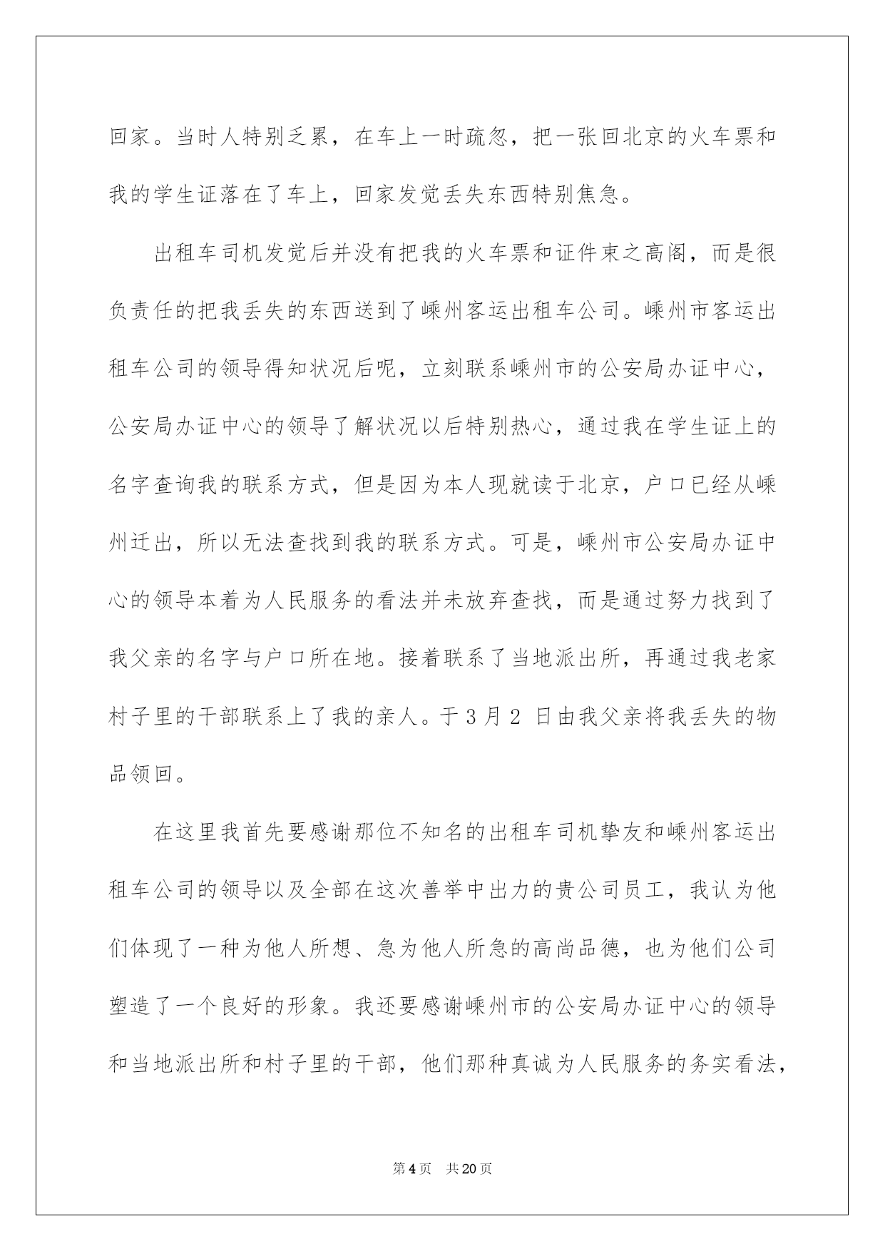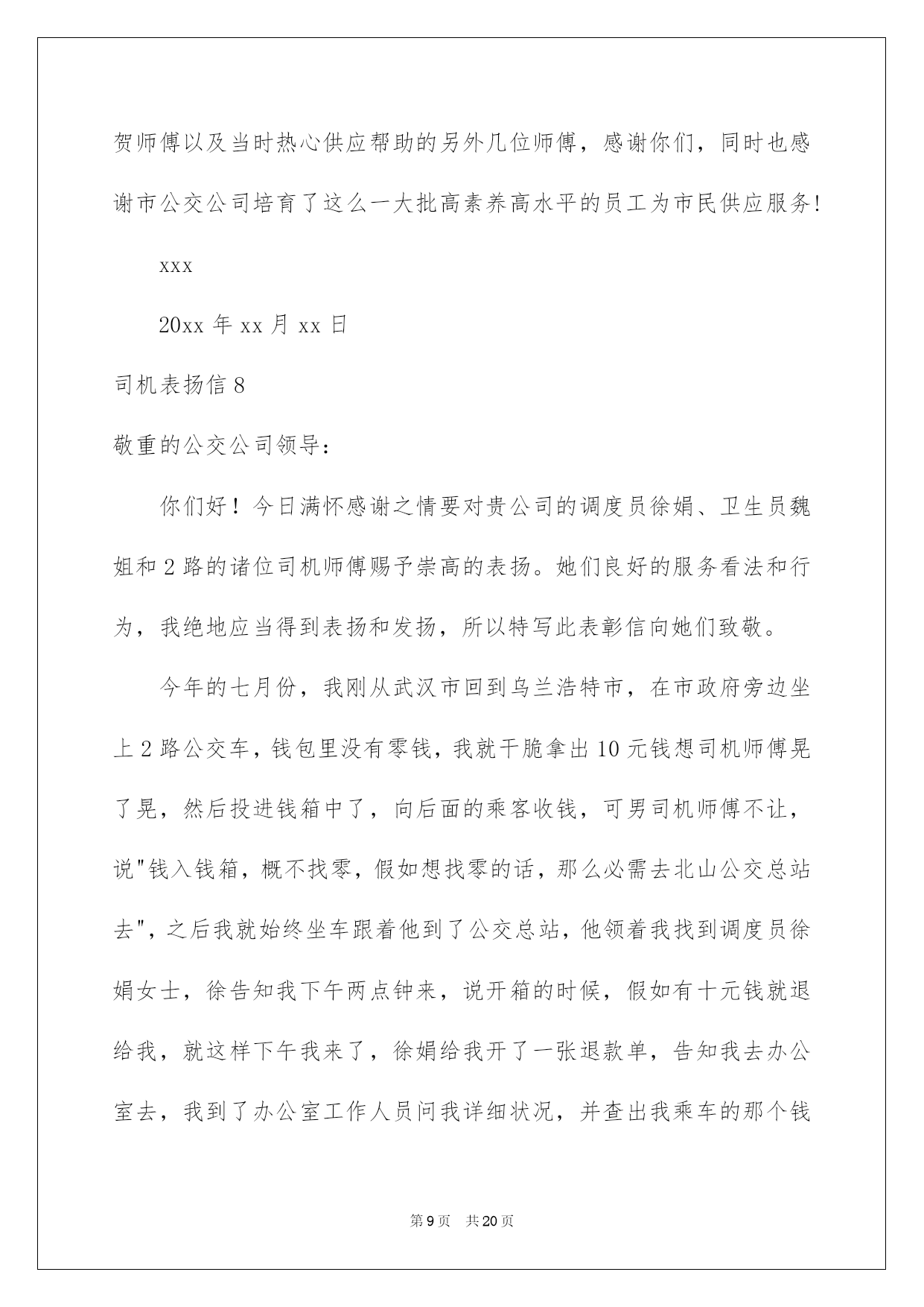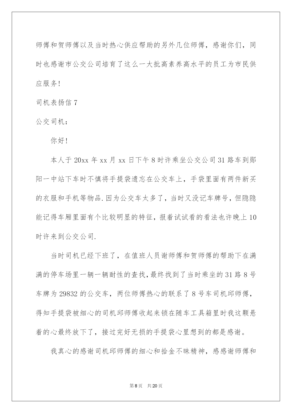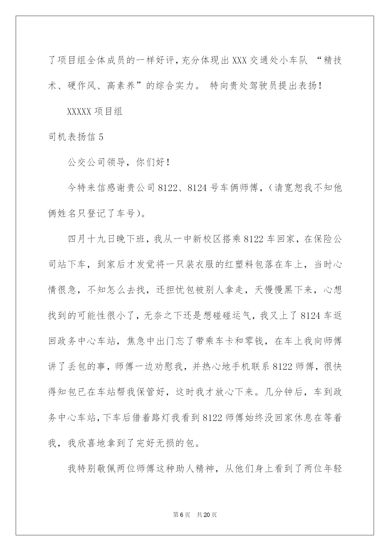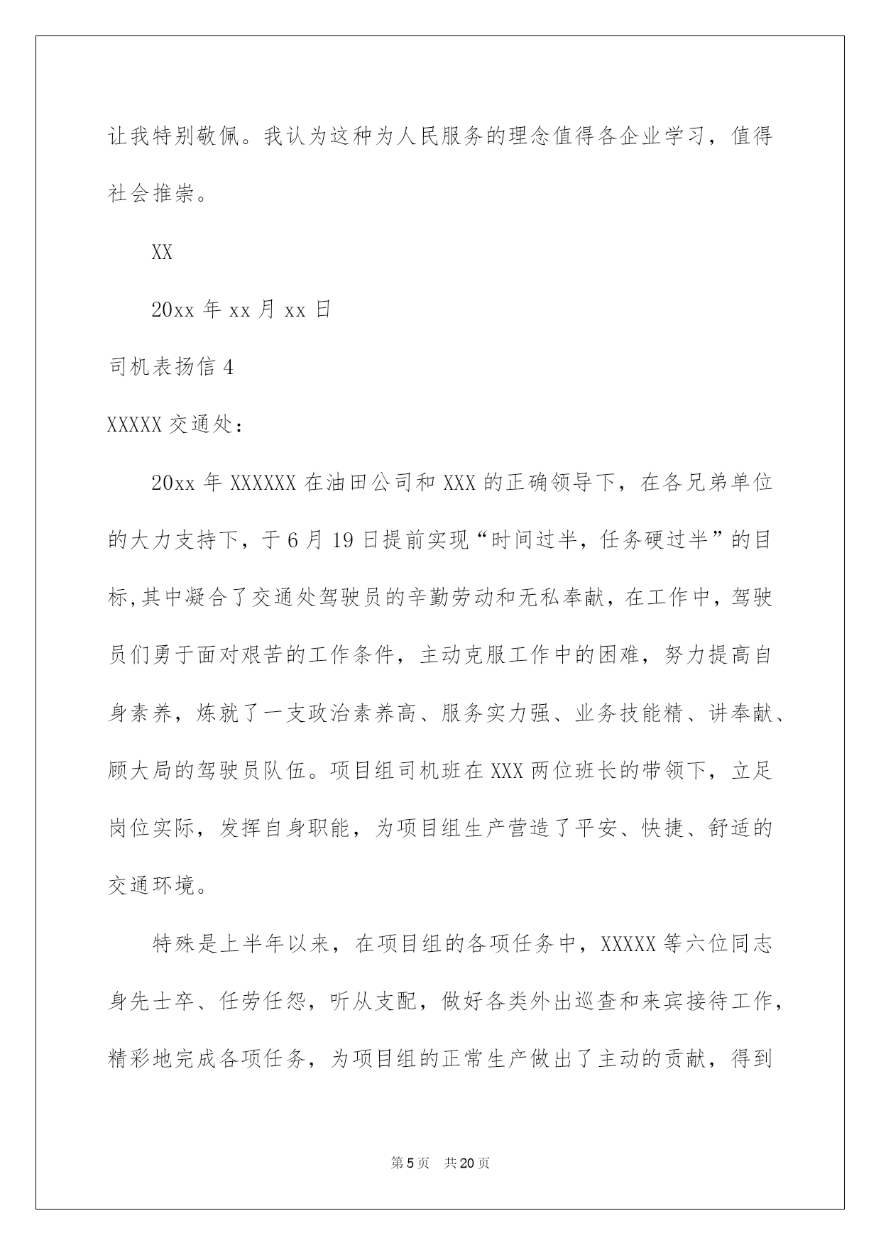第PAGE\*Arabic\*MERGEFORMAT20页共NUMPAGES\*Arabic\*MERGEFORMAT20页第PAGE\*MERGEFORMAT20页共NUMPAGES\*MERGEFORMAT20页第PAGE\*MERGEFORMAT20页共NUMPAGES\*MERGEFORMAT20页第PAGE\*MERGEFORMAT20页共NUMPAGES\*MERGEFORMAT20页第PAGE\*MERGEFORMAT20页共NUMPAGES\*MERGEFORMAT20页第PAGE\*MERGEFORMAT20页共NUMPAGES\*MERGEFORMAT20页第PAGE\*MERGEFORMAT20页共NUMPAGES\*MERGEFORMAT20页第PAGE\*MERGEFORMAT20页共NUMPAGES\*MERGEFORMAT20页第PAGE\*MERGEFORMAT20页共NUMPAGES\*MERGEFORMAT20页第PAGE\*MERGEFORMAT20页共NUMPAGES\*MERGEFORMAT20页第PAGE\*MERGEFORMAT20页共NUMPAGES\*MERGEFORMAT20页2022司机表扬信司机表扬信在不断进步的社会中,须要运用表扬信的事情愈发增多,表扬信在写作上具有肯定的格式要求。那么一般表扬信是怎么写的呢?下面是我收集整理的司机表扬信,欢迎阅读,希望大家能够喜爱。司机表扬信1公交公司领导,你们好!今特来信感谢贵公司xx号车俩师傅,(请宽恕我不知他俩姓名只登记了车号)。四月十九日晚下班,我从xx搭乘xx车回家,在保险公司站下车,到家后才发觉将一只装衣服的红塑料包落在车上,当时心情很急,不知怎么去找,还担忧包被别人拿走,天慢慢黑下来,心想找到的可能性很小了,无奈之下还是想碰碰运气,我又上了8124车返回政务中心车站,焦急中出门忘了带乘车卡和零钱,在车上我向师傅讲了丢包的事,师傅一边劝慰我,并热心地手机联系xx师傅,很快得知包已在车站帮我保管好,这时我才放心下来。几分钟后,车到政务中心车站,下车后借着路灯我看到xx师傅始终没回家休息在等着我,我欣喜地拿到了完好无损的包。我特别敬佩两位师傅这种助人精神,从他们身上看到了两位年轻师傅自身具有的良好素养、优良品质,和对其所从事职业的敬业精神。他们很能理解人,急人所急,用自己的行动赢得人们对他们的敬重。同时我也要感谢42路途全部的的师傅们,因为有了你们的辛苦,我们每天可以享受着干净整齐的车厢生活,也正因为你们的付出让我们每天带着愉悦的心情行进在工作的途中。信任你们这个优秀的团队的共同努力肯定会创出这个行业的最佳。此致祝师傅们平安,华蜜!司机表扬信2XXX:今日下班的时候突然发觉自己的手机丢失了,心里一阵失落与倒霉感,除了对手机的本身以外,最重要就是手机里面的重要信息,当时自己感到真的很倒霉,但是后来令自己欣喜的是原来今日是自己最幸运的日子,因为手机丢而复得了。真的很感谢这位帮我捡到手机的某女士和易和通23号大巴司机,然后通过司机的热忱帮助我很顺当的拿回了自己的手机,而且当时司机还很耐性地倾听我的回答,还主动地提出要求,力求我可以最快地拿回手机,免得因为我失去手机而带来的不便,在这我已无法用言语来表达对您的感谢之情,而此刻我只能在心里深深地牢记你对我的帮助,祝愿你身体健康,家庭华蜜,工作顺当,好人一生平安!在此还要感谢易和通公司培育了这么优秀的员工,我为你们公司有这样优秀的员工而感到荣幸,希望你们为我传达对这位司机大叔的感谢,感谢。最终祝福你们易和通公司生意蒸蒸日上,更上一层楼!此致敬礼!xx20xx年x月x日司机表扬信3XXXX:本人姓沈,家住浙江嵊州城关,现就读于北京机械工业学院,大四。于xxx年xx月xx日星期天坐xxx火车回浙江面试,于3月9日到达杭州,再坐长途汽车回嵊州,在嵊州客运中心下车后打一个的士回家。当时人特别乏累,在车上一时疏忽,把一张回北京的火车票和我的学生证落在了车上,回家发觉丢失东西特别焦急。出租车司机发觉后并没有把我的火车票和证件束之高阁,而是很负责任的把我丢失的东西送到了嵊州客运出租车公司。嵊州市客运出租车公司的领导得知状况后呢,立刻联系嵊州市的公安局办证中心,公安局办证中心的领导了解状况以后特别热心,通过我在学生证上的名字查询我的联系方式,但是因为本人现就读于北京,户口已经从嵊州迁出,所以无法查找到我的联系方式。可是,嵊州市公安局办证中心的领导本着为人民服务的看法并未放弃查找,而是通过努力找到了我父亲的名字与户口所在地。接着联系了当地派出所,再通过我