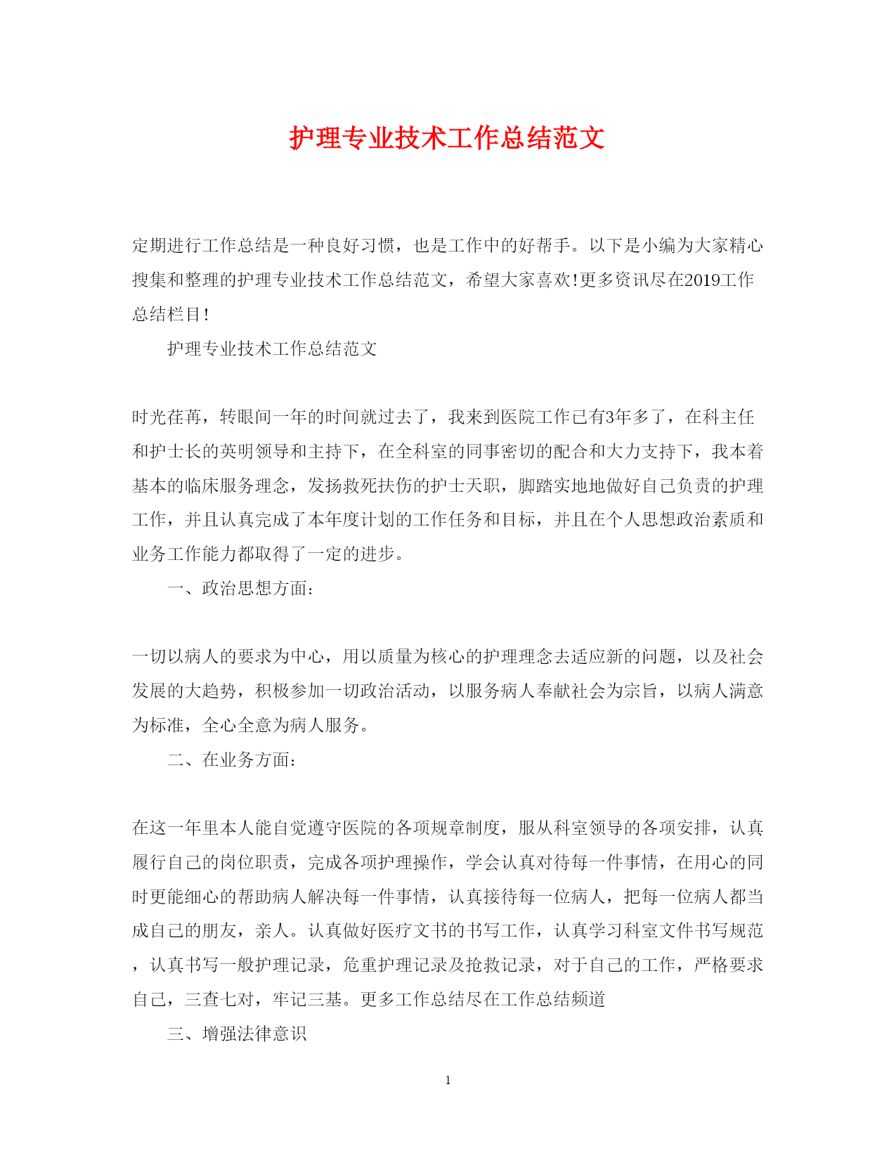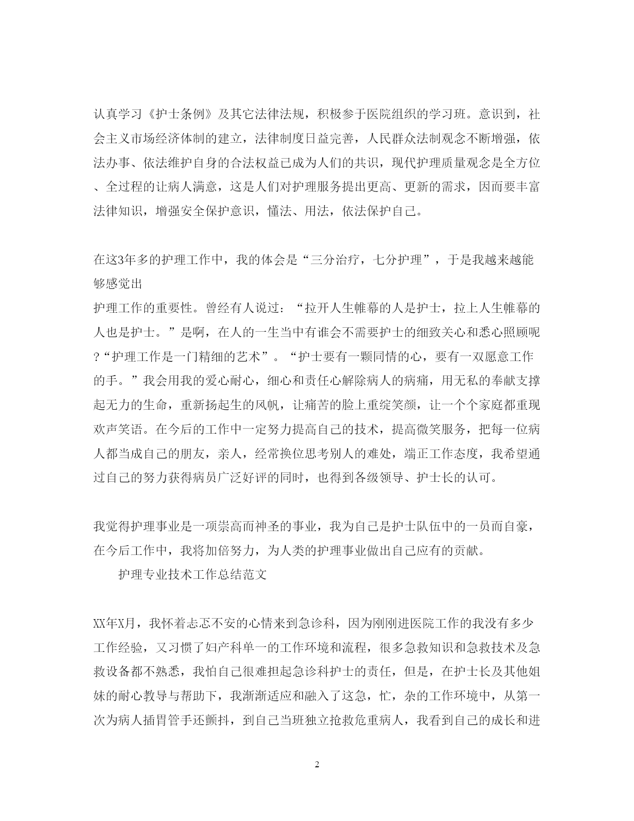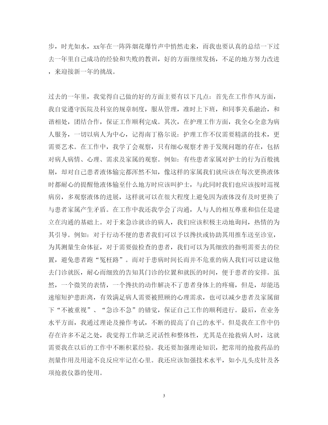 此资料由网络收集而来,如有侵权请告知上传者立即删除。资料共分享,我们负责传递知识。PAGEPAGE4护理专业技术工作总结范文定期进行工作总结是一种良好习惯,也是工作中的好帮手。以下是小编为大家精心搜集和整理的护理专业技术工作总结范文,希望大家喜欢!更多资讯尽在2019工作总结栏目!护理专业技术工作总结范文时光荏苒,转眼间一年的时间就过去了,我来到医院工作已有3年多了,在科主任和护士长的英明领导和主持下,在全科室的同事密切的配合和大力支持下,我本着基本的临床服务理念,发扬救死扶伤的护士天职,脚踏实地地做好自己负责的护理工作,并且认真完成了本年度计划的工作任务和目标,并且在个人思想政治素质和业务工作能力都取得了一定的进步。一、政治思想方面:一切以病人的要求为中心,用以质量为核心的护理理念去适应新的问题,以及社会发展的大趋势,积极参加一切政治活动,以服务病人奉献社会为宗旨,以病人满意为标准,全心全意为病人服务。二、在业务方面:在这一年里本人能自觉遵守医院的各项规章制度,服从科室领导的各项安排,认真履行自己的岗位职责,完成各项护理操作,学会认真对待每一件事情,在用心的同时更能细心的帮助病人解决每一件事情,认真接待每一位病人,把每一位病人都当成自己的朋友,亲人。认真做好医疗文书的书写工作,认真学习科室文件书写规范,认真书写一般护理记录,危重护理记录及抢救记录,对于自己的工作,严格要求自己,三查七对,牢记三基。更多工作总结尽在工作总结频道三、增强法律意识认真学习《护士条例》及其它法律法规,积极参于医院组织的学习班。意识到,社会主义市场经济体制的建立,法律制度日益完善,人民群众法制观念不断增强,依法办事、依法维护自身的合法权益已成为人们的共识,现代护理质量观念是全方位、全过程的让病人满意,这是人们对护理服务提出更高、更新的需求,因而要丰富法律知识,增强安全保护意识,懂法、用法,依法保护自己。在这3年多的护理工作中,我的体会是“三分治疗,七分护理”,于是我越来越能够感觉出护理工作的重要性。曾经有人说过:“拉开人生帷幕的人是护士,拉上人生帷幕的人也是护士。”是啊,在人的一生当中有谁会不需要护士的细致关心和悉心照顾呢?“护理工作是一门精细的艺术”。“护士要有一颗同情的心,要有一双愿意工作的手。”我会用我的爱心耐心,细心和责任心解除病人的病痛,用无私的奉献支撑起无力的生命,重新扬起生的风帆,让痛苦的脸上重绽笑颜,让一个个家庭都重现欢声笑语。在今后的工作中一定努力提高自己的技术,提高微笑服务,把每一位病人都当成自己的朋友,亲人,经常换位思考别人的难处,端正工作态度,我希望通过自己的努力获得病员广泛好评的同时,也得到各级领导、护士长的认可。我觉得护理事业是一项崇高而神圣的事业,我为自己是护士队伍中的一员而自豪,在今后工作中,我将加倍努力,为人类的护理事业做出自己应有的贡献。护理专业技术工作总结范文XX年X月,我怀着忐忑不安的心情来到急诊科,因为刚刚进医院工作的我没有多少工作经验,又习惯了妇产科单一的工作环境和流程,很多急救知识和急救技术及急救设备都不熟悉,我怕自己很难担起急诊科护士的责任,但是,在护士长及其他姐妹的耐心教导与帮助下,我渐渐适应和融入了这急,忙,杂的工作环境中,从第一次为病人插胃管手还颤抖,到自己当班独立抢救危重病人,我看到自己的成长和进步,时光如水,xx年在一阵阵烟花爆竹声中悄然走来,而我也要认真的总结一下过去一年里自己成功的经验和失败的教训,好的方面继续发扬,不足的地方努力改进,来迎接新一年的挑战。过去的一年里,我觉得自己做的好的方面主要有以下几点:首先在工作作风方面,我自觉遵守医院及科室的规章制度,服从管理,准时上下班,和同事关系融洽,和谐相处,团结合作,保证工作顺利完成。其次,在护理工作方面,我全心全意为病人服务,一切以病人为中心,记得南丁格尔说:护理工作不仅需要精湛的技术,更需要艺术。在工作中,我学了会观察,只有细心观察才善于发现问题的存在,包括对病人病情、心理、需求及家属的观察。例如:有些患者家属对护士的行为百般挑剔,却对自己患者液体输完都浑然不知,像这样的家属我们就应该在每次更换液体时都耐心的提醒他液体输至什么地方时应该叫护士,与此同时我们也应该按时巡视病房,多观察液体的进展,这样就可以在很大程度上避免因为液体没有及时更换了与患者家属产生矛盾。在工作中我还我学会了沟通,人与人的相互尊重和信任是建立在沟通的基础上。对于来急诊就诊的病人,我们应该积极主动地询问,热情的为其引导。例如:对于行动不便的患者我们可以予以搀扶或协助其用推车送至诊室,为其测量生命体征,对于需要做检查的患者,我们可以为其细致的指明需要去的位置,避免患者跑“冤枉路”。而对于患病时间长而并不危重的病人我们可以建