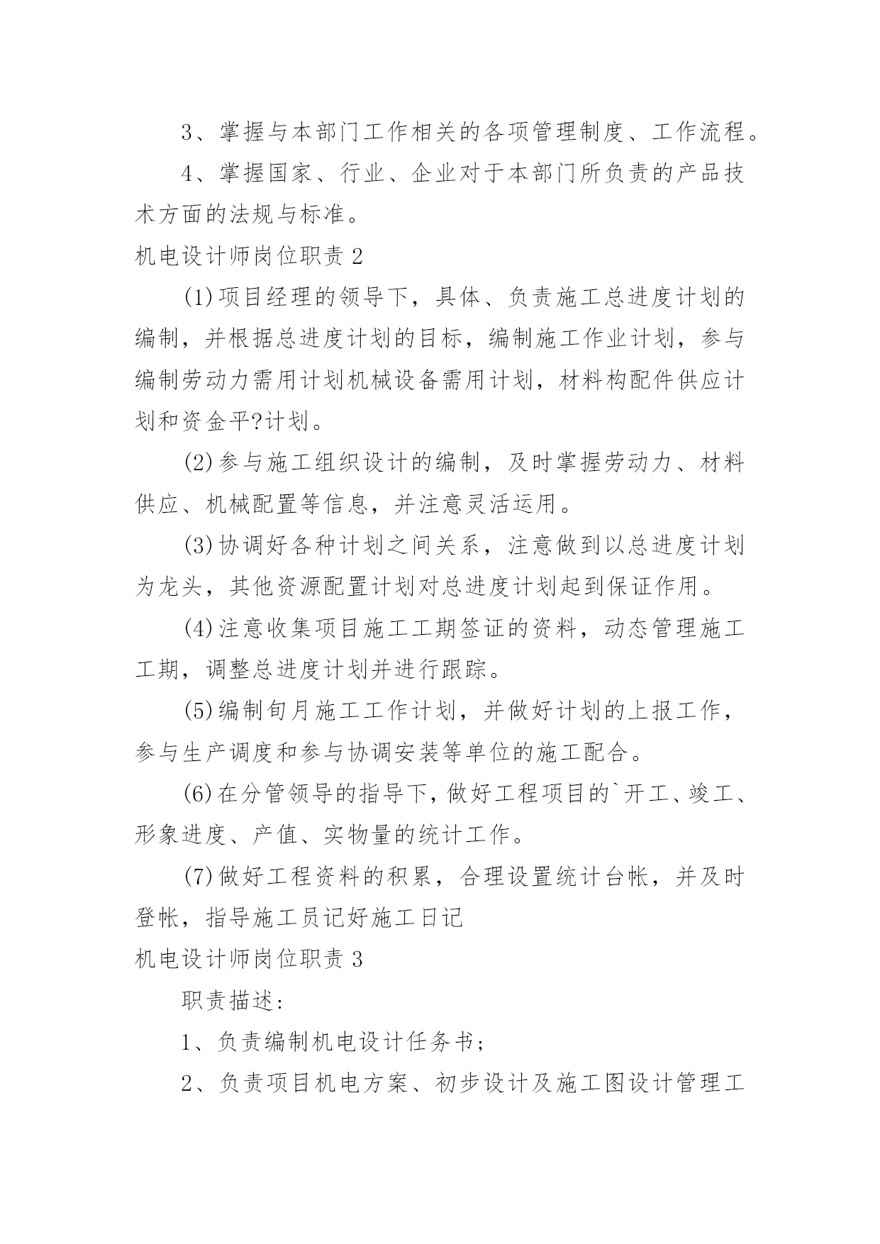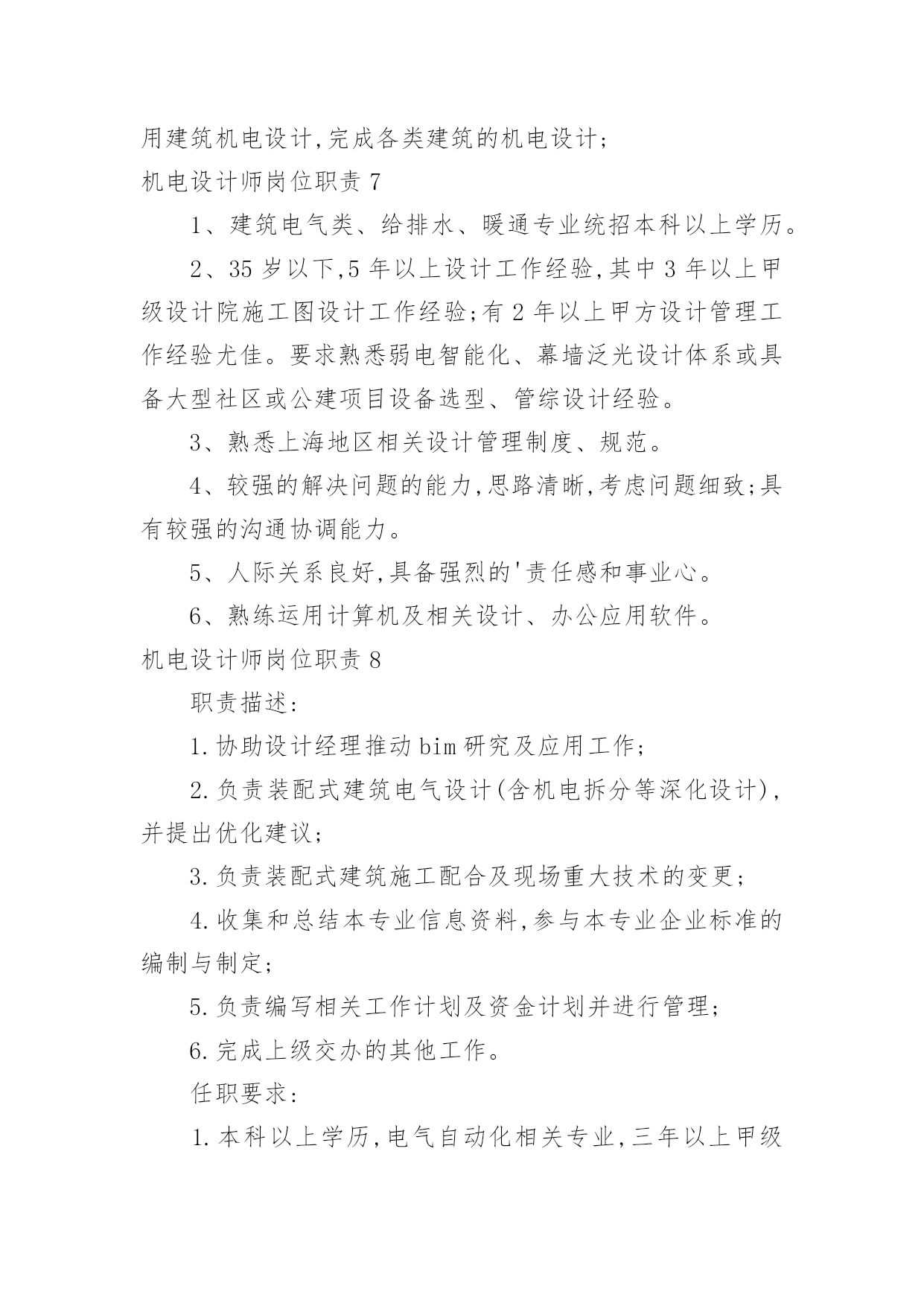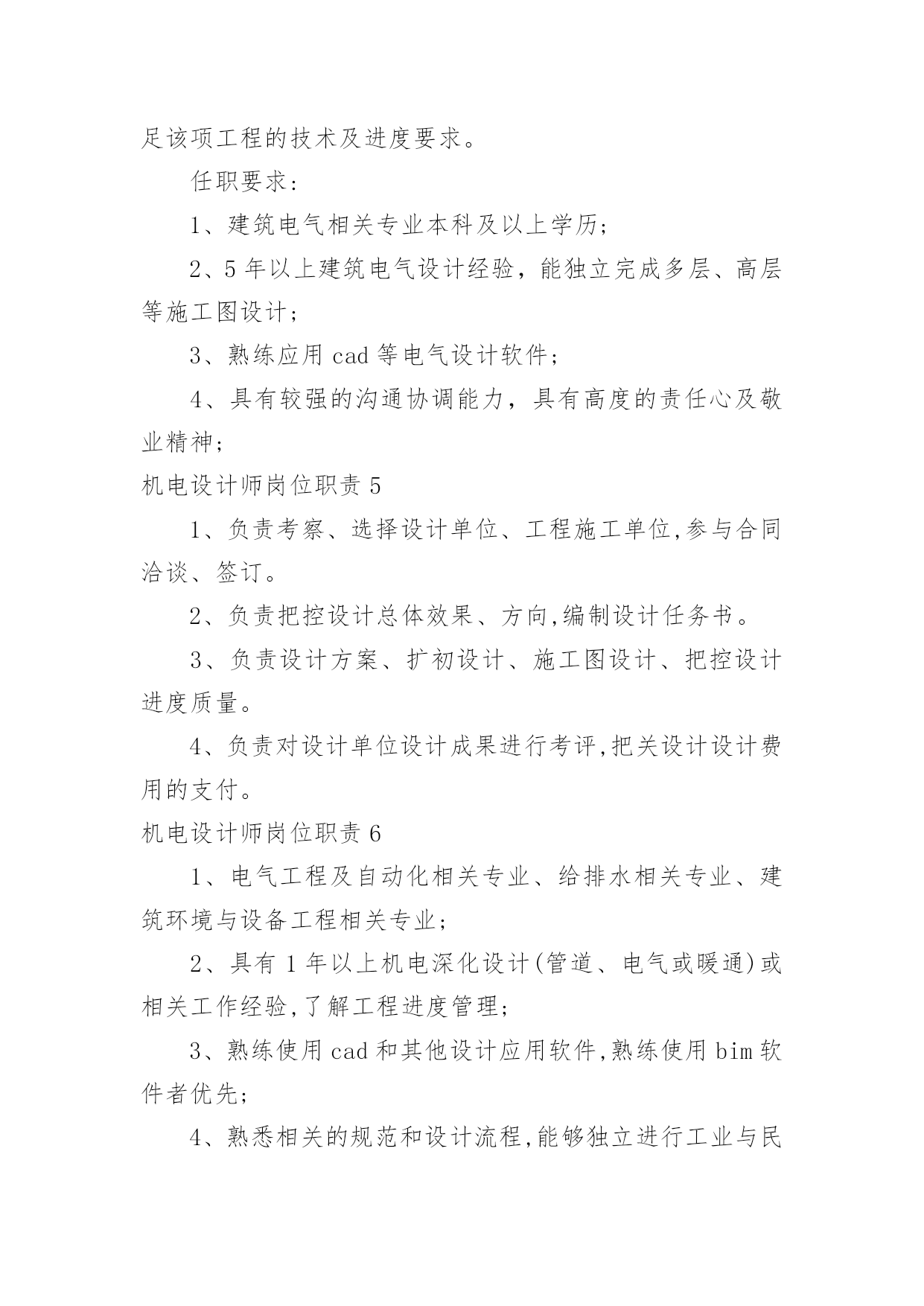 机电设计师岗位职责机电设计师岗位职责(8篇)在现实社会中,很多地方都会使用到岗位职责,任何岗位职责都是一个责任、权力与义务的综合体,有多大的权力就应该承担多大的责任,有多大的权力和责任应该尽多大的义务,任何割裂开来的做法都会发生问题。到底应如何制定岗位职责呢?下面是小编整理的机电设计师岗位职责,仅供参考,希望能够帮助到大家。机电设计师岗位职责1岗位职责:1、负责电磁类桥式起重机、挂梁类桥式起重机、冶金类桥式起重机、通用桥式起重机、非标类桥式起重机、通用门式起重机、非标类门式起重机以及港口类起重机、路桥类起重机、启闭机、多功能起重机等各类型起重机的设计。2、负责各类型起重机电气的设计。3、负责产品改进与研发。4、负责提供技术支持与现场服务工作。5、负责设计产品的`标准化工作。岗位要求:1、精通机械设计、电气设计、起重机设计相关知识。2、熟悉本部门所负责产品的性能、规格、工艺、服务、销售渠道及品牌的特点和发展趋势。3、掌握与本部门工作相关的各项管理制度、工作流程。4、掌握国家、行业、企业对于本部门所负责的产品技术方面的法规与标准。机电设计师岗位职责2(1)项目经理的领导下,具体、负责施工总进度计划的编制,并根据总进度计划的目标,编制施工作业计划,参与编制劳动力需用计划机械设备需用计划,材料构配件供应计划和资金平?计划。(2)参与施工组织设计的编制,及时掌握劳动力、材料供应、机械配置等信息,并注意灵活运用。(3)协调好各种计划之间关系,注意做到以总进度计划为龙头,其他资源配置计划对总进度计划起到保证作用。(4)注意收集项目施工工期签证的资料,动态管理施工工期,调整总进度计划并进行跟踪。(5)编制旬月施工工作计划,并做好计划的上报工作,参与生产调度和参与协调安装等单位的施工配合。(6)在分管领导的指导下,做好工程项目的`开工、竣工、形象进度、产值、实物量的统计工作。(7)做好工程资料的积累,合理设置统计台帐,并及时登帐,指导施工员记好施工日记机电设计师岗位职责3职责描述:1、负责编制机电设计任务书;2、负责项目机电方案、初步设计及施工图设计管理工作、严格把控各阶段设计成果;3、负责设计成果跟踪、设计意见反馈、施工现场图纸变更及技术支持;4、负责按照产品设计要求,配合项目部对相关施工阶段进行验收和评价;5、负责在机电方案阶段组织多方案比选,审核机电方案可行性;6、配合公司其他部门关于设计版块的对接工作。任职要求:1、机电一体化、机电工程、建筑电气及相关专业本科及以上学历;2、八年以上地产机电专业工作经验,具有高端豪宅及商业综合体项目经验;3、勤奋敬业、责任心强,具有团队合作精神及一定的组织管理能力;4、熟悉国家相关设计管理规范及文件;5、熟练使用office办公软件、cad绘图软件的.操作。机电设计师岗位职责4岗位职责1、参与区域工程的初步设计的审定及施工图纸的'会审,主要审查电气设计是否符合该项工程的要求及电气设计是否合理。2、参与区域审查施工单位的施工组织设计及施工方案,主要审查施工单位施工人员的技术素质及施工力量,能否满足该项工程的技术及进度要求。任职要求:1、建筑电气相关专业本科及以上学历;2、5年以上建筑电气设计经验,能独立完成多层、高层等施工图设计;3、熟练应用cad等电气设计软件;4、具有较强的沟通协调能力,具有高度的责任心及敬业精神;机电设计师岗位职责51、负责考察、选择设计单位、工程施工单位,参与合同洽谈、签订。2、负责把控设计总体效果、方向,编制设计任务书。3、负责设计方案、扩初设计、施工图设计、把控设计进度质量。4、负责对设计单位设计成果进行考评,把关设计设计费用的支付。机电设计师岗位职责61、电气工程及自动化相关专业、给排水相关专业、建筑环境与设备工程相关专业;2、具有1年以上机电深化设计(管道、电气或暖通)或相关工作经验,了解工程进度管理;3、熟练使用cad和其他设计应用软件,熟练使用bim软件者优先;4、熟悉相关的规范和设计流程,能够独立进行工业与民用建筑机电设计,完成各类建筑的机电设计;机电设计师岗位职责71、建筑电气类、给排水、暖通专业统招本科以上学历。2、35岁以下,5年以上设计工作经验,其中3年以上甲级设计院施工图设计工作经验;有2年以上甲方设计管理工作经验尤佳。要求熟悉弱电智能化、幕墙泛光设计体系或具备大型社区或公建项目设备选型、管综设计经验。3、熟悉上海地区相关设计管理制度、规范。4、较强的解决问题的能力,思路清晰,考虑问题细致;具有较强的沟通协调能力。5、人际关系良好,具备强烈的'责任感和事业心。6、熟练运用计算机及相关设计、办公应用软件。机电设计师岗位职责8职责描述:1.协助设计经理推动bim研究及应用工作;2.负责装配式建筑电气设计(含机电拆分等深化设计),并提出优化建议;3.负责装配式