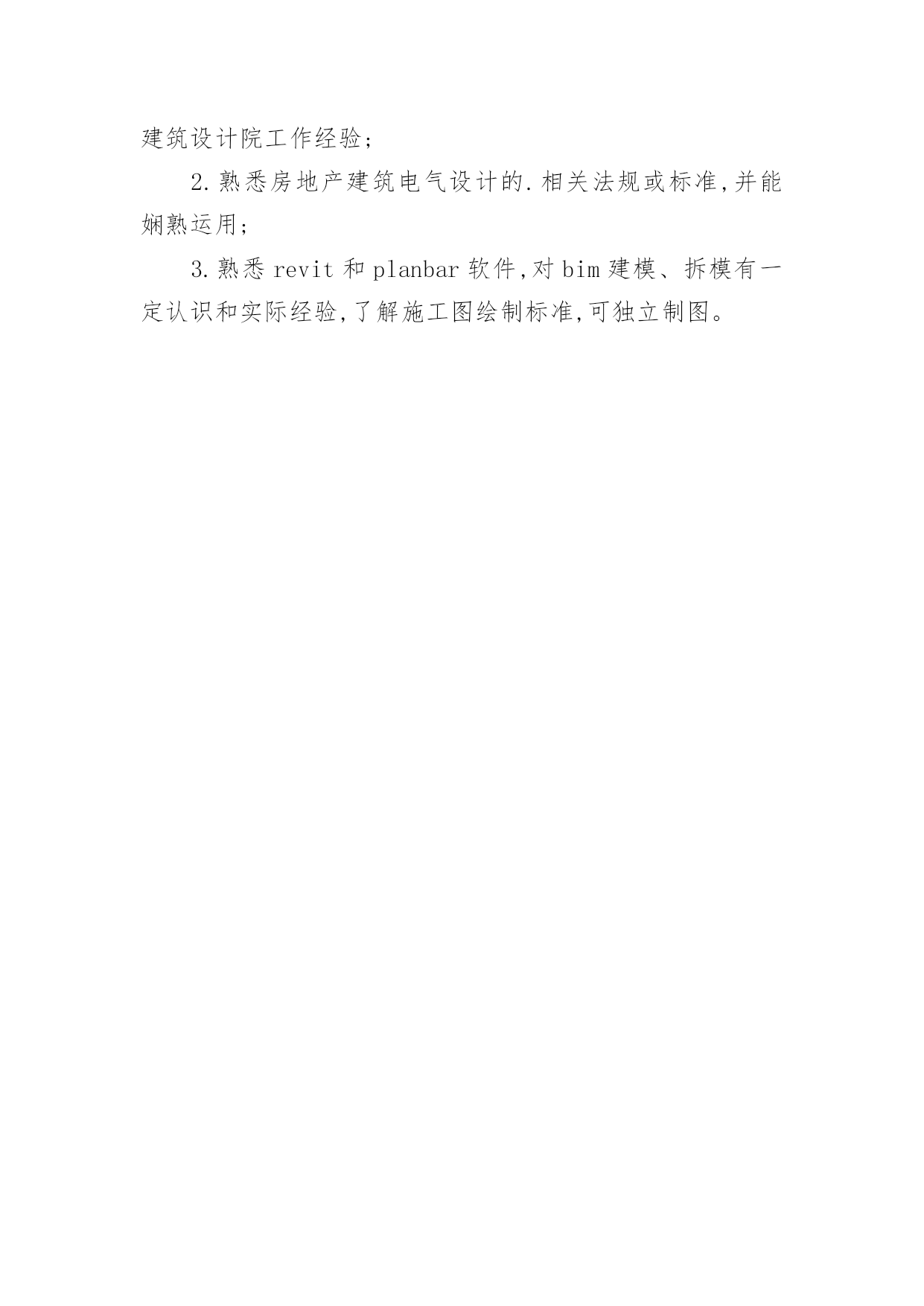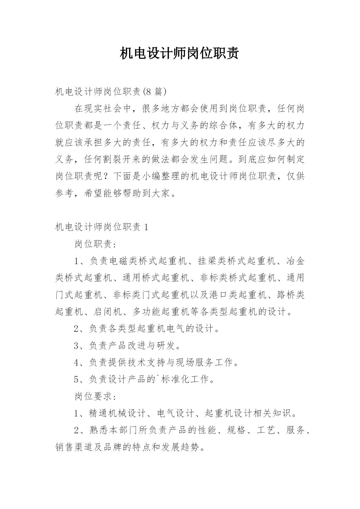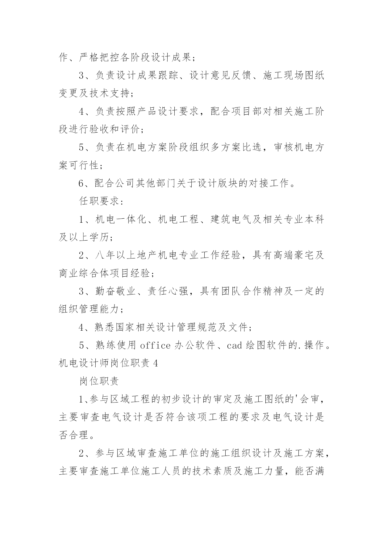 机电设计师岗位职责机电设计师岗位职责(8篇)在现实社会中,很多地方都会使用到岗位职责,任何岗位职责都是一个责任、权力与义务的综合体,有多大的权力就应该承担多大的责任,有多大的权力和责任应该尽多大的义务,任何割裂开来的做法都会发生问题。到底应如何制定岗位职责呢?下面是小编整理的机电设计师岗位职责,仅供参考,希望能够帮助到大家。机电设计师岗位职责1岗位职责:1、负责电磁类桥式起重机、挂梁类桥式起重机、冶金类桥式起重机、通用桥式起重机、非标类桥式起重机、通用门式起重机、非标类门式起重机以及港口类起重机、路桥类起重机、启闭机、多功能起重机等各类型起重机的设计。2、负责各类型起重机电气的设计。3、负责产品改进与研发。4、负责提供技术支持与现场服务工作。5、负责设计产品的`标准化工作。岗位要求:1、精通机械设计、电气设计、起重机设计相关知识。2、熟悉本部门所负责产品的性能、规格、工艺、服务、销售渠道及品牌的特点和发展趋势。3、掌握与本部门工作相关的各项管理制度、工作流程。4、掌握国家、行业、企业对于本部门所负责的产品技术方面的法规与标准。机电设计师岗位职责2(1)项目经理的领导下,具体、负责施工总进度计划的编制,并根据总进度计划的目标,编制施工作业计划,参与编制劳动力需用计划机械设备需用计划,材料构配件供应计划和资金平?计划。(2)参与施工组织设计的编制,及时掌握劳动力、材料供应、机械配置等信息,并注意灵活运用。(3)协调好各种计划之间关系,注意做到以总进度计划为龙头,其他资源配置计划对总进度计划起到保证作用。(4)注意收集项目施工工期签证的资料,动态管理施工工期,调整总进度计划并进行跟踪。(5)编制旬月施工工作计划,并做好计划的上报工作,参与生产调度和参与协调安装等单位的施工配合。(6)在分管领导的指导下,做好工程项目的`开工、竣工、形象进度、产值、实物量的统计工作。(7)做好工程资料的积累,合理设置统计台帐,并及时登帐,指导施工员记好施工日记机电设计师岗位职责3职责描述:1、负责编制机电设计任务书;2、负责项目机电方案、初步设计及施工图设计管理工作、严格把控各阶段设计成果;3、负责设计成果跟踪、设计意见反馈、施工现场图纸变更及技术支持;4、负责按照产品设计要求,配合项目部对相关施工阶段进行验收和评价;5、负责在机电方案阶段组织多方案比选,审核机电方案可行性;6、配合公司其他部门关于设计版块的对接工作。任职要求:1、机电一体化、机电工程、建筑电气及相关专业本科及以上学历;2、八年以上地产机电专业工作经验,具有高端豪宅及商业综合体项目经验;3、勤奋敬业、责任心强,具有团队合作精神及一定的组织管理能力;4、熟悉国家相关设计管理规范及文件;5、熟练使用office办公软件、cad绘图软件的.操作。机电设计师岗位职责4岗位职责1、参与区域工程的初步设计的审定及施工图纸的'会审,主要审查电气设计是否符合该项工程的要求及电气设计是否合理。2、参与区域审查施工单位的施工组织设计及施工方案,主要审查施工单位施工人员的技术素质及施工力量,能否满足该项工程的技术及进度要求。任职要求:1、建筑电气相关专业本科及以上学历;2、5年以上建筑电气设计经验,能独立完成多层、高层等施工图设计;3、熟练应用cad等电气设计软件;4、具有较强的沟通协调能力,具有高度的责任心及敬业精神;机电设计师岗位职责51、负责考察、选择设计单位、工程施工单位,参与合同洽谈、签订。2、负责把控设计总体效果、方向,编制设计任务书。3、负责设计方案、扩初设计、施工图设计、把控设计进度质量。4、负责对设计单位设计成果进行考评,把关设计设计费用的支付。机电设计师岗位职责61、电气工程及自动化相关专业、给排水相关专业、建筑环境与设备工程相关专业;2、具有1年以上机电深化设计(管道、电气或暖通)或相关工作经验,了解工程进度管理;3、熟练使用cad和其他设计应用软件,熟练使用bim软件者优先;4、熟悉相关的规范和设计流程,能够独立进行工业与民用建筑机电设计,完成各类建筑的机电设计;机电设计师岗位职责71、建筑电气类、给排水、暖通专业统招本科以上学历。2、35岁以下,5年以上设计工作经验,其中3年以上甲级设计院施工图设计工作经验;有2年以上甲方设计管理工作经验尤佳。要求熟悉弱电智能化、幕墙泛光设计体系或具备大型社区或公建项目设备选型、管综设计经验。3、熟悉上海地区相关设计管理制度、规范。4、较强的解决问题的能力,思路清晰,考虑问题细致;具有较强的沟通协调能力。5、人际关系良好,具备强烈的'责任感和事业心。6、熟练运用计算机及相关设计、办公应用软件。机电设计师岗位职责8职责描述:1.协助设计经理推动bim研究及应用工作;2.负责装配式建筑电气设计(含机电拆分等深化设计),并提出优化建议;3.负责装配式