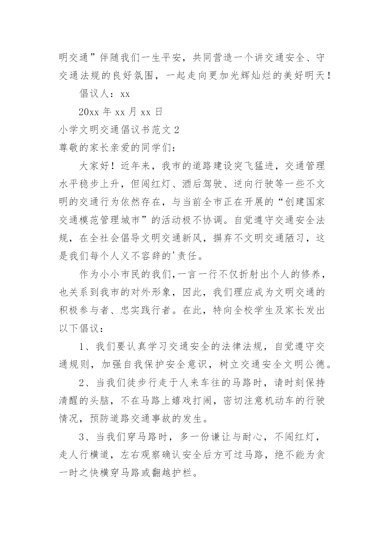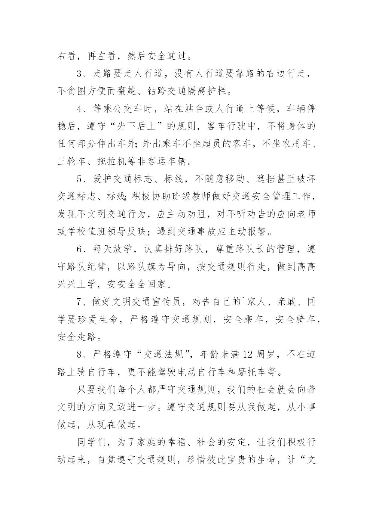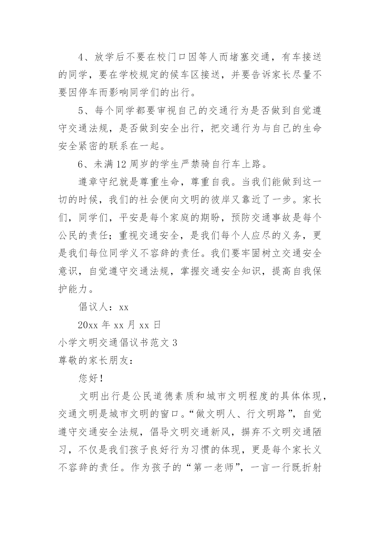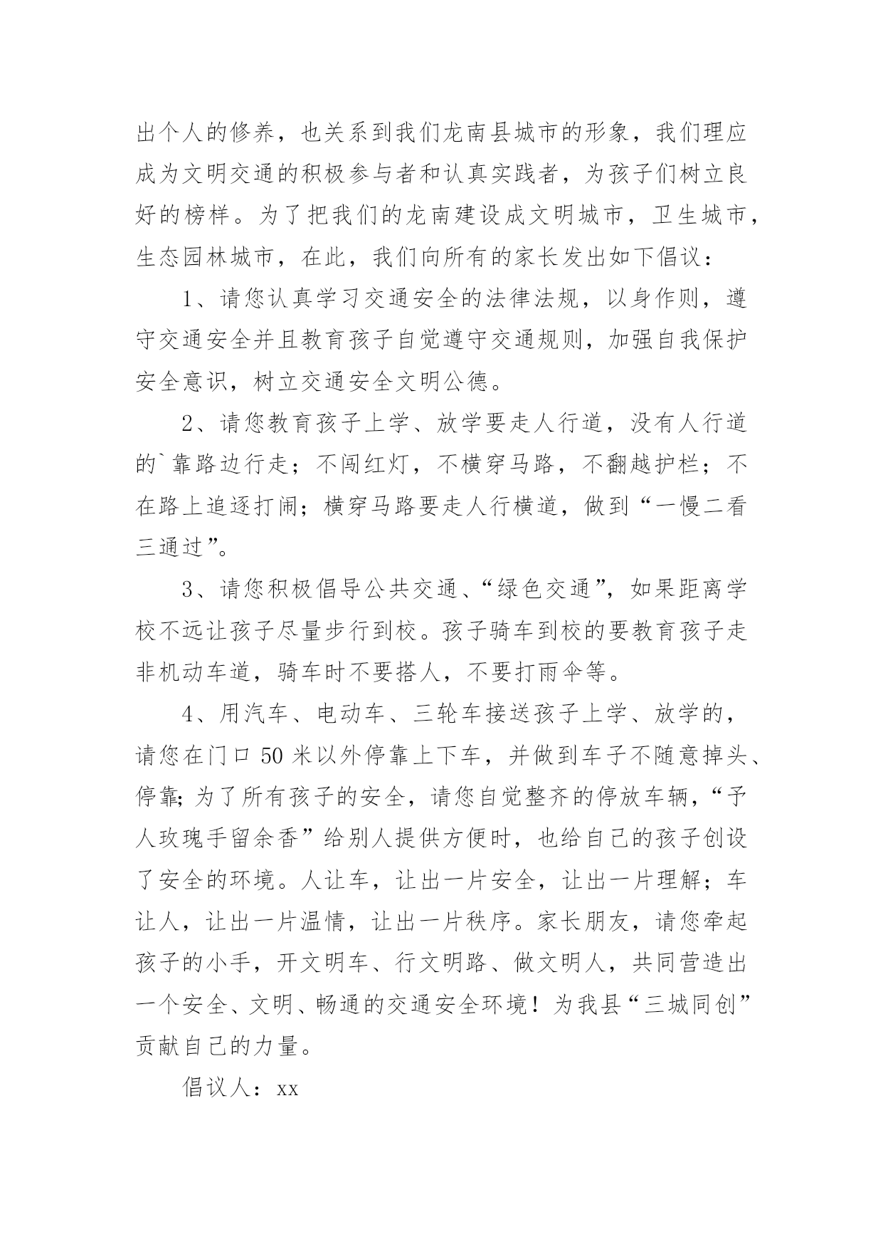 小学文明交通倡议书小学文明交通倡议书范文在现实社会中,很多地方都会使用到倡议书,倡议书是一种号召性的专用书信,具有一定的格式要求。那要怎么写好倡议书呢?下面是小编精心整理的小学文明交通倡议书范文,希望能够帮助到大家。小学文明交通倡议书范文1尊敬的各位领导、老师,亲爱的同学们:大家好!今天,县委宣传部、县公安局、县教育体育局在这里联合举办“文明交通进校园”活动启动仪式,为深入开展好此项活动,进一步增强我们的交通安全意识,使我们从小养成自觉遵守交通规则的良好习惯,全面展示我县中小学生文明守纪的良好风貌,营造安全、文明、和谐、稳定的社会环境,我代表全体少先队员向全县中小学生发出如下倡议:1、认真学习、宣传《中华人民共和国道路交通安全法》,从自身做起,增强交通安全意识,严格遵守交通法规。2、自觉遵守交通信号、交通标志、交通标线的有关规定,服从交通警察的指挥;通过有交通信号灯的路口时,应当遵照“红灯停、绿灯行,黄灯亮了等一等”的规定;不跨越交通护栏,不乱穿马路;过斑马线时要做到:先左看,后右看,再左看,然后安全通过。3、走路要走人行道,没有人行道要靠路的右边行走,不贪图方便而翻越、钻跨交通隔离护栏。4、等乘公交车时,站在站台或人行道上等候,车辆停稳后,遵守“先下后上”的规则,客车行驶中,不将身体的任何部分伸出车外;外出乘车不坐超员的客车,不坐农用车、三轮车、拖拉机等非客运车辆。5、爱护交通标志、标线,不随意移动、遮挡甚至破坏交通标志、标线;积极协助班级教师做好交通安全管理工作,发现不文明交通行为,应主动劝阻,对不听劝告的应向老师或学校值班领导反映;遇到交通事故应主动报警。6、每天放学,认真排好路队,尊重路队长的管理,遵守路队纪律,以路队旗为导向,按交通规则行走,做到高高兴兴上学,安安全全回家。7、做好文明交通宣传员,劝告自己的`家人、亲戚、同学要珍爱生命,严格遵守交通规则,安全乘车,安全骑车,安全走路。8、严格遵守“交通法规”,年龄未满12周岁,不在道路上骑自行车,更不能驾驶电动自行车和摩托车等。只要我们每个人都严守交通规则,我们的社会就会向着文明的方向又迈进一步。遵守交通规则要从我做起,从小事做起,从现在做起。同学们,为了家庭的幸福、社会的安定,让我们积极行动起来,自觉遵守交通规则,珍惜彼此宝贵的生命,让“文明交通”伴随我们一生平安,共同营造一个讲交通安全、守交通法规的良好氛围,一起走向更加光辉灿烂的美好明天!倡议人:xx20xx年xx月xx日小学文明交通倡议书范文2尊敬的家长亲爱的同学们:大家好!近年来,我市的道路建设突飞猛进,交通管理水平稳步上升,但闯红灯、酒后驾驶、逆向行驶等一些不文明的交通行为依然存在,与当前全市正在开展的“创建国家交通模范管理城市”的活动极不协调。自觉遵守交通安全法规,在全社会倡导文明交通新风,摒弃不文明交通陋习,这是我们每个人义不容辞的'责任。作为小小市民的我们,一言一行不仅折射出个人的修养,也关系到我市的对外形象,因此,我们理应成为文明交通的积极参与者、忠实践行者。在此,特向全校学生及家长发出以下倡议:1、我们要认真学习交通安全的法律法规,自觉遵守交通规则,加强自我保护安全意识,树立交通安全文明公德。2、当我们徒步行走于人来车往的马路时,请时刻保持清醒的头脑,不在马路上嬉戏打闹,密切注意机动车的行驶情况,预防道路交通事故的发生。3、当我们穿马路时,多一份谦让与耐心,不闯红灯,走人行横道,左右观察确认安全后方可过马路,绝不能为贪一时之快横穿马路或翻越护栏。4、放学后不要在校门口因等人而堵塞交通,有车接送的同学,要在学校规定的候车区接送,并要告诉家长尽量不要因停车而影响同学们的出行。5、每个同学都要审视自己的交通行为是否做到自觉遵守交通法规,是否做到安全出行,把交通行为与自己的生命安全紧密的联系在一起。6、未满12周岁的学生严禁骑自行车上路。遵章守纪就是尊重生命,尊重自我。当我们能做到这一切的时候,我们的社会便向文明的彼岸又靠近了一步。家长们,同学们,平安是每个家庭的期盼,预防交通事故是每个公民的责任;重视交通安全,是我们每个人应尽的义务,更是我们每位同学义不容辞的责任。我们要牢固树立交通安全意识,自觉遵守交通法规,掌握交通安全知识,提高自我保护能力。倡议人:xx20xx年xx月xx日小学文明交通倡议书范文3尊敬的家长朋友:您好!文明出行是公民道德素质和城市文明程度的具体体现,交通文明是城市文明的窗口。“做文明人、行文明路”,自觉遵守交通安全法规,倡导文明交通新风,摒弃不文明交通陋习,不仅是我们孩子良好行为习惯的体现,更是每个家长义不容辞的责任。作为孩子的“第一老师”,一言一行既折射出个人的修养,也关系到我们龙南县城市的形象,我们理应成为文明交通的积极参与者和认真实践者,为孩子们树立良好的榜样。为了把我们