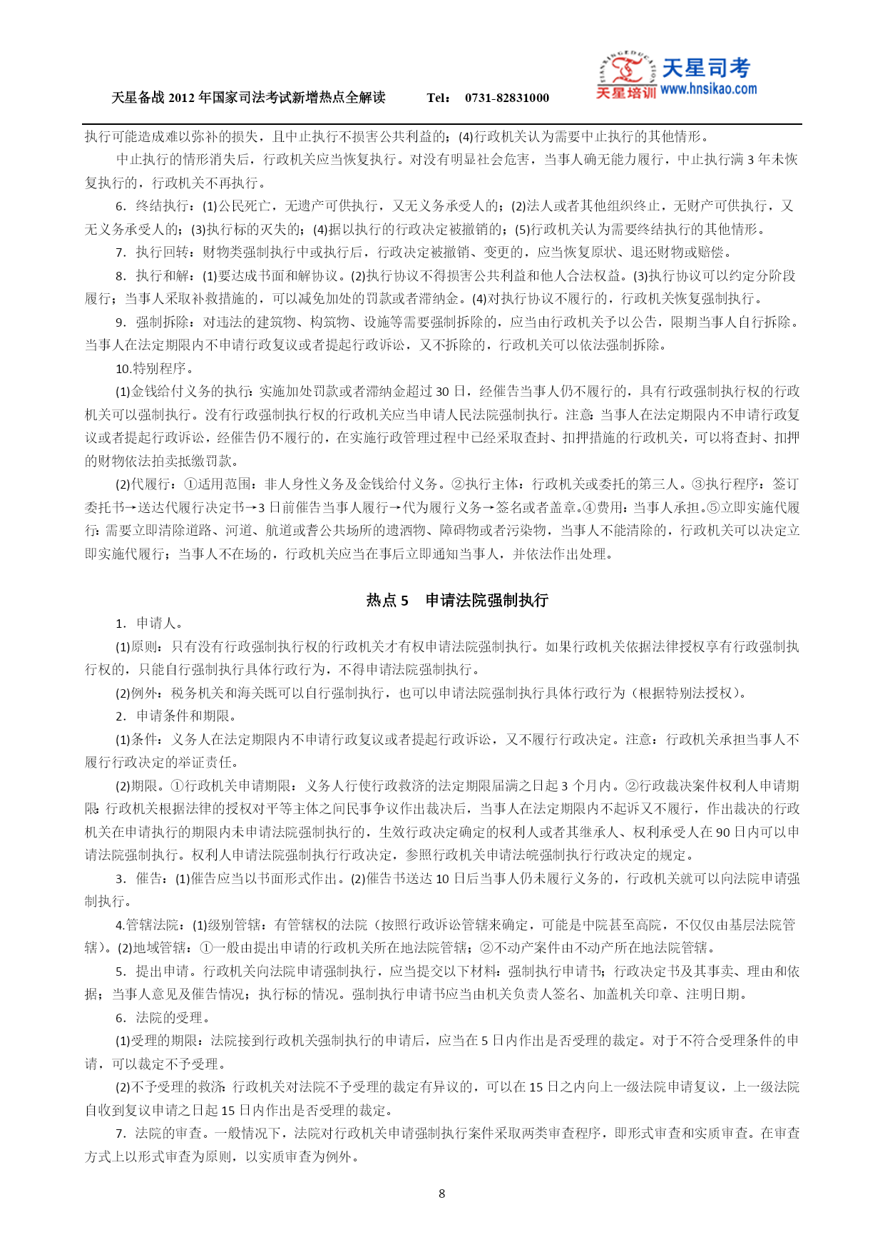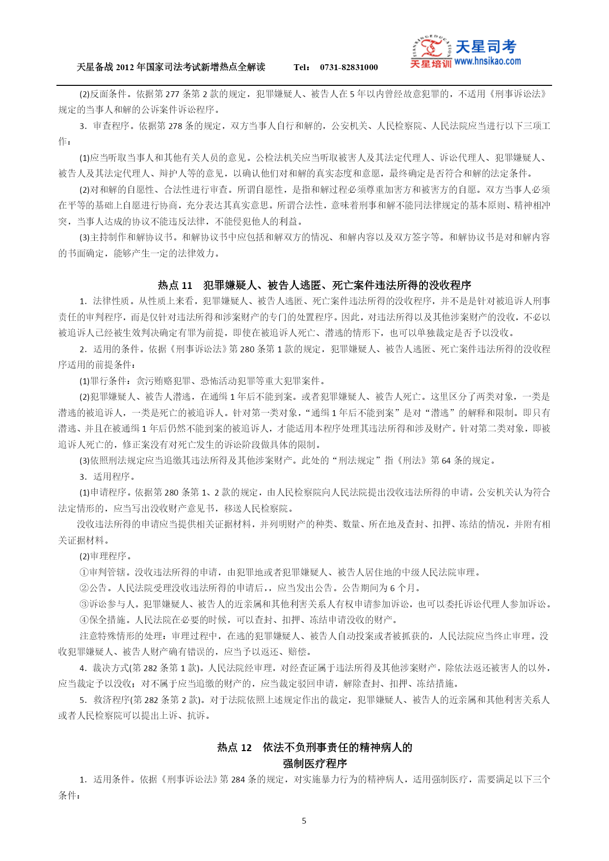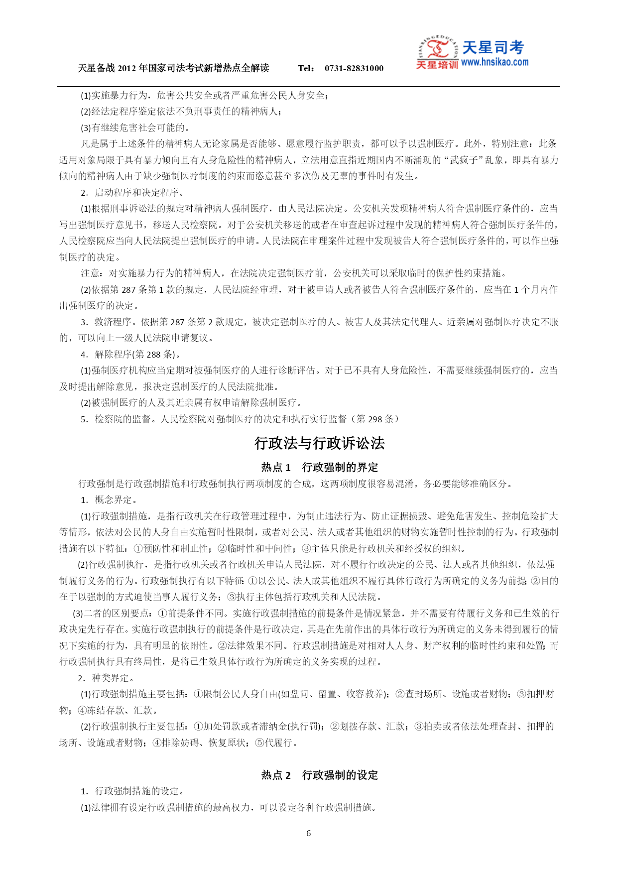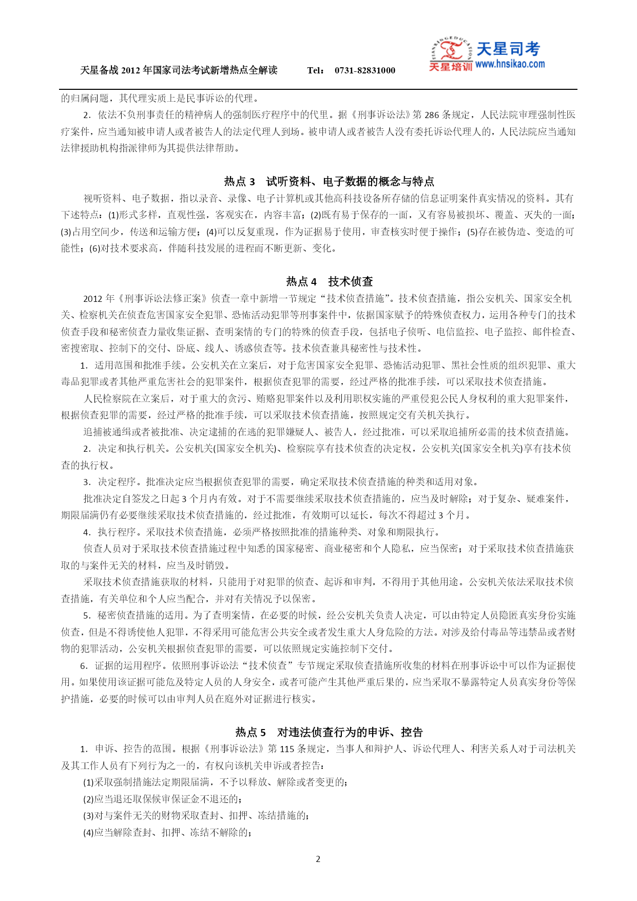 天星备战2012年国家司法考试新增热点全解读Tel:0731-82831000天星备战2012年国家司法考试新增热点全解读Tel:0731-82831000PAGE\*MERGEFORMAT28PAGE\*MERGEFORMAT272012年国家司法考试三校名师新增热点全解读刑法热点:刑罚的特征刑罚具有下列特征:本质上的严厉性。刑罚的属性在于对犯罪人权益的限制或剥夺,这表明它是一种最严厉的法律制裁措施。因为刑罚中的自由刑可以限制或剥夺犯罪人的人身自由,生命刑还可以剥夺犯罪人的生命,资格刑、财产刑可以剥夺犯罪人的政治权利和财产权利。这种严厉性正是刑罚区别于其他法律制裁方法的本质特征。适用对象的特定性。适用刑罚是以行为人的行为构成犯罪为前提的,刑罚是因犯罪行为所产生的当然的法律后果,是对犯罪行为所作出的否定评价。因此,刑罚处罚的对象只能是实施了犯罪行为的自然人或法人。犯罪人既是犯罪行为的实施者,也是刑罚的物质承担者。刑罚既不能适用于动植物和其他非人的对象,也不能适用于违反了道德、法纪和仅有一般违法行为的人,更不能适用于与犯罪无关的无辜者。根据的法定性。按照罪刑法定原则的要求,不仅犯罪需由成文刑法事先作出明文规定,而且刑罚也必须由刑法明文载于法条。这就意味着,刑法总则要对刑罚的种类作出明文规定。对刑法没有明文规定的制裁方法,不能以刑罚之名适用于犯罪分子。适用主体的单一性。刑罚适用的主体只能是代表国家行使审判权的人民法院。任何其他国家机关、企业、事业单位、人民团体和个人,都无权对犯罪人适用刑罚。提示:可以肯定的是对于刑罚的特征直接命题的可能性极小,简单了解即可,通过其可以辅助理解刑罚的具体适用。刑事诉讼法热点1法律援助辩护的概念、种类、适用阶段及其适用情形1.法律援助辩护,是指犯罪嫌疑人、被告人及其近亲属因经济困难或者其他原因没有委托辩护人而向法律援助机构申请的,或者具备法定情形时由公检法机关直接通知法律援助机构,由法律援助机构指派承担法律援助义务的律师为其提供辩护。2.据《刑事诉讼法》第34、267条规定,法律援助辩护分为申请法律援助和通知法律援助两种类别。(1)申请法律援助,指犯罪嫌疑人、被告人及其近亲属因经济困难或者其他原因没有委托辩护人的,本人及其近亲属可以向法律援助机构提出申请。对于符合条件的,法律援助机构应当指派律师为其提供辩护。(2)通知法律援助,指在具备法定情形时,由侦查、检察机关和人民法院直接通知法律援助机构指派律师提供辩护。通知法律援助具有强制性,一旦具备法定情形,根据案件所处的诉讼阶段,相应的办案机关承担通知法律援助机构的义务,而法律援助机构接到通知后应及时指派律师。据刑诉相关规定,犯罪嫌疑人、被告人具有下列情形时应当通知法律援助机构指派律师担任辩护人:盲、聋、哑人;未完全丧失辨认或控制自己行为能力的精神病人;可能被判处无期、死刑的人;未成年人。热点2犯罪嫌疑人、被告人逃匿、死亡案件违法所得没收程序、依法不负刑事责任的精神病人的强制医疗程序中的代理1.犯罪嫌疑人、被告人逃匿、死亡案件违法所得没收程序中的代理。据《刑事诉讼法》第281条第2款规定,犯罪嫌疑人、被告人的近亲属和其他利害关系人有权申请参加诉讼,也可以委托诉讼代理人参加诉讼。这种程序解决的是民事权利的归属问题,其代理实质上是民事诉讼的代理。2.依法不负刑事责任的精神病人的强制医疗程序中的代里。据《刑事诉讼法》第286条规定,人民法院审理强制性医疗案件,应当通知被申请人或者被告人的法定代理人到场。被申请人或者被告人没有委托诉讼代理人的,人民法院应当通知法律援助机构指派律师为其提供法律帮助。热点3试听资料、电子数据的概念与特点视听资料、电子数据,指以录音、录像、电子计算机或其他高科技设备所存储的信息证明案件真实情况的资料。其有下述特点:(1)形式多样,直观性强,客观实在,内容丰富;(2)既有易于保存的一面,又有容易被损坏、覆盖、灭失的一面;(3)占用空间少,传送和运输方便;(4)可以反复重现,作为证据易于使用,审查核实时便于操作;(5)存在被伪造、变造的可能性;(6)对技术要求高,伴随科技发展的进程而不断更新、变化。热点4技术侦查2012年《刑事诉讼法修正案》侦查一章中新增一节规定“技术侦查措施”。技术侦查措施,指公安机关、国家安全机关、检察机关在侦查危害国家安全犯罪、恐怖活动犯罪等刑事案件中,依据国家赋予的特殊侦查权力,运用各种专门的技术侦查手段和秘密侦查力量收集证据、查明案情的专门的特殊的侦查手段,包括电子侦听、电信监控、电子监控、邮件检查、密搜密取、控制下的交付、卧底、线人、诱惑侦查等。技术侦查兼具秘密性与技术性。1.适用范围和批准手续。公安机关在立案后,对于危