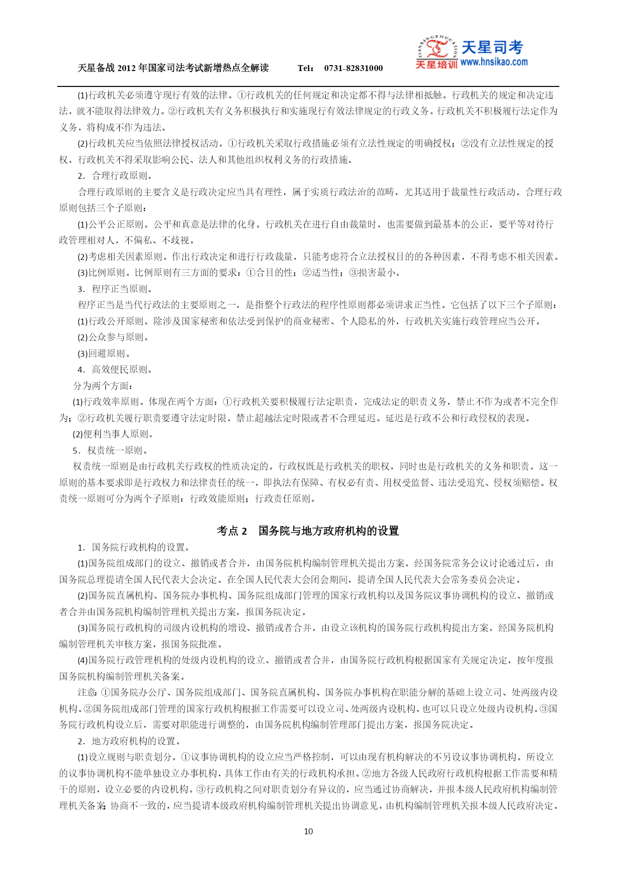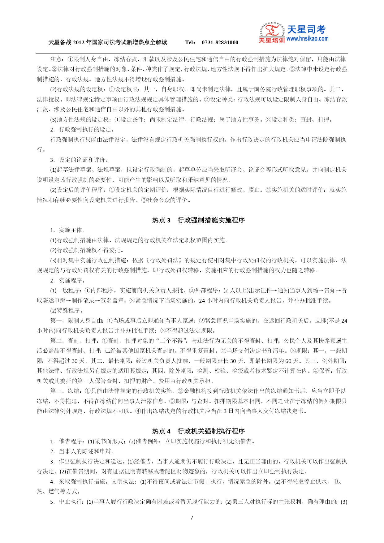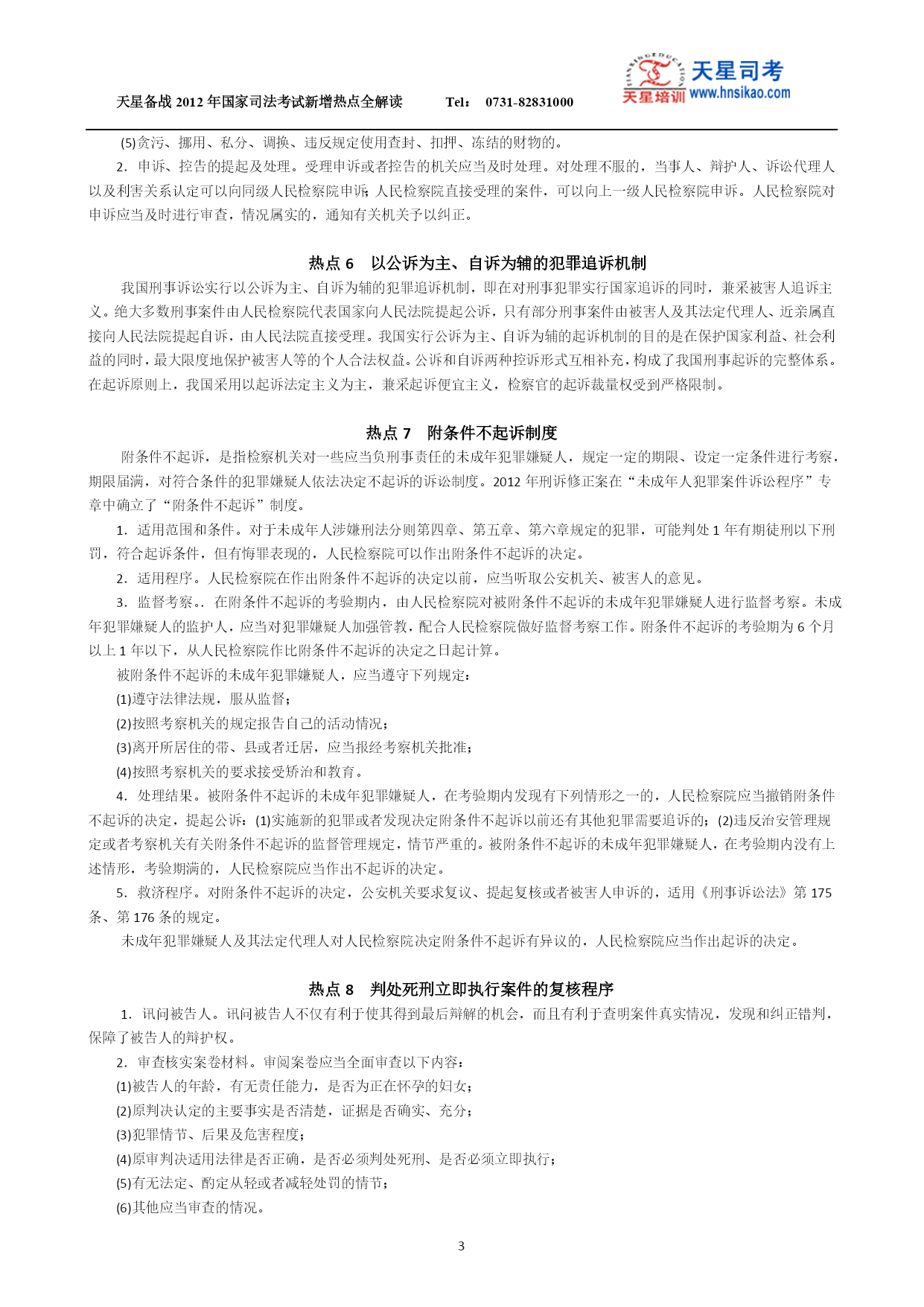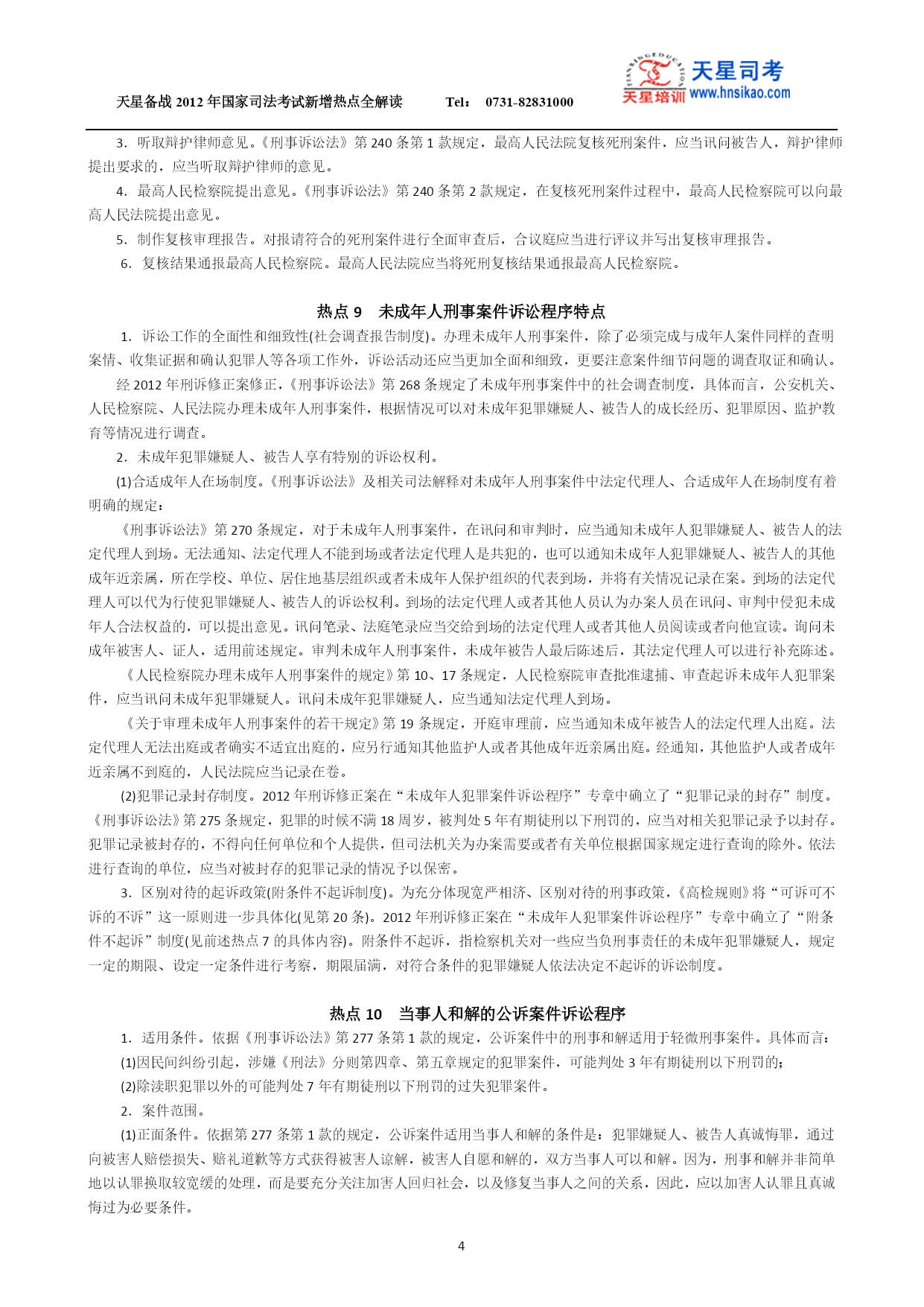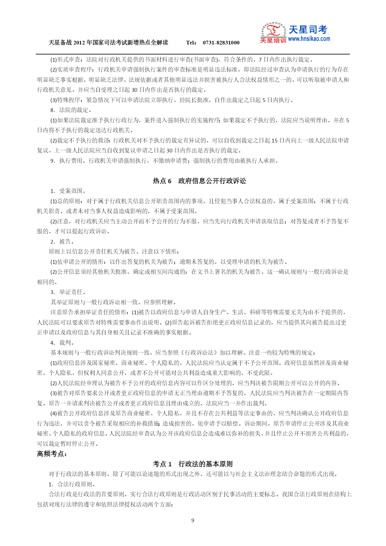 天星备战2012年国家司法考试新增热点全解读Tel:0731-82831000天星备战2012年国家司法考试新增热点全解读Tel:0731-82831000PAGE\*MERGEFORMAT28PAGE\*MERGEFORMAT272012年国家司法考试三校名师新增热点全解读刑法热点:刑罚的特征刑罚具有下列特征:本质上的严厉性。刑罚的属性在于对犯罪人权益的限制或剥夺,这表明它是一种最严厉的法律制裁措施。因为刑罚中的自由刑可以限制或剥夺犯罪人的人身自由,生命刑还可以剥夺犯罪人的生命,资格刑、财产刑可以剥夺犯罪人的政治权利和财产权利。这种严厉性正是刑罚区别于其他法律制裁方法的本质特征。适用对象的特定性。适用刑罚是以行为人的行为构成犯罪为前提的,刑罚是因犯罪行为所产生的当然的法律后果,是对犯罪行为所作出的否定评价。因此,刑罚处罚的对象只能是实施了犯罪行为的自然人或法人。犯罪人既是犯罪行为的实施者,也是刑罚的物质承担者。刑罚既不能适用于动植物和其他非人的对象,也不能适用于违反了道德、法纪和仅有一般违法行为的人,更不能适用于与犯罪无关的无辜者。根据的法定性。按照罪刑法定原则的要求,不仅犯罪需由成文刑法事先作出明文规定,而且刑罚也必须由刑法明文载于法条。这就意味着,刑法总则要对刑罚的种类作出明文规定。对刑法没有明文规定的制裁方法,不能以刑罚之名适用于犯罪分子。适用主体的单一性。刑罚适用的主体只能是代表国家行使审判权的人民法院。任何其他国家机关、企业、事业单位、人民团体和个人,都无权对犯罪人适用刑罚。提示:可以肯定的是对于刑罚的特征直接命题的可能性极小,简单了解即可,通过其可以辅助理解刑罚的具体适用。刑事诉讼法热点1法律援助辩护的概念、种类、适用阶段及其适用情形1.法律援助辩护,是指犯罪嫌疑人、被告人及其近亲属因经济困难或者其他原因没有委托辩护人而向法律援助机构申请的,或者具备法定情形时由公检法机关直接通知法律援助机构,由法律援助机构指派承担法律援助义务的律师为其提供辩护。2.据《刑事诉讼法》第34、267条规定,法律援助辩护分为申请法律援助和通知法律援助两种类别。(1)申请法律援助,指犯罪嫌疑人、被告人及其近亲属因经济困难或者其他原因没有委托辩护人的,本人及其近亲属可以向法律援助机构提出申请。对于符合条件的,法律援助机构应当指派律师为其提供辩护。(2)通知法律援助,指在具备法定情形时,由侦查、检察机关和人民法院直接通知法律援助机构指派律师提供辩护。通知法律援助具有强制性,一旦具备法定情形,根据案件所处的诉讼阶段,相应的办案机关承担通知法律援助机构的义务,而法律援助机构接到通知后应及时指派律师。据刑诉相关规定,犯罪嫌疑人、被告人具有下列情形时应当通知法律援助机构指派律师担任辩护人:盲、聋、哑人;未完全丧失辨认或控制自己行为能力的精神病人;可能被判处无期、死刑的人;未成年人。热点2犯罪嫌疑人、被告人逃匿、死亡案件违法所得没收程序、依法不负刑事责任的精神病人的强制医疗程序中的代理1.犯罪嫌疑人、被告人逃匿、死亡案件违法所得没收程序中的代理。据《刑事诉讼法》第281条第2款规定,犯罪嫌疑人、被告人的近亲属和其他利害关系人有权申请参加诉讼,也可以委托诉讼代理人参加诉讼。这种程序解决的是民事权利的归属问题,其代理实质上是民事诉讼的代理。2.依法不负刑事责任的精神病人的强制医疗程序中的代里。据《刑事诉讼法》第286条规定,人民法院审理强制性医疗案件,应当通知被申请人或者被告人的法定代理人到场。被申请人或者被告人没有委托诉讼代理人的,人民法院应当通知法律援助机构指派律师为其提供法律帮助。热点3试听资料、电子数据的概念与特点视听资料、电子数据,指以录音、录像、电子计算机或其他高科技设备所存储的信息证明案件真实情况的资料。其有下述特点:(1)形式多样,直观性强,客观实在,内容丰富;(2)既有易于保存的一面,又有容易被损坏、覆盖、灭失的一面;(3)占用空间少,传送和运输方便;(4)可以反复重现,作为证据易于使用,审查核实时便于操作;(5)存在被伪造、变造的可能性;(6)对技术要求高,伴随科技发展的进程而不断更新、变化。热点4技术侦查2012年《刑事诉讼法修正案》侦查一章中新增一节规定“技术侦查措施”。技术侦查措施,指公安机关、国家安全机关、检察机关在侦查危害国家安全犯罪、恐怖活动犯罪等刑事案件中,依据国家赋予的特殊侦查权力,运用各种专门的技术侦查手段和秘密侦查力量收集证据、查明案情的专门的特殊的侦查手段,包括电子侦听、电信监控、电子监控、邮件检查、密搜密取、控制下的交付、卧底、线人、诱惑侦查等。技术侦查兼具秘密性与技术性。1.适用范围和批准手续。公安机关在立案后,对于危