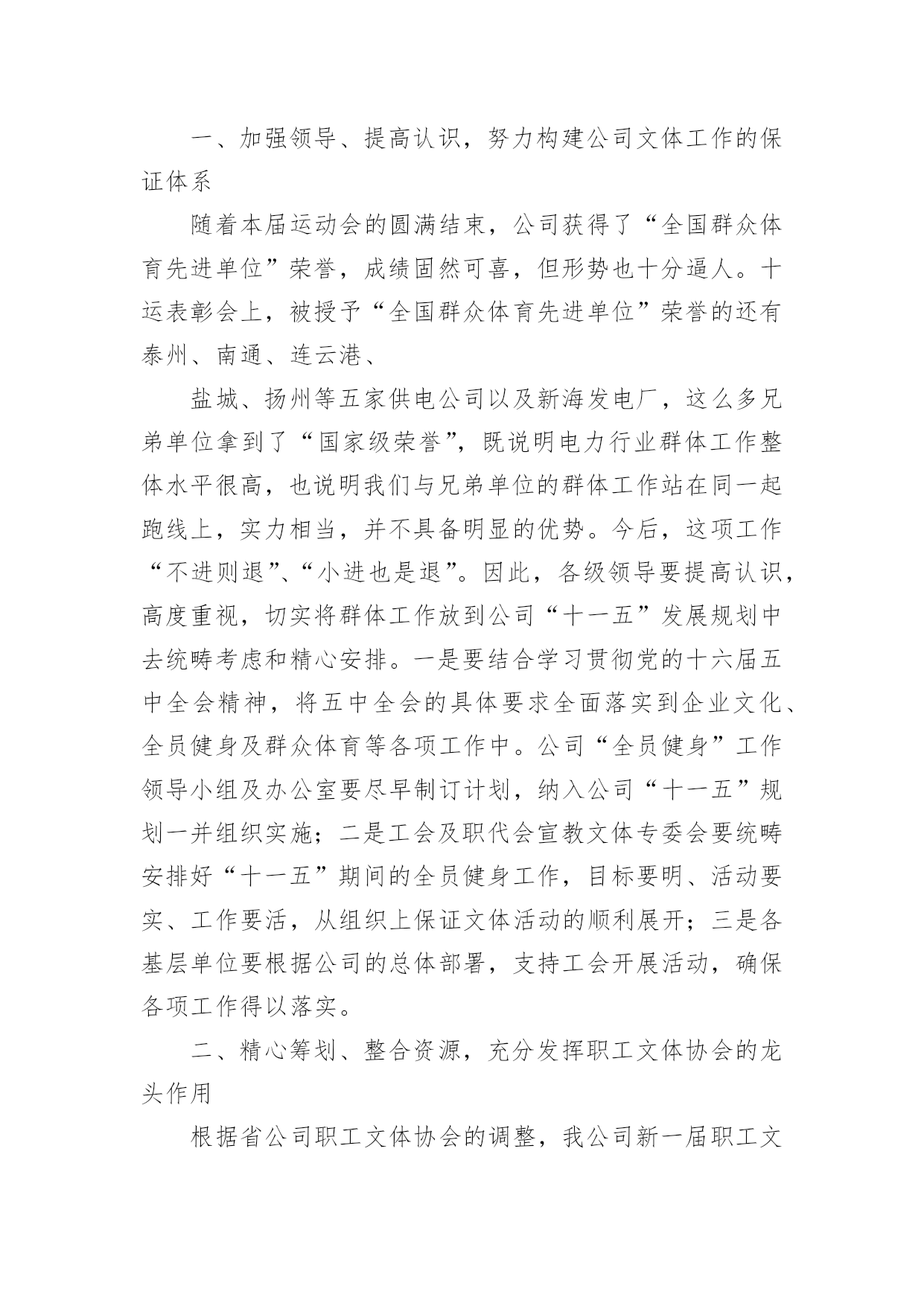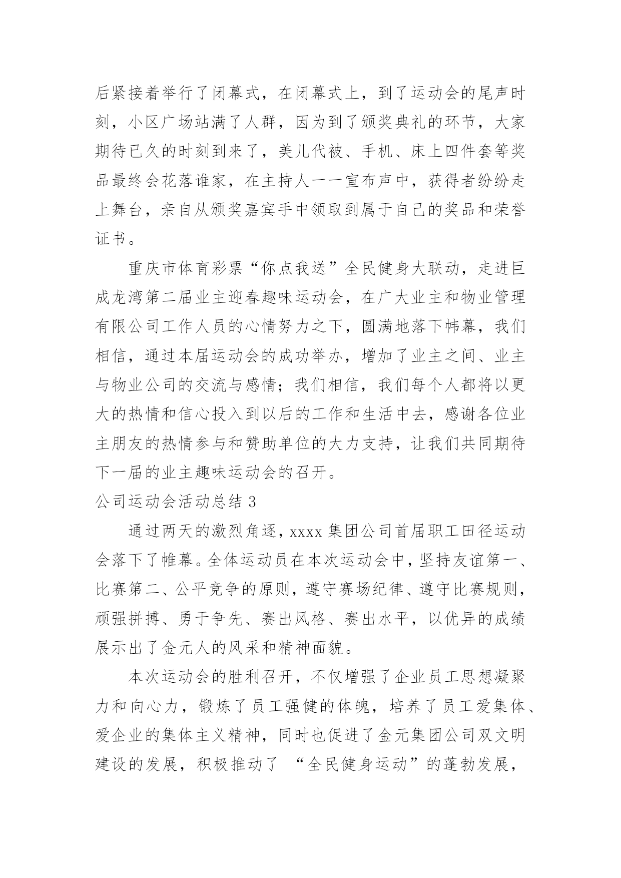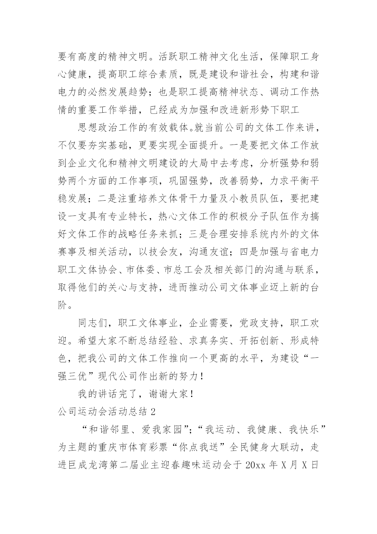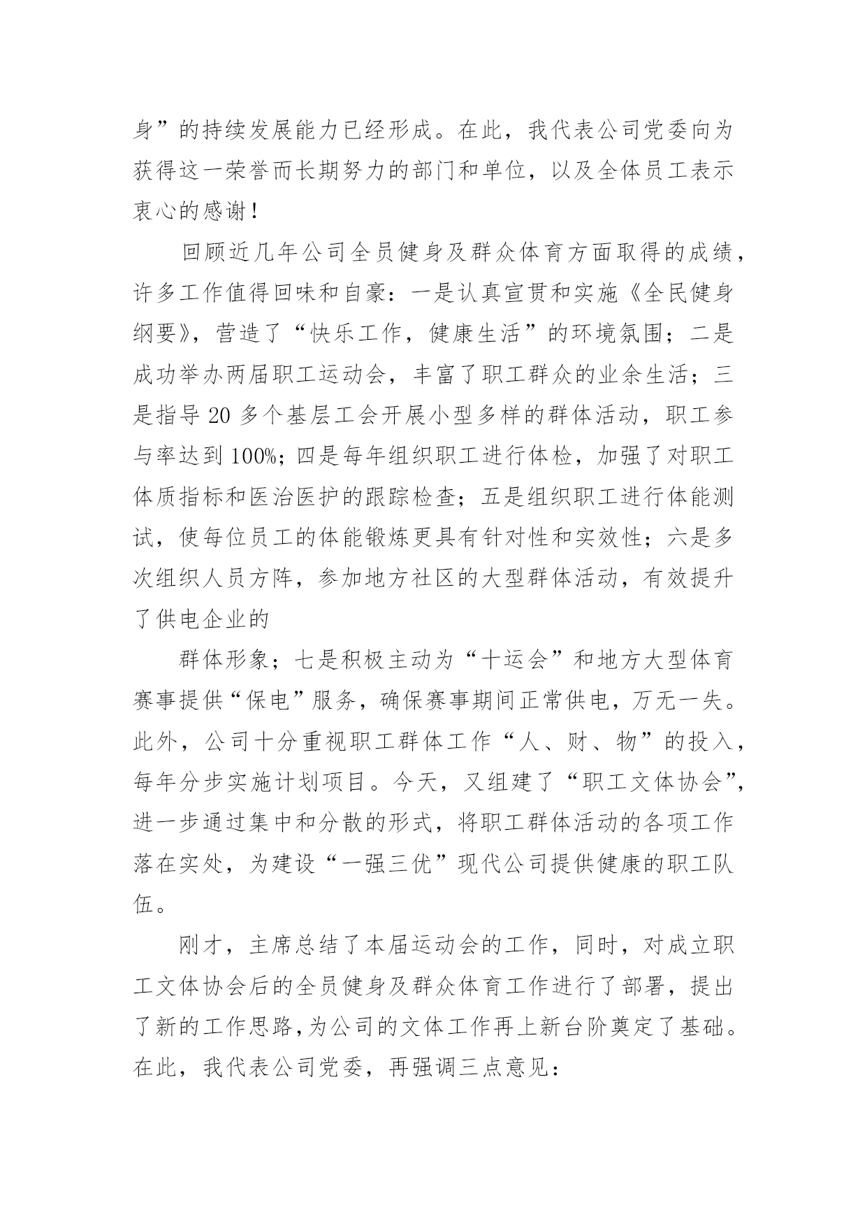 公司运动会活动总结公司运动会活动总结总结在一个时期、一个年度、一个阶段对学习和工作生活等情况加以回顾和分析的一种书面材料,它可以使我们更有效率,因此我们要做好归纳,写好总结。那么你真的懂得怎么写总结吗?下面是小编收集整理的公司运动会活动总结,欢迎阅读与收藏。公司运动会活动总结1同志们:在全国十运会胜利闭幕不久,展示公司良好精神风貌和企业形象的第二届职工运动,今天就要胜利闭幕了。我代表公司党政工领导和大赛组委会,向取得优异成绩的各代表队和运动员表示热烈的祝贺!近日,公司被国家体育总局授予“全国群众体育先进单位”的荣誉称号,这是全公司的一件大事。,我们在公司第一届职工运动会后,获得了“江苏省群众体育先进单位”称号,在时隔三年的第二届职工运动会后,公司又取得“全国群众体育先进单位”称号,三年跨上新台阶,这一荣誉的取得来之不易,具有很大的意义。不仅表明了公司的企业文化和精神文明建设再次取得丰硕成果,更表明了公司“全员健身”的持续发展能力已经形成。在此,我代表公司党委向为获得这一荣誉而长期努力的部门和单位,以及全体员工表示衷心的感谢!回顾近几年公司全员健身及群众体育方面取得的成绩,许多工作值得回味和自豪:一是认真宣贯和实施《全民健身纲要》,营造了“快乐工作,健康生活”的环境氛围;二是成功举办两届职工运动会,丰富了职工群众的业余生活;三是指导20多个基层工会开展小型多样的群体活动,职工参与率达到100%;四是每年组织职工进行体检,加强了对职工体质指标和医治医护的跟踪检查;五是组织职工进行体能测试,使每位员工的体能锻炼更具有针对性和实效性;六是多次组织人员方阵,参加地方社区的大型群体活动,有效提升了供电企业的群体形象;七是积极主动为“十运会”和地方大型体育赛事提供“保电”服务,确保赛事期间正常供电,万无一失。此外,公司十分重视职工群体工作“人、财、物”的投入,每年分步实施计划项目。今天,又组建了“职工文体协会”,进一步通过集中和分散的形式,将职工群体活动的各项工作落在实处,为建设“一强三优”现代公司提供健康的职工队伍。刚才,主席总结了本届运动会的工作,同时,对成立职工文体协会后的全员健身及群众体育工作进行了部署,提出了新的工作思路,为公司的文体工作再上新台阶奠定了基础。在此,我代表公司党委,再强调三点意见:一、加强领导、提高认识,努力构建公司文体工作的保证体系随着本届运动会的圆满结束,公司获得了“全国群众体育先进单位”荣誉,成绩固然可喜,但形势也十分逼人。十运表彰会上,被授予“全国群众体育先进单位”荣誉的还有泰州、南通、连云港、盐城、扬州等五家供电公司以及新海发电厂,这么多兄弟单位拿到了“国家级荣誉”,既说明电力行业群体工作整体水平很高,也说明我们与兄弟单位的群体工作站在同一起跑线上,实力相当,并不具备明显的优势。今后,这项工作“不进则退”、“小进也是退”。因此,各级领导要提高认识,高度重视,切实将群体工作放到公司“十一五”发展规划中去统畴考虑和精心安排。一是要结合学习贯彻党的十六届五中全会精神,将五中全会的具体要求全面落实到企业文化、全员健身及群众体育等各项工作中。公司“全员健身”工作领导小组及办公室要尽早制订计划,纳入公司“十一五”规划一并组织实施;二是工会及职代会宣教文体专委会要统畴安排好“十一五”期间的全员健身工作,目标要明、活动要实、工作要活,从组织上保证文体活动的顺利展开;三是各基层单位要根据公司的总体部署,支持工会开展活动,确保各项工作得以落实。二、精心筹划、整合资源,充分发挥职工文体协会的龙头作用根据省公司职工文体协会的调整,我公司新一届职工文体协会经过前一阶段的精心筹划,于今天正式成立,并对协会的组织机构、活动方式,挂靠单位进行了明确,确定了1个省公司项目,9个市公司项目的挂靠单位及负责人,这既是一次有效的职工文体活动的资源整合,更是动员和组织各级力量深入开展文体活动、不断满足职工精神文化需求的必然要求。要充分发挥好职工文体协会的龙头作用,必须落实好四点要求:一是要牢牢把握住“科学发展观、以人为本、构建和谐企业”这三个核心内涵,将过去以竞技性为主的文体活动逐步向全员参与的常态文体活动转变;二是工会要充分发挥好文体协会的组织协调作用,每年采用集中和分散相结合的形式,适度安排文体赛事和全员健身活动,做到有计划、有实施、有检查、有考核、有奖惩;三是结合新大楼的使用,超前考虑职工活动中心的布局,为职工创造一个更加优良的文体活动环境。同时,工会也要主动关心支持各基层单位“职工之家”的建设与投入;四是各文体协会分会要积极主动地安排好分会的文体赛事,承担起相应的责任,培养组织工作能力,培训人才队伍,培育“大家庭”的情感与氛围。通过职工喜闻乐见的活动,凝聚人心,实现职工的全面发展,推动“一强三优”现代公司的建设。三、夯实基础,全面提升