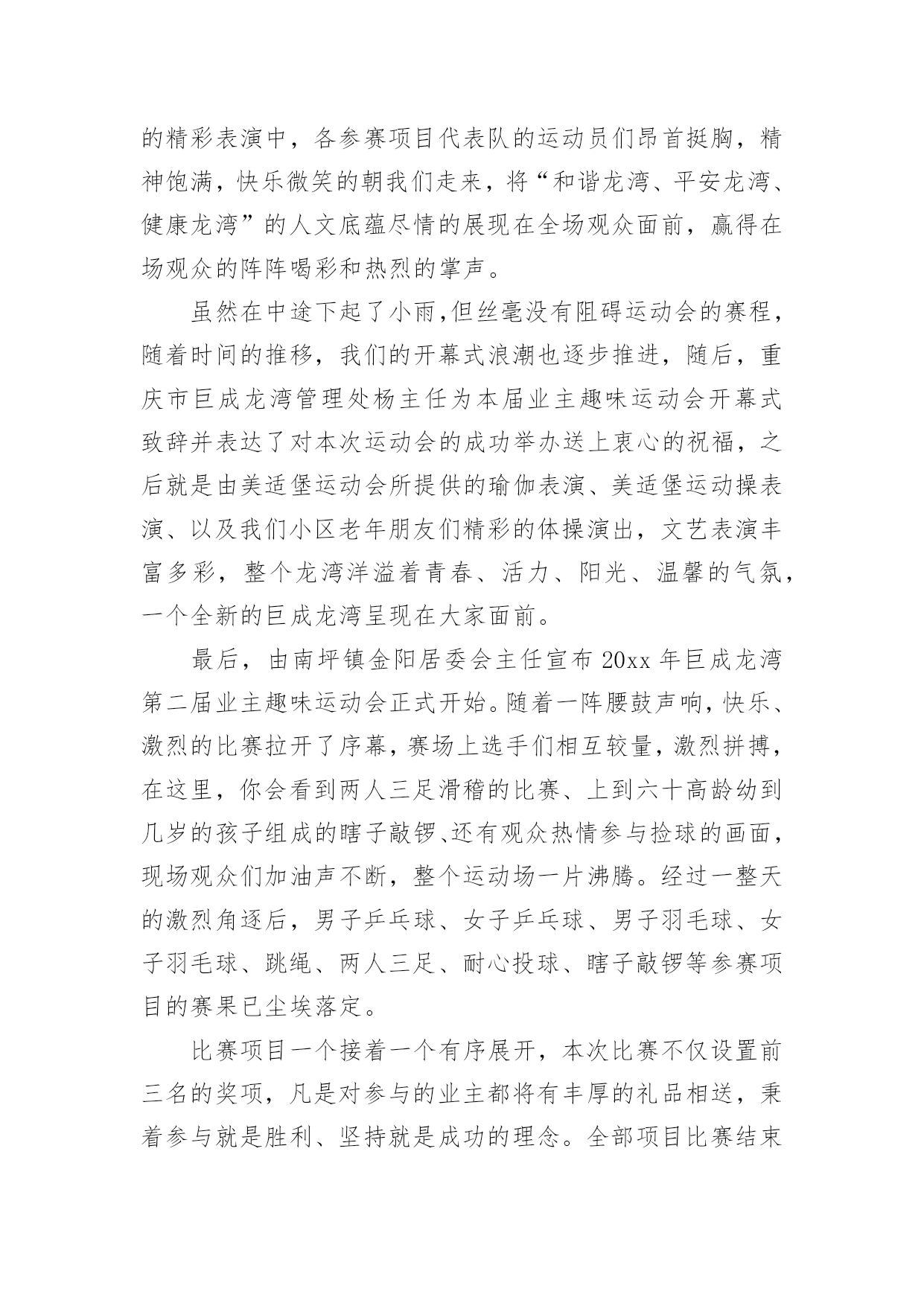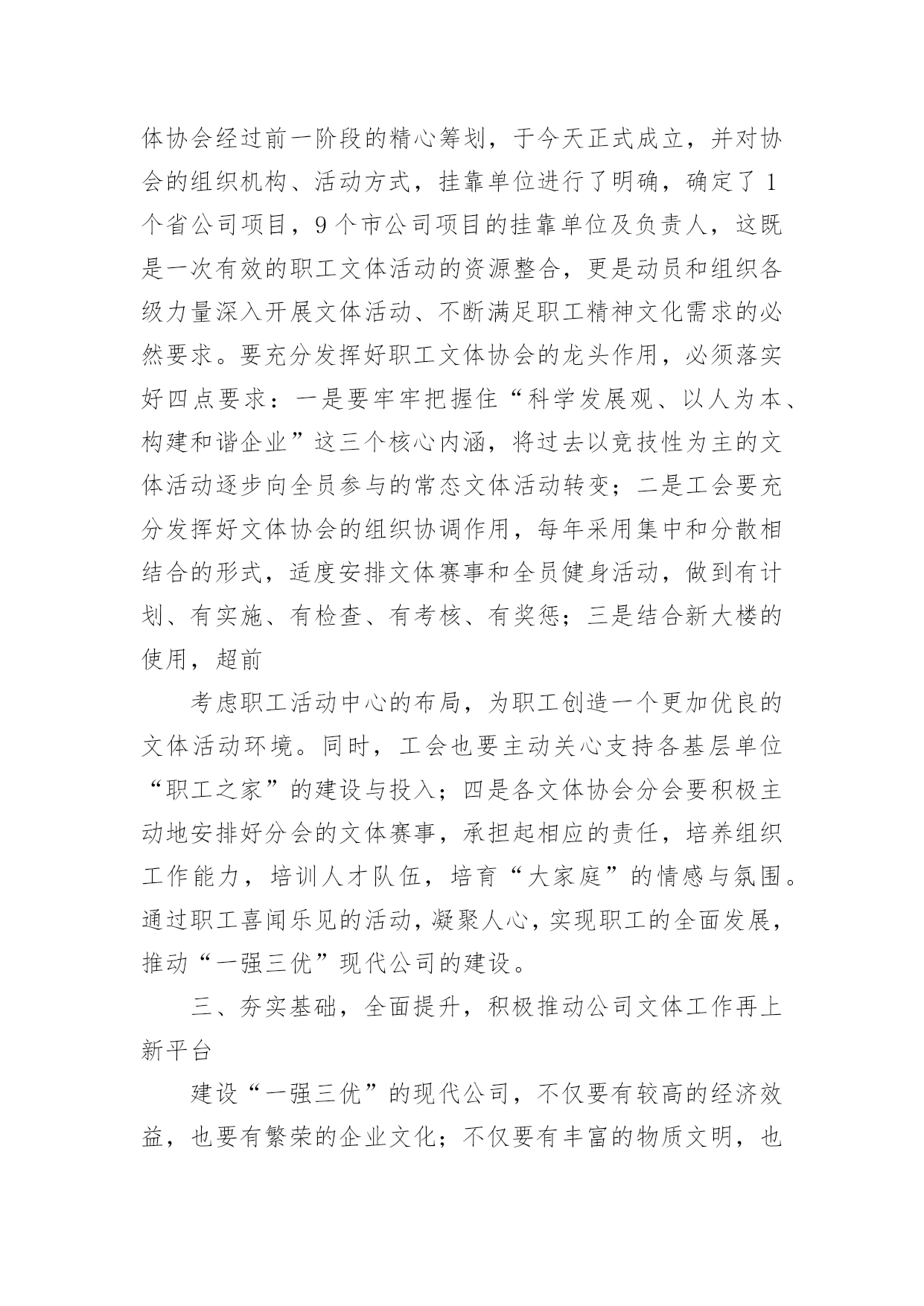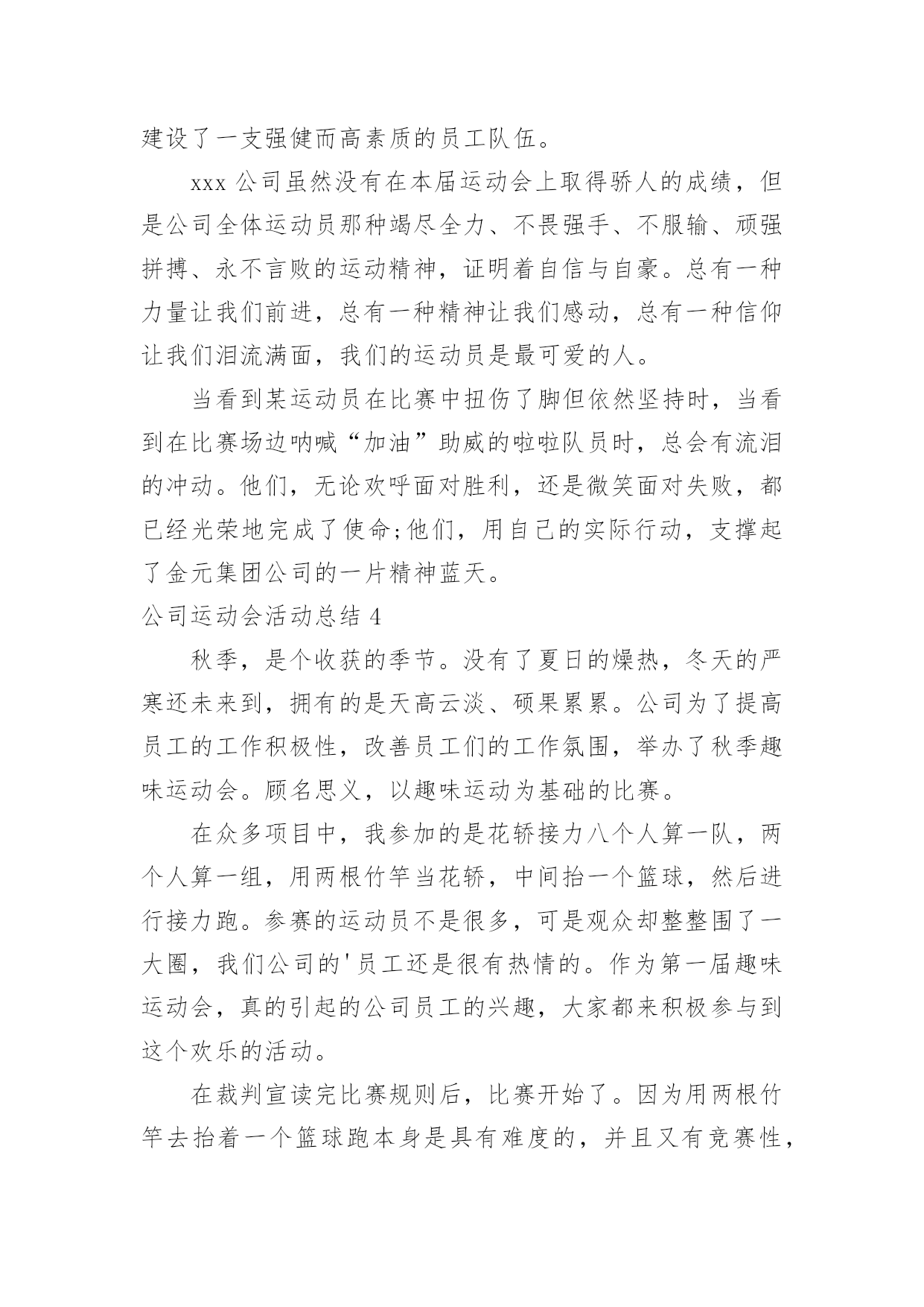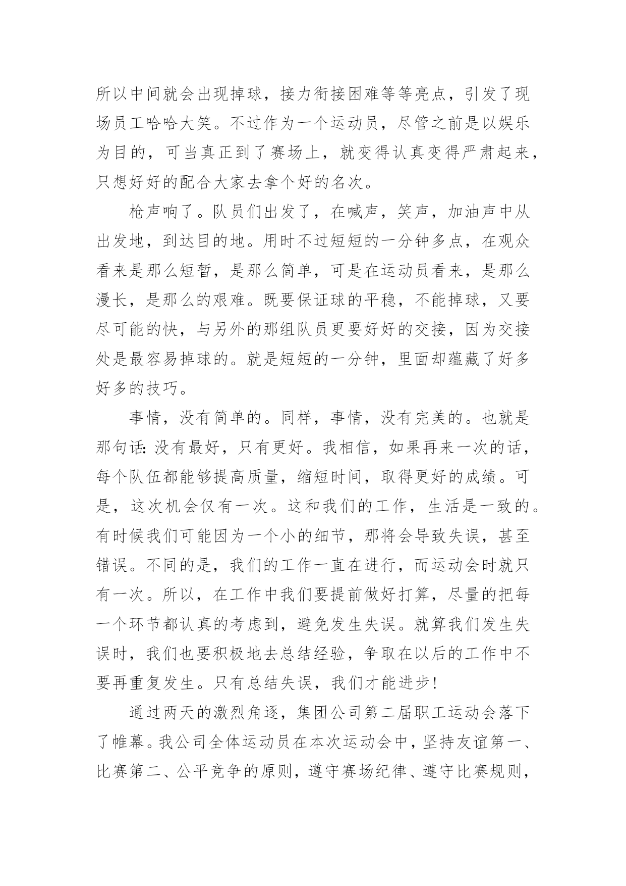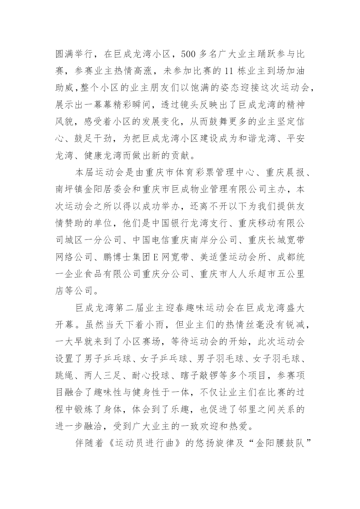公司运动会活动总结公司运动会活动总结总结在一个时期、一个年度、一个阶段对学习和工作生活等情况加以回顾和分析的一种书面材料,它可以使我们更有效率,因此我们要做好归纳,写好总结。那么你真的懂得怎么写总结吗?下面是小编收集整理的公司运动会活动总结,欢迎阅读与收藏。公司运动会活动总结1同志们:在全国十运会胜利闭幕不久,展示公司良好精神风貌和企业形象的第二届职工运动,今天就要胜利闭幕了。我代表公司党政工领导和大赛组委会,向取得优异成绩的各代表队和运动员表示热烈的祝贺!近日,公司被国家体育总局授予“全国群众体育先进单位”的荣誉称号,这是全公司的一件大事。,我们在公司第一届职工运动会后,获得了“江苏省群众体育先进单位”称号,在时隔三年的第二届职工运动会后,公司又取得“全国群众体育先进单位”称号,三年跨上新台阶,这一荣誉的取得来之不易,具有很大的意义。不仅表明了公司的企业文化和精神文明建设再次取得丰硕成果,更表明了公司“全员健身”的持续发展能力已经形成。在此,我代表公司党委向为获得这一荣誉而长期努力的部门和单位,以及全体员工表示衷心的感谢!回顾近几年公司全员健身及群众体育方面取得的成绩,许多工作值得回味和自豪:一是认真宣贯和实施《全民健身纲要》,营造了“快乐工作,健康生活”的环境氛围;二是成功举办两届职工运动会,丰富了职工群众的业余生活;三是指导20多个基层工会开展小型多样的群体活动,职工参与率达到100%;四是每年组织职工进行体检,加强了对职工体质指标和医治医护的跟踪检查;五是组织职工进行体能测试,使每位员工的体能锻炼更具有针对性和实效性;六是多次组织人员方阵,参加地方社区的大型群体活动,有效提升了供电企业的群体形象;七是积极主动为“十运会”和地方大型体育赛事提供“保电”服务,确保赛事期间正常供电,万无一失。此外,公司十分重视职工群体工作“人、财、物”的投入,每年分步实施计划项目。今天,又组建了“职工文体协会”,进一步通过集中和分散的形式,将职工群体活动的各项工作落在实处,为建设“一强三优”现代公司提供健康的职工队伍。刚才,主席总结了本届运动会的工作,同时,对成立职工文体协会后的全员健身及群众体育工作进行了部署,提出了新的工作思路,为公司的文体工作再上新台阶奠定了基础。在此,我代表公司党委,再强调三点意见:一、加强领导、提高认识,努力构建公司文体工作的保证体系随着本届运动会的圆满结束,公司获得了“全国群众体育先进单位”荣誉,成绩固然可喜,但形势也十分逼人。十运表彰会上,被授予“全国群众体育先进单位”荣誉的还有泰州、南通、连云港、盐城、扬州等五家供电公司以及新海发电厂,这么多兄弟单位拿到了“国家级荣誉”,既说明电力行业群体工作整体水平很高,也说明我们与兄弟单位的群体工作站在同一起跑线上,实力相当,并不具备明显的优势。今后,这项工作“不进则退”、“小进也是退”。因此,各级领导要提高认识,高度重视,切实将群体工作放到公司“十一五”发展规划中去统畴考虑和精心安排。一是要结合学习贯彻党的十六届五中全会精神,将五中全会的具体要求全面落实到企业文化、全员健身及群众体育等各项工作中。公司“全员健身”工作领导小组及办公室要尽早制订计划,纳入公司“十一五”规划一并组织实施;二是工会及职代会宣教文体专委会要统畴安排好“十一五”期间的全员健身工作,目标要明、活动要实、工作要活,从组织上保证文体活动的顺利展开;三是各基层单位要根据公司的总体部署,支持工会开展活动,确保各项工作得以落实。二、精心筹划、整合资源,充分发挥职工文体协会的龙头作用根据省公司职工文体协会的调整,我公司新一届职工文体协会经过前一阶段的精心筹划,于今天正式成立,并对协会的组织机构、活动方式,挂靠单位进行了明确,确定了1个省公司项目,9个市公司项目的挂靠单位及负责人,这既是一次有效的职工文体活动的资源整合,更是动员和组织各级力量深入开展文体活动、不断满足职工精神文化需求的必然要求。要充分发挥好职工文体协会的龙头作用,必须落实好四点要求:一是要牢牢把握住“科学发展观、以人为本、构建和谐企业”这三个核心内涵,将过去以竞技性为主的文体活动逐步向全员参与的常态文体活动转变;二是工会要充分发挥好文体协会的组织协调作用,每年采用集中和分散相结合的形式,适度安排文体赛事和全员健身活动,做到有计划、有实施、有检查、有考核、有奖惩;三是结合新大楼的使用,超前考虑职工活动中心的布局,为职工创造一个更加优良的文体活动环境。同时,工会也要主动关心支持各基层单位“职工之家”的建设与投入;四是各文体协会分会要积极主动地安排好分会的文体赛事,承担起相应的责任,培养组织工作能力,培训人才队伍,培育“大家庭”的情感与氛围。通过职工喜闻乐见的活动,凝聚人心,实现职工的全面发展,推动“一强三优”现代公司的建设。三、夯实基础,全面提升