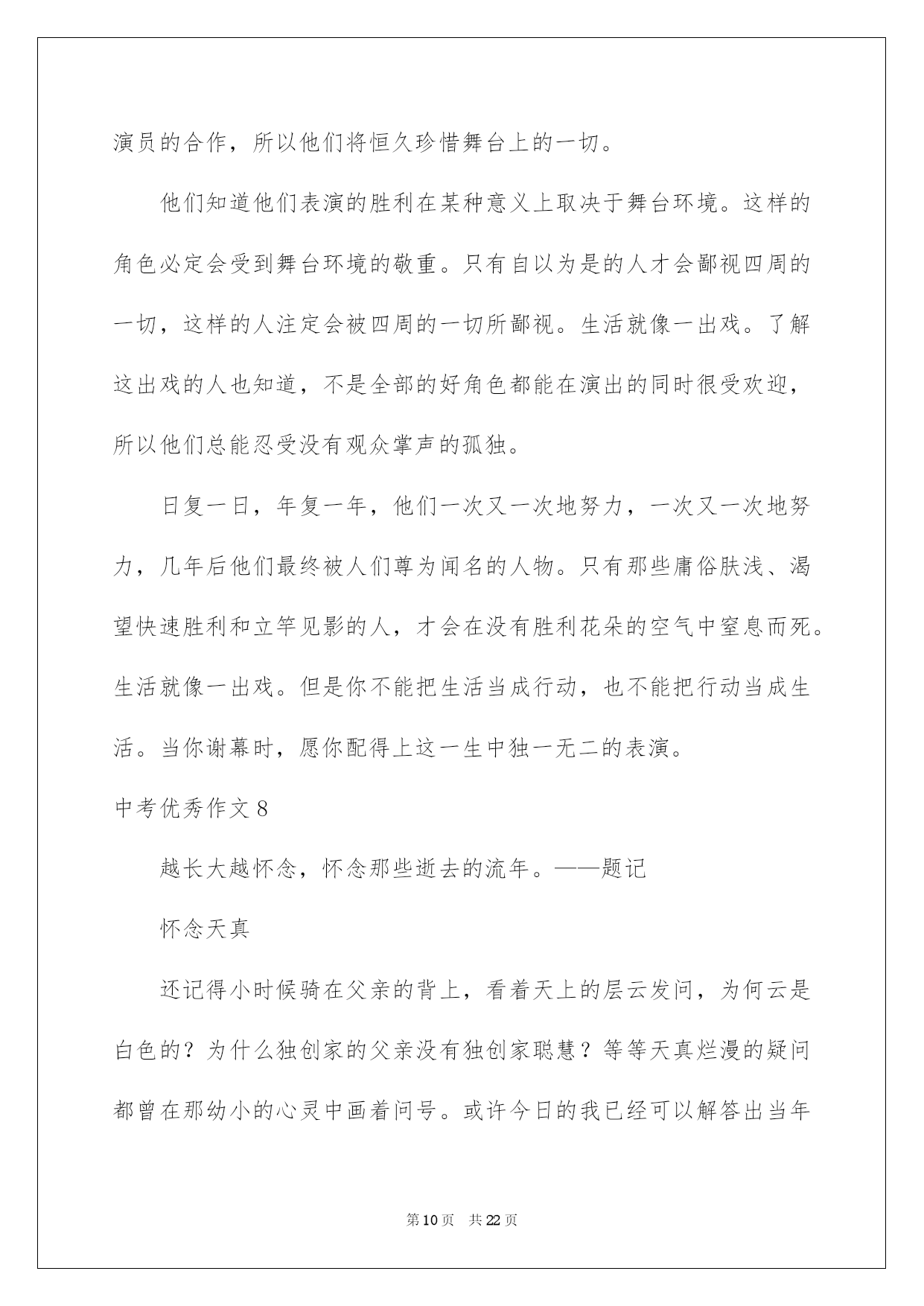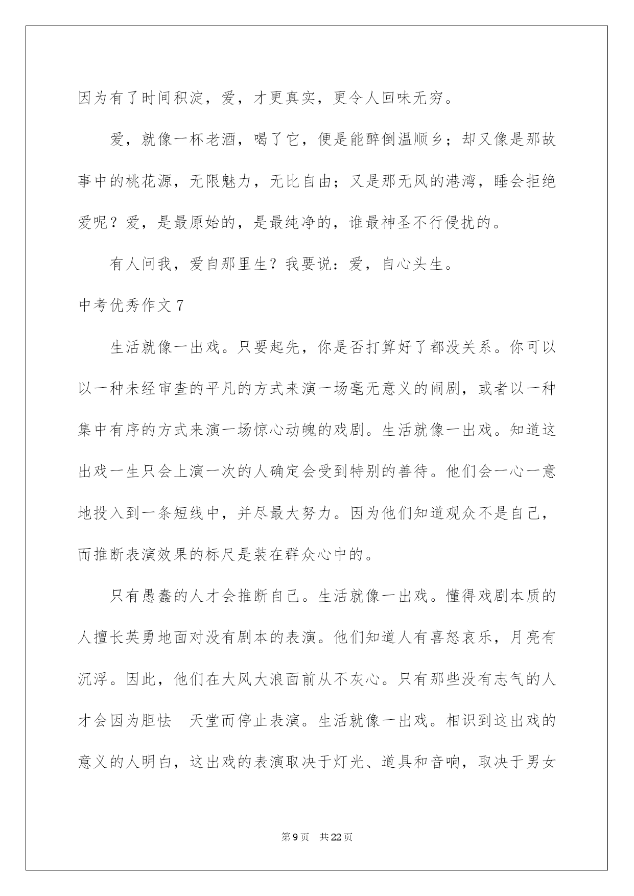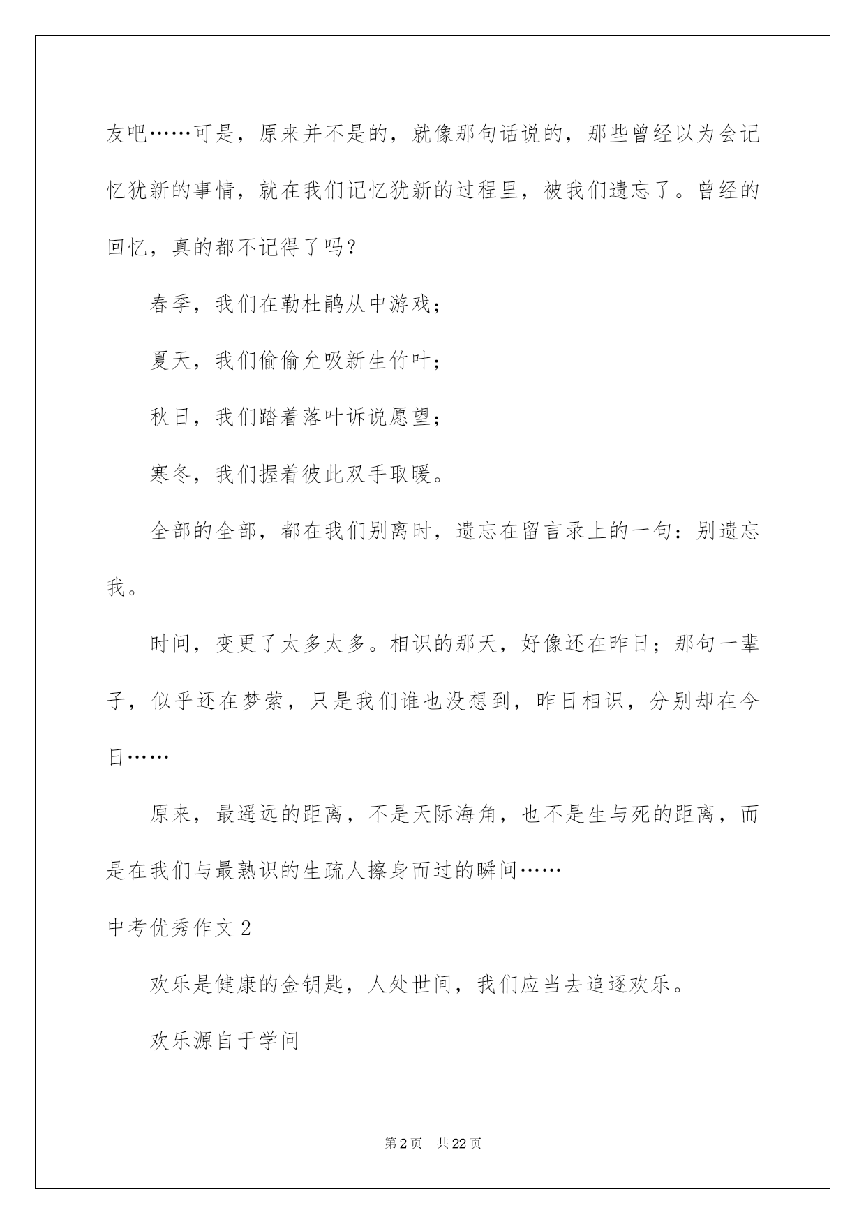 第PAGE\*Arabic\*MERGEFORMAT22页共NUMPAGES\*Arabic\*MERGEFORMAT22页第PAGE\*MERGEFORMAT22页共NUMPAGES\*MERGEFORMAT22页第PAGE\*MERGEFORMAT22页共NUMPAGES\*MERGEFORMAT22页第PAGE\*MERGEFORMAT22页共NUMPAGES\*MERGEFORMAT22页第PAGE\*MERGEFORMAT22页共NUMPAGES\*MERGEFORMAT22页第PAGE\*MERGEFORMAT22页共NUMPAGES\*MERGEFORMAT22页第PAGE\*MERGEFORMAT22页共NUMPAGES\*MERGEFORMAT22页第PAGE\*MERGEFORMAT22页共NUMPAGES\*MERGEFORMAT22页第PAGE\*MERGEFORMAT22页共NUMPAGES\*MERGEFORMAT22页第PAGE\*MERGEFORMAT22页共NUMPAGES\*MERGEFORMAT22页第PAGE\*MERGEFORMAT22页共NUMPAGES\*MERGEFORMAT22页2022中考优秀作文中考优秀作文(集锦15篇)无论是身处学校还是步入社会,大家都跟作文打过交道吧,作文依据体裁的不同可以分为记叙文、说明文、应用文、争论文。作文的留意事项有很多,你确定会写吗?以下是我收集整理的中考优秀作文,欢迎阅读与保藏。中考优秀作文1我们从时间的这头看向那头,才发觉有些东西就在我们最不经意的时候,变更了……一个人,走在楼道上,熟识的脸孔跃入眼中。抬手,微笑,呼之欲出无比熟稔的名字;笑容僵在唇边,想要打招呼的动作却成了摸头发的动作,到了嘴角的名字又偷偷的咽了回去,最熟识的生疏人,擦身而过……那个瞬间,感概万千。我以为,我们即使不在彼此的身边了;我以为,我们即使不再像以前那熟识了;那至少,见了面总会是微笑着点头,打招呼的一般挚友吧……可是,原来并不是的,就像那句话说的,那些曾经以为会记忆犹新的事情,就在我们记忆犹新的过程里,被我们遗忘了。曾经的回忆,真的都不记得了吗?春季,我们在勒杜鹃从中游戏;夏天,我们偷偷允吸新生竹叶;秋日,我们踏着落叶诉说愿望;寒冬,我们握着彼此双手取暖。全部的全部,都在我们别离时,遗忘在留言录上的一句:别遗忘我。时间,变更了太多太多。相识的那天,好像还在昨日;那句一辈子,似乎还在梦萦,只是我们谁也没想到,昨日相识,分别却在今日……原来,最遥远的距离,不是天际海角,也不是生与死的距离,而是在我们与最熟识的生疏人擦身而过的瞬间……中考优秀作文2欢乐是健康的金钥匙,人处世间,我们应当去追逐欢乐。欢乐源自于学问暑假里,妈妈买了菠菜回来,嘴里叨念着:“菠菜有丰富的铁,对我们身体有很大的帮助!”我瞧了瞧菠菜,绿绿的叶子,红红的根,怎么会有铁?我确定用吸铁石尝试一下,我当心翼翼地将吸铁石放在菠菜的叶子上,可怎么也吸不起来,后来才知道,菠菜里的铁,是一种微量元素,而铁是一种矿物质。欢乐源自于探究记得某一星期天,我在场地上吃着面包,突然发觉墙角处有一些蚂蚁,正劳碌地来回穿梭,一个疑问撞进了我脑海里:蚂蚁会迷路吗?我找来了一块砖,挡在蚂蚁的路途前方,忽然,蚂蚁们乱作一团,不过,只过了几秒钟,两只聪慧的蚂蚁爬上砖块,找到了被隔断的原路途,蚂蚁们重新排好队伍绕道前进了,我对这个现象怀疑不解,打开电脑搜寻答案,原来蚂蚁身上有一种特别的气味,来的时候,把它留在泥土上,返回时只要追寻着这种气味,就不会误入歧途。欢乐源自于学习每逢周末,我都要去参与小记者培训,对于我这个不擅长言辞的人来说,真是机会难得,课上,老师让我们相互沟通,相互实践,因为当一名记者既辛苦,又神圣,他能第一时间让市民了解国家大事和各种新闻,我要学习记者的“狗鼻、鹰眼、豹子腿”的精神。欢乐是生活的法宝,欢乐是学习的伙伴,欢乐是一瓶可口的饮料,让我们去追逐欢乐。中考优秀作文3有这首歌又在我耳边响起,不知不觉中,我竟然哼了起来,我不知道为什么,我竟然这么熟识;它;我想起了我的母亲起初,我只是认为这只是一首一般的歌。渐渐地,我发觉我错了。原来它赞美了世界上最宏大的爱——母爱我认为这首歌是对的。假如没有母亲,我们会在哪里?暑假前,我们都在努力把考试付诸实践。但是我太不幸了,当时我感冒了那时,天气特别热。在我们班,除了我之外的其他学生也生病了,但是他们都比较轻。但我是那天中午,我回家时感到很不舒适。我妈妈问我怎么了,我说:妈妈,我觉得不舒适你等着,我给你拿些药看着母亲匆忙的背影,我感