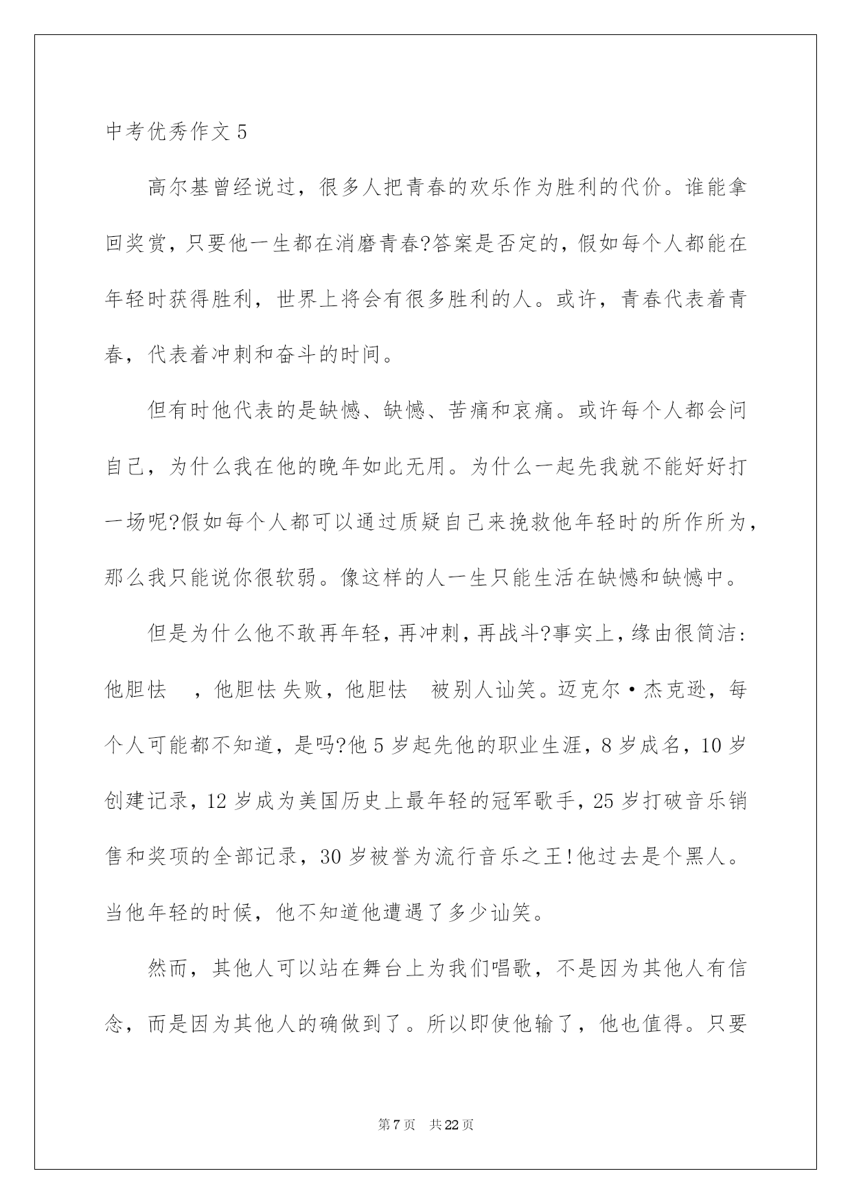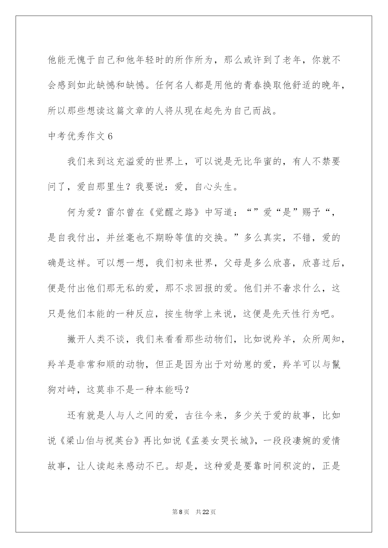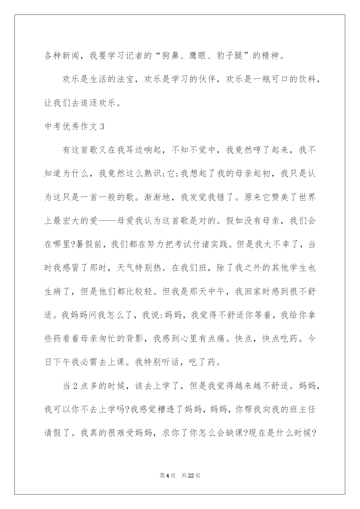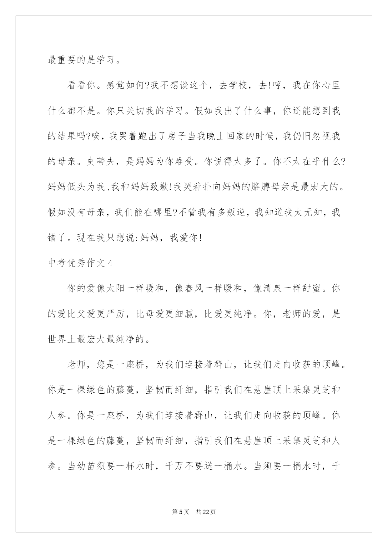 第PAGE\*Arabic\*MERGEFORMAT22页共NUMPAGES\*Arabic\*MERGEFORMAT22页第PAGE\*MERGEFORMAT22页共NUMPAGES\*MERGEFORMAT22页第PAGE\*MERGEFORMAT22页共NUMPAGES\*MERGEFORMAT22页第PAGE\*MERGEFORMAT22页共NUMPAGES\*MERGEFORMAT22页第PAGE\*MERGEFORMAT22页共NUMPAGES\*MERGEFORMAT22页第PAGE\*MERGEFORMAT22页共NUMPAGES\*MERGEFORMAT22页第PAGE\*MERGEFORMAT22页共NUMPAGES\*MERGEFORMAT22页第PAGE\*MERGEFORMAT22页共NUMPAGES\*MERGEFORMAT22页第PAGE\*MERGEFORMAT22页共NUMPAGES\*MERGEFORMAT22页第PAGE\*MERGEFORMAT22页共NUMPAGES\*MERGEFORMAT22页第PAGE\*MERGEFORMAT22页共NUMPAGES\*MERGEFORMAT22页2022中考优秀作文中考优秀作文(集锦15篇)无论是身处学校还是步入社会,大家都跟作文打过交道吧,作文依据体裁的不同可以分为记叙文、说明文、应用文、争论文。作文的留意事项有很多,你确定会写吗?以下是我收集整理的中考优秀作文,欢迎阅读与保藏。中考优秀作文1我们从时间的这头看向那头,才发觉有些东西就在我们最不经意的时候,变更了……一个人,走在楼道上,熟识的脸孔跃入眼中。抬手,微笑,呼之欲出无比熟稔的名字;笑容僵在唇边,想要打招呼的动作却成了摸头发的动作,到了嘴角的名字又偷偷的咽了回去,最熟识的生疏人,擦身而过……那个瞬间,感概万千。我以为,我们即使不在彼此的身边了;我以为,我们即使不再像以前那熟识了;那至少,见了面总会是微笑着点头,打招呼的一般挚友吧……可是,原来并不是的,就像那句话说的,那些曾经以为会记忆犹新的事情,就在我们记忆犹新的过程里,被我们遗忘了。曾经的回忆,真的都不记得了吗?春季,我们在勒杜鹃从中游戏;夏天,我们偷偷允吸新生竹叶;秋日,我们踏着落叶诉说愿望;寒冬,我们握着彼此双手取暖。全部的全部,都在我们别离时,遗忘在留言录上的一句:别遗忘我。时间,变更了太多太多。相识的那天,好像还在昨日;那句一辈子,似乎还在梦萦,只是我们谁也没想到,昨日相识,分别却在今日……原来,最遥远的距离,不是天际海角,也不是生与死的距离,而是在我们与最熟识的生疏人擦身而过的瞬间……中考优秀作文2欢乐是健康的金钥匙,人处世间,我们应当去追逐欢乐。欢乐源自于学问暑假里,妈妈买了菠菜回来,嘴里叨念着:“菠菜有丰富的铁,对我们身体有很大的帮助!”我瞧了瞧菠菜,绿绿的叶子,红红的根,怎么会有铁?我确定用吸铁石尝试一下,我当心翼翼地将吸铁石放在菠菜的叶子上,可怎么也吸不起来,后来才知道,菠菜里的铁,是一种微量元素,而铁是一种矿物质。欢乐源自于探究记得某一星期天,我在场地上吃着面包,突然发觉墙角处有一些蚂蚁,正劳碌地来回穿梭,一个疑问撞进了我脑海里:蚂蚁会迷路吗?我找来了一块砖,挡在蚂蚁的路途前方,忽然,蚂蚁们乱作一团,不过,只过了几秒钟,两只聪慧的蚂蚁爬上砖块,找到了被隔断的原路途,蚂蚁们重新排好队伍绕道前进了,我对这个现象怀疑不解,打开电脑搜寻答案,原来蚂蚁身上有一种特别的气味,来的时候,把它留在泥土上,返回时只要追寻着这种气味,就不会误入歧途。欢乐源自于学习每逢周末,我都要去参与小记者培训,对于我这个不擅长言辞的人来说,真是机会难得,课上,老师让我们相互沟通,相互实践,因为当一名记者既辛苦,又神圣,他能第一时间让市民了解国家大事和各种新闻,我要学习记者的“狗鼻、鹰眼、豹子腿”的精神。欢乐是生活的法宝,欢乐是学习的伙伴,欢乐是一瓶可口的饮料,让我们去追逐欢乐。中考优秀作文3有这首歌又在我耳边响起,不知不觉中,我竟然哼了起来,我不知道为什么,我竟然这么熟识;它;我想起了我的母亲起初,我只是认为这只是一首一般的歌。渐渐地,我发觉我错了。原来它赞美了世界上最宏大的爱——母爱我认为这首歌是对的。假如没有母亲,我们会在哪里?暑假前,我们都在努力把考试付诸实践。但是我太不幸了,当时我感冒了那时,天气特别热。在我们班,除了我之外的其他学生也生病了,但是他们都比较轻。但我是那天中午,我回家时感到很不舒适。我妈妈问我怎么了,我说:妈妈,我觉得不舒适你等着,我给你拿些药看着母亲匆忙的背影,我感