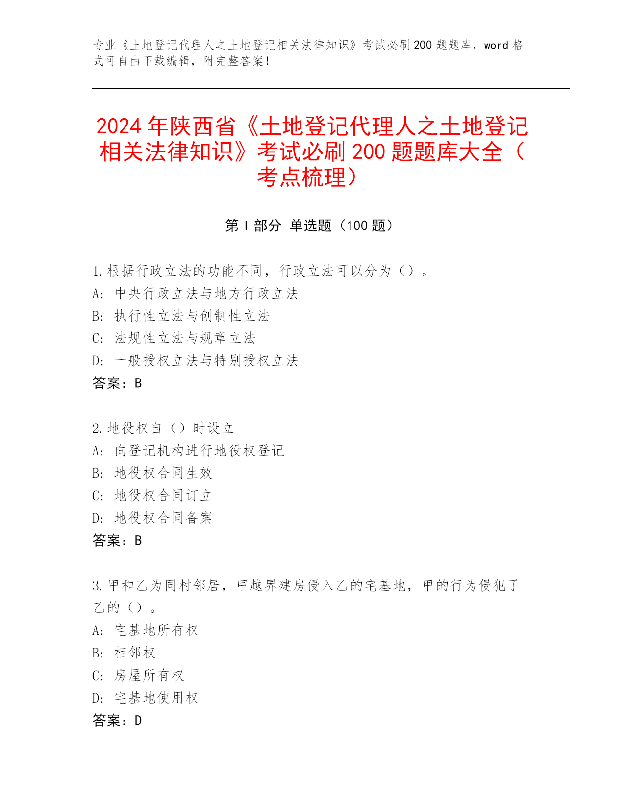 2024年陕西省《土地登记代理人之土地登记相关法律知识》考试必刷200题题库大全(考点梳理).docx