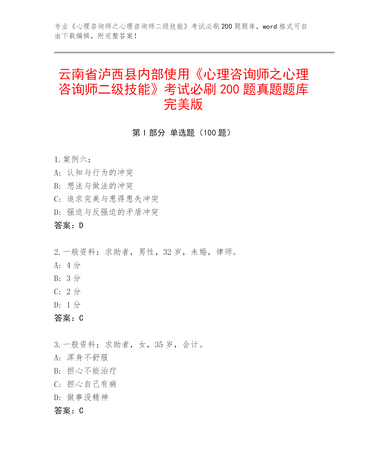 云南省泸西县《心理咨询师之心理咨询师二级技能》考试必刷200题真题题库(夺分金卷)