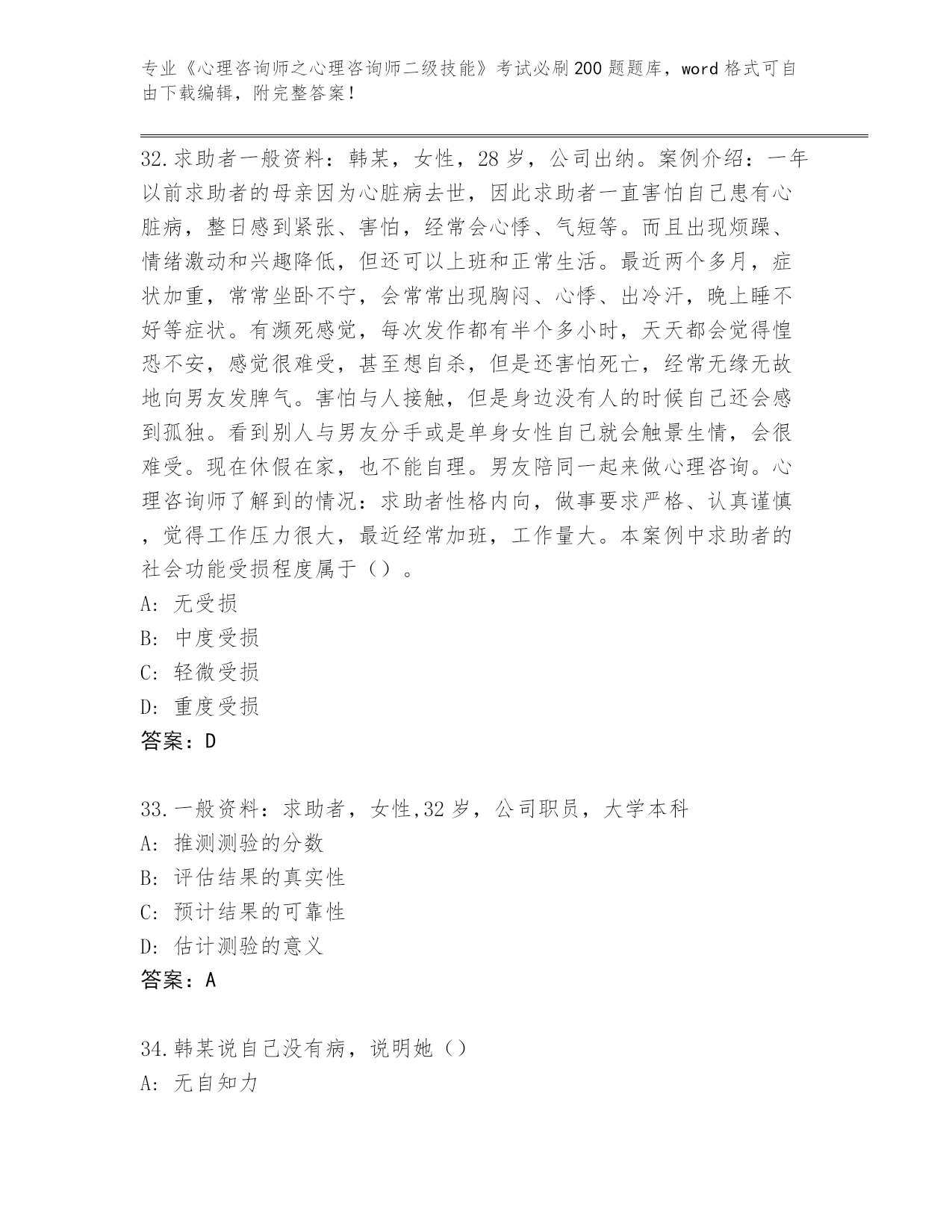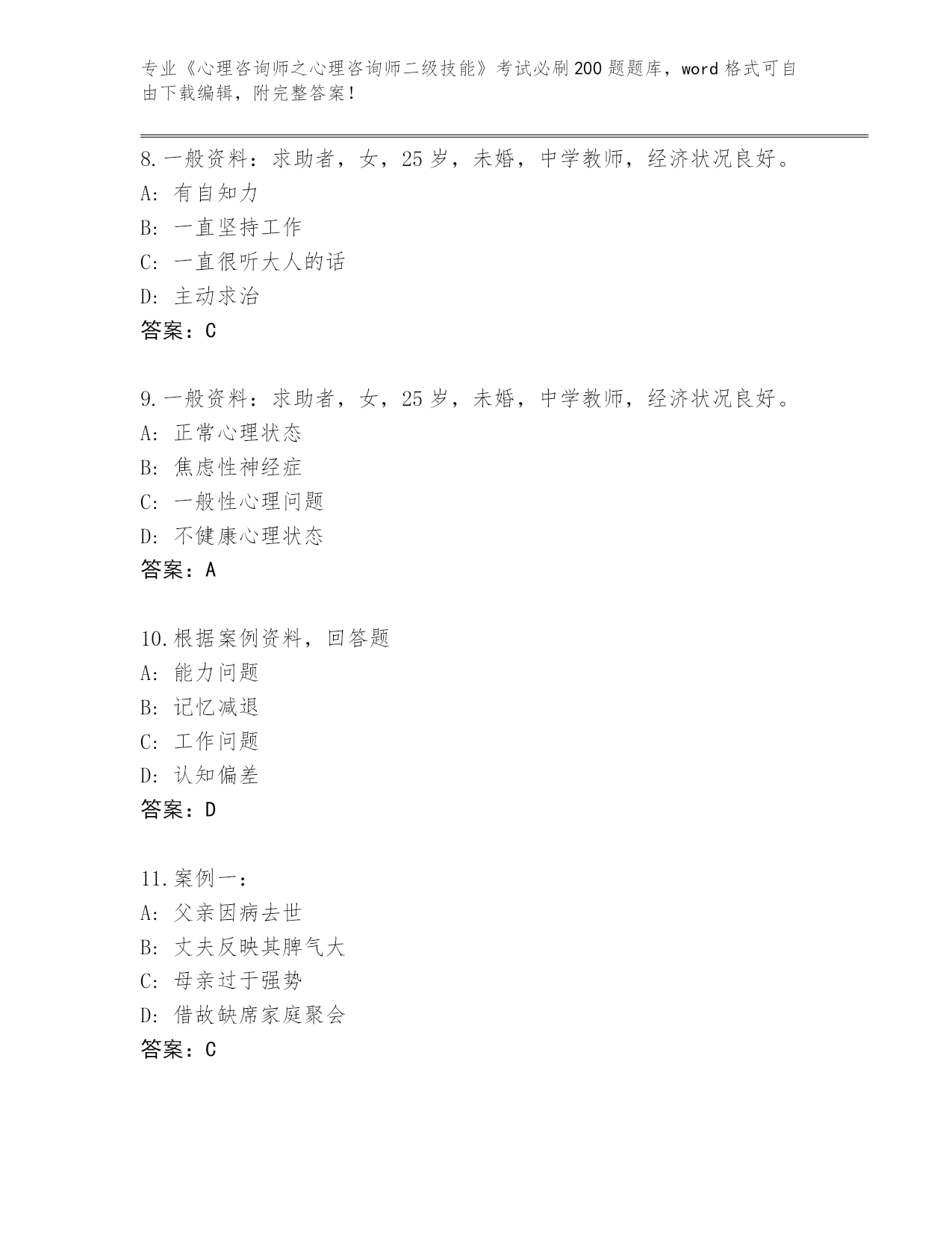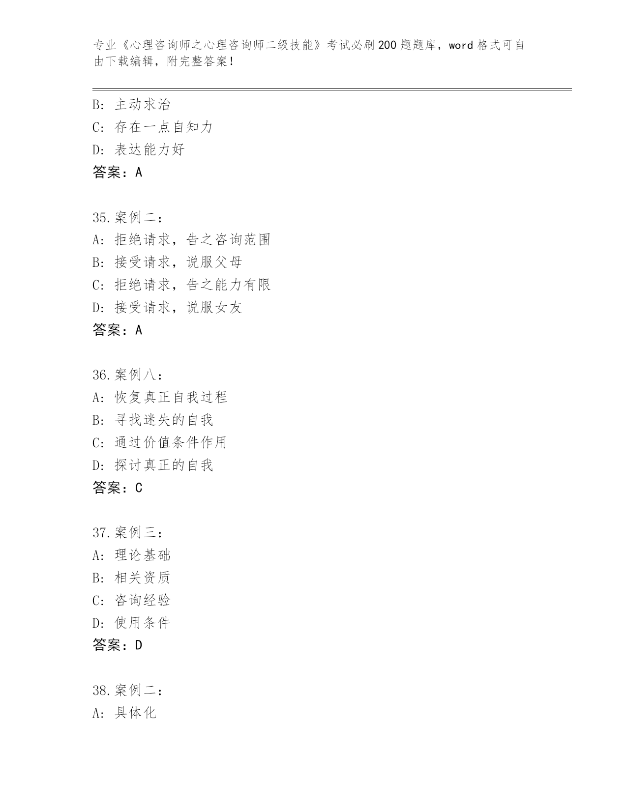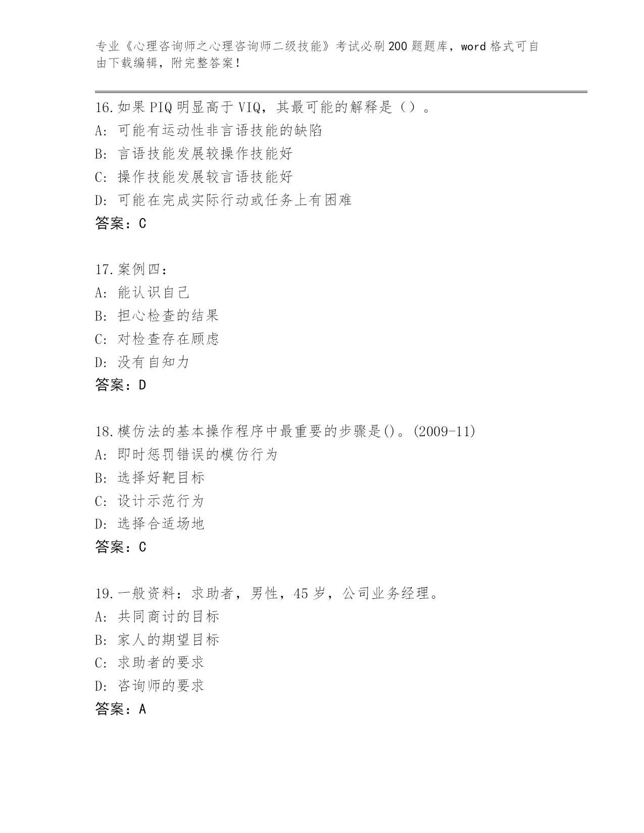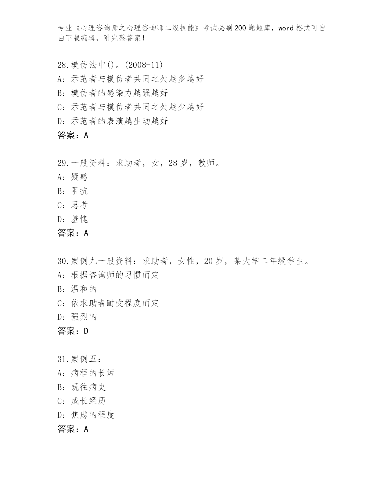 浙江省内部使用《心理咨询师之心理咨询师二级技能》考试必刷200题内部题库及答案(各地真题)