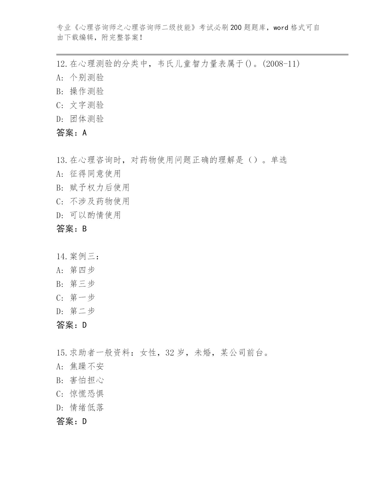 云南省内部使用《心理咨询师之心理咨询师二级技能》资格考试必刷200题真题题库加答案解析