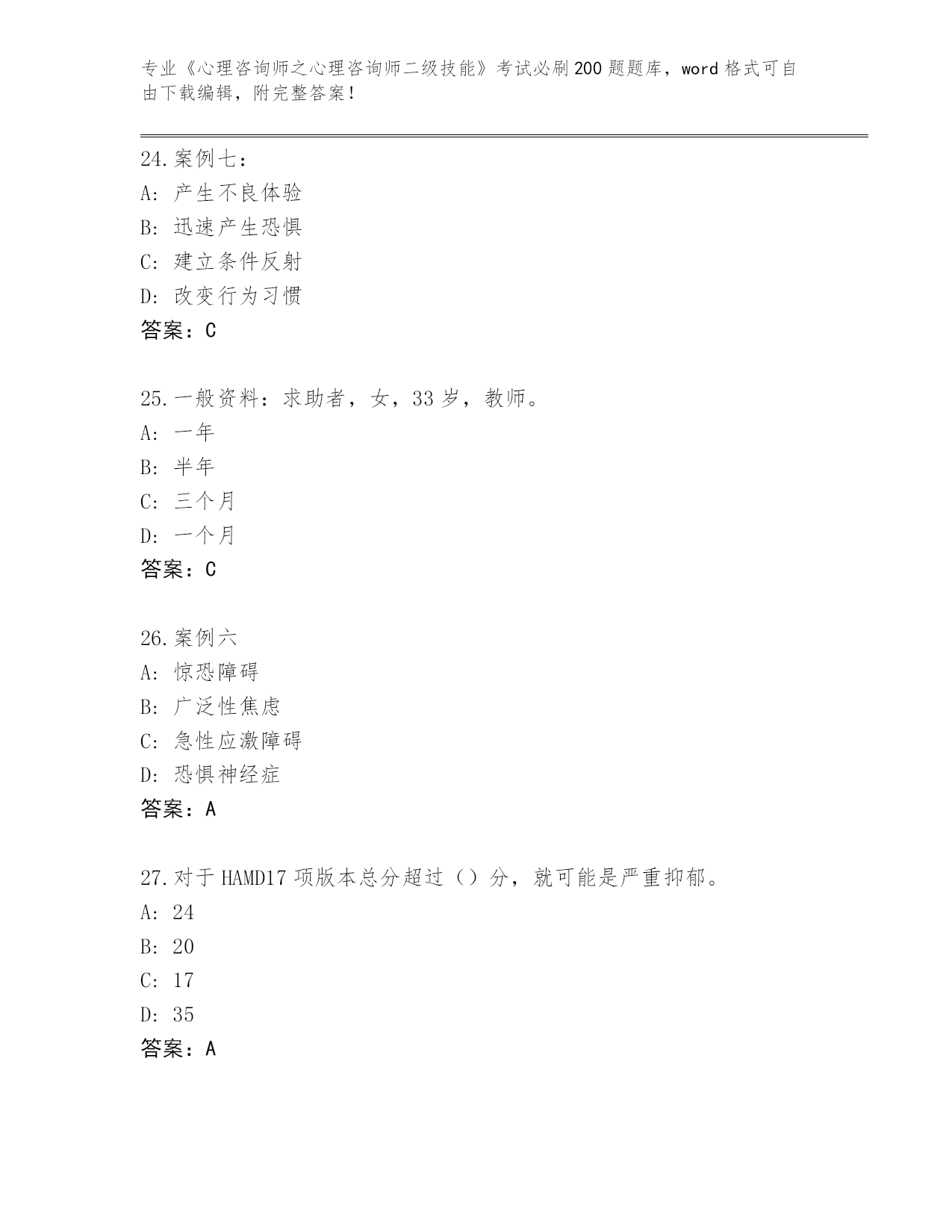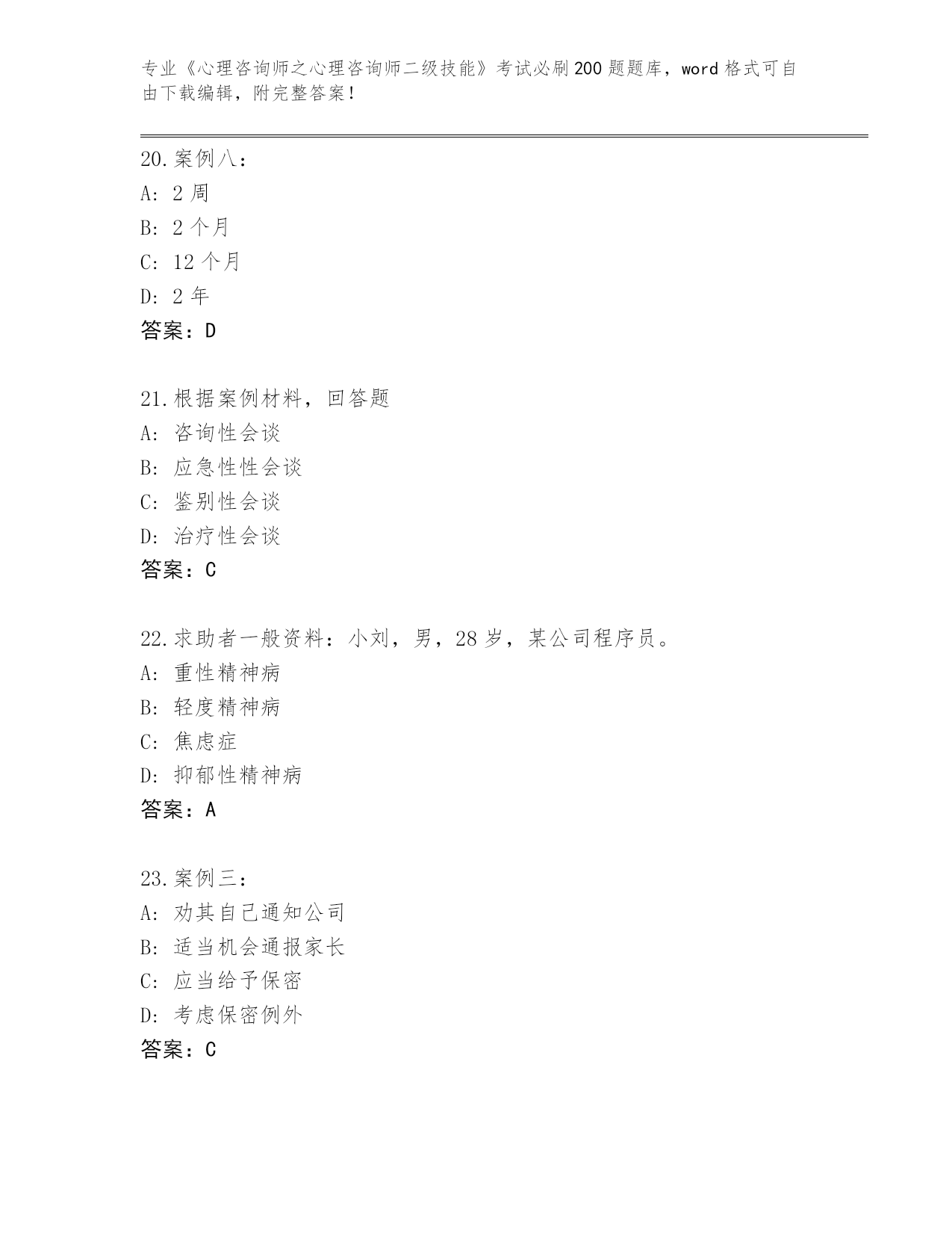 内部使用河南省《心理咨询师之心理咨询师二级技能》资格考试必刷200题真题题库【满分必刷】