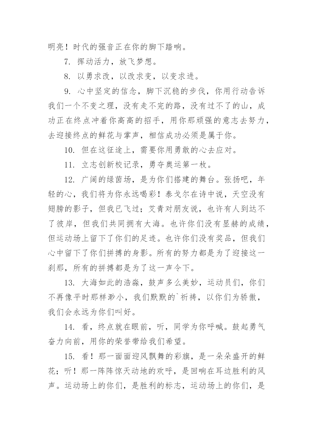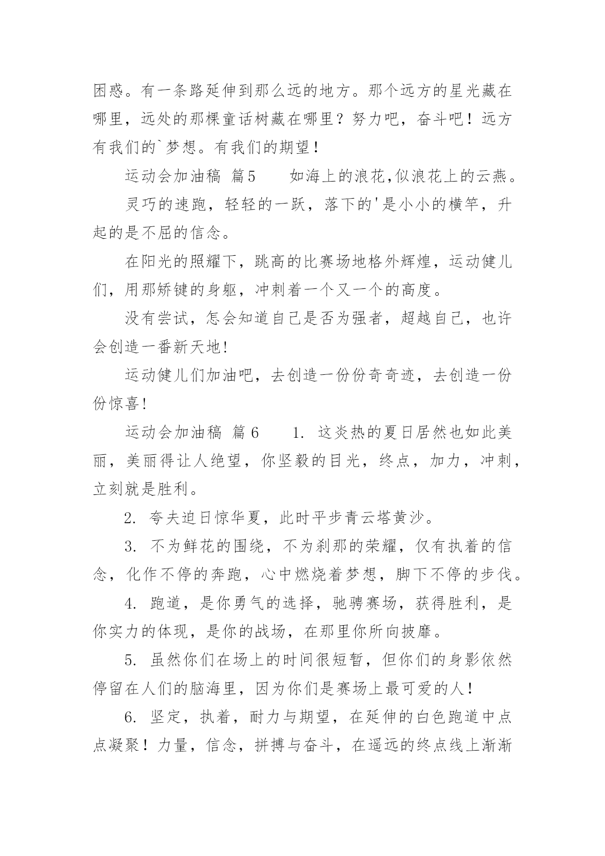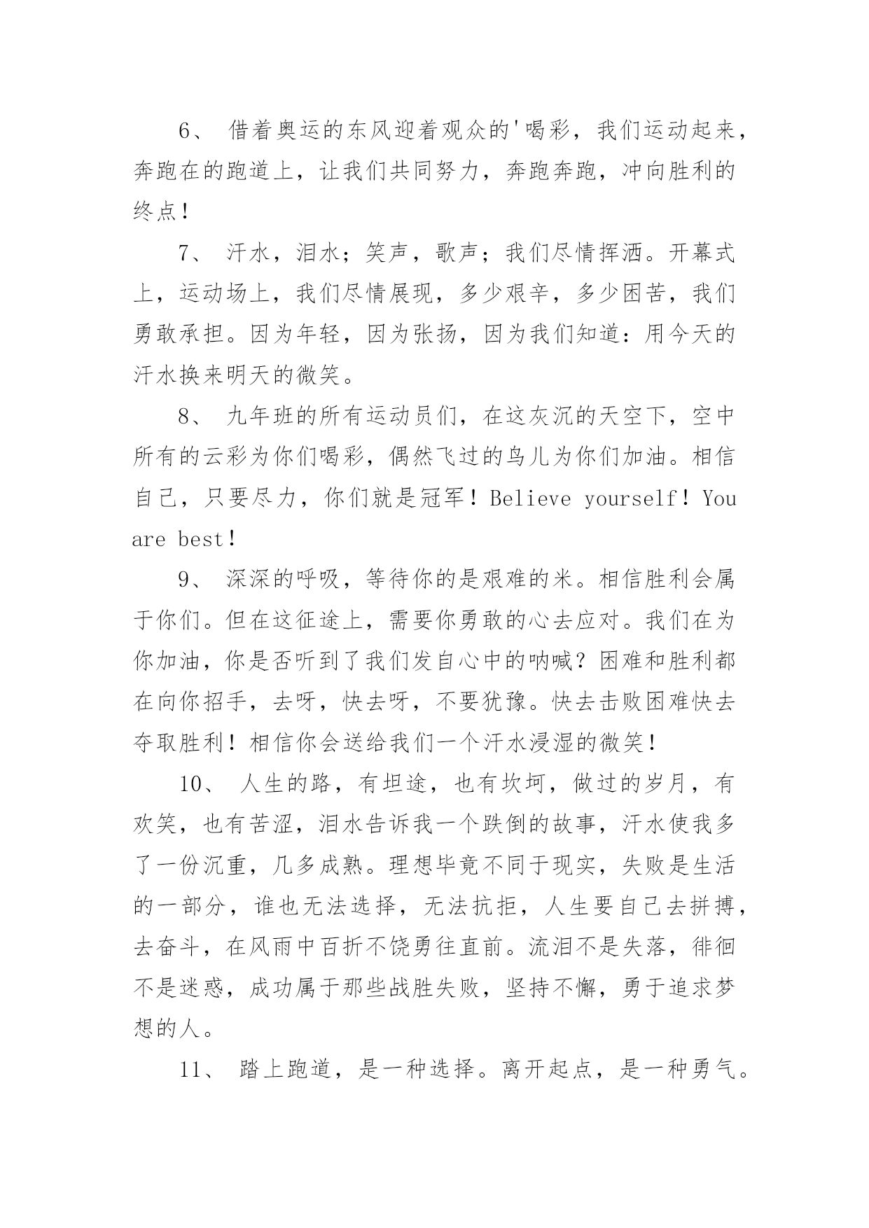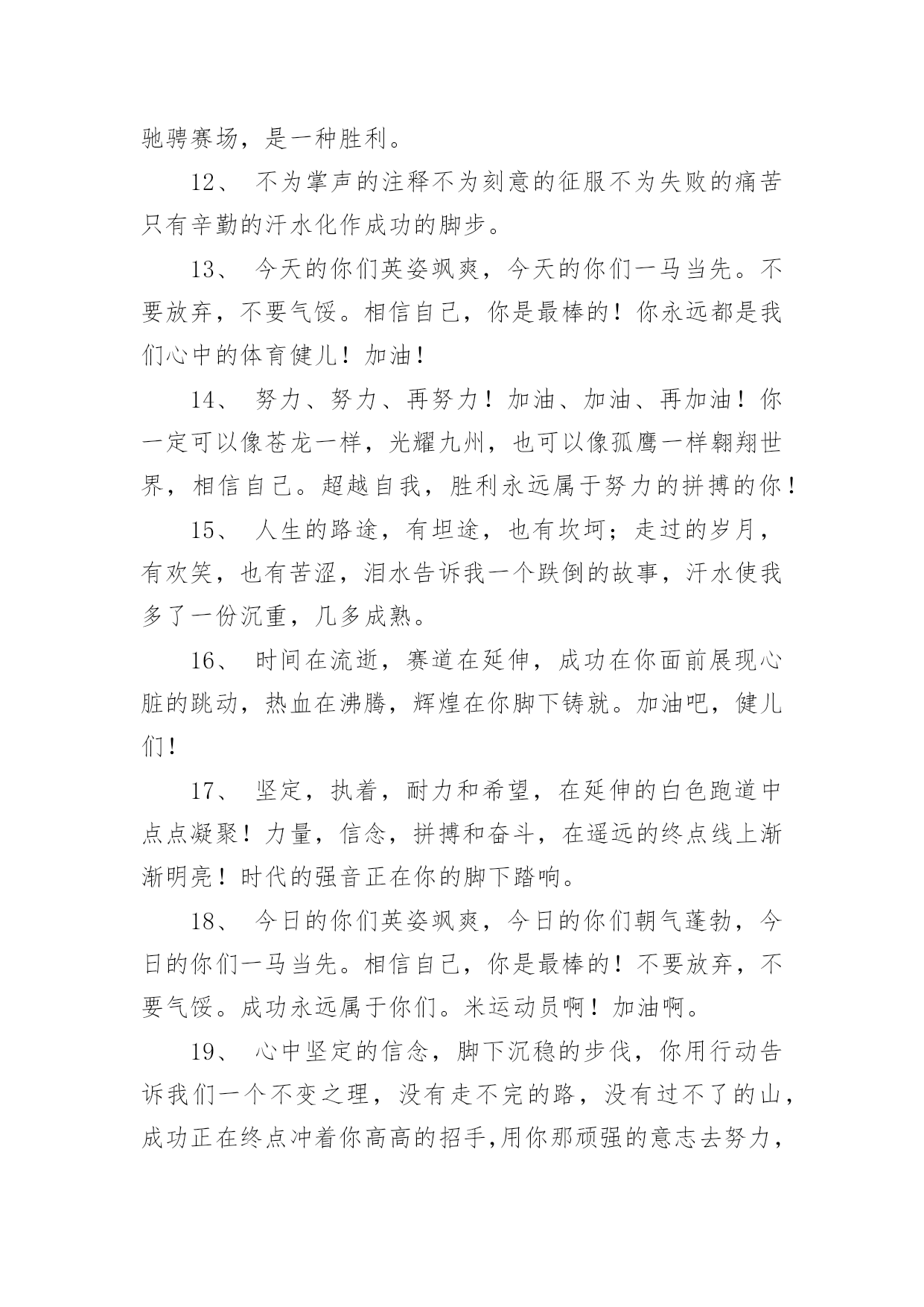 运动会加油稿运动会加油稿【共14篇】在我们平凡的日常里,很多情况下我们需要用到加油稿,加油稿是鼓励激励对方的文稿。大家知道加油稿怎么写才正确吗?以下是小编收集整理的运动会加油稿,希望能够帮助到大家。运动会加油稿篇11、人生的路,有坦途,也有坎坷;做过的岁月,有欢笑,也有苦涩,泪水告诉我一个跌倒的故事,汗水使我多了一份沉重,几多成熟。2、虽然你们在场上的时间很短暂,但你们的身影依然停留在人们的脑海里,因为你们是赛场上最可爱的人。3、某一天,醒在梦的旁边;手指间,光线有些个性;我能看得见,看见光在变,变成七彩的寓言,飞向梦的起点。某一天,飞奔在跑道间;两腮间,汗水不断流出;我能感觉到,感觉你在变,变成生活的强者,奔向成功的边缘!虽然,天阴沉沉的,虽然,有些隐隐的寒意。但是,每个人都昂首向前,每个人都精神焕发,每个人都向着终点向着胜利冲去!运动员们,你是我们的骄傲,我们为你们欢呼,为你们加油!4、时间在流逝,赛道在延伸,成功在你面前展现心脏的跳动,热血在沸腾,辉煌在你脚下铸就。加油吧,健儿们。5、看,终点就在眼前,听,同学为你呼喊。鼓起勇气奋力向前,用你的荣誉带给我们希望。6、借着奥运的东风迎着观众的'喝彩,我们运动起来,奔跑在的跑道上,让我们共同努力,奔跑奔跑,冲向胜利的终点!7、汗水,泪水;笑声,歌声;我们尽情挥洒。开幕式上,运动场上,我们尽情展现,多少艰辛,多少困苦,我们勇敢承担。因为年轻,因为张扬,因为我们知道:用今天的汗水换来明天的微笑。8、九年班的所有运动员们,在这灰沉的天空下,空中所有的云彩为你们喝彩,偶然飞过的鸟儿为你们加油。相信自己,只要尽力,你们就是冠军!Believeyourself!Youarebest!9、深深的呼吸,等待你的是艰难的米。相信胜利会属于你们。但在这征途上,需要你勇敢的心去应对。我们在为你加油,你是否听到了我们发自心中的呐喊?困难和胜利都在向你招手,去呀,快去呀,不要犹豫。快去击败困难快去夺取胜利!相信你会送给我们一个汗水浸湿的微笑!10、人生的路,有坦途,也有坎坷,做过的岁月,有欢笑,也有苦涩,泪水告诉我一个跌倒的故事,汗水使我多了一份沉重,几多成熟。理想毕竟不同于现实,失败是生活的一部分,谁也无法选择,无法抗拒,人生要自己去拼搏,去奋斗,在风雨中百折不饶勇往直前。流泪不是失落,徘徊不是迷惑,成功属于那些战胜失败,坚持不懈,勇于追求梦想的人。11、踏上跑道,是一种选择。离开起点,是一种勇气。驰骋赛场,是一种胜利。12、不为掌声的注释不为刻意的征服不为失败的痛苦只有辛勤的汗水化作成功的脚步。13、今天的你们英姿飒爽,今天的你们一马当先。不要放弃,不要气馁。相信自己,你是最棒的!你永远都是我们心中的体育健儿!加油!14、努力、努力、再努力!加油、加油、再加油!你一定可以像苍龙一样,光耀九州,也可以像孤鹰一样翱翔世界,相信自己。超越自我,胜利永远属于努力的拼搏的你!15、人生的路途,有坦途,也有坎坷;走过的岁月,有欢笑,也有苦涩,泪水告诉我一个跌倒的故事,汗水使我多了一份沉重,几多成熟。16、时间在流逝,赛道在延伸,成功在你面前展现心脏的跳动,热血在沸腾,辉煌在你脚下铸就。加油吧,健儿们!17、坚定,执着,耐力和希望,在延伸的白色跑道中点点凝聚!力量,信念,拼搏和奋斗,在遥远的终点线上渐渐明亮!时代的强音正在你的脚下踏响。18、今日的你们英姿飒爽,今日的你们朝气蓬勃,今日的你们一马当先。相信自己,你是最棒的!不要放弃,不要气馁。成功永远属于你们。米运动员啊!加油啊。19、心中坚定的信念,脚下沉稳的步伐,你用行动告诉我们一个不变之理,没有走不完的路,没有过不了的山,成功正在终点冲着你高高的招手,用你那顽强的意志去努力,去迎接终点的鲜花与掌声,相信成功必须是属于你。20、萧瑟的秋风,挡不住你们破竹的锐气。运动会加油稿篇21.面对艰苦的征程,你们毫不畏惧,接力棒在你们手中传递着集体的力量,听,我们在为你呐喊,你们诠释着奥运的精神,你们是我们心中的骄傲。相信胜利会属于你们,但在这征途上,需要你勇敢的心去面对。我们在为你加油,你是否听到了我们发自内心的呐喊,困难和胜利都在向你招手,去呀,不要犹豫,快去击败困难,快去夺取胜利!2.大海如此的浩淼,鼓声多么美妙,运动员们,你们不再像平时那样渺小,我们默默的祈祷,以你们为骄傲,我们会永远为你们叫好。3.看,终点就在眼前,听,同学为你呼喊。鼓起勇气奋力向前,用你的荣誉带给我们希望。4.看!那一面面迎风飘舞的彩旗,是一朵朵盛开的鲜花;听!那一阵阵惊天动地的欢呼,是回响在耳边胜利的风声。运动场上的你们,是胜利的标志,运动场上的你们,是青春的赞叹。去吧!去迎接那伟大的挑战,去吧!去做一名追风的少年。5.人生的路,有坦途,也有坎坷;做过的岁月,有欢笑,也有苦涩,泪水告诉