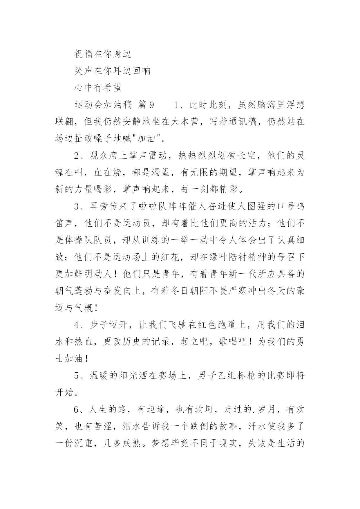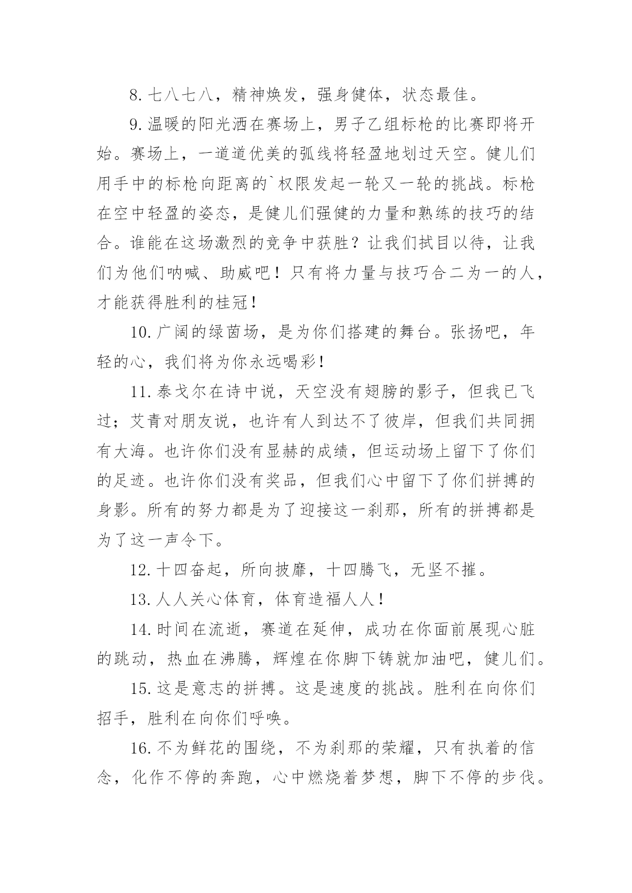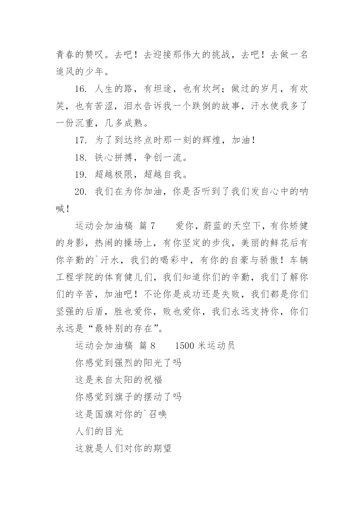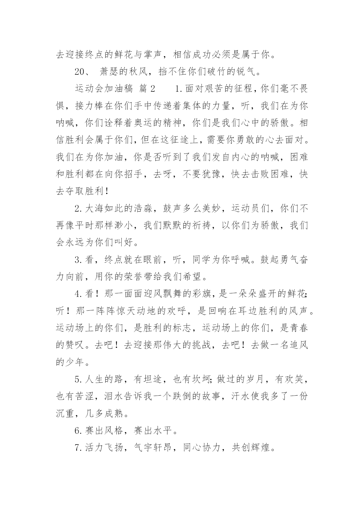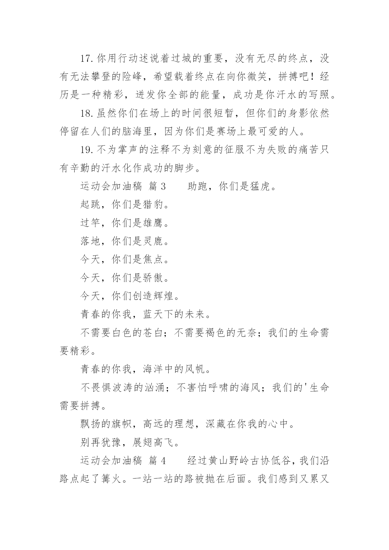 运动会加油稿运动会加油稿【共14篇】在我们平凡的日常里,很多情况下我们需要用到加油稿,加油稿是鼓励激励对方的文稿。大家知道加油稿怎么写才正确吗?以下是小编收集整理的运动会加油稿,希望能够帮助到大家。运动会加油稿篇11、人生的路,有坦途,也有坎坷;做过的岁月,有欢笑,也有苦涩,泪水告诉我一个跌倒的故事,汗水使我多了一份沉重,几多成熟。2、虽然你们在场上的时间很短暂,但你们的身影依然停留在人们的脑海里,因为你们是赛场上最可爱的人。3、某一天,醒在梦的旁边;手指间,光线有些个性;我能看得见,看见光在变,变成七彩的寓言,飞向梦的起点。某一天,飞奔在跑道间;两腮间,汗水不断流出;我能感觉到,感觉你在变,变成生活的强者,奔向成功的边缘!虽然,天阴沉沉的,虽然,有些隐隐的寒意。但是,每个人都昂首向前,每个人都精神焕发,每个人都向着终点向着胜利冲去!运动员们,你是我们的骄傲,我们为你们欢呼,为你们加油!4、时间在流逝,赛道在延伸,成功在你面前展现心脏的跳动,热血在沸腾,辉煌在你脚下铸就。加油吧,健儿们。5、看,终点就在眼前,听,同学为你呼喊。鼓起勇气奋力向前,用你的荣誉带给我们希望。6、借着奥运的东风迎着观众的'喝彩,我们运动起来,奔跑在的跑道上,让我们共同努力,奔跑奔跑,冲向胜利的终点!7、汗水,泪水;笑声,歌声;我们尽情挥洒。开幕式上,运动场上,我们尽情展现,多少艰辛,多少困苦,我们勇敢承担。因为年轻,因为张扬,因为我们知道:用今天的汗水换来明天的微笑。8、九年班的所有运动员们,在这灰沉的天空下,空中所有的云彩为你们喝彩,偶然飞过的鸟儿为你们加油。相信自己,只要尽力,你们就是冠军!Believeyourself!Youarebest!9、深深的呼吸,等待你的是艰难的米。相信胜利会属于你们。但在这征途上,需要你勇敢的心去应对。我们在为你加油,你是否听到了我们发自心中的呐喊?困难和胜利都在向你招手,去呀,快去呀,不要犹豫。快去击败困难快去夺取胜利!相信你会送给我们一个汗水浸湿的微笑!10、人生的路,有坦途,也有坎坷,做过的岁月,有欢笑,也有苦涩,泪水告诉我一个跌倒的故事,汗水使我多了一份沉重,几多成熟。理想毕竟不同于现实,失败是生活的一部分,谁也无法选择,无法抗拒,人生要自己去拼搏,去奋斗,在风雨中百折不饶勇往直前。流泪不是失落,徘徊不是迷惑,成功属于那些战胜失败,坚持不懈,勇于追求梦想的人。11、踏上跑道,是一种选择。离开起点,是一种勇气。驰骋赛场,是一种胜利。12、不为掌声的注释不为刻意的征服不为失败的痛苦只有辛勤的汗水化作成功的脚步。13、今天的你们英姿飒爽,今天的你们一马当先。不要放弃,不要气馁。相信自己,你是最棒的!你永远都是我们心中的体育健儿!加油!14、努力、努力、再努力!加油、加油、再加油!你一定可以像苍龙一样,光耀九州,也可以像孤鹰一样翱翔世界,相信自己。超越自我,胜利永远属于努力的拼搏的你!15、人生的路途,有坦途,也有坎坷;走过的岁月,有欢笑,也有苦涩,泪水告诉我一个跌倒的故事,汗水使我多了一份沉重,几多成熟。16、时间在流逝,赛道在延伸,成功在你面前展现心脏的跳动,热血在沸腾,辉煌在你脚下铸就。加油吧,健儿们!17、坚定,执着,耐力和希望,在延伸的白色跑道中点点凝聚!力量,信念,拼搏和奋斗,在遥远的终点线上渐渐明亮!时代的强音正在你的脚下踏响。18、今日的你们英姿飒爽,今日的你们朝气蓬勃,今日的你们一马当先。相信自己,你是最棒的!不要放弃,不要气馁。成功永远属于你们。米运动员啊!加油啊。19、心中坚定的信念,脚下沉稳的步伐,你用行动告诉我们一个不变之理,没有走不完的路,没有过不了的山,成功正在终点冲着你高高的招手,用你那顽强的意志去努力,去迎接终点的鲜花与掌声,相信成功必须是属于你。20、萧瑟的秋风,挡不住你们破竹的锐气。运动会加油稿篇21.面对艰苦的征程,你们毫不畏惧,接力棒在你们手中传递着集体的力量,听,我们在为你呐喊,你们诠释着奥运的精神,你们是我们心中的骄傲。相信胜利会属于你们,但在这征途上,需要你勇敢的心去面对。我们在为你加油,你是否听到了我们发自内心的呐喊,困难和胜利都在向你招手,去呀,不要犹豫,快去击败困难,快去夺取胜利!2.大海如此的浩淼,鼓声多么美妙,运动员们,你们不再像平时那样渺小,我们默默的祈祷,以你们为骄傲,我们会永远为你们叫好。3.看,终点就在眼前,听,同学为你呼喊。鼓起勇气奋力向前,用你的荣誉带给我们希望。4.看!那一面面迎风飘舞的彩旗,是一朵朵盛开的鲜花;听!那一阵阵惊天动地的欢呼,是回响在耳边胜利的风声。运动场上的你们,是胜利的标志,运动场上的你们,是青春的赞叹。去吧!去迎接那伟大的挑战,去吧!去做一名追风的少年。5.人生的路,有坦途,也有坎坷;做过的岁月,有欢笑,也有苦涩,泪水告诉