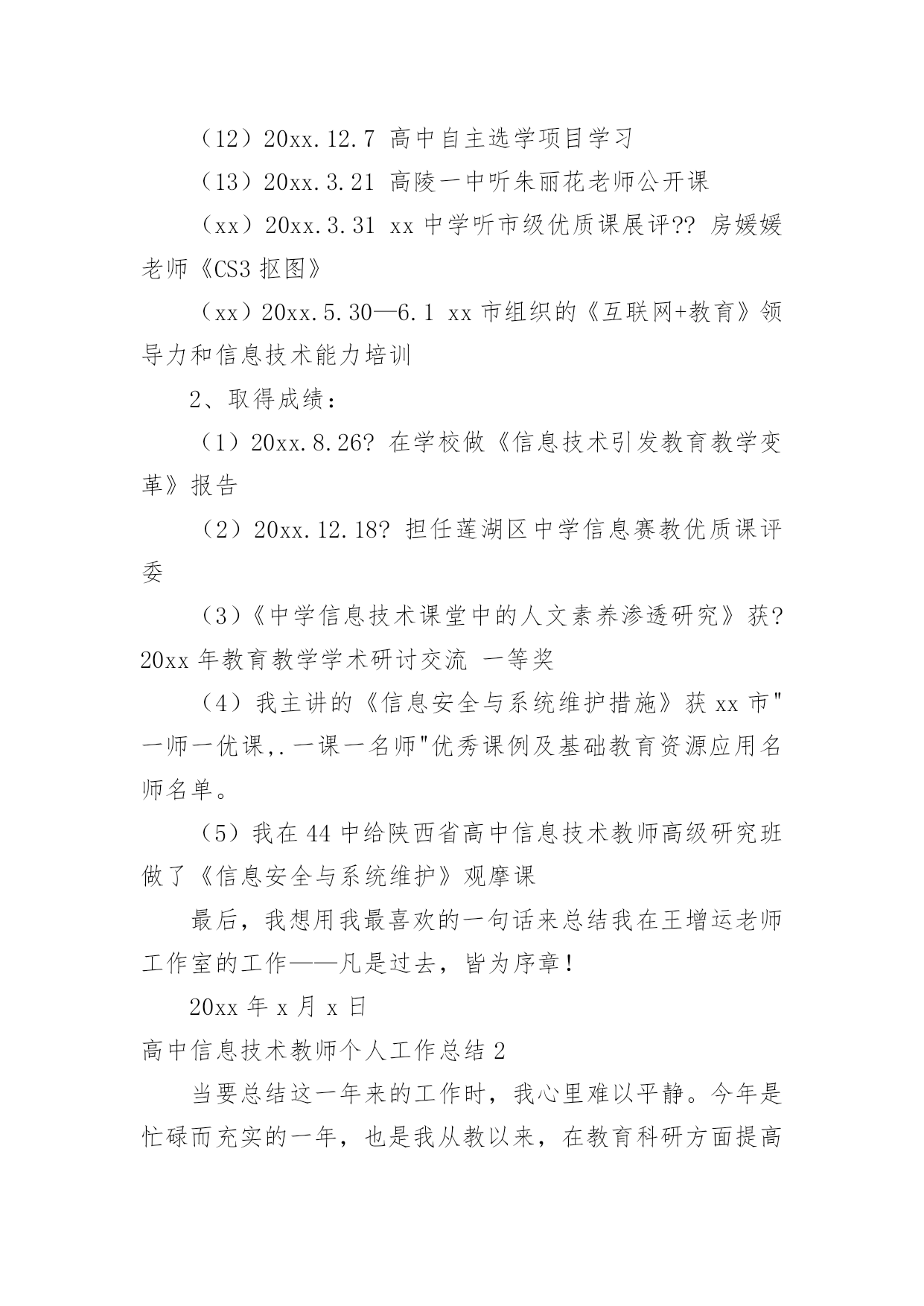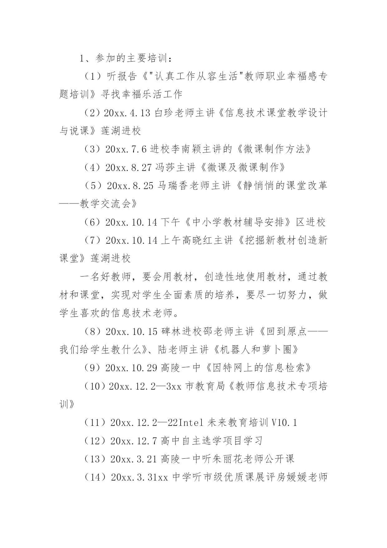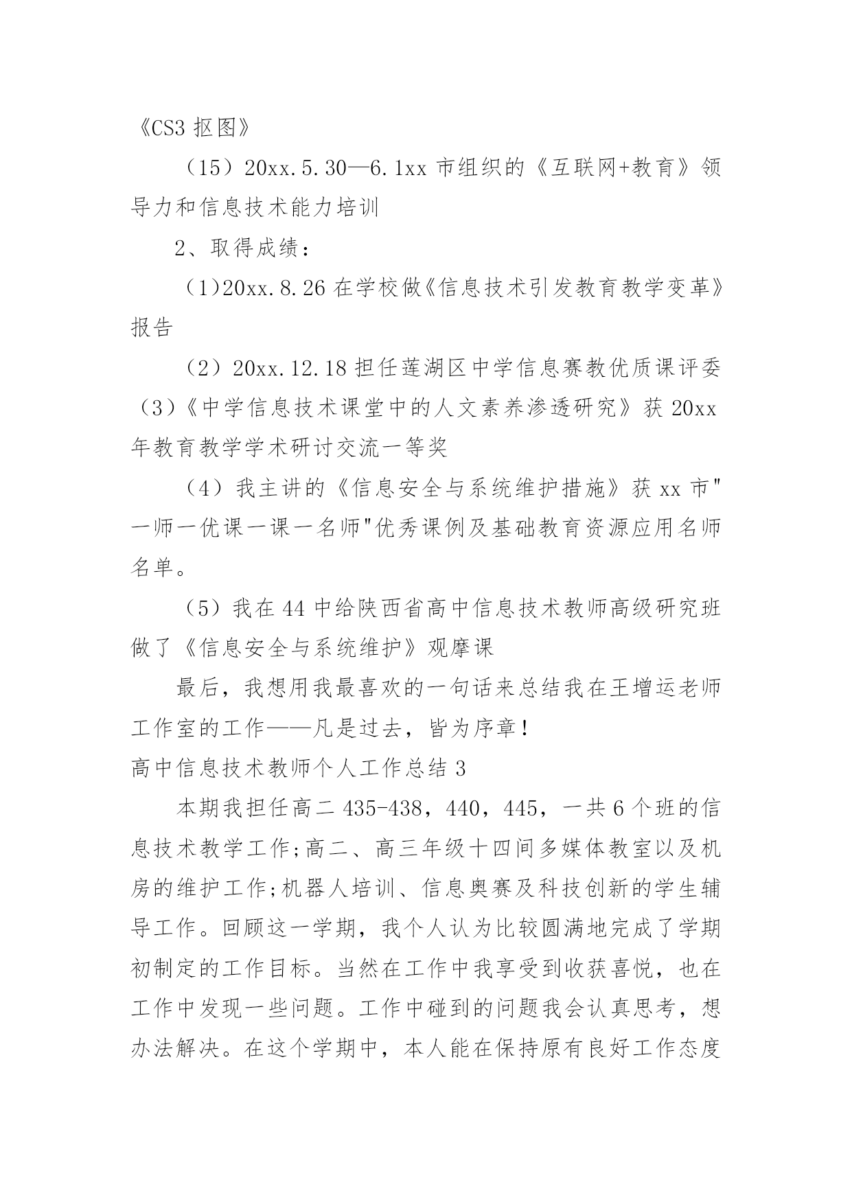 高中信息技术教师个人工作总结高中信息技术教师个人工作总结总结是对过去一定时期的工作、学习或思想情况进行回顾、分析,并做出客观评价的书面材料,它可以有效锻炼我们的语言组织能力,因此我们要做好归纳,写好总结。总结怎么写才不会流于形式呢?下面是小编整理的高中信息技术教师个人工作总结,仅供参考,大家一起来看看吧。高中信息技术教师个人工作总结1当要总结这一年来的工作时,我心里难以平静。今年是忙碌而充实的一年,也是我从教以来,在教育科研方面提高最快、收获最大的一年。简要总结如下:一、珍惜时间多读书,写读书笔记,提高自身综合素养。以前说起读书,总是感到没有时间,后来自从阅读了《教师月刊》的后,我才发现每一位专家,或者同行的佼佼者,都是书籍阅读方面的专家,她们都有自己的读书计划,我也越来越感觉到自己的贫乏。现在我学会利用平时零碎的时间,阅读了《第56号教室的奇迹》,朱永新的《书香——也醉人》《致教师》,定期阅读《电脑爱好者》《南方周末》,最近读了几本名人传记《诺贝尔》、《杜甫》、《李白》、《居里夫人》、《爱迪生》、《林肯》、《钱学森》、李开复的《向死而生》、杨绛先生的《我们仨》及《走在人生边上》等书籍,通过专业书籍来提高自己的专业素养,通过阅读文学类的书籍,我更加感觉到了他们惜时如金,他们对工作的认真、付出、敬业,他们与众不同的观念,他们那超乎常人的精力,每一本书籍阅读完成后,我都会有很深的不同的感慨。于是,撰写成读书笔记,发布在自己的博客上。二、与良师益友同行,在王增运老师工作室自由飞翔。感谢xx市教育局搭建的工作室平台,感谢王增运老师以及各位成员老师。有幸成为卓越团队的一名,与智者同行,与诚者共进,收获颇多:1、教学研究方面:我坚持钻研业务,不断学习新知识,探索教育教学新规律。钻研教材,写好每一个教案,上好每一堂课,多听同组同事的课,多学习别人的优点和长处。在我们学校今年开始的三步五环节教学模式下的五步思维课堂,"诱思—导思—练思—辩思—拓思",新的教学理念带给我新的思考和尝试的机会,我尝试着改变自己的教学方法,以围绕学生思考为主进行教学设计。2、课题研究方面:本年内,我参与的20xx陕西省中小学幼儿园学科带头人培养计划专项研究课题《基于学情差异的高中信息课有效教学》于今年成功结题。在参与课题的过程中,我经历了真正的研究过程,体味研究的`酸甜苦辣,也积累了宝贵的课题研究经验,更加促使我对以后做课题的研究充满了信心。同时,我参与的全国十二五规划课题《基于信息技术的校本课程开发研究》也已经顺利结题,并荣获全国一等奖。3、校本教材方面:本年度,在王老师的指导下,我完成了校本教材《Photoshop平面设计》,看着自己的文字变成铅字,在这个书写——修改——完善的过程中,我的收获最大:首先,我更加敬佩我们的师傅王老师,他对工作的敬业、严谨、一丝不苟的态度,同时,我自己又一次系统的学习,梳理了Photoshop这个软件,与此同时,也掌握了以前怎么也不会用到的书籍排版,校对的一些技巧。比如:分页符,画布,页码,左右对齐,目录页的设置,及排版中对版面的设计,首页和目录页不加页眉页码等操作。这样不断完善磨练的过程,使我更加坚信——有压力才有动力。4、微课制作方面:本年度,完成了两节微课《矢量图形的设计入门》及《矢量图形与位图图像的联系与区别》。从开始的懵懵懂懂,心里惧怕,不知道该如何下手,到后面的给同事教如何使用软件,如何去录制微课。从开始的注重设计教学设计,到最后懂得了先设计你的课件,熟练掌握操作,对语言要求的精准,以及细节的完善,不要瑕疵。为了录制这节微课,我学习了Camtasia6.0软件的使用,学习了PPT高级制作,又学习了PhotoshopCS3.0高级制作,也接触了Coreldraw软件。更重要的是,通过制作这两节微课,我最加深刻的体会到:任何事情,要做可能都比较容易,要做好,那就要多付出了。5、工作室方面:我认真参与工作室会议,积极进行研讨,大胆发言。积极参加工作室组织的各项活动。通过这样的活动,也提高自己的业务水平。我搜集整理,不断的完善,写了两篇论文和四篇教学设计,发表在xx市陆裕元名师工作室出版的论文集和教学设计集中。三、成长的足迹——参加的主要培训及取得成绩1、参加的主要培训:(1)听报告《"认真工作,从容生活"教师职业幸福感专题培训》?寻找幸福,乐活工作(2)20xx.4.13?白珍老师主讲《信息技术课堂教学设计与说课》莲湖进校(3)20xx.7.6?进校李南颖主讲的《微课制作方法》(4)20xx.8.27?冯莎主讲《微课及微课制作》(5)20xx.8.25?马瑞香老师主讲《静悄悄的课堂改革——教学交流会》(6)20xx.10.xx下午?《中小学教材辅导安排》区进校(7)20xx.10.xx上午?高晓红主讲《挖掘新教材,创造新课
