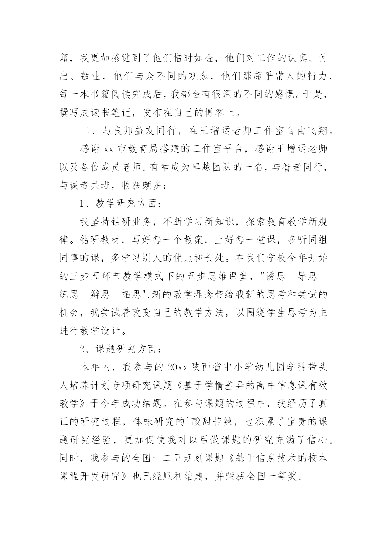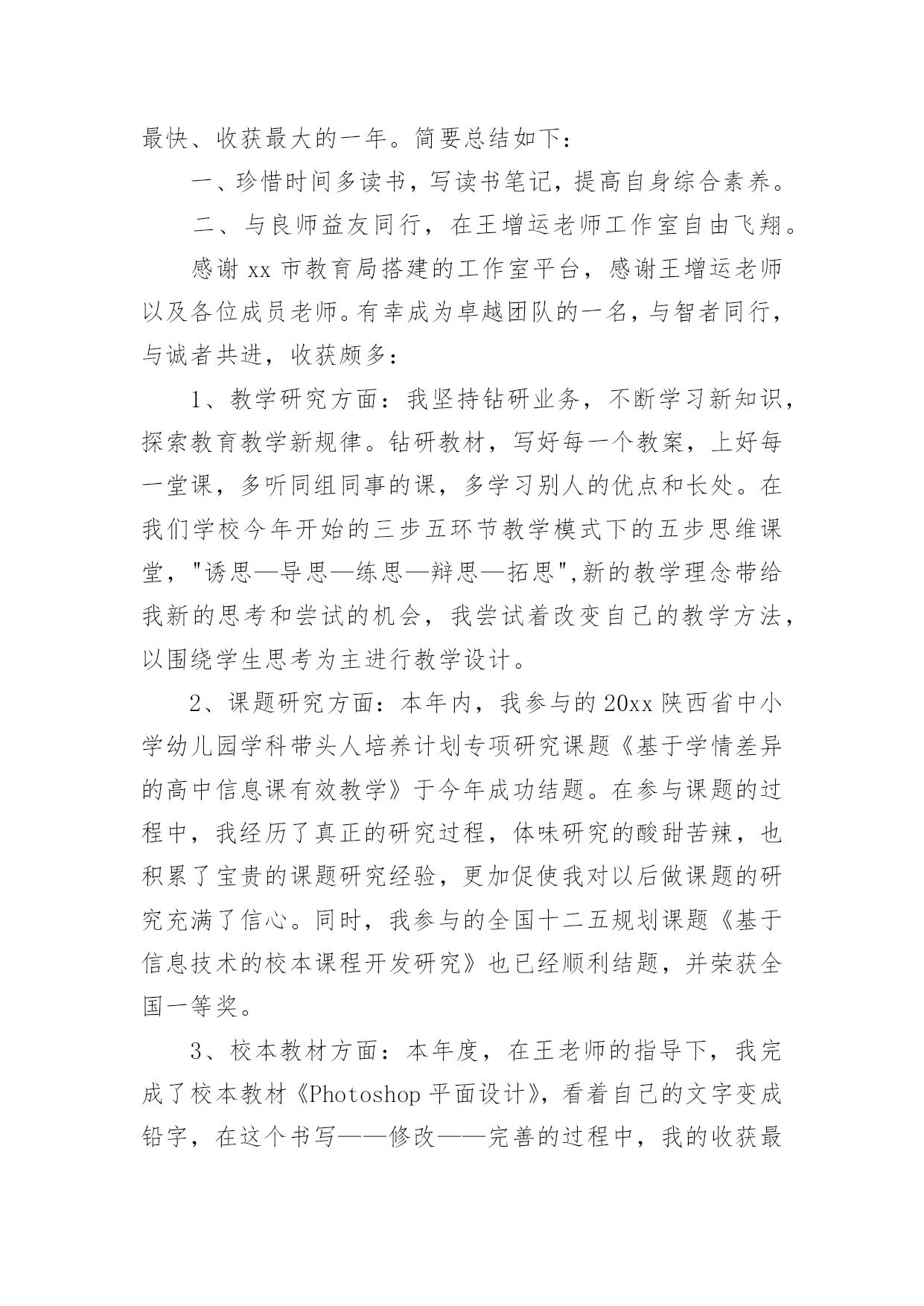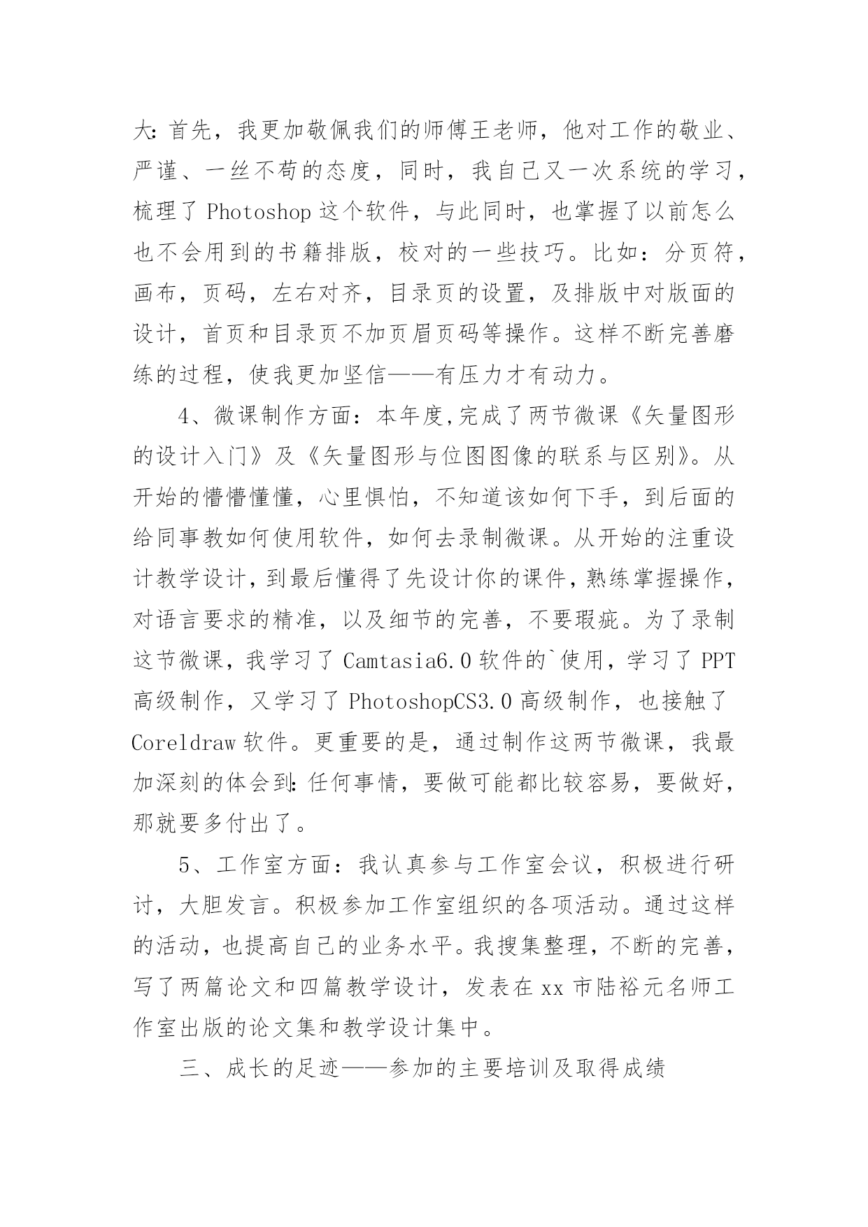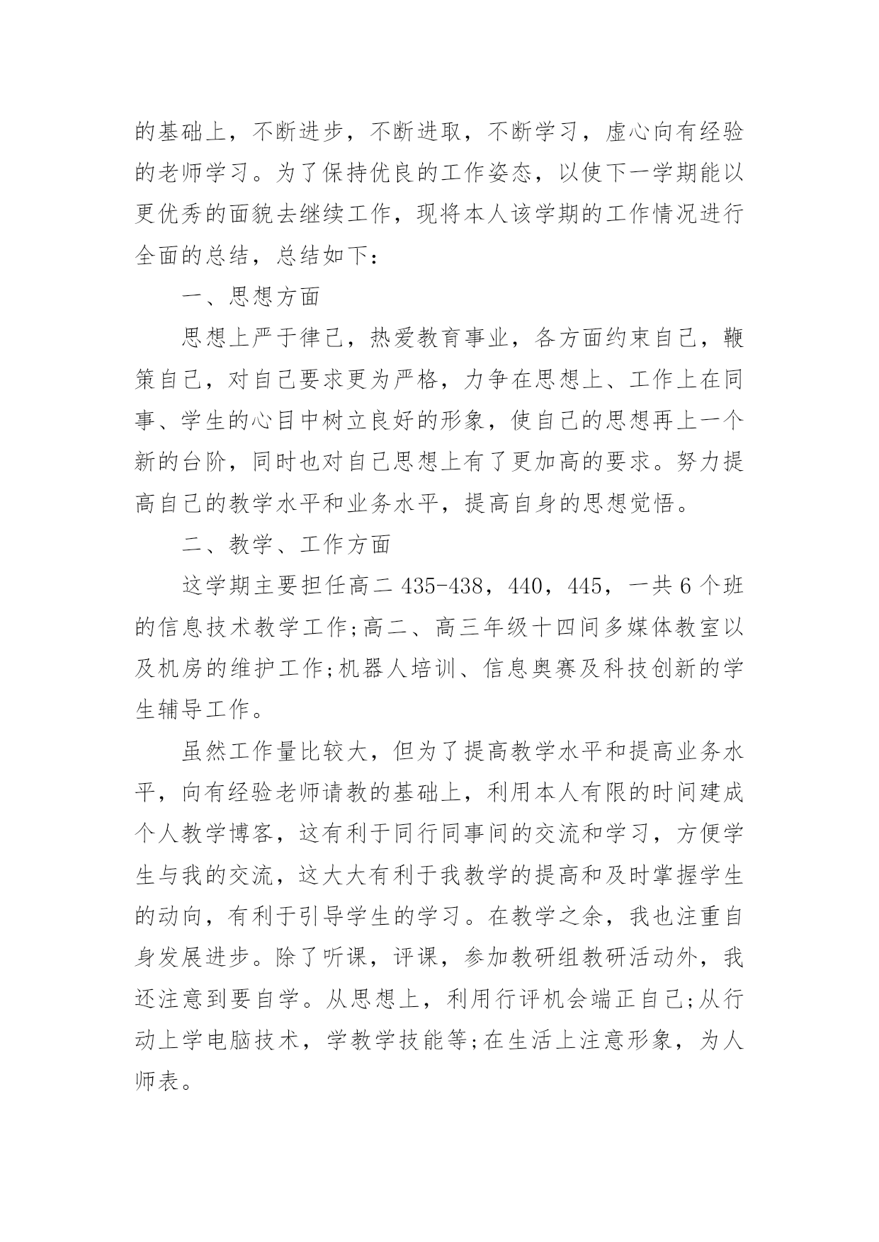 高中信息技术教师个人工作总结高中信息技术教师个人工作总结总结是对过去一定时期的工作、学习或思想情况进行回顾、分析,并做出客观评价的书面材料,它可以有效锻炼我们的语言组织能力,因此我们要做好归纳,写好总结。总结怎么写才不会流于形式呢?下面是小编整理的高中信息技术教师个人工作总结,仅供参考,大家一起来看看吧。高中信息技术教师个人工作总结1当要总结这一年来的工作时,我心里难以平静。今年是忙碌而充实的一年,也是我从教以来,在教育科研方面提高最快、收获最大的一年。简要总结如下:一、珍惜时间多读书,写读书笔记,提高自身综合素养。以前说起读书,总是感到没有时间,后来自从阅读了《教师月刊》的后,我才发现每一位专家,或者同行的佼佼者,都是书籍阅读方面的专家,她们都有自己的读书计划,我也越来越感觉到自己的贫乏。现在我学会利用平时零碎的时间,阅读了《第56号教室的奇迹》,朱永新的《书香——也醉人》《致教师》,定期阅读《电脑爱好者》《南方周末》,最近读了几本名人传记《诺贝尔》、《杜甫》、《李白》、《居里夫人》、《爱迪生》、《林肯》、《钱学森》、李开复的《向死而生》、杨绛先生的《我们仨》及《走在人生边上》等书籍,通过专业书籍来提高自己的专业素养,通过阅读文学类的书籍,我更加感觉到了他们惜时如金,他们对工作的认真、付出、敬业,他们与众不同的观念,他们那超乎常人的精力,每一本书籍阅读完成后,我都会有很深的不同的感慨。于是,撰写成读书笔记,发布在自己的博客上。二、与良师益友同行,在王增运老师工作室自由飞翔。感谢xx市教育局搭建的工作室平台,感谢王增运老师以及各位成员老师。有幸成为卓越团队的一名,与智者同行,与诚者共进,收获颇多:1、教学研究方面:我坚持钻研业务,不断学习新知识,探索教育教学新规律。钻研教材,写好每一个教案,上好每一堂课,多听同组同事的课,多学习别人的优点和长处。在我们学校今年开始的三步五环节教学模式下的五步思维课堂,"诱思—导思—练思—辩思—拓思",新的教学理念带给我新的思考和尝试的机会,我尝试着改变自己的教学方法,以围绕学生思考为主进行教学设计。2、课题研究方面:本年内,我参与的20xx陕西省中小学幼儿园学科带头人培养计划专项研究课题《基于学情差异的高中信息课有效教学》于今年成功结题。在参与课题的过程中,我经历了真正的研究过程,体味研究的`酸甜苦辣,也积累了宝贵的课题研究经验,更加促使我对以后做课题的研究充满了信心。同时,我参与的全国十二五规划课题《基于信息技术的校本课程开发研究》也已经顺利结题,并荣获全国一等奖。3、校本教材方面:本年度,在王老师的指导下,我完成了校本教材《Photoshop平面设计》,看着自己的文字变成铅字,在这个书写——修改——完善的过程中,我的收获最大:首先,我更加敬佩我们的师傅王老师,他对工作的敬业、严谨、一丝不苟的态度,同时,我自己又一次系统的学习,梳理了Photoshop这个软件,与此同时,也掌握了以前怎么也不会用到的书籍排版,校对的一些技巧。比如:分页符,画布,页码,左右对齐,目录页的设置,及排版中对版面的设计,首页和目录页不加页眉页码等操作。这样不断完善磨练的过程,使我更加坚信——有压力才有动力。4、微课制作方面:本年度,完成了两节微课《矢量图形的设计入门》及《矢量图形与位图图像的联系与区别》。从开始的懵懵懂懂,心里惧怕,不知道该如何下手,到后面的给同事教如何使用软件,如何去录制微课。从开始的注重设计教学设计,到最后懂得了先设计你的课件,熟练掌握操作,对语言要求的精准,以及细节的完善,不要瑕疵。为了录制这节微课,我学习了Camtasia6.0软件的使用,学习了PPT高级制作,又学习了PhotoshopCS3.0高级制作,也接触了Coreldraw软件。更重要的是,通过制作这两节微课,我最加深刻的体会到:任何事情,要做可能都比较容易,要做好,那就要多付出了。5、工作室方面:我认真参与工作室会议,积极进行研讨,大胆发言。积极参加工作室组织的各项活动。通过这样的活动,也提高自己的业务水平。我搜集整理,不断的完善,写了两篇论文和四篇教学设计,发表在xx市陆裕元名师工作室出版的论文集和教学设计集中。三、成长的足迹——参加的主要培训及取得成绩1、参加的主要培训:(1)听报告《"认真工作,从容生活"教师职业幸福感专题培训》?寻找幸福,乐活工作(2)20xx.4.13?白珍老师主讲《信息技术课堂教学设计与说课》莲湖进校(3)20xx.7.6?进校李南颖主讲的《微课制作方法》(4)20xx.8.27?冯莎主讲《微课及微课制作》(5)20xx.8.25?马瑞香老师主讲《静悄悄的课堂改革——教学交流会》(6)20xx.10.xx下午?《中小学教材辅导安排》区进校(7)20xx.10.xx上午?高晓红主讲《挖掘新教材,创造新课