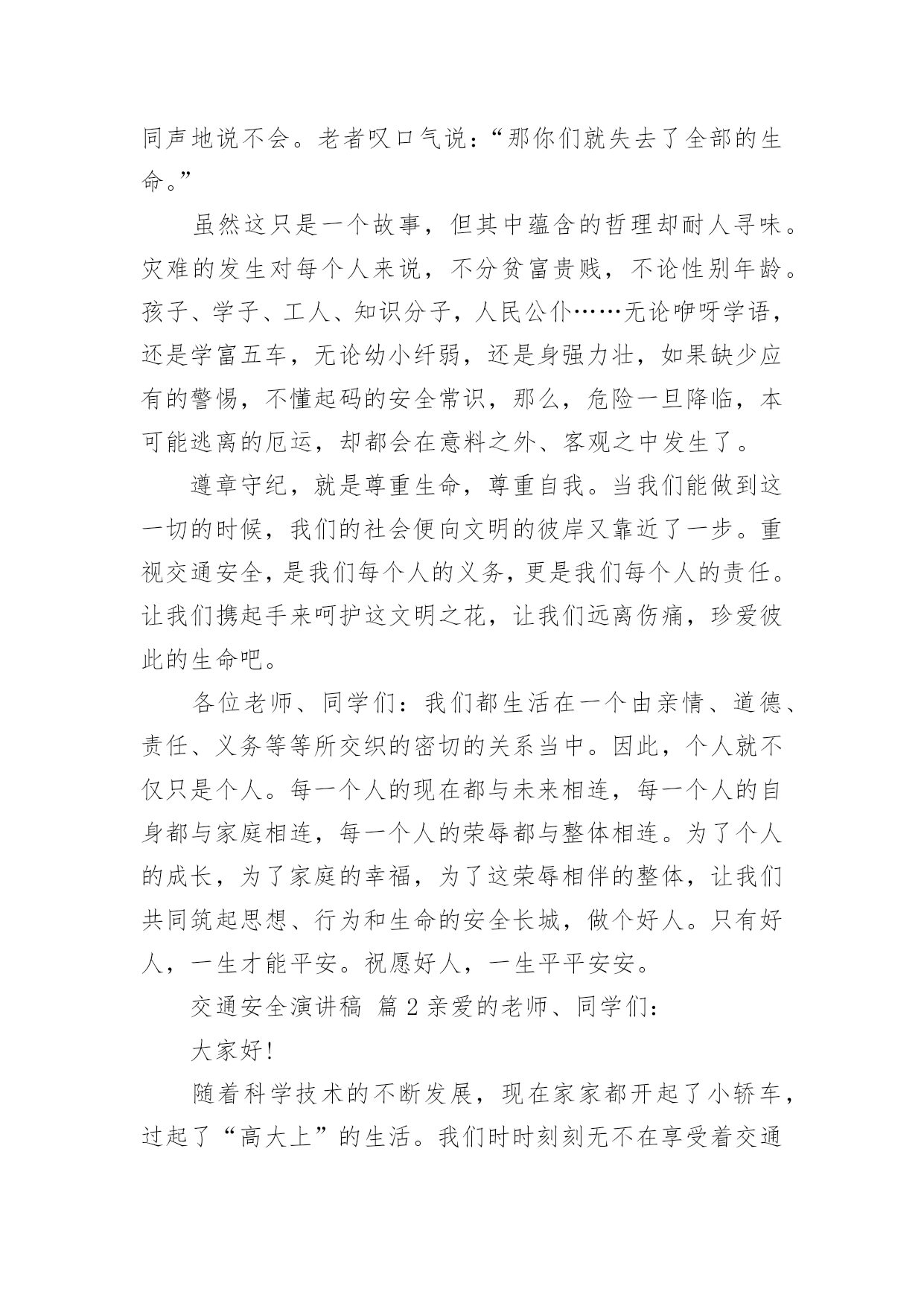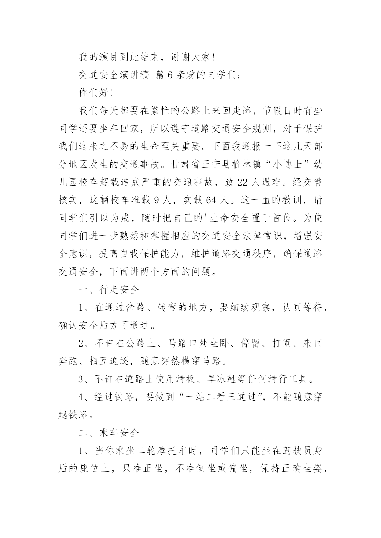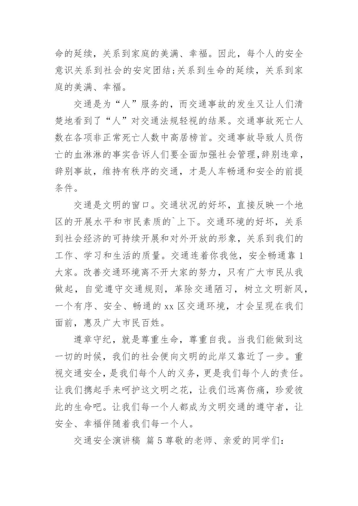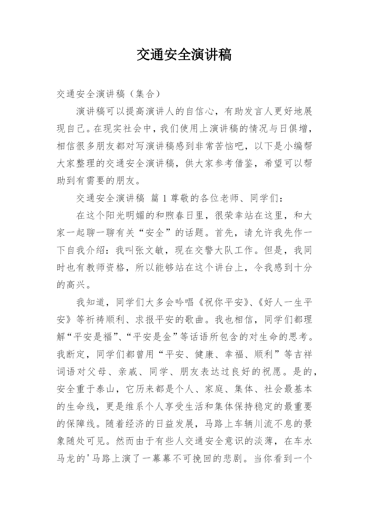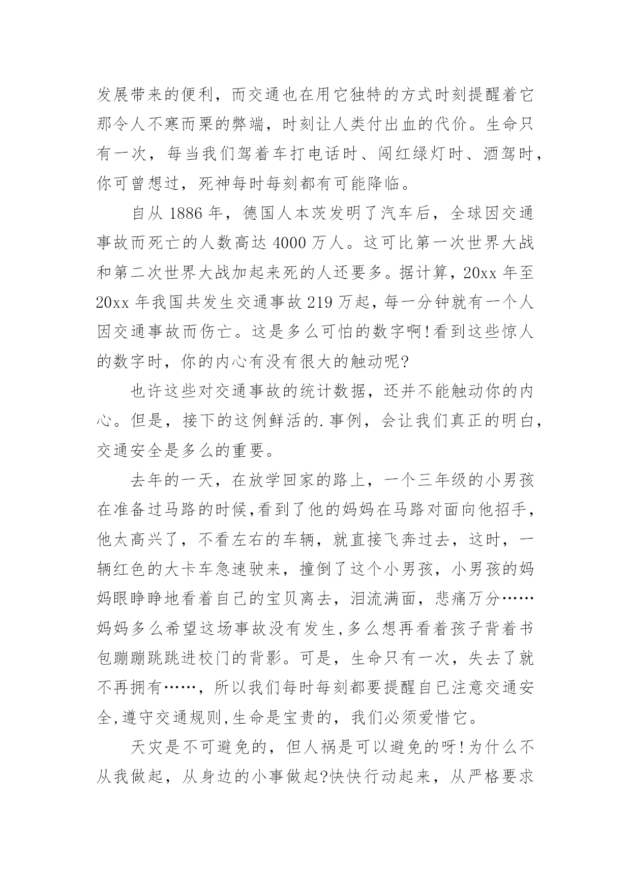 交通安全演讲稿交通安全演讲稿(集合)演讲稿可以提高演讲人的自信心,有助发言人更好地展现自己。在现实社会中,我们使用上演讲稿的情况与日俱增,相信很多朋友都对写演讲稿感到非常苦恼吧,以下是小编帮大家整理的交通安全演讲稿,供大家参考借鉴,希望可以帮助到有需要的朋友。交通安全演讲稿篇1尊敬的各位老师、同学们:在这个阳光明媚的和煦春日里,很荣幸站在这里,和大家一起聊一聊有关“安全”的话题。首先,请允许我先作一下自我介绍:我叫张文敏,现在交警大队工作。但是,我同时也有教师资格,所以能够站在这个讲台上,令我感到十分的高兴。我知道,同学们大多会吟唱《祝你平安》、《好人一生平安》等祈祷顺利、求报平安的歌曲。我也相信,同学们都理解“平安是福”、“平安是金”等话语所包含的对生命的思考。我断定,同学们都曾用“平安、健康、幸福、顺利”等吉祥词语对父母、亲戚、同学、朋友表达过良好的祝愿。是的,安全重于泰山,它历来都是个人、家庭、集体、社会最基本的生命线,更是维系个人享受生活和集体保持稳定的最重要的保障线。随着经济的日益发展,马路上车辆川流不息的景象随处可见。然而由于有些人交通安全意识的淡薄,在车水马龙的'马路上演了一幕幕不可挽回的悲剧。当你看到一个个鲜活的生命消失于车轮之下,当你发现一阵阵欢声笑语湮没在尖锐的汽笛声中,当你面对那些触目惊心的场景时,能不感到痛心疾首吗?道路交通安全事故依然是各种事故领域的“头号杀手”。而导致悲剧发生的一个重要原因,就是我们欠缺安全防卫知识,自我保护能力差,因此对少年儿童进行安全教育的形势相当紧迫。有专家指出,通过安全教育,提高我们小学生的自我保护能力,80%的意外伤害事故是可以避免的。校园安全涉及到青少年生活和学习方面的安全隐患有20多种:食物中毒、体育运动损伤、网络交友安全、交通事故、火灾火险、溺水、毒品危害、艾滋病等。在全国各类安全事故中,学校安全事故所占的比重很大。据了解,我国每年约有1.6万名中小学生非正常死亡:中小学生因安全事故、食物中毒、溺水、自杀等死亡的,平均每天有40多人,就是说几乎每天有一个班的学生在“消失”。“生命”,一个多么鲜活的词语。“安全”,一个多么古老的话题。“幸福”一个多么美妙的境界。同学们:一人安全,全家幸福。生命至上,安全为天。安全第一,预防为主。生命只有在安全中才能永葆活力,幸福只有在安全中才能永具魅力。安全构筑了我们美好的家园,成为连接亲朋好友的纽带。在安全的问题上,来不得半点麻痹和侥幸,在安全的问题上,我们必须要防范在先、前全,事事讲安全。必须要筑起思想、行为和生命的全长城。交通事故,游泳溺水事故、体育活动意外伤害事故,课间游戏追逐打闹偶发事故,轻者可以伤及体格,重者能够危及生命,它们造成的后果是残酷的。可是思想道德的残缺、行为方式的'越轨比体格不健全更可怕。臧克家先生在《有的人》一诗中写道:“有的人活着,他已经死了。”我想,那些失去健康的精神追求、迷失正确的人生方向、空有一架活着的躯体行尸走肉的人不就是思想残缺的产物吗?这种“产物”充其量只能是没完没了地吸取消化父母亲血汗的机器,只能成为社会发展长河中的废物,甚至成为危害社会发展的危险物。红灯短暂而生命长久,为了更好地宣传交通安全法规,为了更好地宣传交通安全知识,更好地珍视我们生命,在此,学校向全体师生发出倡议:1、我们要认真学习交通安全的法律法规,遵守交通规则,加强安全意识,树立交通安全文明公德。2、当我们徒步行走于人来车往的马路时,请时刻保持清醒的头脑,不在马路上嬉戏打闹。3、当我们时马路时,多一份谦让与耐心,不闯红灯,走人行横道,绝不能为贪一时之快,横穿马路。4、严禁12周岁以下的学生骑自行车。放学回家一定要排好路队。记得有一个故事。几个学者与一个老者同船共渡。学者们问老者是否懂得什么是哲学,老者连连摇头。学者们纷纷叹息:那你已经失去了一半的生命。这时一个巨浪打来,小船被掀翻了,老者问:“你们会不会游泳啊?”学者们异口同声地说不会。老者叹口气说:“那你们就失去了全部的生命。”虽然这只是一个故事,但其中蕴含的哲理却耐人寻味。灾难的发生对每个人来说,不分贫富贵贱,不论性别年龄。孩子、学子、工人、知识分子,人民公仆……无论咿呀学语,还是学富五车,无论幼小纤弱,还是身强力壮,如果缺少应有的警惕,不懂起码的安全常识,那么,危险一旦降临,本可能逃离的厄运,却都会在意料之外、客观之中发生了。遵章守纪,就是尊重生命,尊重自我。当我们能做到这一切的时候,我们的社会便向文明的彼岸又靠近了一步。重视交通安全,是我们每个人的义务,更是我们每个人的责任。让我们携起手来呵护这文明之花,让我们远离伤痛,珍爱彼此的生命吧。各位老师、同学们:我们都生活在一个由亲情、道德、责任、义务等等所交织的密切的关系当中。因此,个人就不仅只是个人。每一个人的现在都与未来