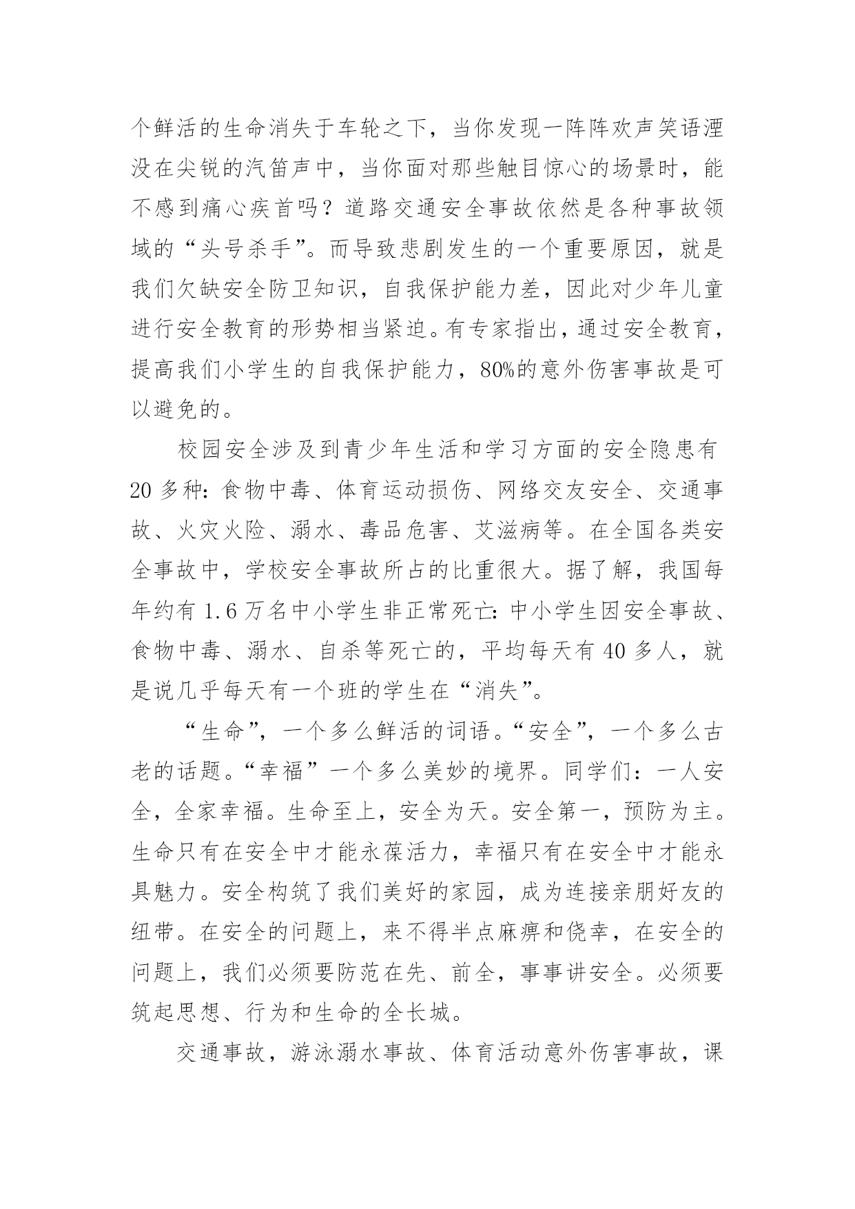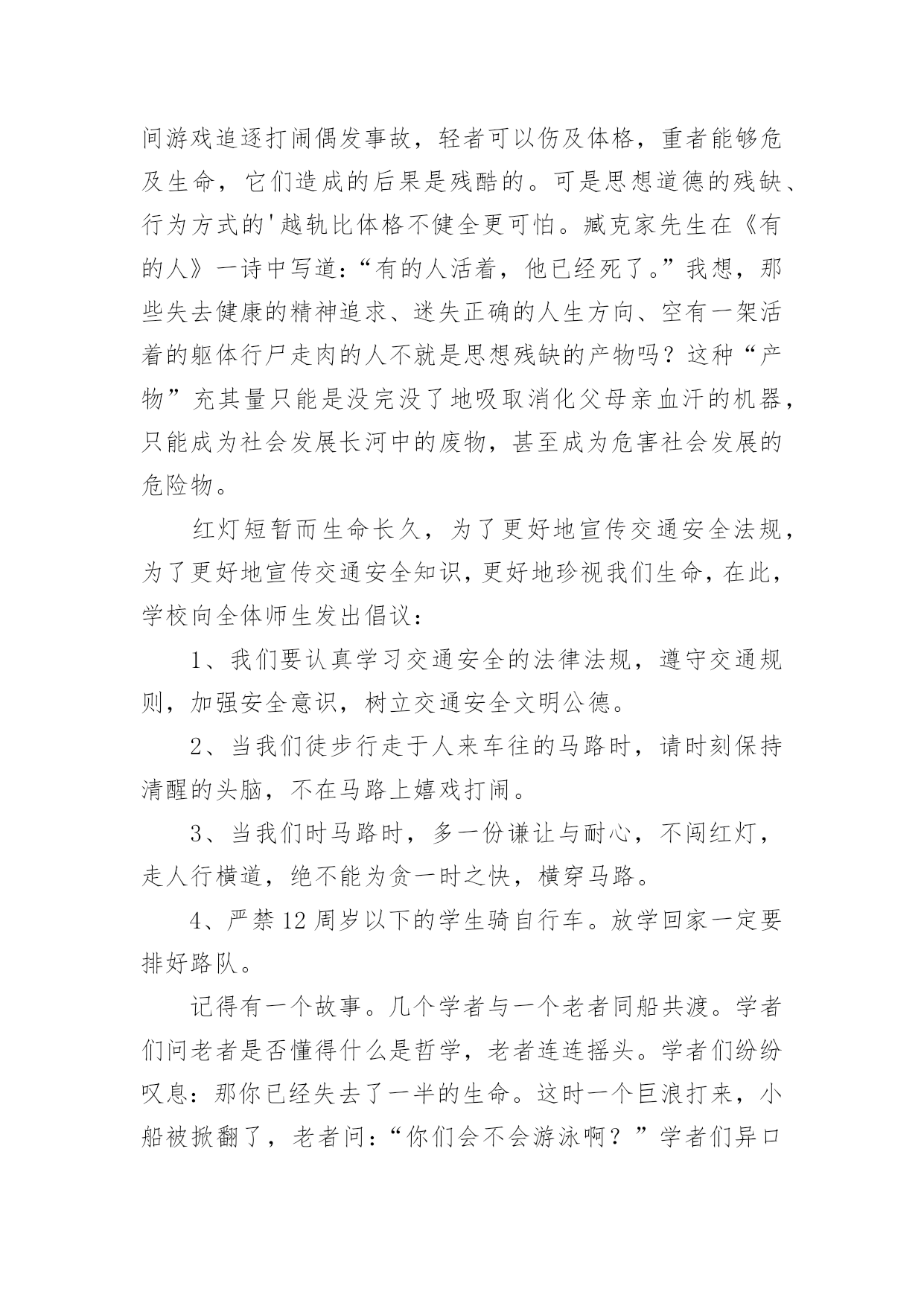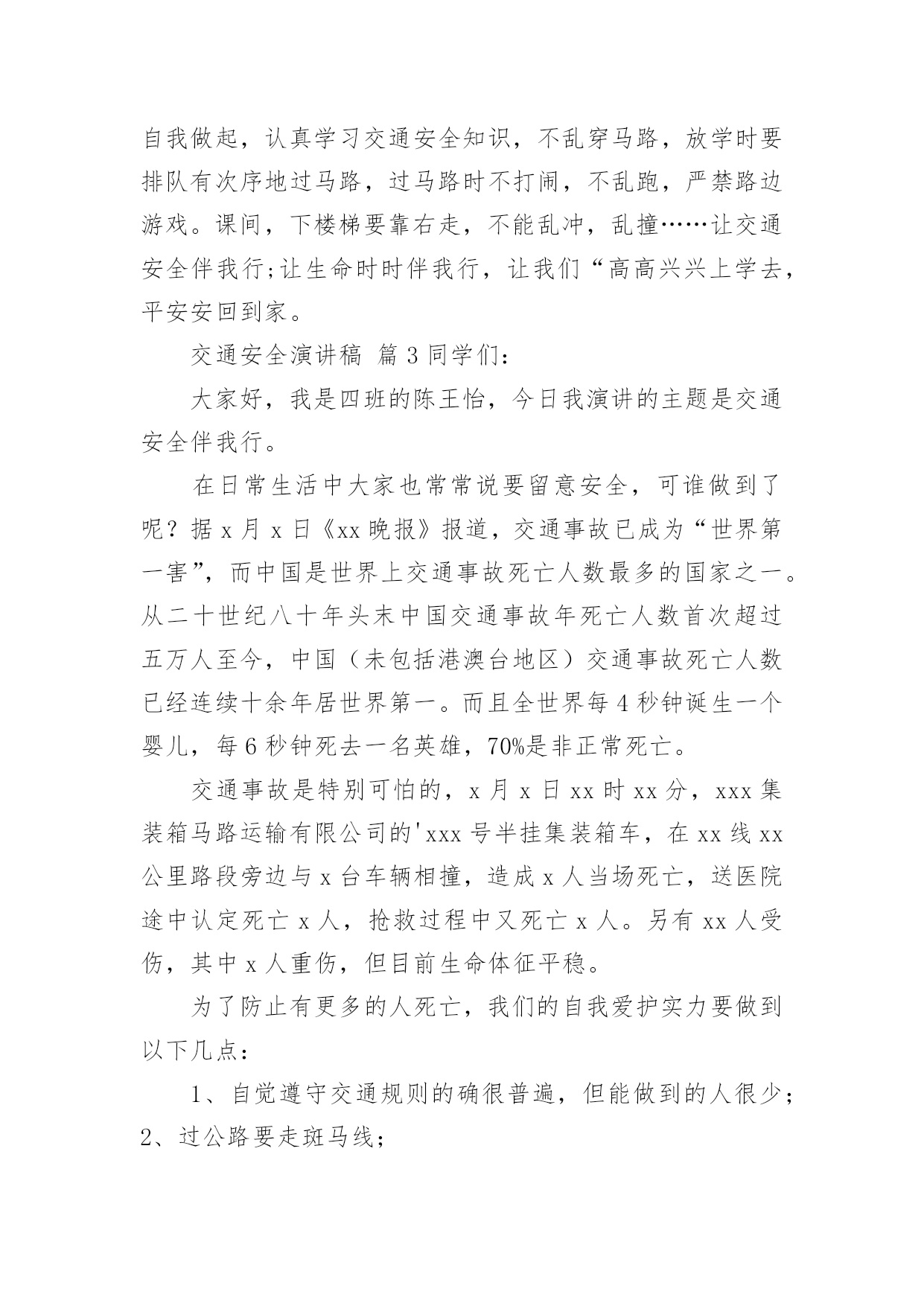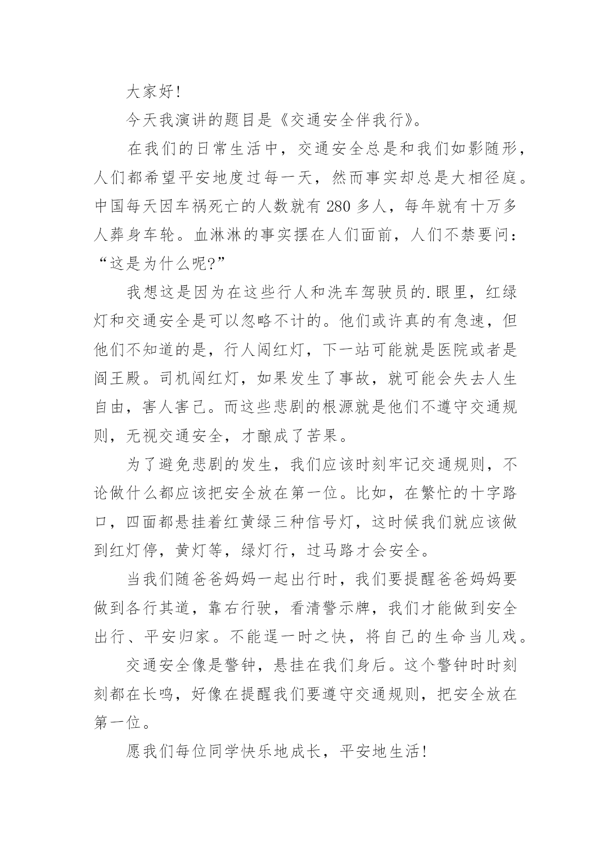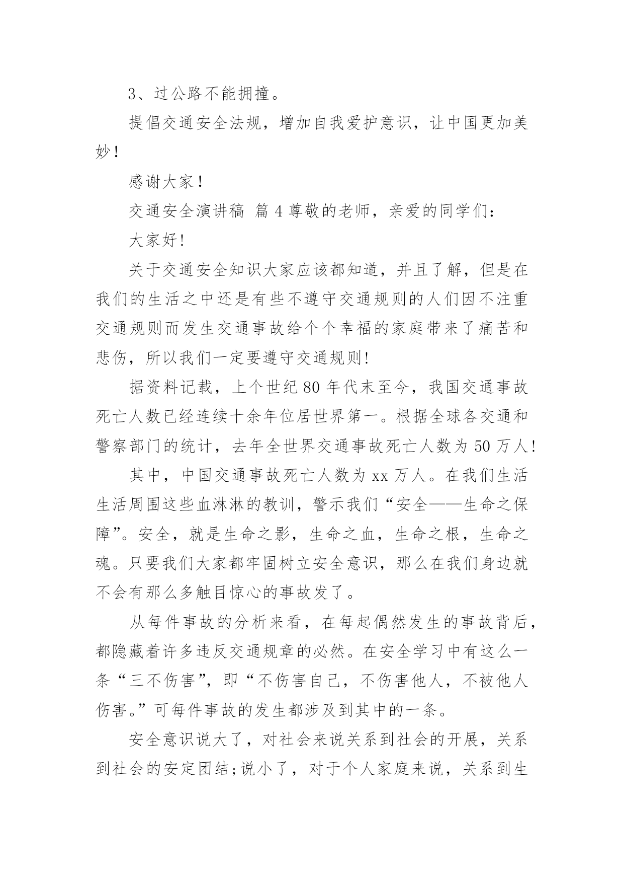 交通安全演讲稿交通安全演讲稿(集合)演讲稿可以提高演讲人的自信心,有助发言人更好地展现自己。在现实社会中,我们使用上演讲稿的情况与日俱增,相信很多朋友都对写演讲稿感到非常苦恼吧,以下是小编帮大家整理的交通安全演讲稿,供大家参考借鉴,希望可以帮助到有需要的朋友。交通安全演讲稿篇1尊敬的各位老师、同学们:在这个阳光明媚的和煦春日里,很荣幸站在这里,和大家一起聊一聊有关“安全”的话题。首先,请允许我先作一下自我介绍:我叫张文敏,现在交警大队工作。但是,我同时也有教师资格,所以能够站在这个讲台上,令我感到十分的高兴。我知道,同学们大多会吟唱《祝你平安》、《好人一生平安》等祈祷顺利、求报平安的歌曲。我也相信,同学们都理解“平安是福”、“平安是金”等话语所包含的对生命的思考。我断定,同学们都曾用“平安、健康、幸福、顺利”等吉祥词语对父母、亲戚、同学、朋友表达过良好的祝愿。是的,安全重于泰山,它历来都是个人、家庭、集体、社会最基本的生命线,更是维系个人享受生活和集体保持稳定的最重要的保障线。随着经济的日益发展,马路上车辆川流不息的景象随处可见。然而由于有些人交通安全意识的淡薄,在车水马龙的'马路上演了一幕幕不可挽回的悲剧。当你看到一个个鲜活的生命消失于车轮之下,当你发现一阵阵欢声笑语湮没在尖锐的汽笛声中,当你面对那些触目惊心的场景时,能不感到痛心疾首吗?道路交通安全事故依然是各种事故领域的“头号杀手”。而导致悲剧发生的一个重要原因,就是我们欠缺安全防卫知识,自我保护能力差,因此对少年儿童进行安全教育的形势相当紧迫。有专家指出,通过安全教育,提高我们小学生的自我保护能力,80%的意外伤害事故是可以避免的。校园安全涉及到青少年生活和学习方面的安全隐患有20多种:食物中毒、体育运动损伤、网络交友安全、交通事故、火灾火险、溺水、毒品危害、艾滋病等。在全国各类安全事故中,学校安全事故所占的比重很大。据了解,我国每年约有1.6万名中小学生非正常死亡:中小学生因安全事故、食物中毒、溺水、自杀等死亡的,平均每天有40多人,就是说几乎每天有一个班的学生在“消失”。“生命”,一个多么鲜活的词语。“安全”,一个多么古老的话题。“幸福”一个多么美妙的境界。同学们:一人安全,全家幸福。生命至上,安全为天。安全第一,预防为主。生命只有在安全中才能永葆活力,幸福只有在安全中才能永具魅力。安全构筑了我们美好的家园,成为连接亲朋好友的纽带。在安全的问题上,来不得半点麻痹和侥幸,在安全的问题上,我们必须要防范在先、前全,事事讲安全。必须要筑起思想、行为和生命的全长城。交通事故,游泳溺水事故、体育活动意外伤害事故,课间游戏追逐打闹偶发事故,轻者可以伤及体格,重者能够危及生命,它们造成的后果是残酷的。可是思想道德的残缺、行为方式的'越轨比体格不健全更可怕。臧克家先生在《有的人》一诗中写道:“有的人活着,他已经死了。”我想,那些失去健康的精神追求、迷失正确的人生方向、空有一架活着的躯体行尸走肉的人不就是思想残缺的产物吗?这种“产物”充其量只能是没完没了地吸取消化父母亲血汗的机器,只能成为社会发展长河中的废物,甚至成为危害社会发展的危险物。红灯短暂而生命长久,为了更好地宣传交通安全法规,为了更好地宣传交通安全知识,更好地珍视我们生命,在此,学校向全体师生发出倡议:1、我们要认真学习交通安全的法律法规,遵守交通规则,加强安全意识,树立交通安全文明公德。2、当我们徒步行走于人来车往的马路时,请时刻保持清醒的头脑,不在马路上嬉戏打闹。3、当我们时马路时,多一份谦让与耐心,不闯红灯,走人行横道,绝不能为贪一时之快,横穿马路。4、严禁12周岁以下的学生骑自行车。放学回家一定要排好路队。记得有一个故事。几个学者与一个老者同船共渡。学者们问老者是否懂得什么是哲学,老者连连摇头。学者们纷纷叹息:那你已经失去了一半的生命。这时一个巨浪打来,小船被掀翻了,老者问:“你们会不会游泳啊?”学者们异口同声地说不会。老者叹口气说:“那你们就失去了全部的生命。”虽然这只是一个故事,但其中蕴含的哲理却耐人寻味。灾难的发生对每个人来说,不分贫富贵贱,不论性别年龄。孩子、学子、工人、知识分子,人民公仆……无论咿呀学语,还是学富五车,无论幼小纤弱,还是身强力壮,如果缺少应有的警惕,不懂起码的安全常识,那么,危险一旦降临,本可能逃离的厄运,却都会在意料之外、客观之中发生了。遵章守纪,就是尊重生命,尊重自我。当我们能做到这一切的时候,我们的社会便向文明的彼岸又靠近了一步。重视交通安全,是我们每个人的义务,更是我们每个人的责任。让我们携起手来呵护这文明之花,让我们远离伤痛,珍爱彼此的生命吧。各位老师、同学们:我们都生活在一个由亲情、道德、责任、义务等等所交织的密切的关系当中。因此,个人就不仅只是个人。每一个人的现在都与未来