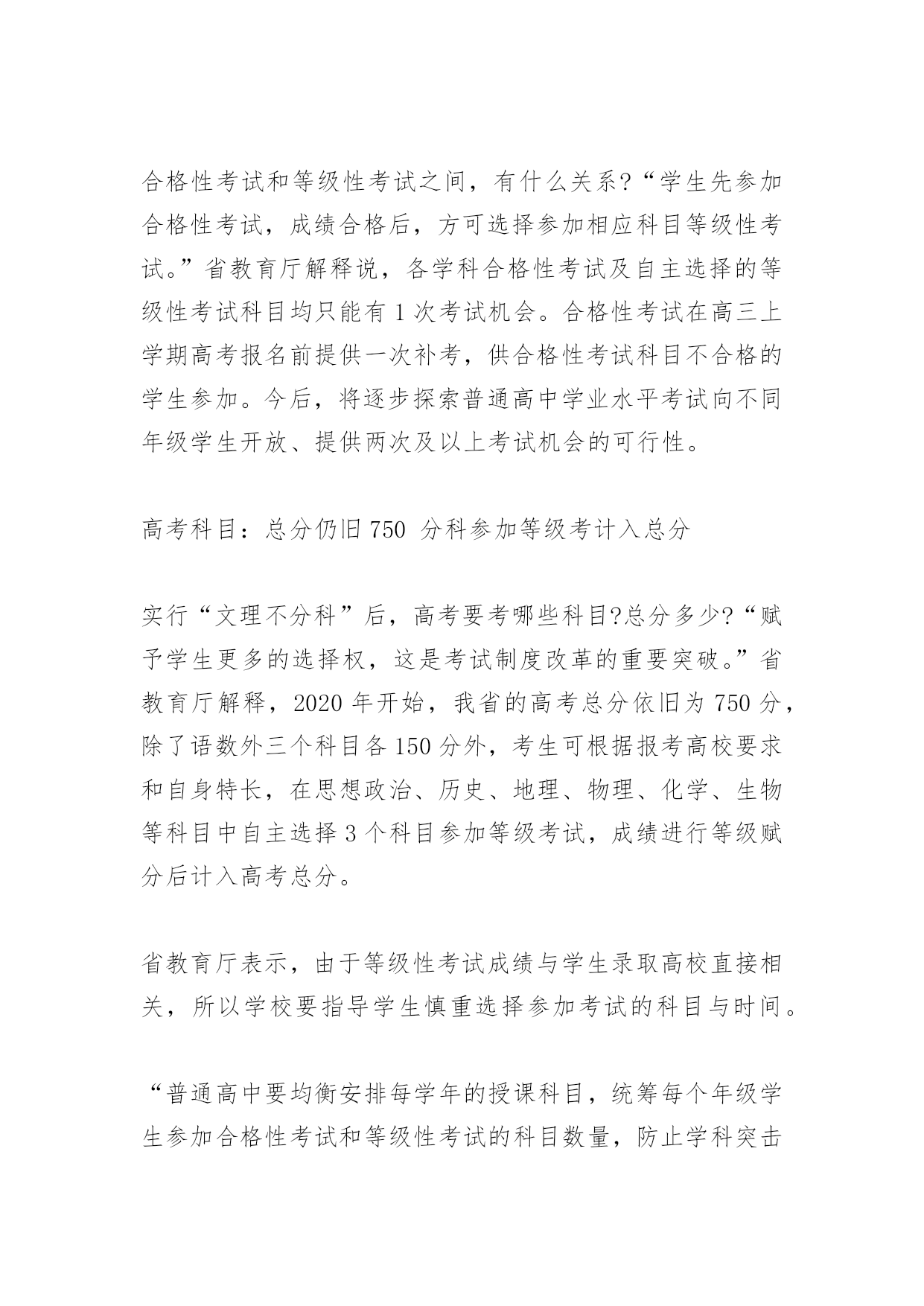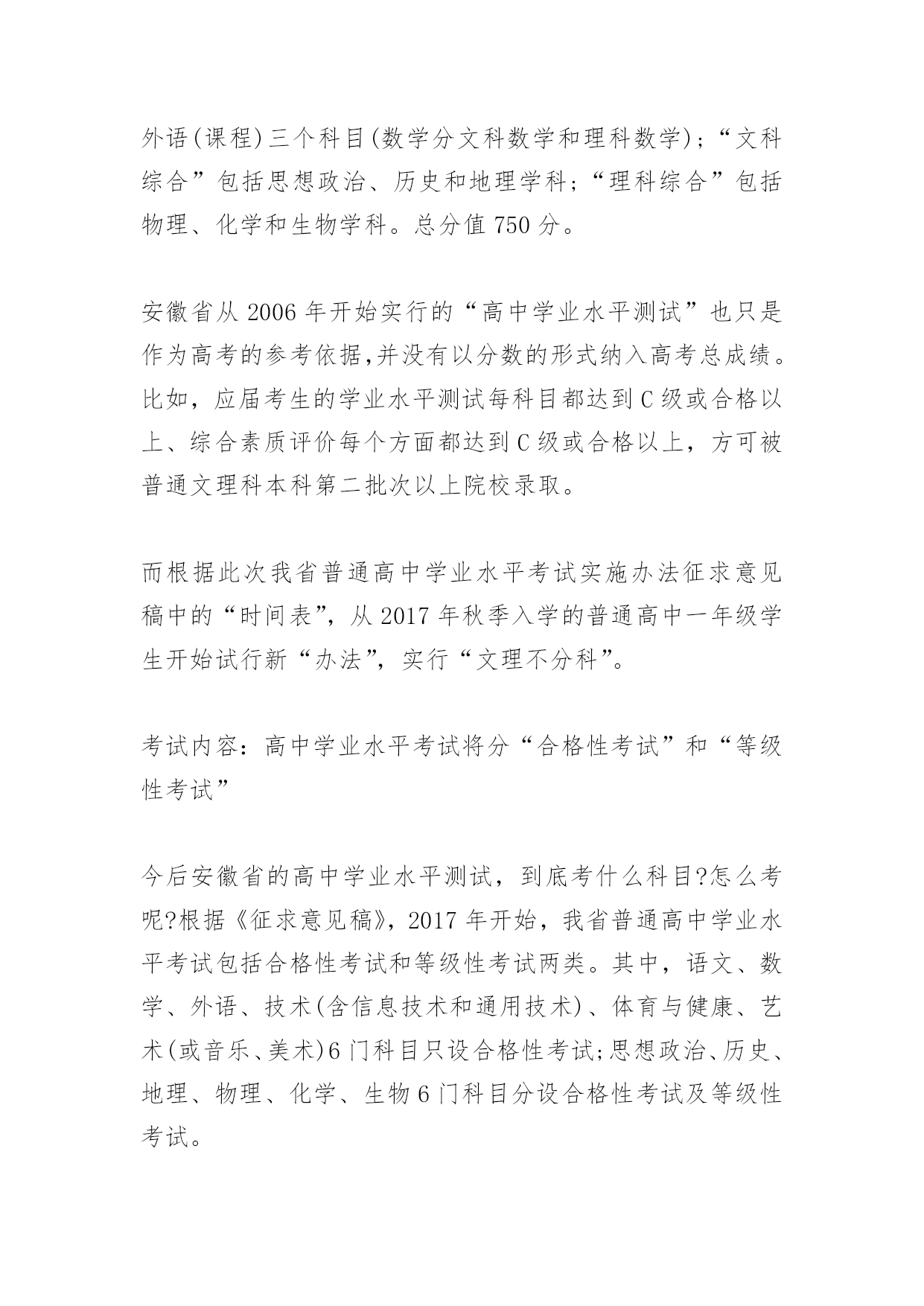 安徽高考文理不分科《安徽省普通高中学业水平考试实施办法(征求意见稿)》:从2017年秋季入学的高一学生开始,安徽省普通高中将实行“文理不分科”,高考时总分依旧为750分。作为“皖版”高考(精品课)改革方案的重要部分,《安徽省普通高中学业水平考试实施办法(征求意见稿)》(以下简称《征求意见稿》)昨日正式“露真容”。根据《征求意见稿》,从2017年秋季入学的高一学生开始,安徽省普通高中将实行“文理不分科”,高考时总分依旧为750分,语数外各150分外,考生可从思想政治、历史、地理、物理、化学、生物6门科目中自主选择3门“自由搭配”,以等级性考试的方式赋分并入高考总成绩。此外,我省普通高中学业水平考试将包括“合格性考试”和“等级性考试”两类,各科目学业水平考试将分散在高中三年中进行。其中,地理、生物两科目的等级性考试可以选择在高二参加考试。改革时间:2017年秋季入学高一学生实行“文理不分科”目前,安徽省普通高校统一招生考试模式一直是“3+文科综合/理科综合+学业水平测试+综合素质评价”。统考科目为“3+文科综合/理科综合”。其中,“3”指的是语文、数学和外语(课程)三个科目(数学分文科数学和理科数学);“文科综合”包括思想政治、历史和地理学科;“理科综合”包括物理、化学和生物学科。总分值750分。安徽省从2006年开始实行的“高中学业水平测试”也只是作为高考的参考依据,并没有以分数的形式纳入高考总成绩。比如,应届考生的学业水平测试每科目都达到C级或合格以上、综合素质评价每个方面都达到C级或合格以上,方可被普通文理科本科第二批次以上院校录取。而根据此次我省普通高中学业水平考试实施办法征求意见稿中的“时间表”,从2017年秋季入学的普通高中一年级学生开始试行新“办法”,实行“文理不分科”。考试内容:高中学业水平考试将分“合格性考试”和“等级性考试”今后安徽省的高中学业水平测试,到底考什么科目?怎么考呢?根据《征求意见稿》,2017年开始,我省普通高中学业水平考试包括合格性考试和等级性考试两类。其中,语文、数学、外语、技术(含信息技术和通用技术)、体育与健康、艺术(或音乐、美术)6门科目只设合格性考试;思想政治、历史、地理、物理、化学、生物6门科目分设合格性考试及等级性考试。合格性考试和等级性考试之间,有什么关系?“学生先参加合格性考试,成绩合格后,方可选择参加相应科目等级性考试。”省教育厅解释说,各学科合格性考试及自主选择的等级性考试科目均只能有1次考试机会。合格性考试在高三上学期高考报名前提供一次补考,供合格性考试科目不合格的学生参加。今后,将逐步探索普通高中学业水平考试向不同年级学生开放、提供两次及以上考试机会的可行性。高考科目:总分仍旧750分科参加等级考计入总分实行“文理不分科”后,高考要考哪些科目?总分多少?“赋予学生更多的选择权,这是考试制度改革的重要突破。”省教育厅解释,2020年开始,我省的高考总分依旧为750分,除了语数外三个科目各150分外,考生可根据报考高校要求和自身特长,在思想政治、历史、地理、物理、化学、生物等科目中自主选择3个科目参加等级考试,成绩进行等级赋分后计入高考总分。省教育厅表示,由于等级性考试成绩与学生录取高校直接相关,所以学校要指导学生慎重选择参加考试的科目与时间。“普通高中要均衡安排每学年的授课科目,统筹每个年级学生参加合格性考试和等级性考试的科目数量,防止学科突击教学以参加考试、过早结束非高考课程,过多安排时间准备高考科目。”省教育厅表示,每年将提前公布学业水平考试的报名时间、开考科目、考试时间、报名方式等,便于学校安排教学及学生报名考试。